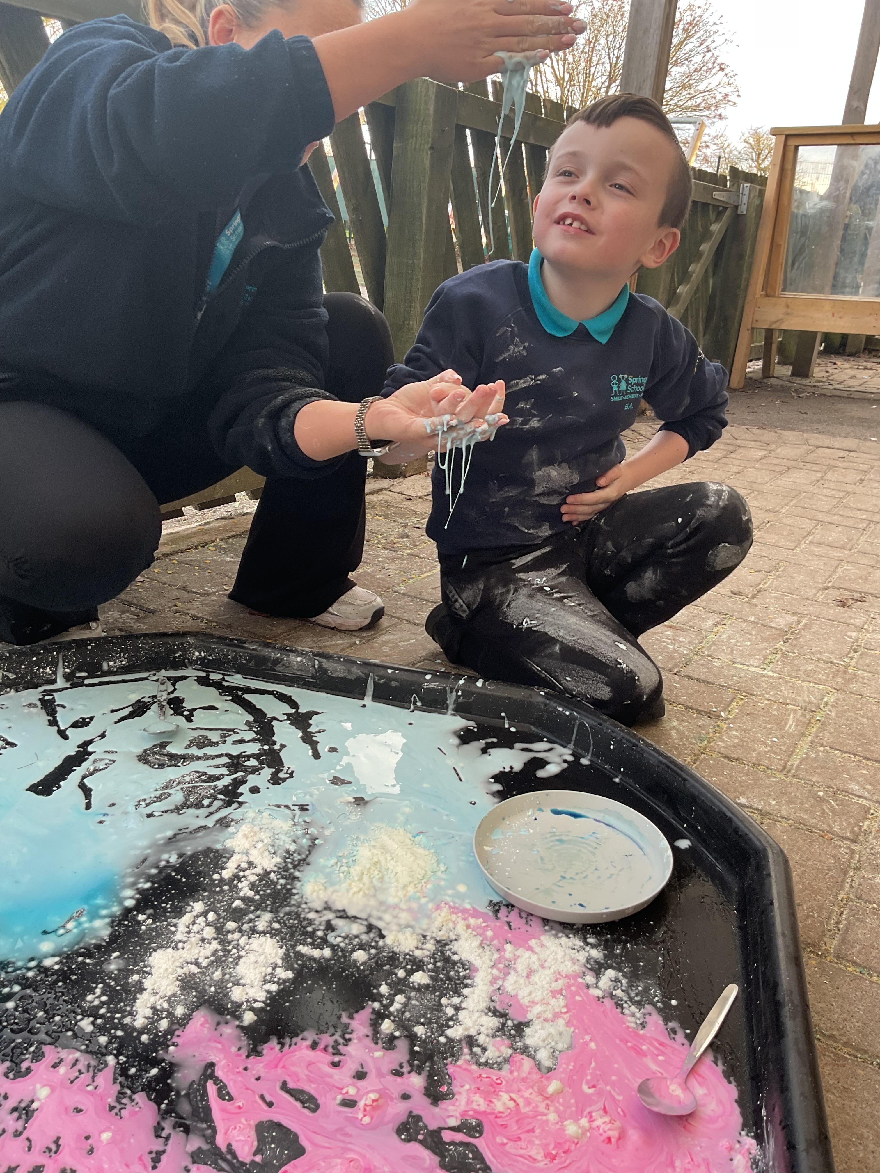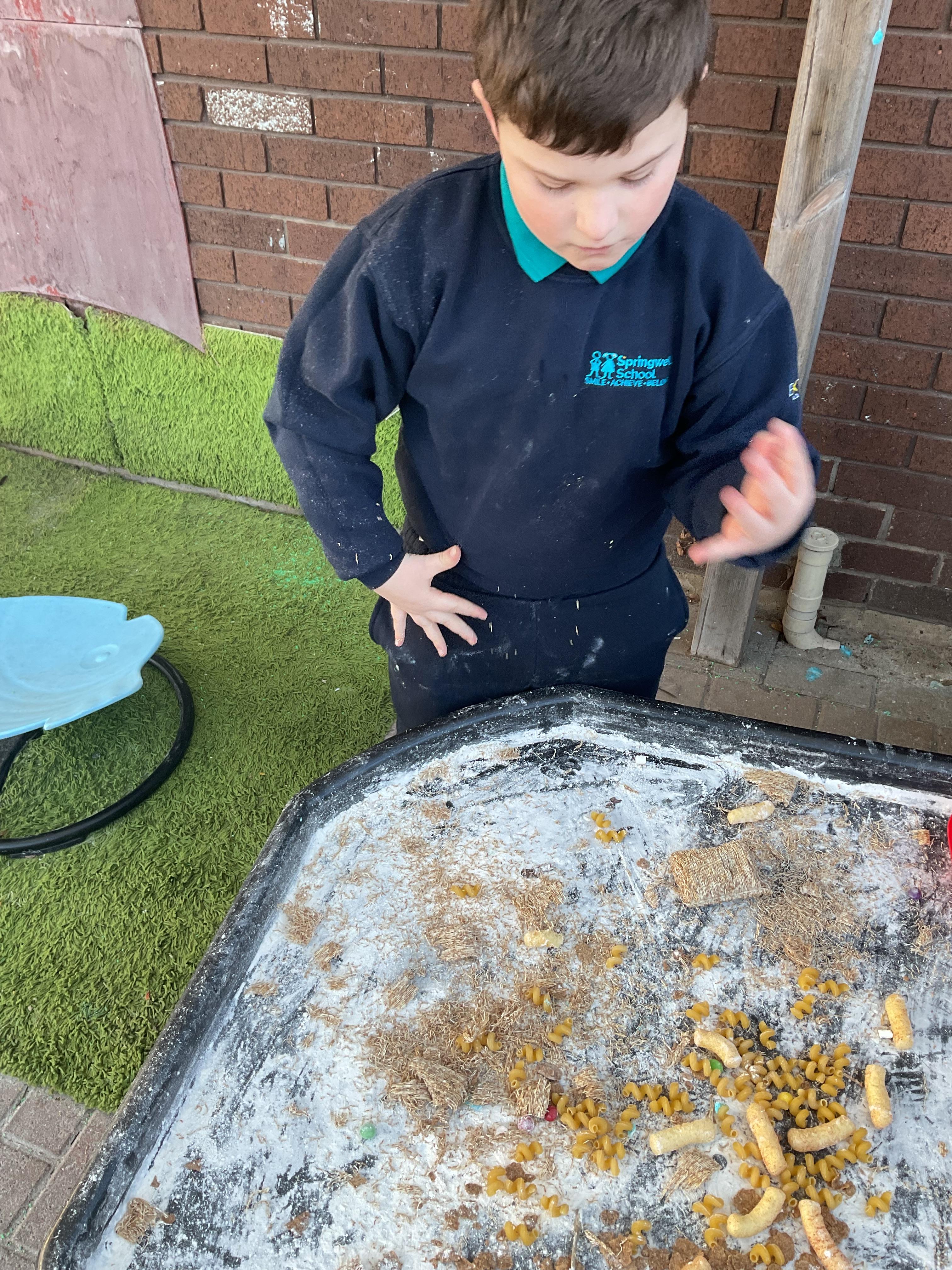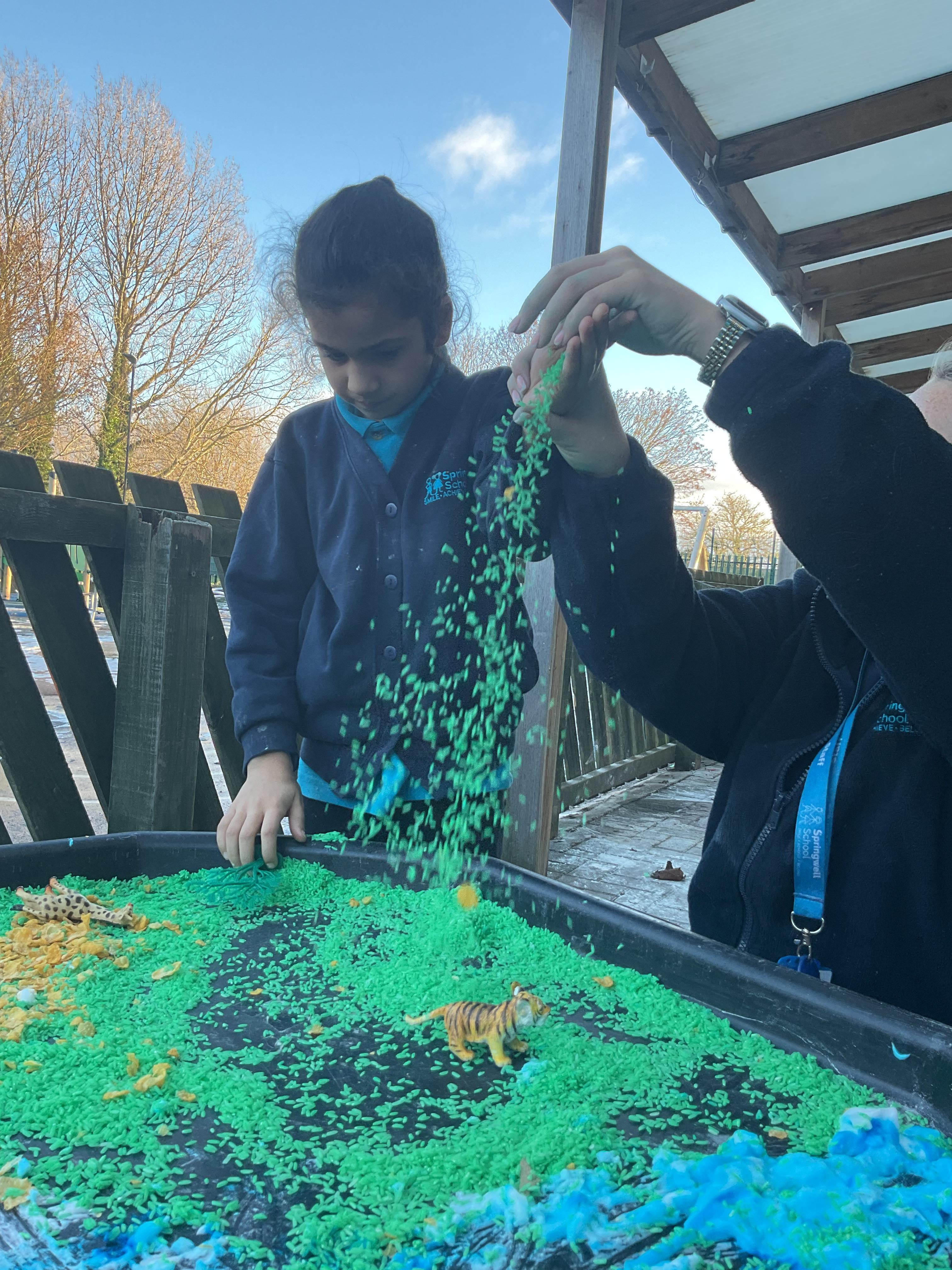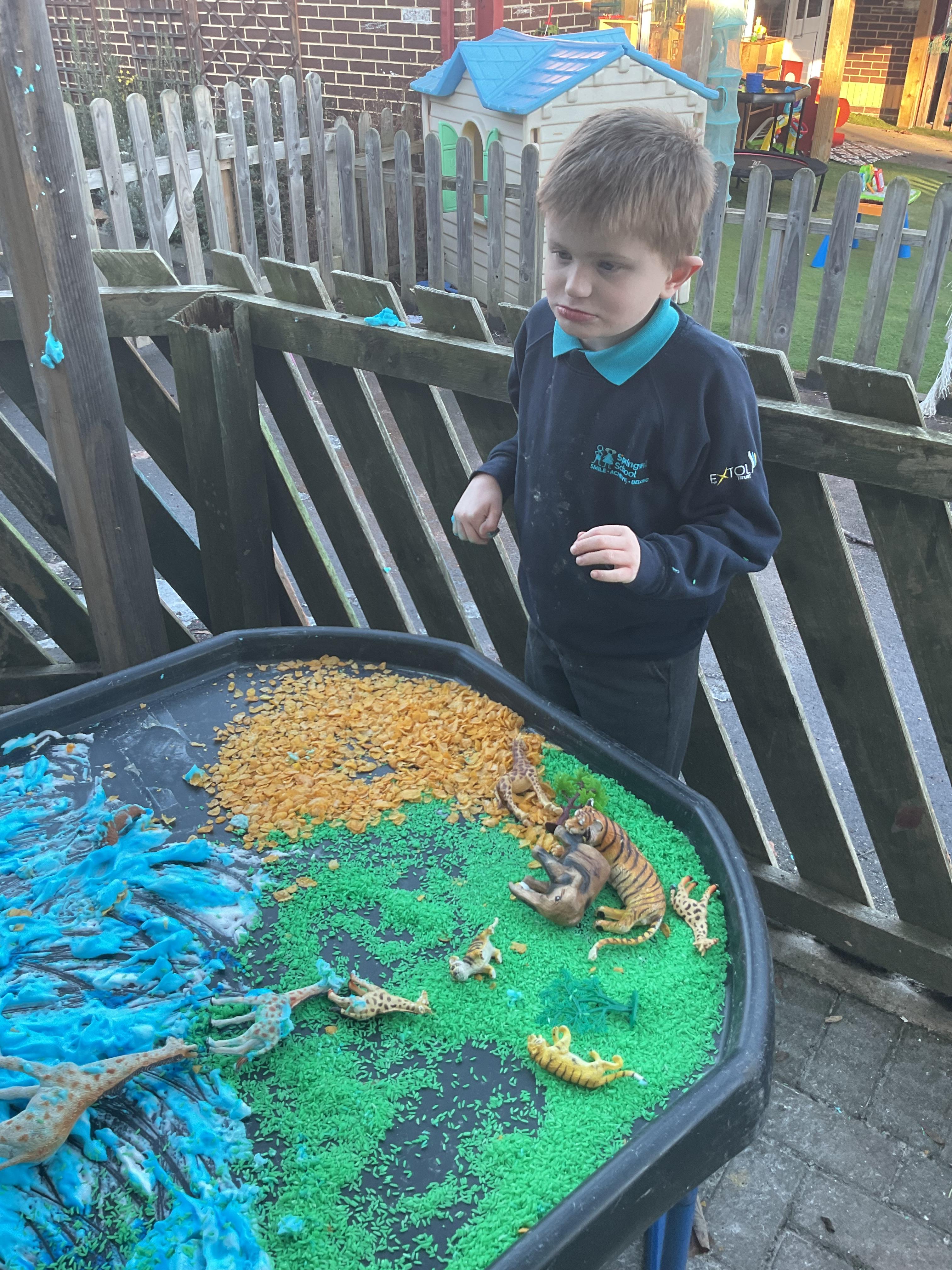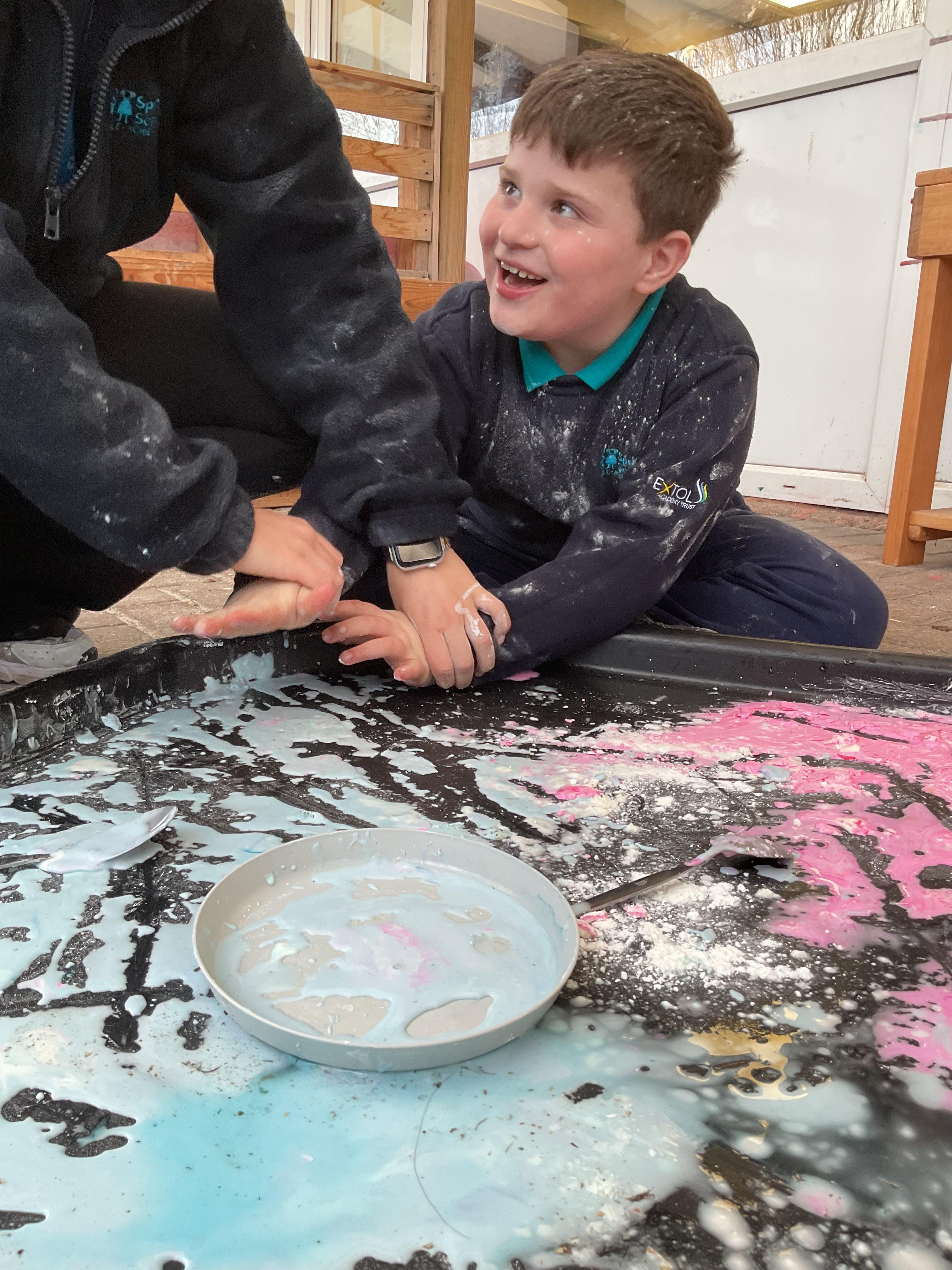 This week has been full of excitement as we continued our learning all about the future. The children loved revisiting our sensory story “Tomorrow, Tomorrow” and engaged brilliantly with all the interactive element. Our colour of the week was black and we explored a range of black objects on our themed table while also learning the Makaton sign for black. In maths, we investigated big and small rockets using a messy play tuff tray filled with rice, pasta and chickpeas. We also had great fun making green gloop, watching how it moved and noticing the sensory experience as it dripped from the plate. Everyone has worked incredibly hard on their workbox tasks, including building with blocks, matching activities and mark making.