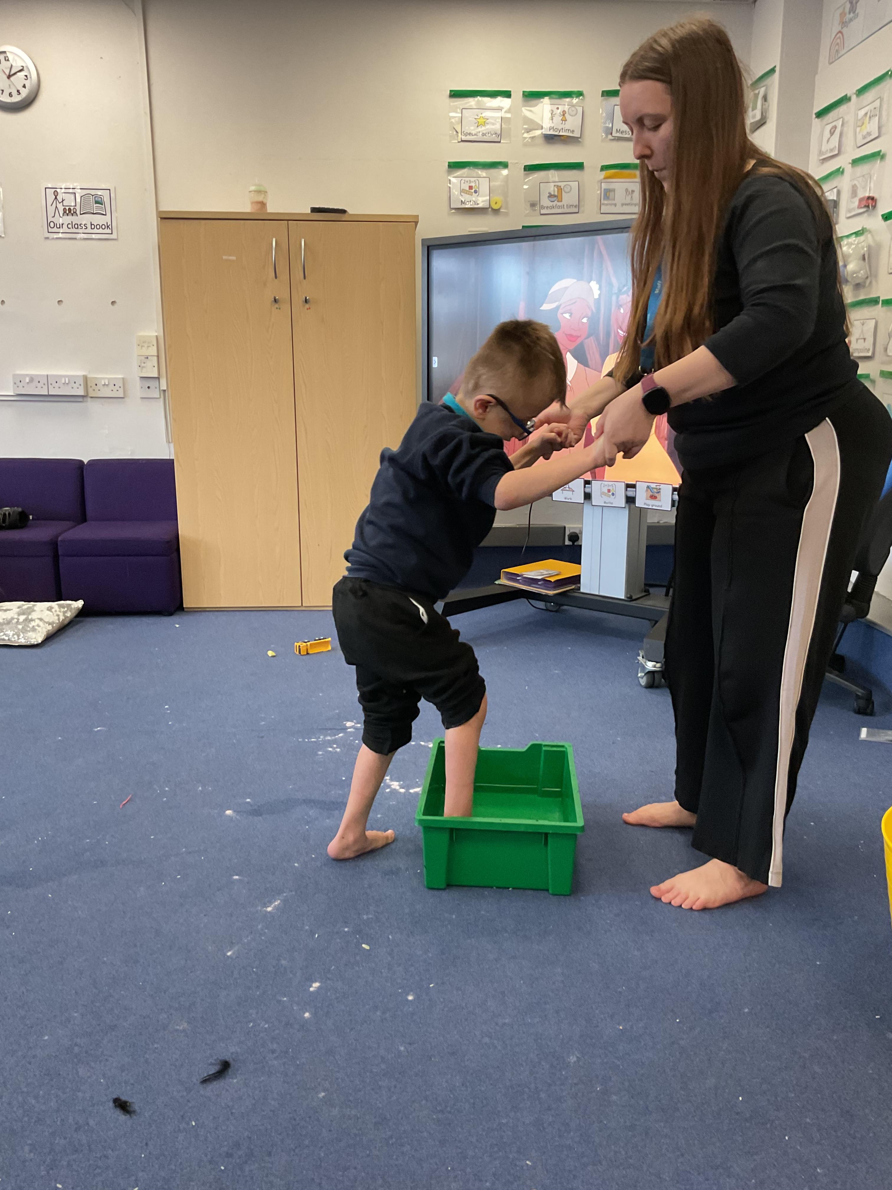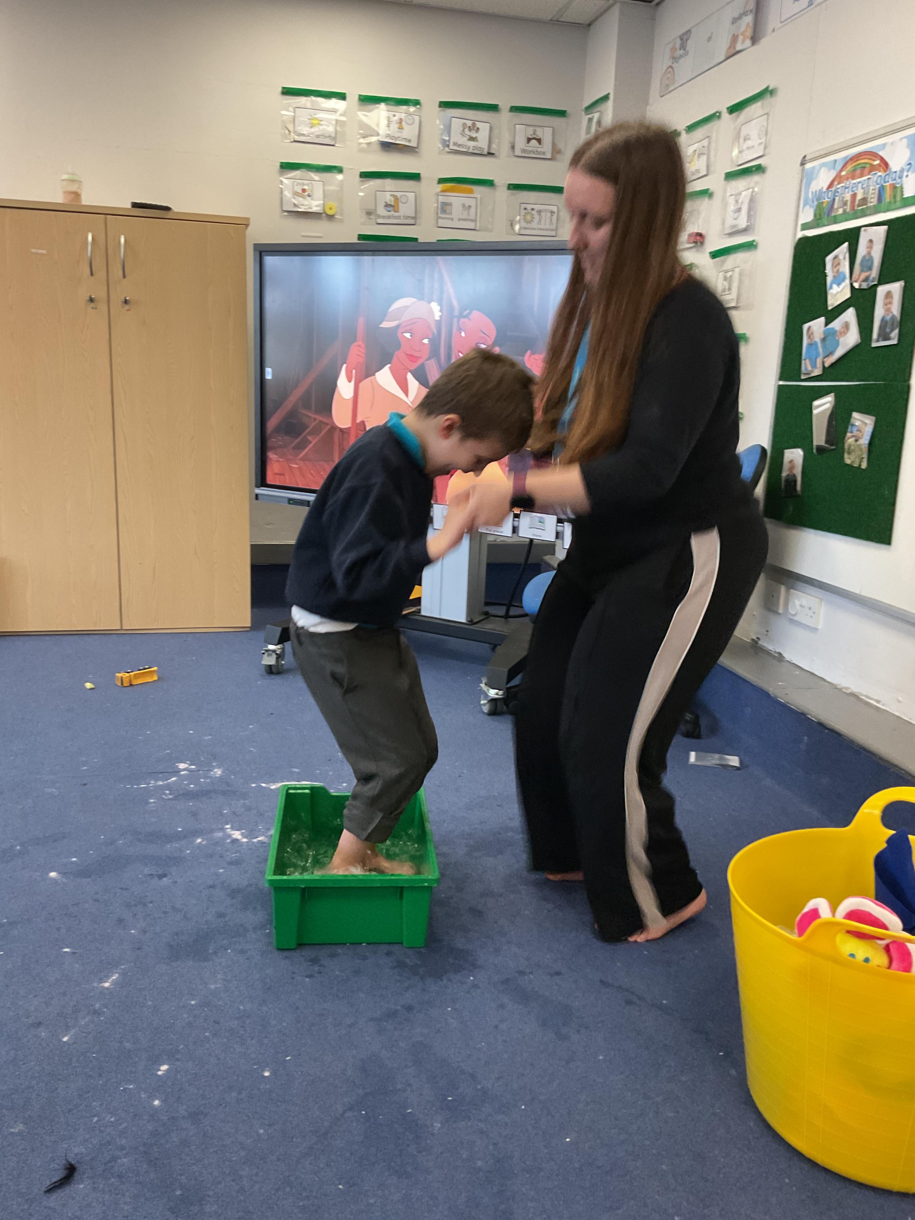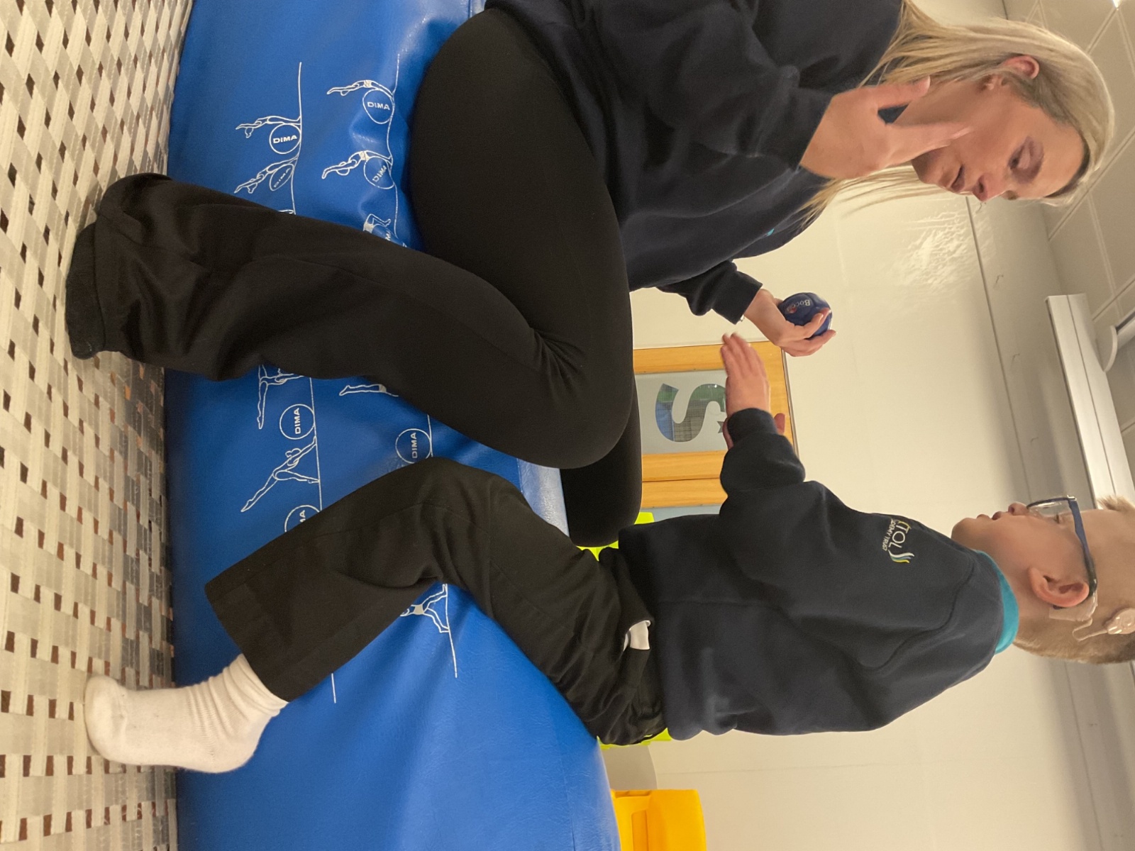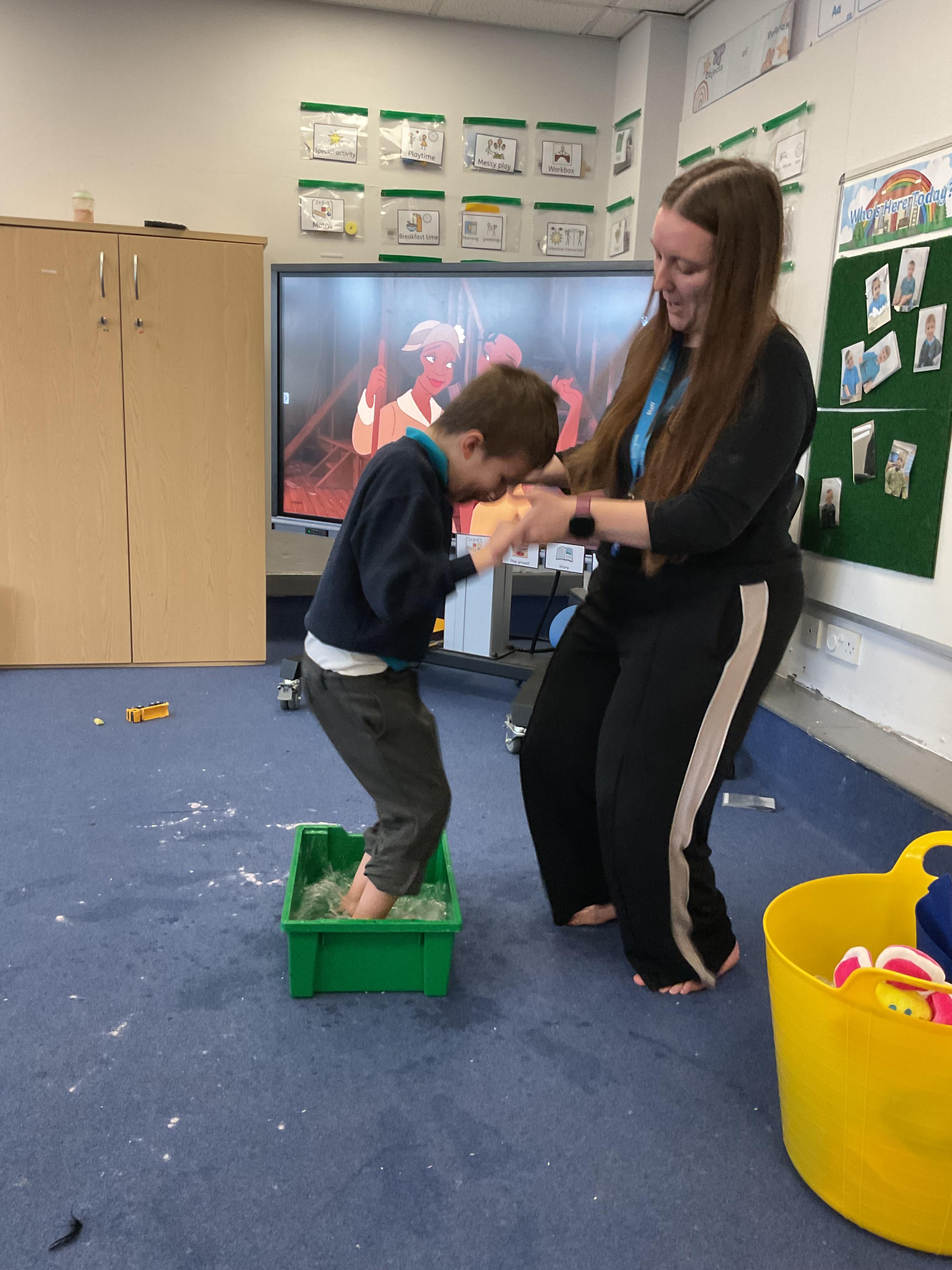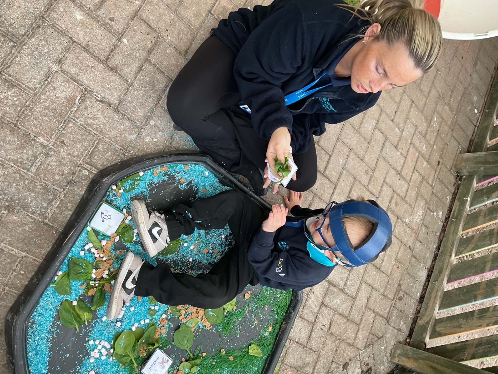 We have had a wonderful week filled with movement, sensory experiences and lots of focused learning. On Monday, the children took part in their rebound session, working hard on their gross motor skills and making great progress towards their individual targets. We also enjoyed some peaceful relaxation time, snuggling up with blankets and taking part in a calming sensory massage. It was a lovely opportunity for everyone to unwind and regulate. The children showed brilliant attention during our Attention Autism session, watching carefully and engaging beautifully throughout. Their focus and curiosity were fantastic. To finish the week, we explored two exciting tuff trays. One tray encouraged the children to try a variety of different foods, while the other supported their cutting skills as they chopped fruits and vegetables. We also had a sensory spring‑themed tray, where the children explored foods representing grass, sky, leaves, and clouds — a fun and creative way to learn through touch, smell and play.