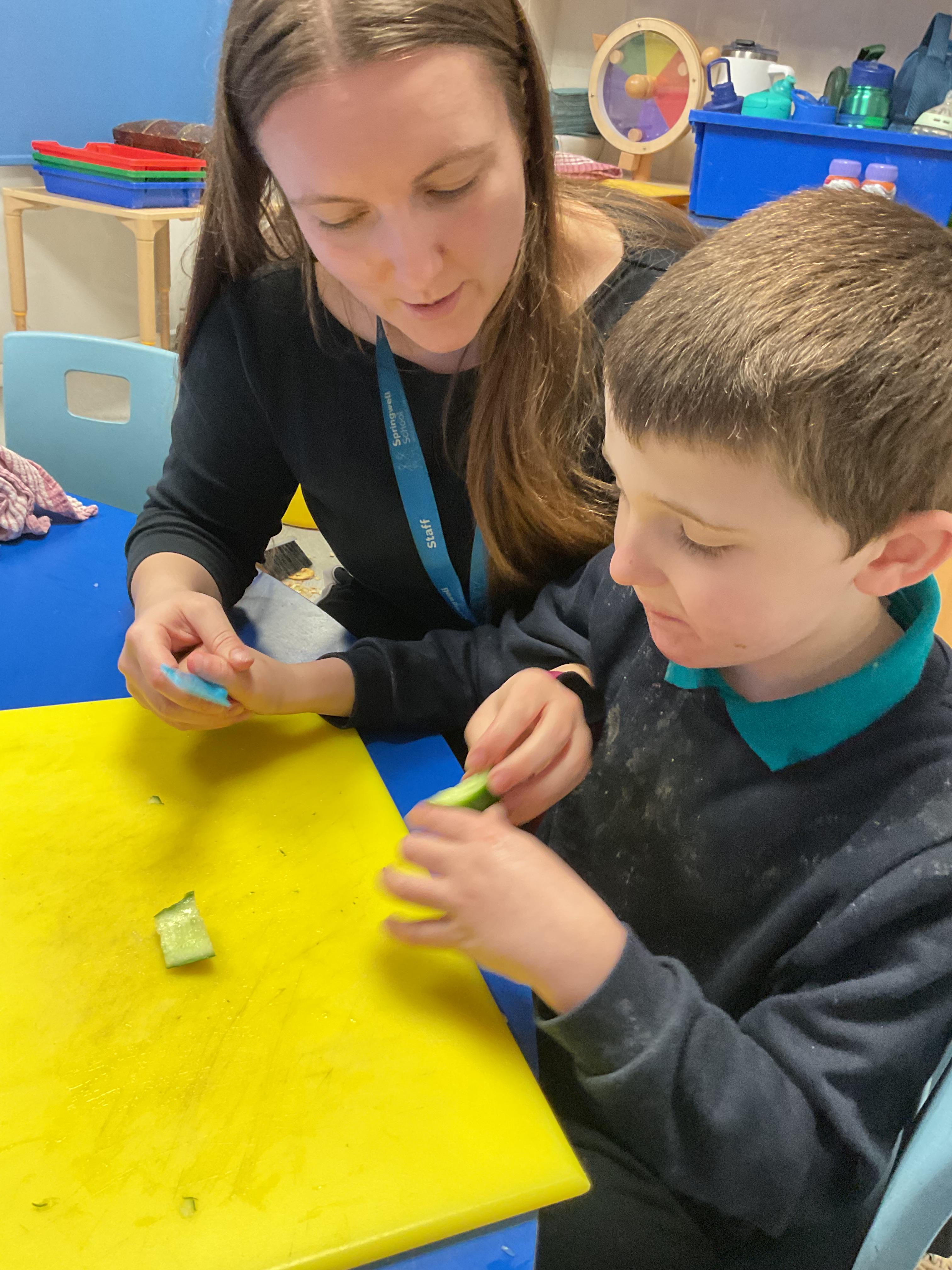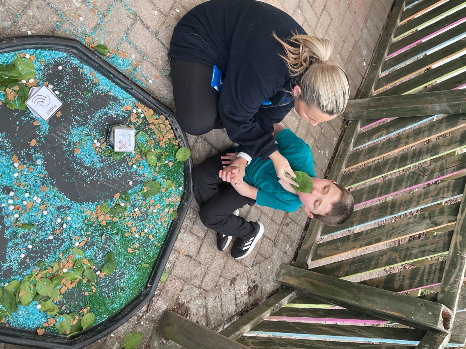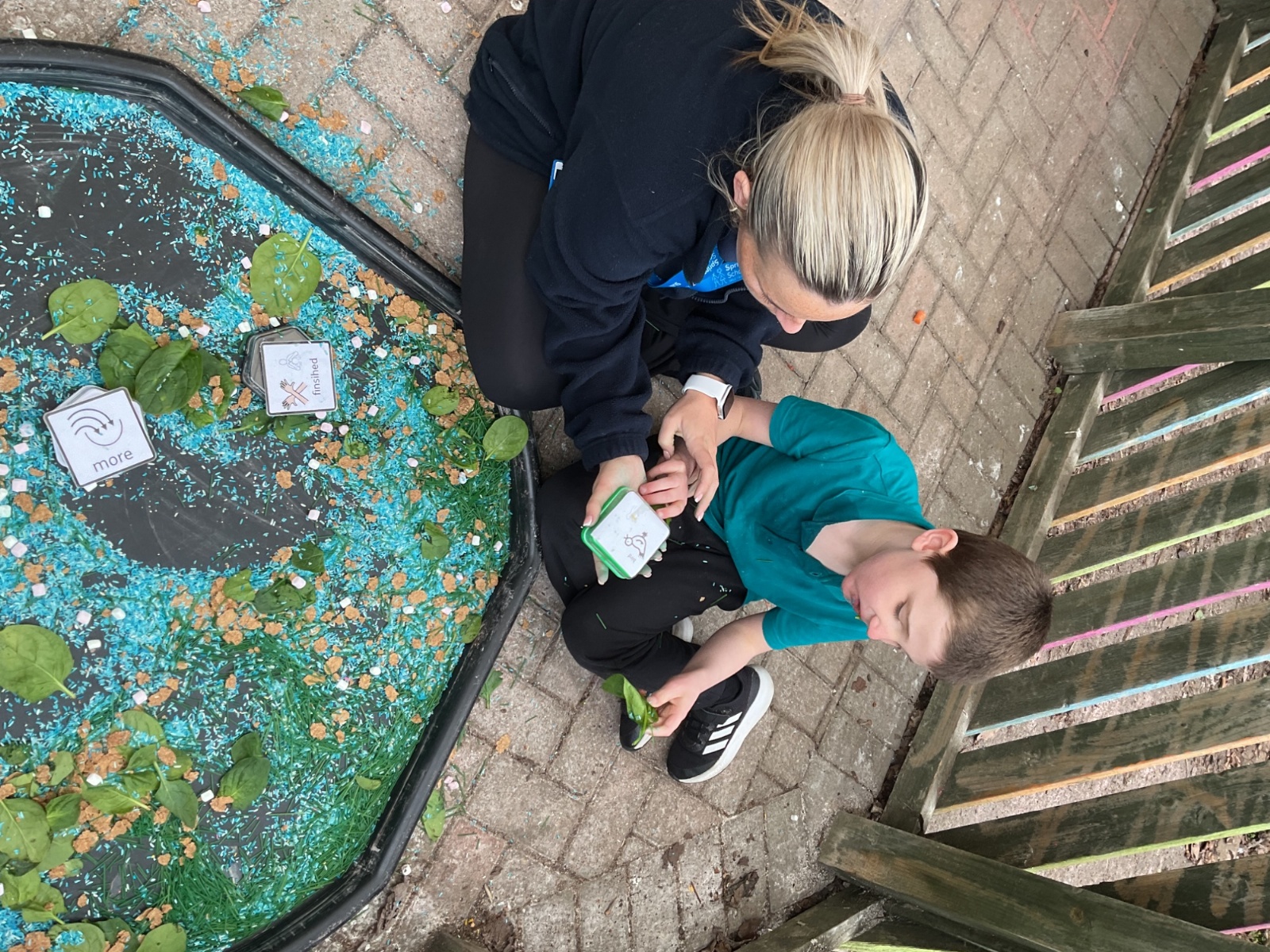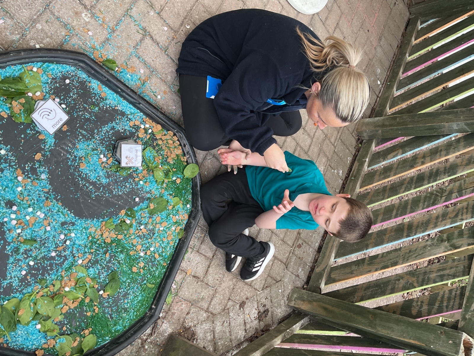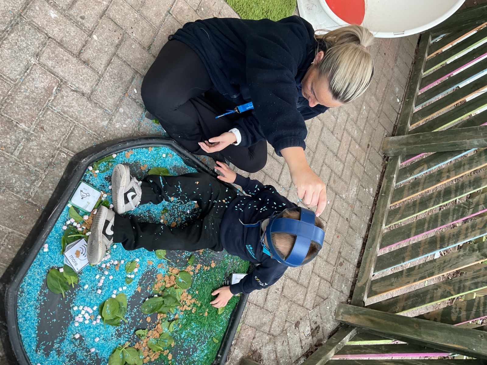 We have had a wonderful week filled with movement, sensory experiences and lots of focused learning. On Monday, the children took part in their rebound session, working hard on their gross motor skills and making great progress towards their individual targets. We also enjoyed some peaceful relaxation time, snuggling up with blankets and taking part in a calming sensory massage. It was a lovely opportunity for everyone to unwind and regulate. The children showed brilliant attention during our Attention Autism session, watching carefully and engaging beautifully throughout. Their focus and curiosity were fantastic. To finish the week, we explored two exciting tuff trays. One tray encouraged the children to try a variety of different foods, while the other supported their cutting skills as they chopped fruits and vegetables. We also had a sensory spring‑themed tray, where the children explored foods representing grass, sky, leaves, and clouds — a fun and creative way to learn through touch, smell and play.