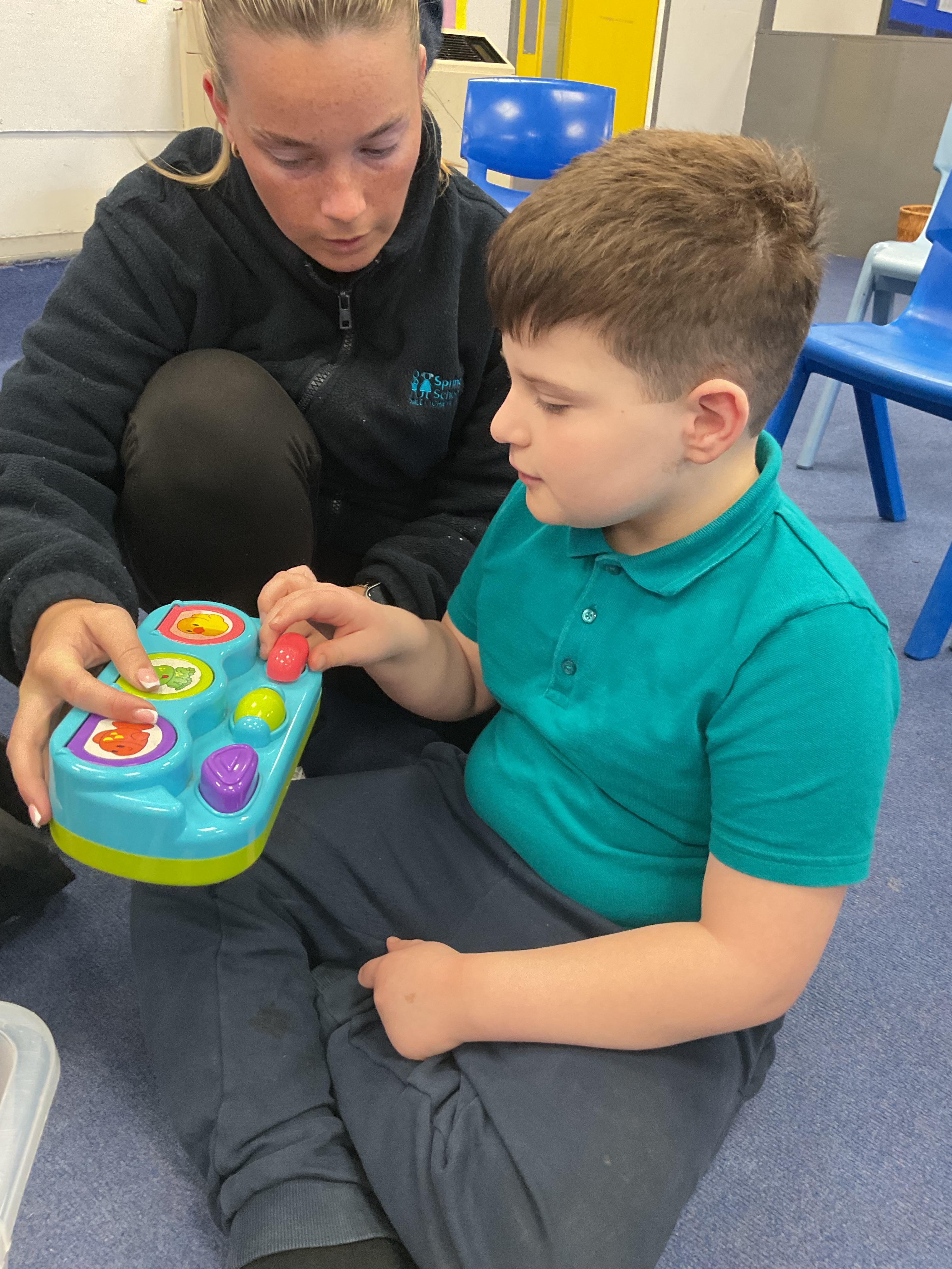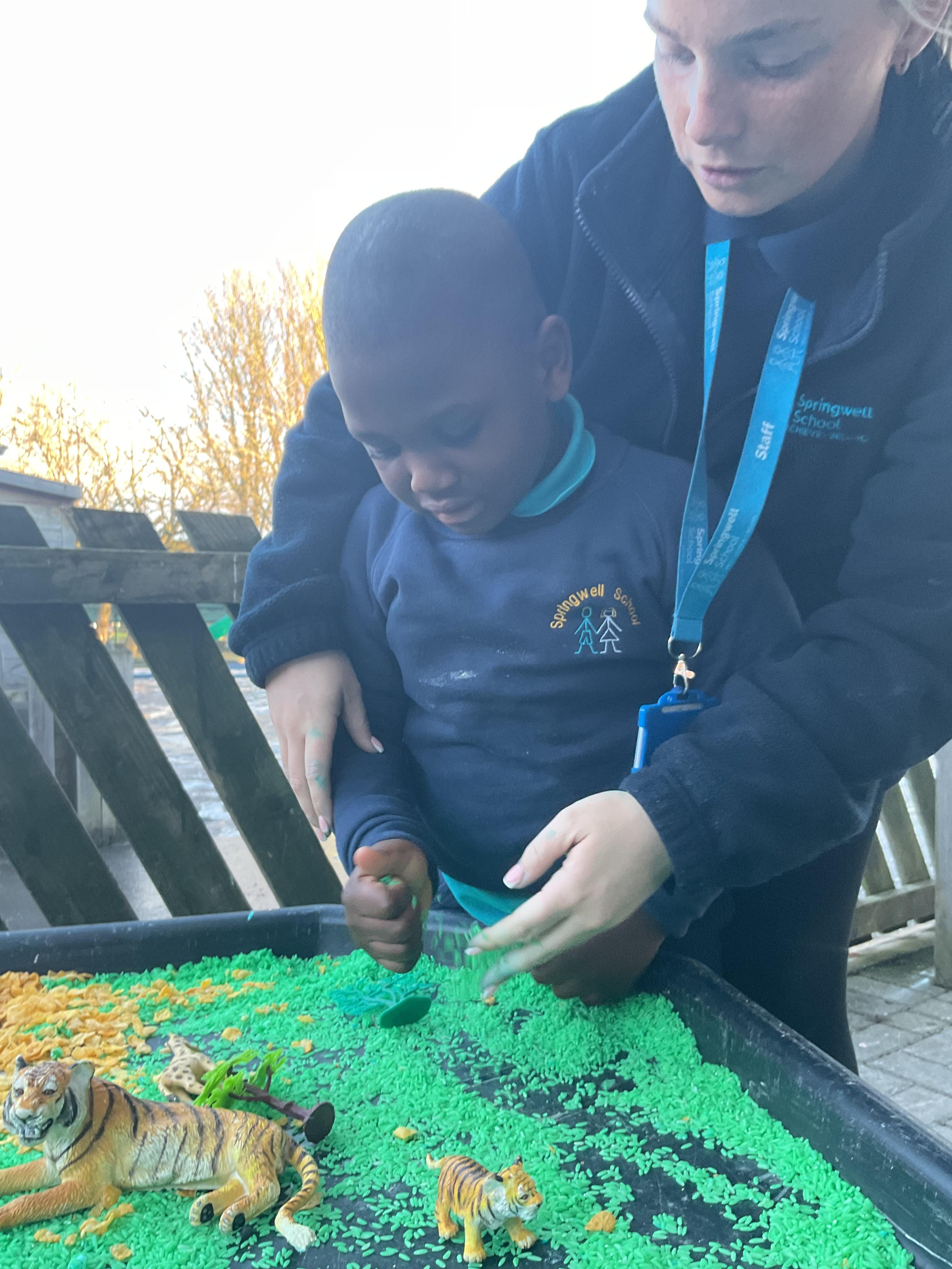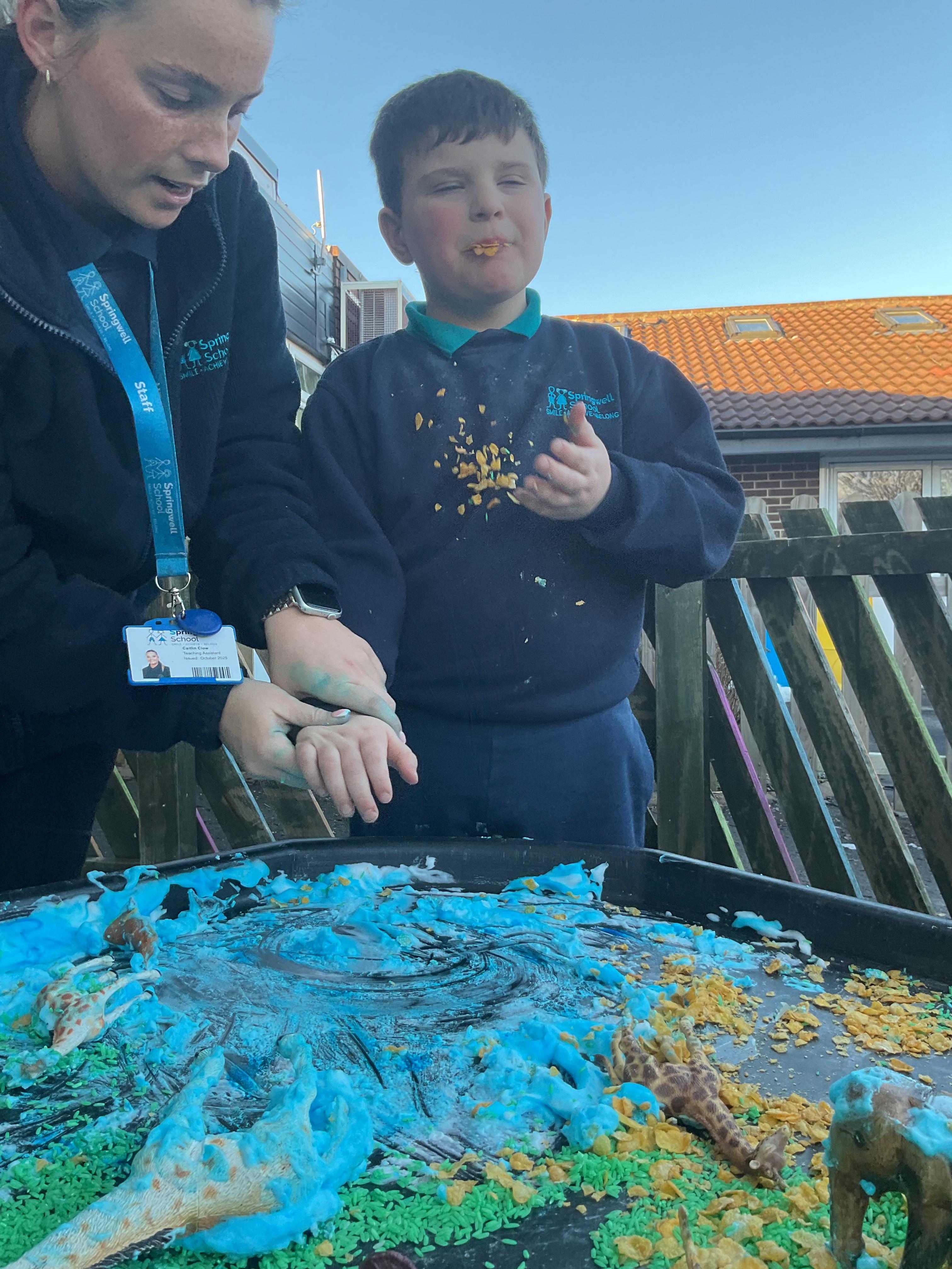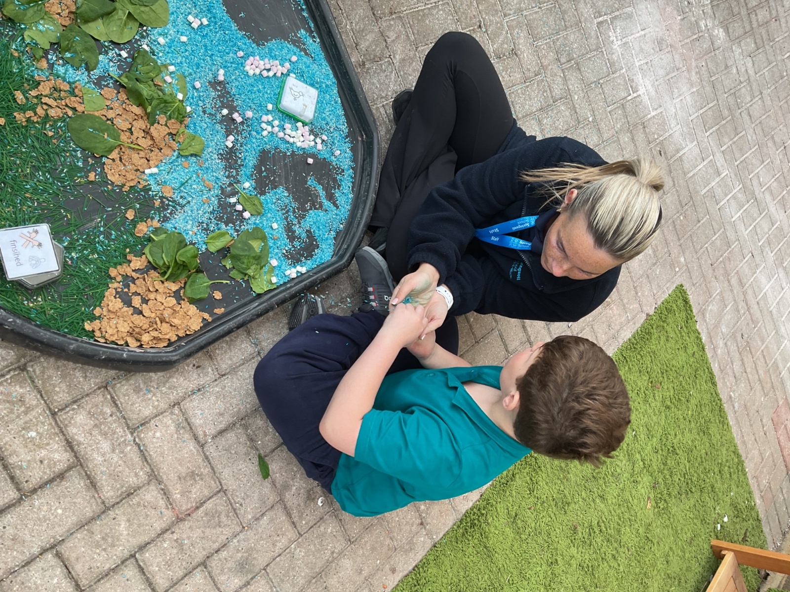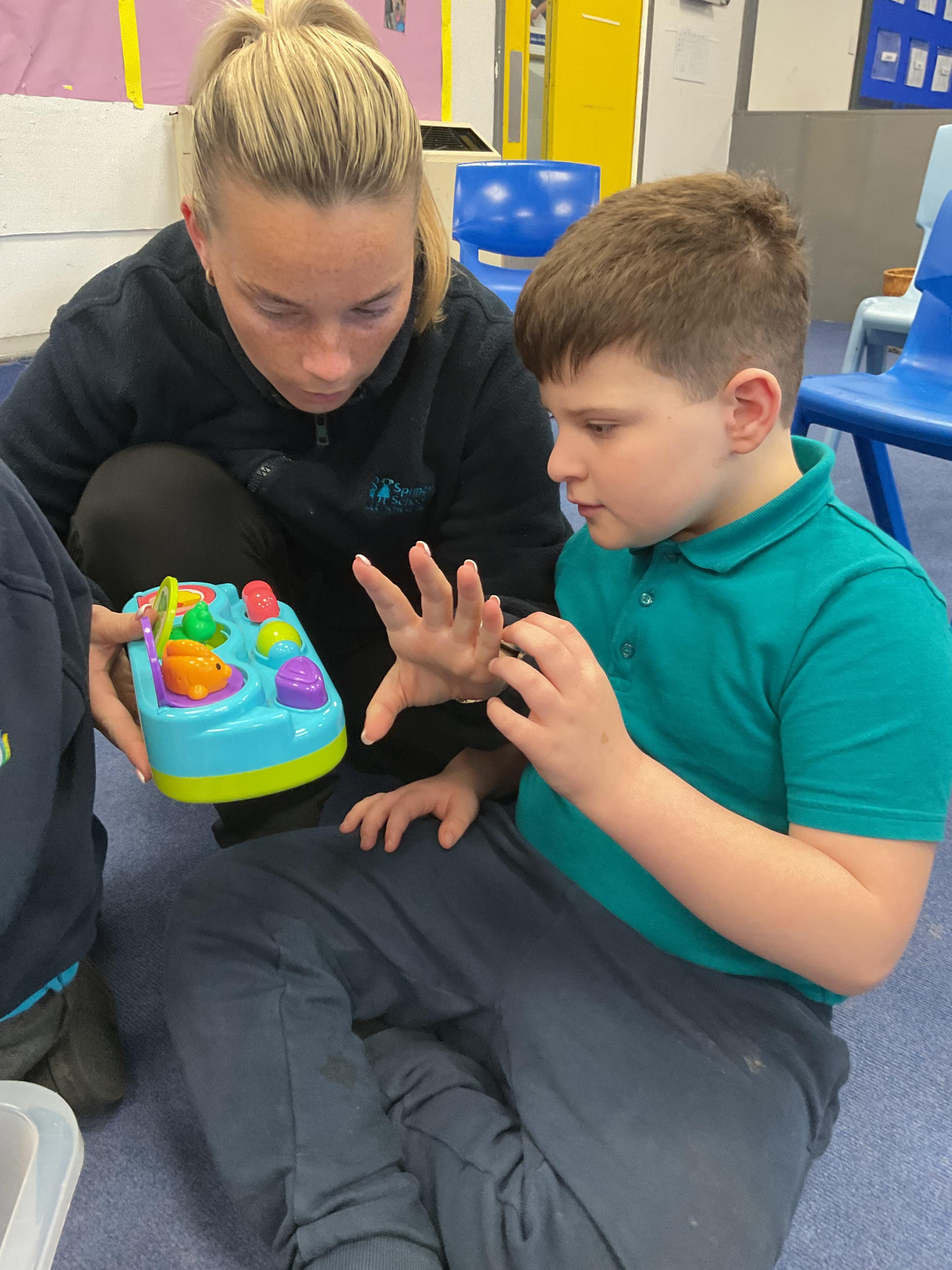 We have had a wonderful week filled with movement, sensory experiences and lots of focused learning. On Monday, the children took part in their rebound session, working hard on their gross motor skills and making great progress towards their individual targets. We also enjoyed some peaceful relaxation time, snuggling up with blankets and taking part in a calming sensory massage. It was a lovely opportunity for everyone to unwind and regulate. The children showed brilliant attention during our Attention Autism session, watching carefully and engaging beautifully throughout. Their focus and curiosity were fantastic. To finish the week, we explored two exciting tuff trays. One tray encouraged the children to try a variety of different foods, while the other supported their cutting skills as they chopped fruits and vegetables. We also had a sensory spring‑themed tray, where the children explored foods representing grass, sky, leaves, and clouds — a fun and creative way to learn through touch, smell and play.