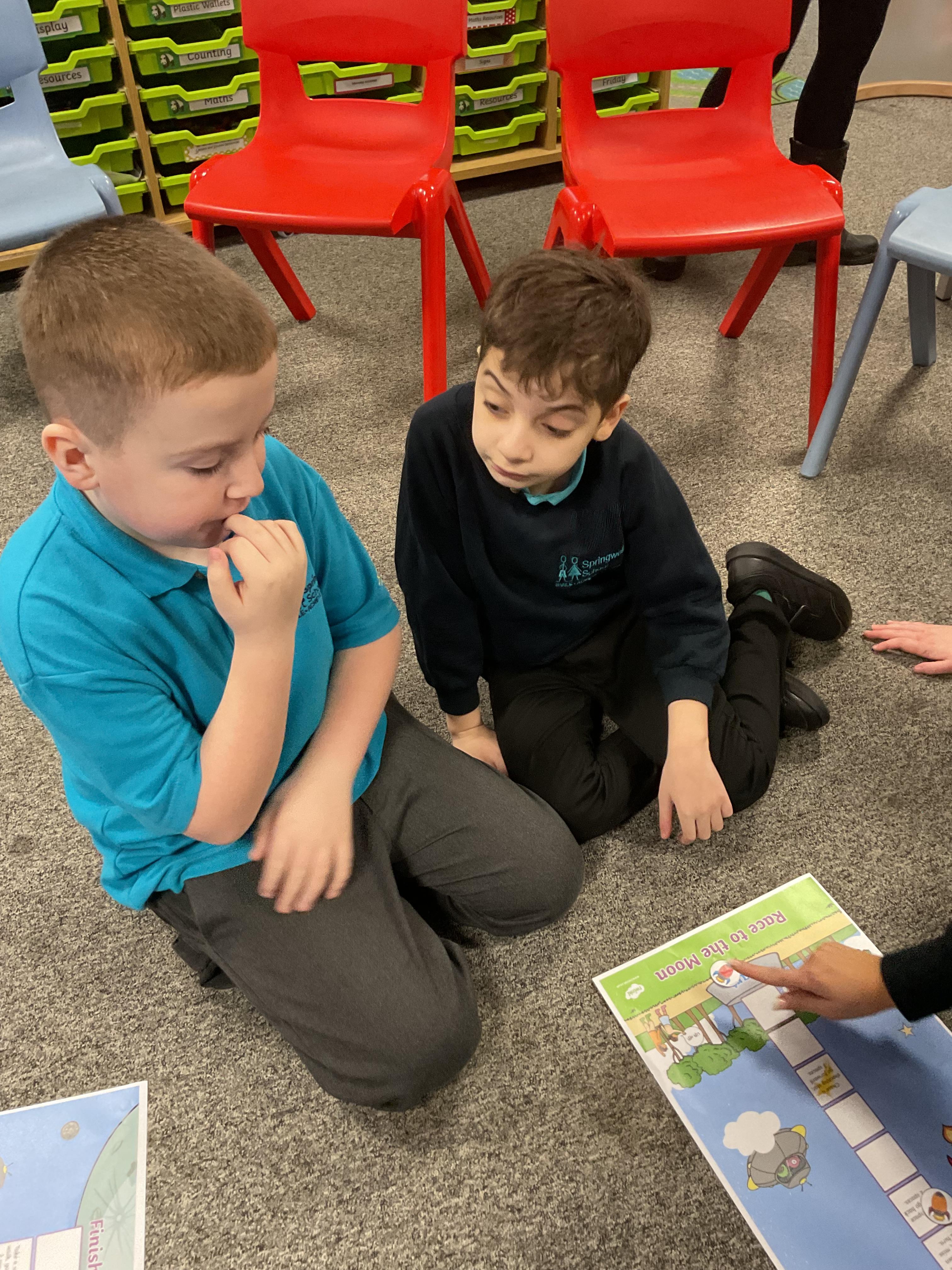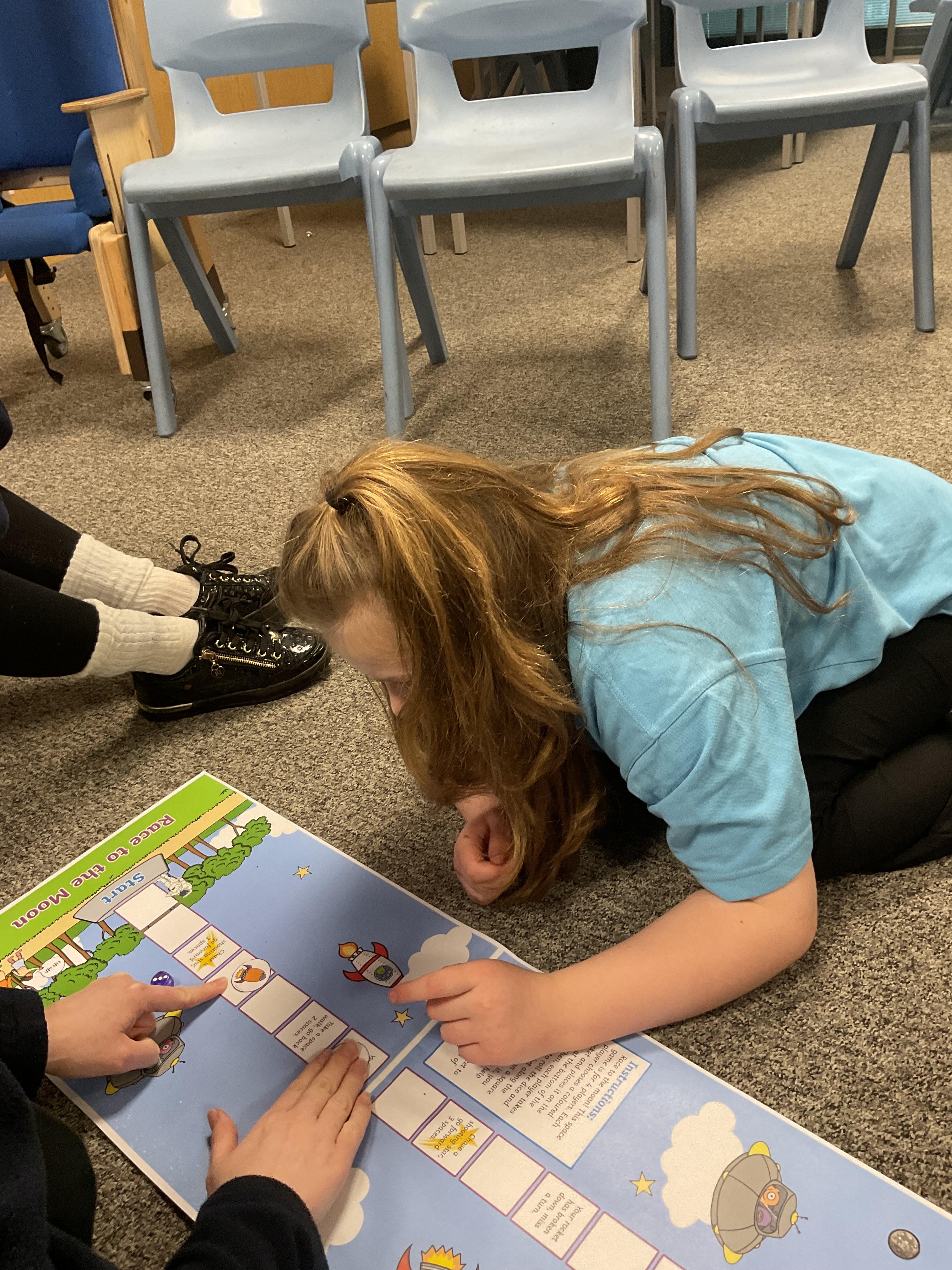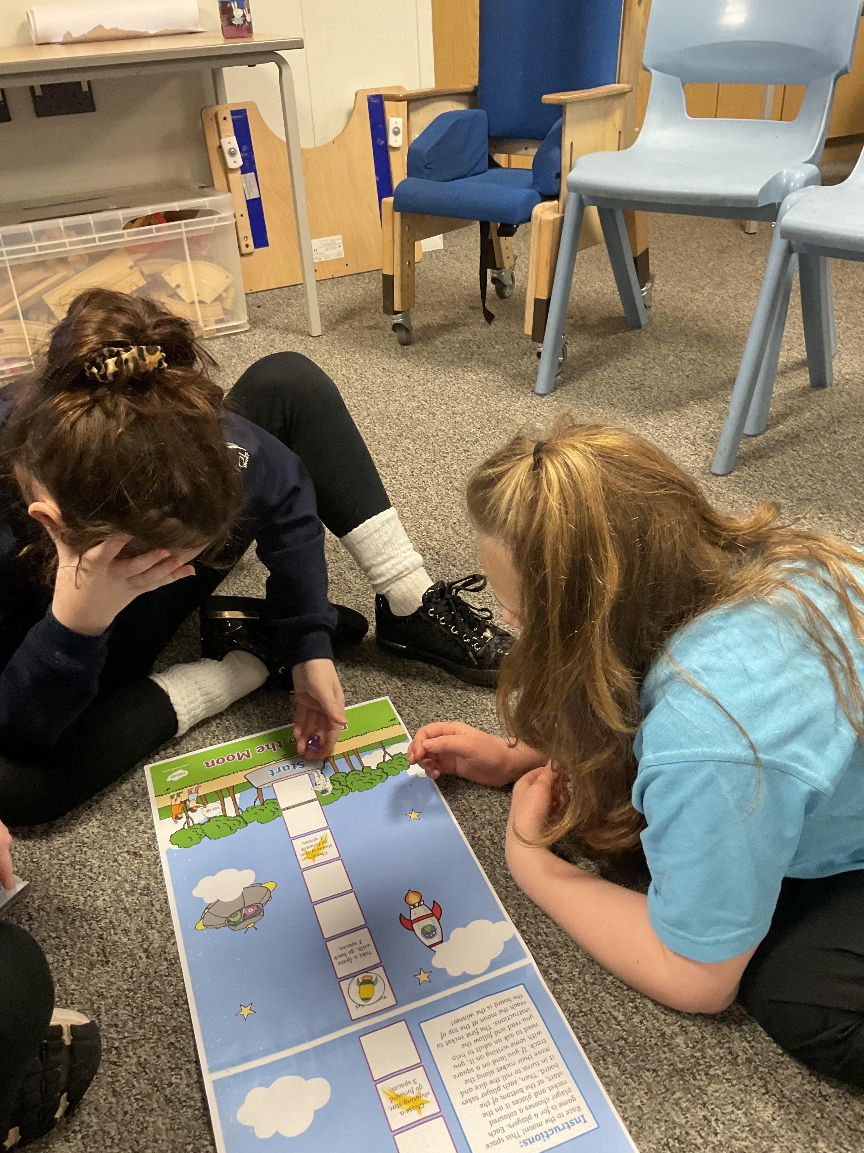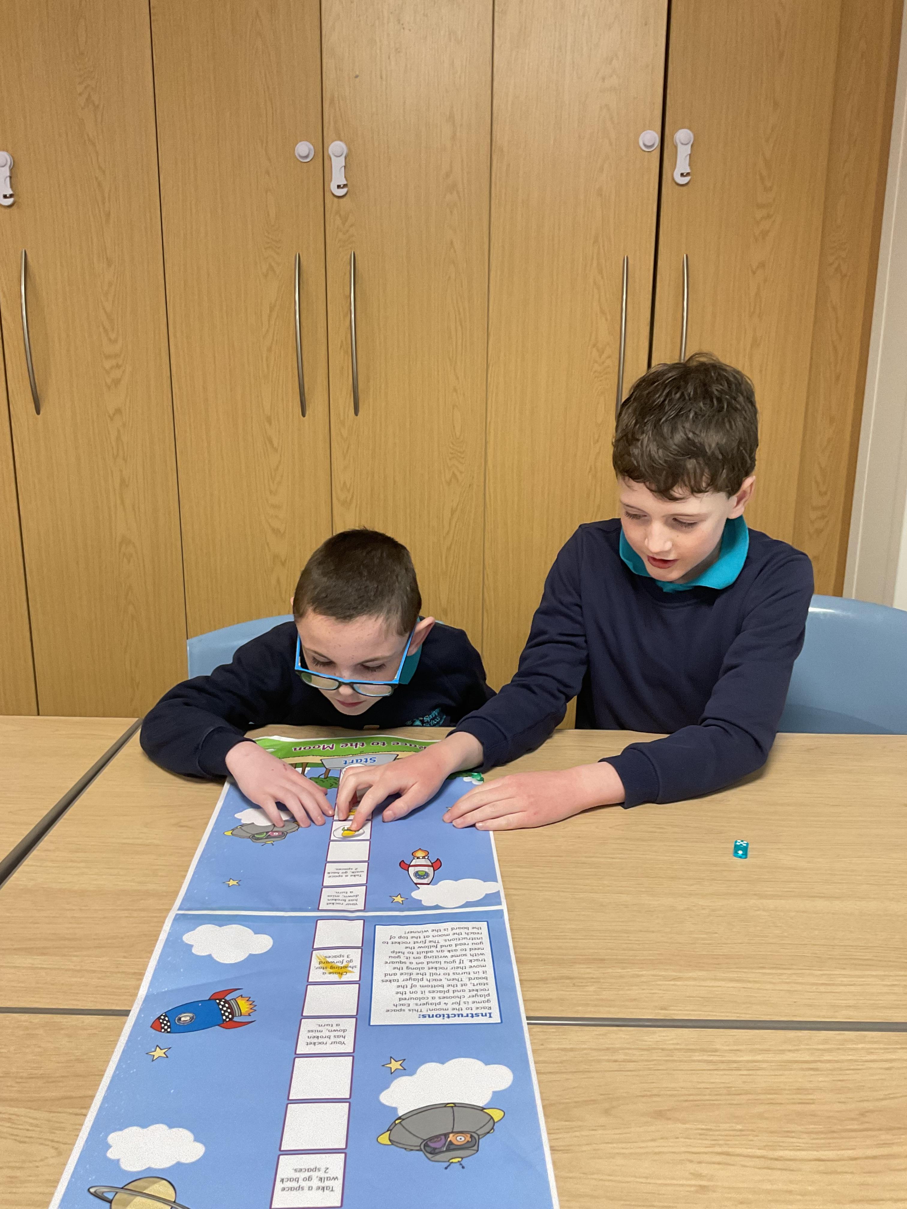 Today, we took turns in pairs playing our space game. We rolled the dice, counted dots, and moved up the rocket ship until we had a winner!