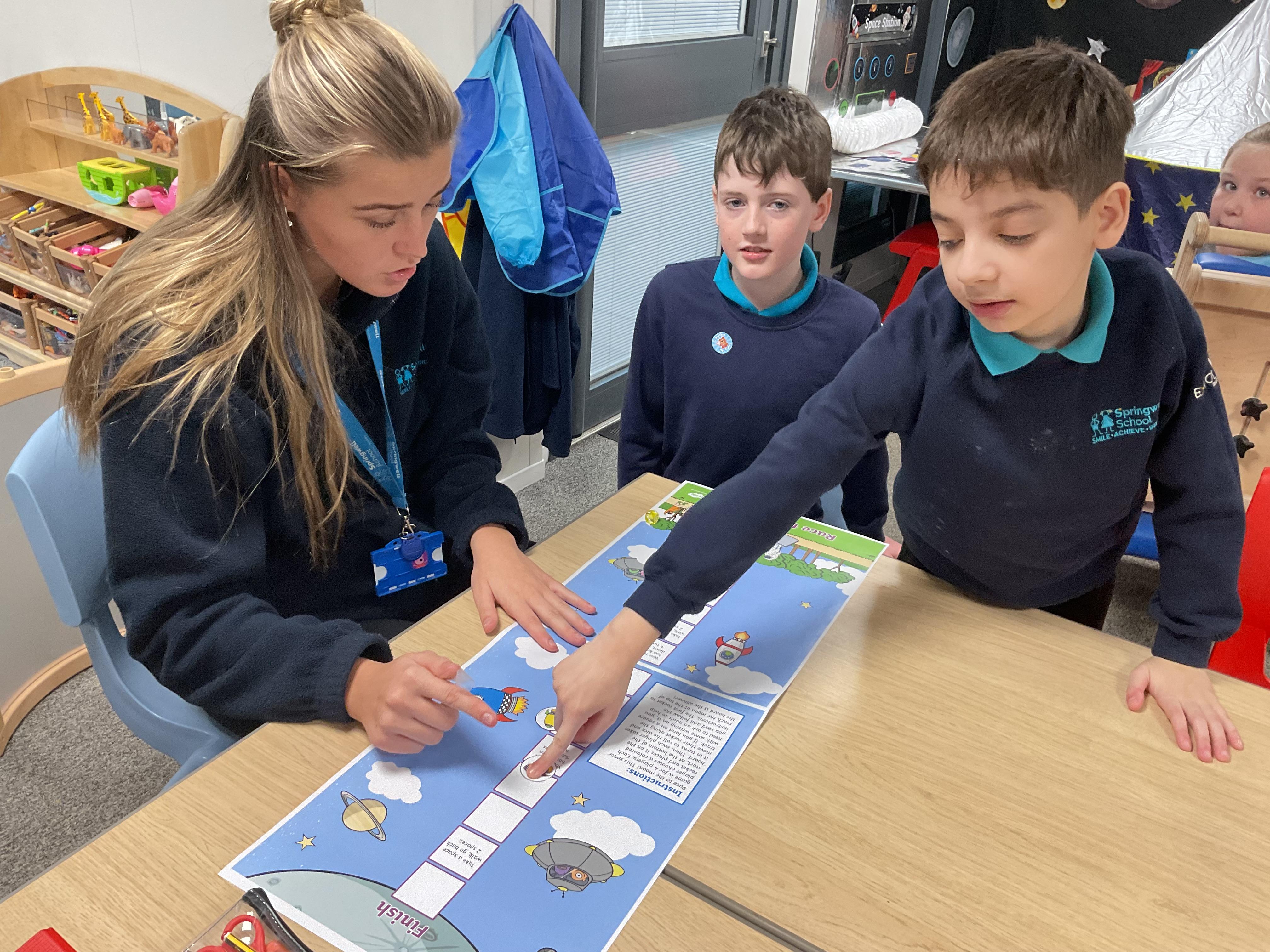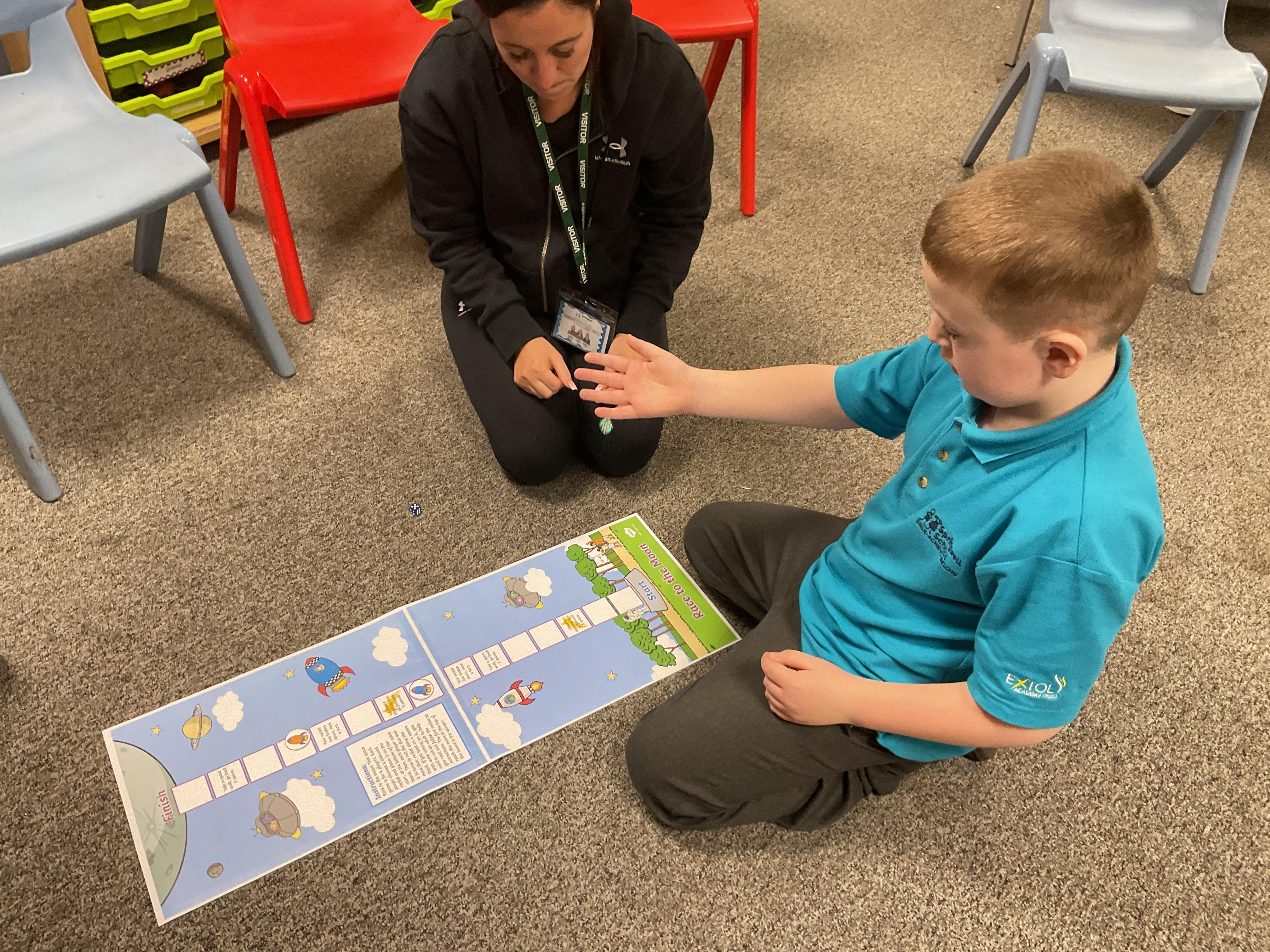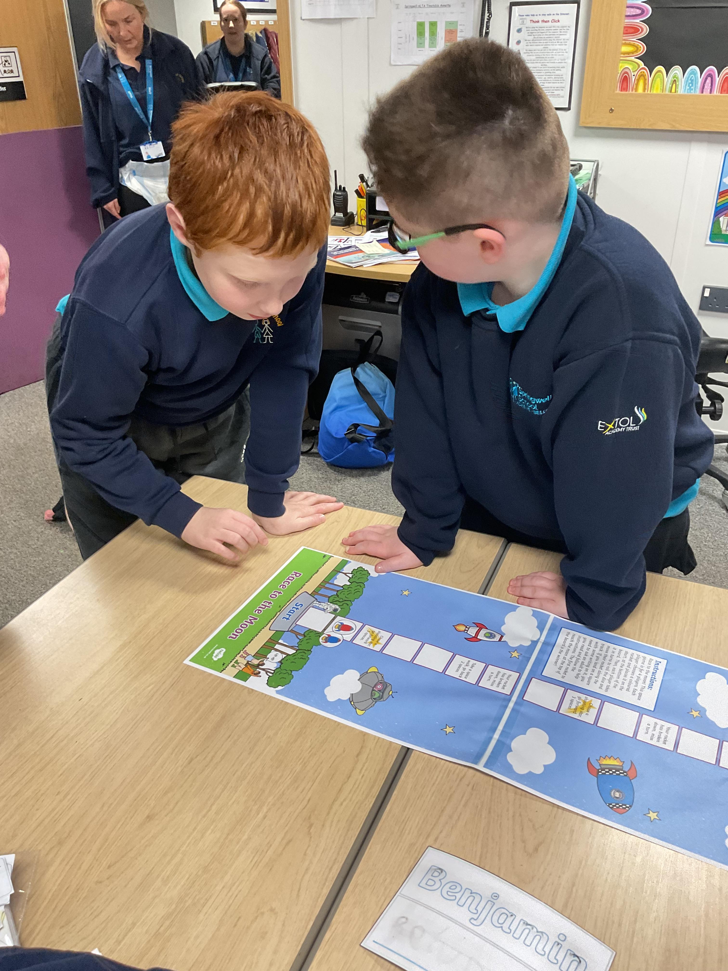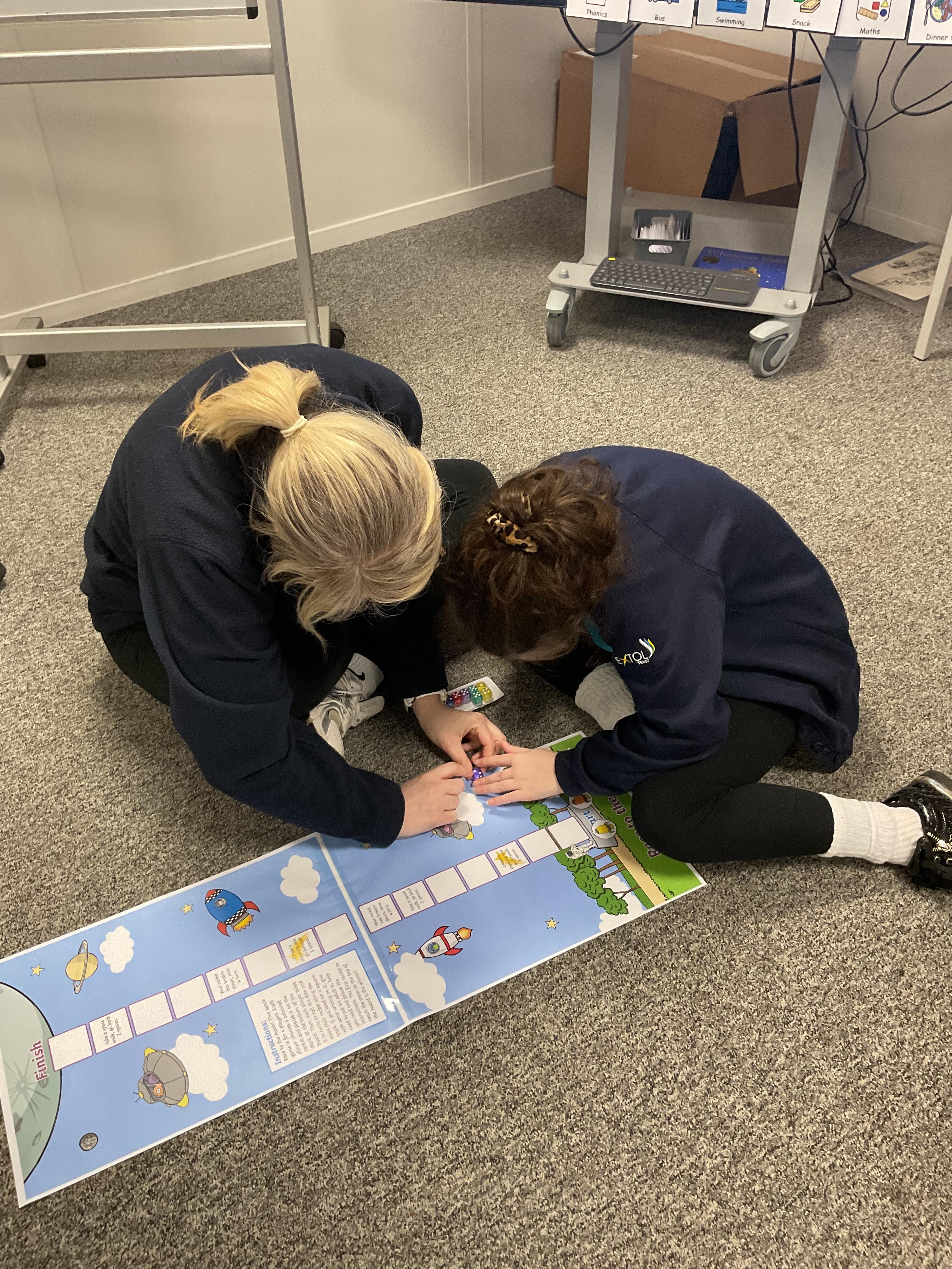 Today, we took turns in pairs playing our space game. We rolled the dice, counted dots, and moved up the rocket ship until we had a winner!