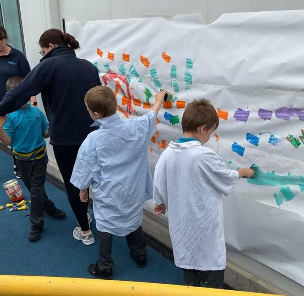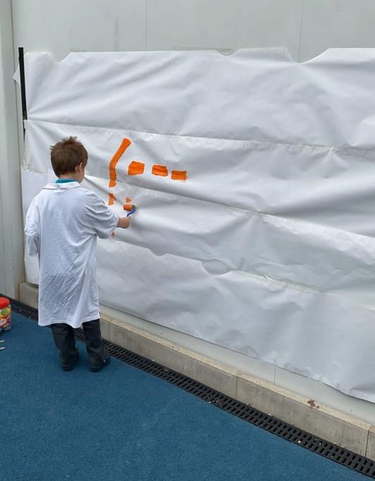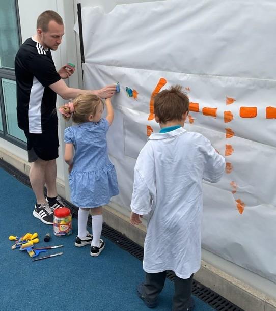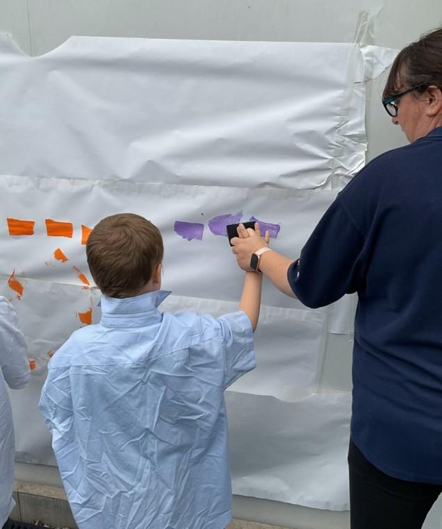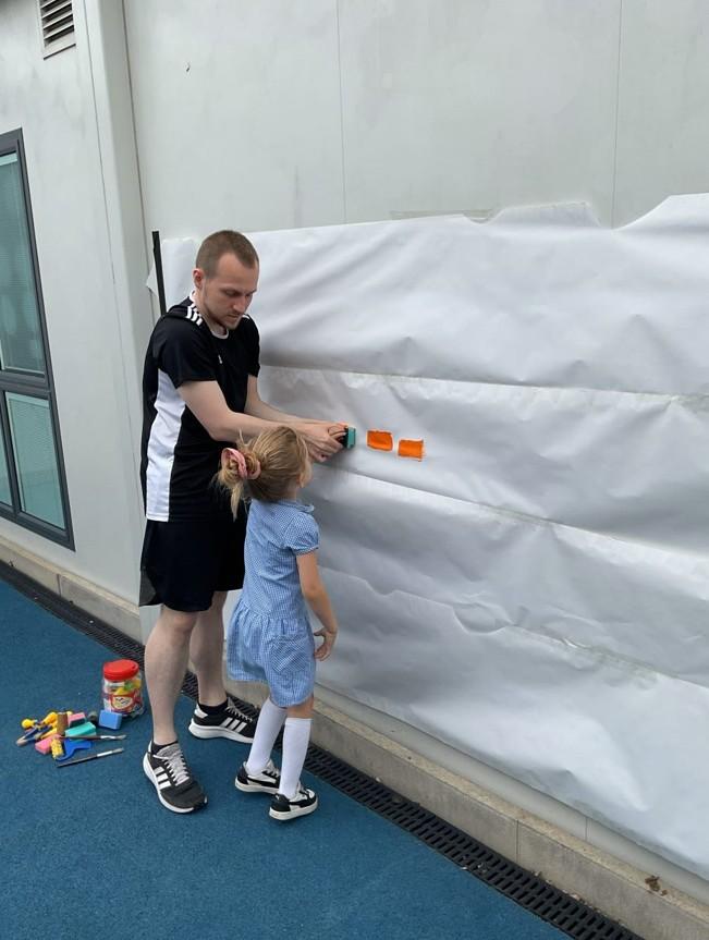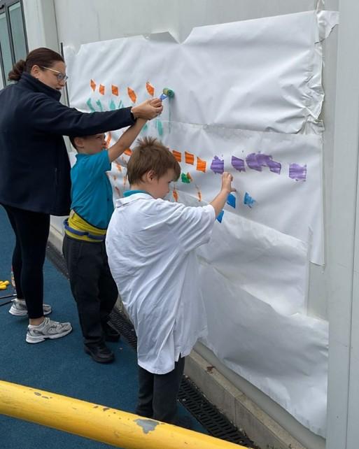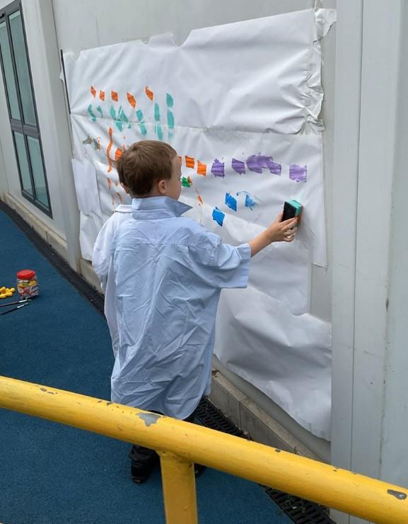 1.7.25 - Today Toucan class went outside to do some painting. We used sponges and rollers to paint a picture on the wall of a scene from our new class story "The Magic Train Ride". It was very messy but great fun!