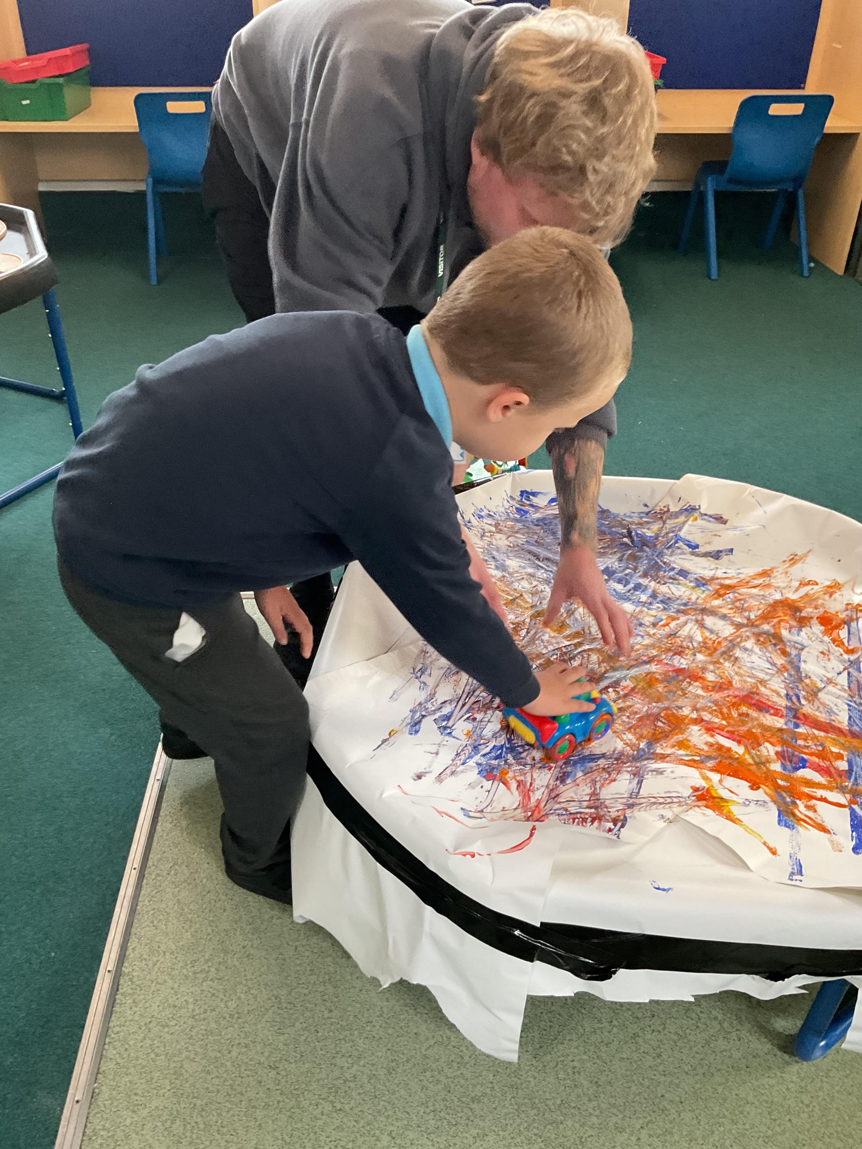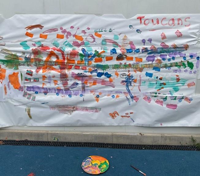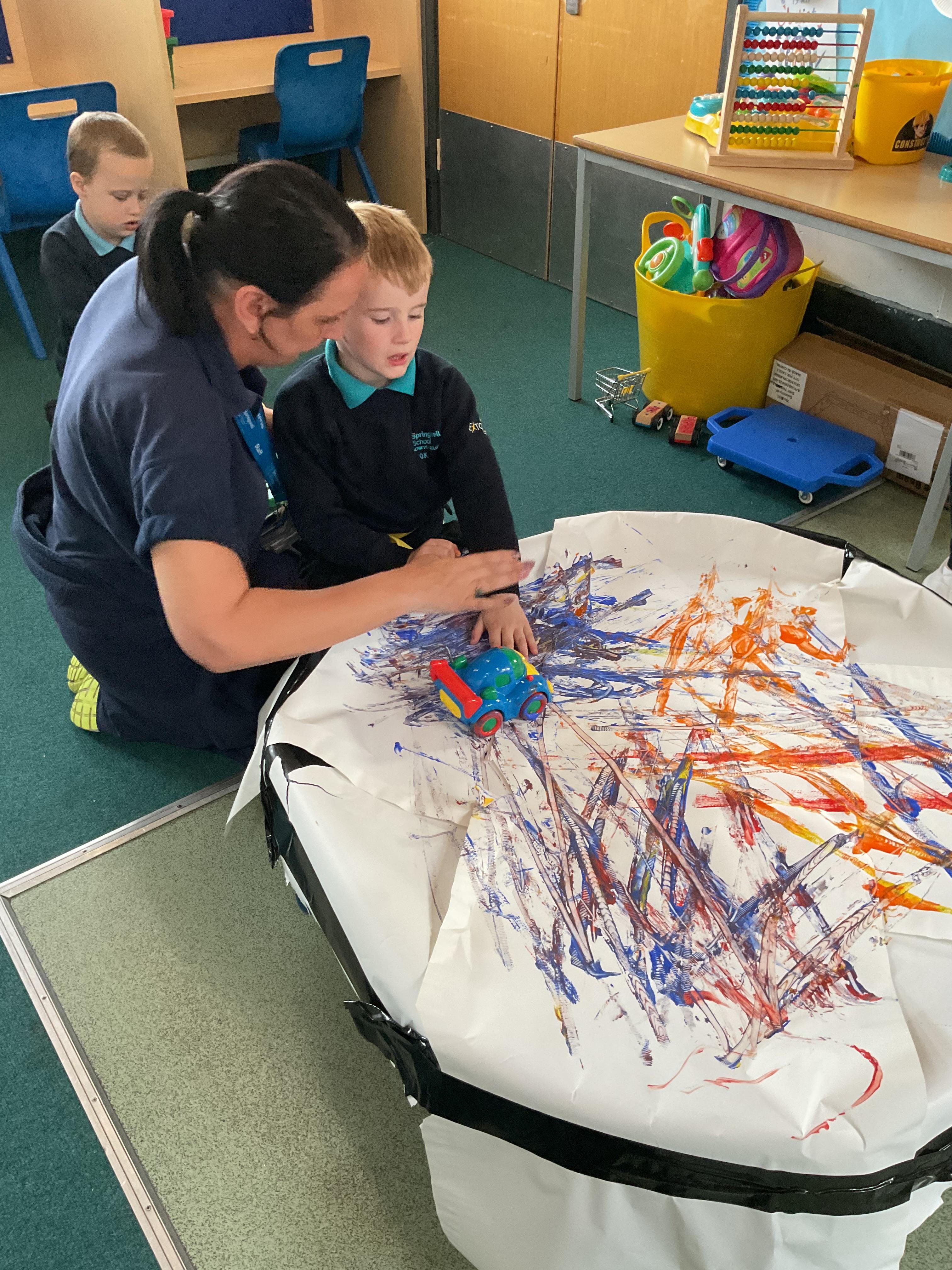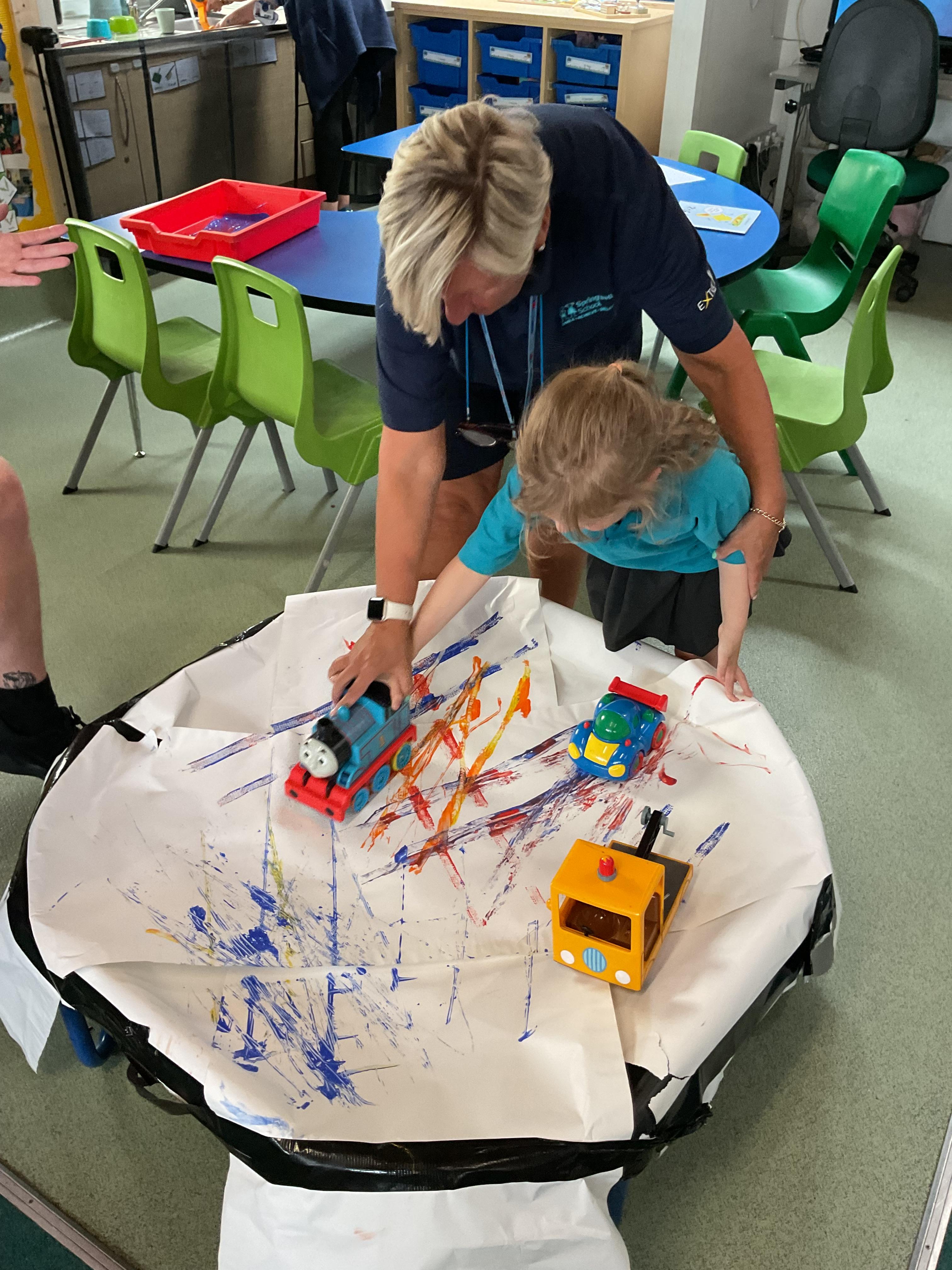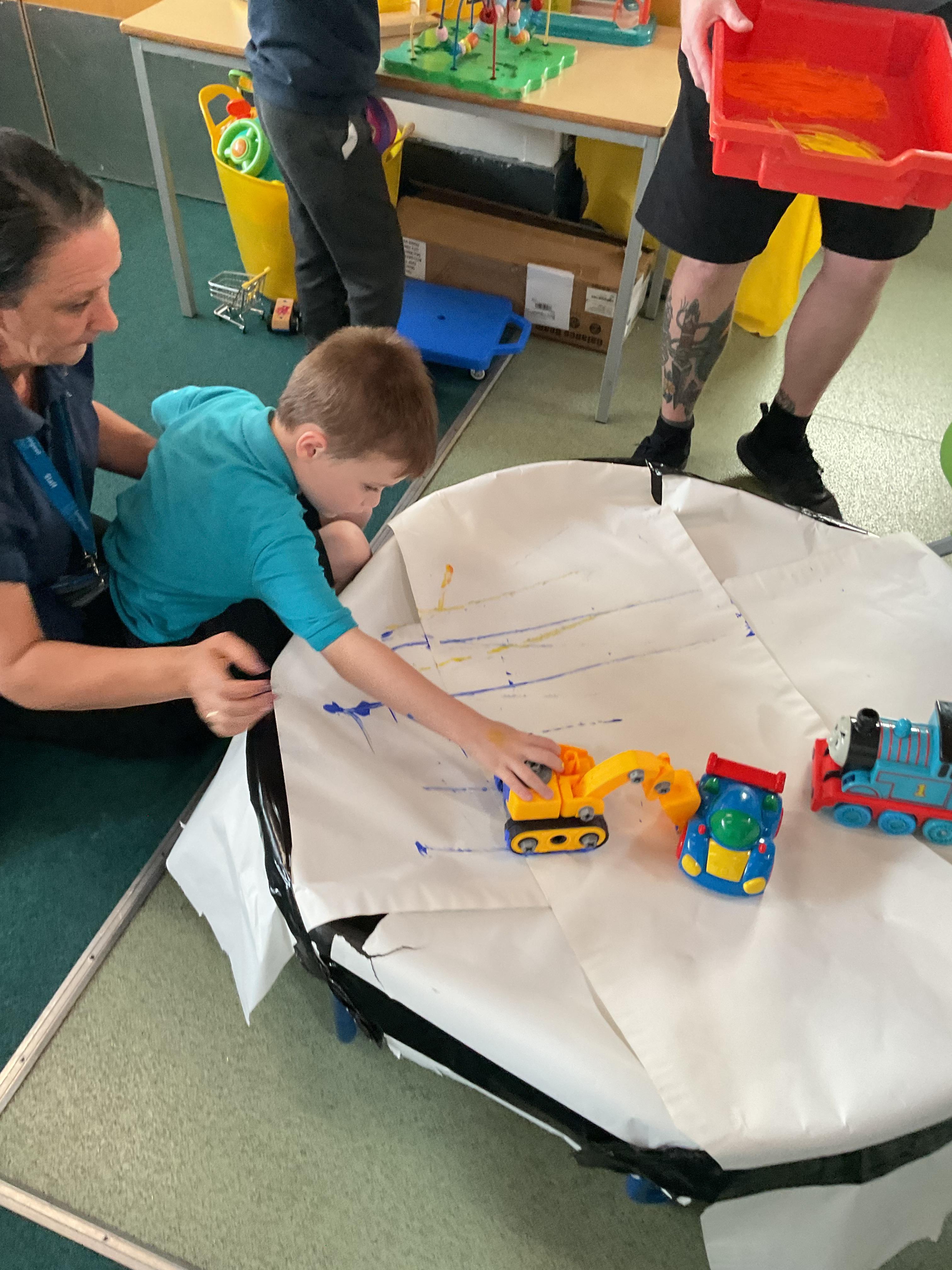 14.5.25 This week the Toucans have enjoyed painting with cars and trucks! They pushed the vehicles through the paint to make tracks on the paper. Great artwork everyone!