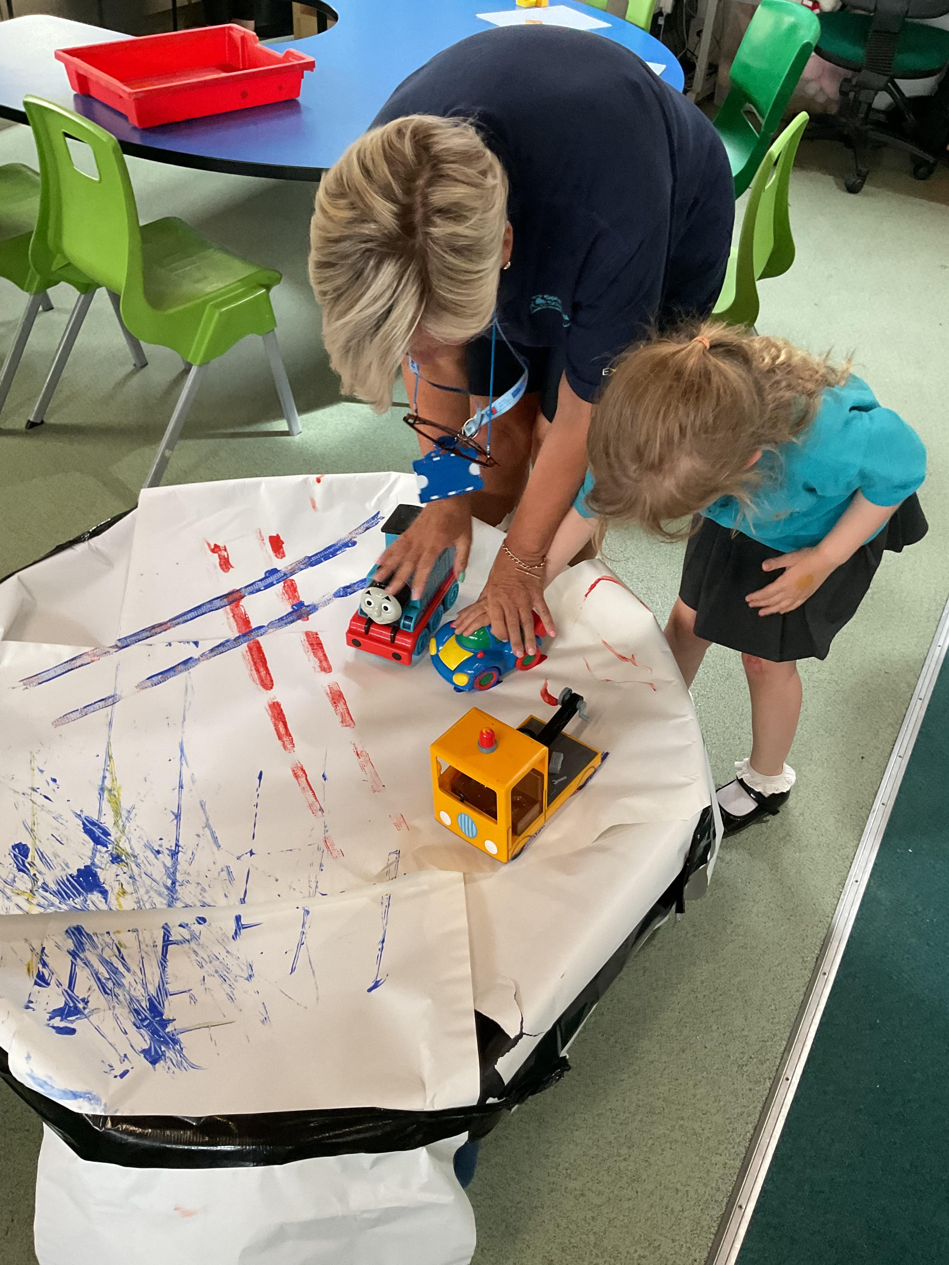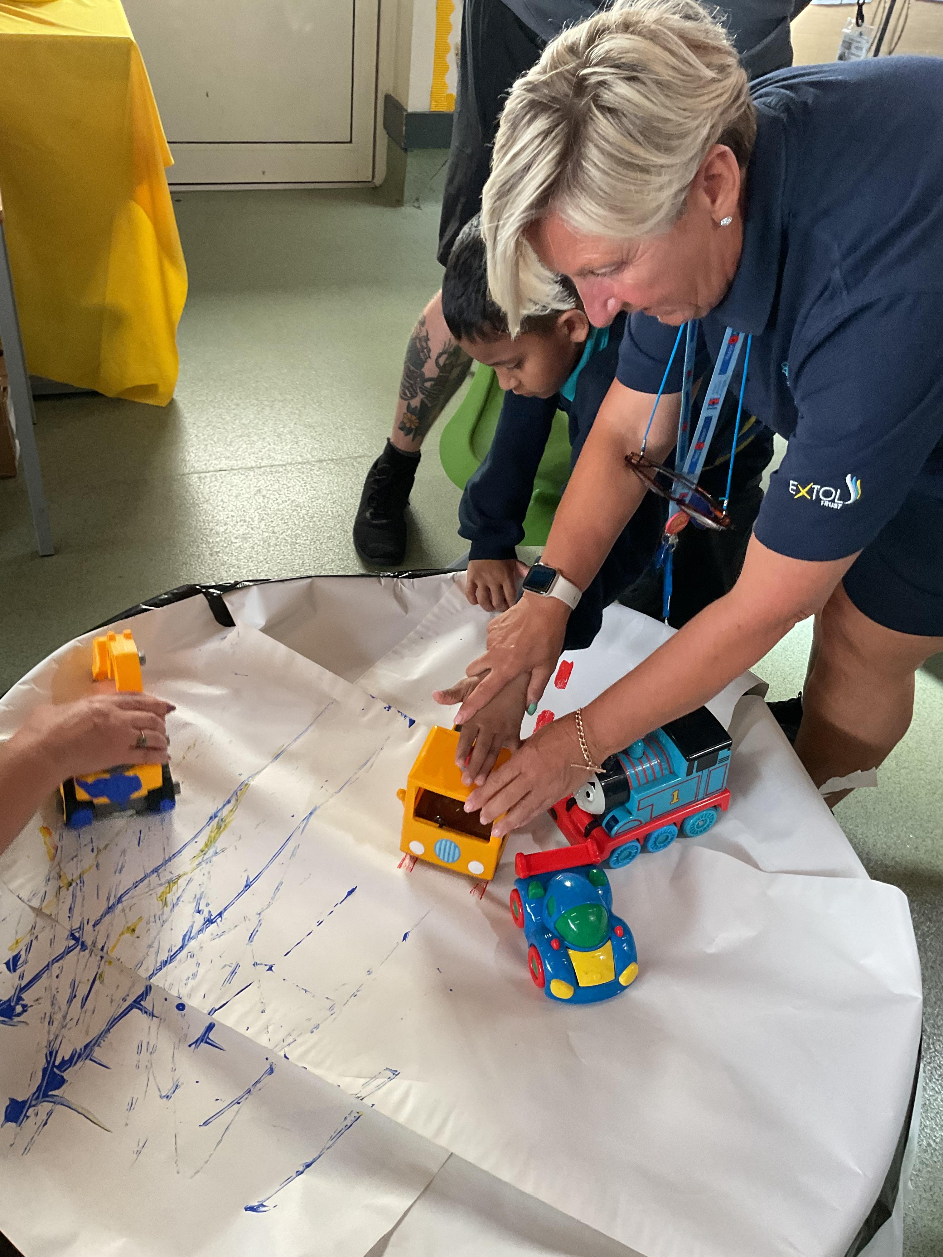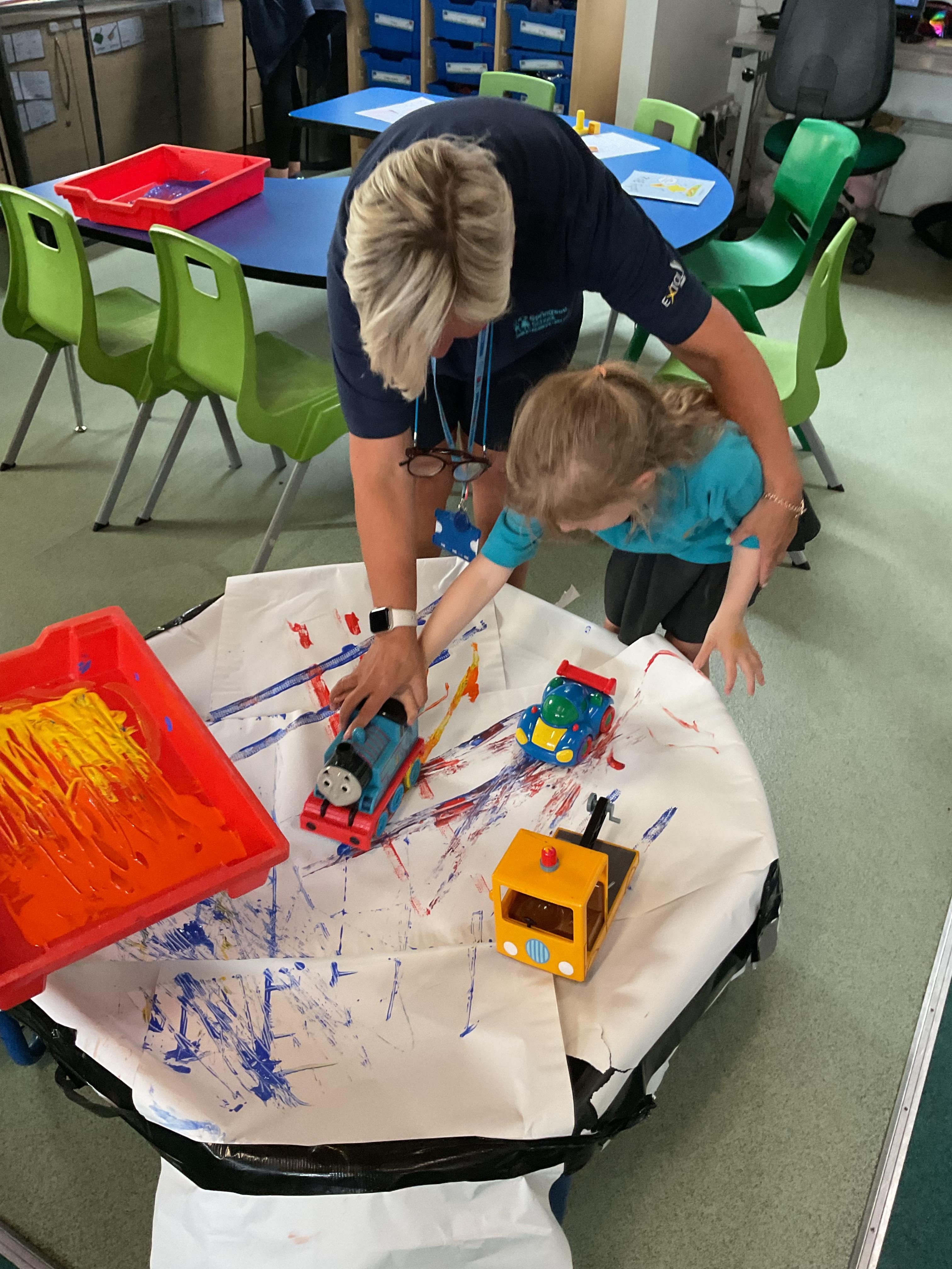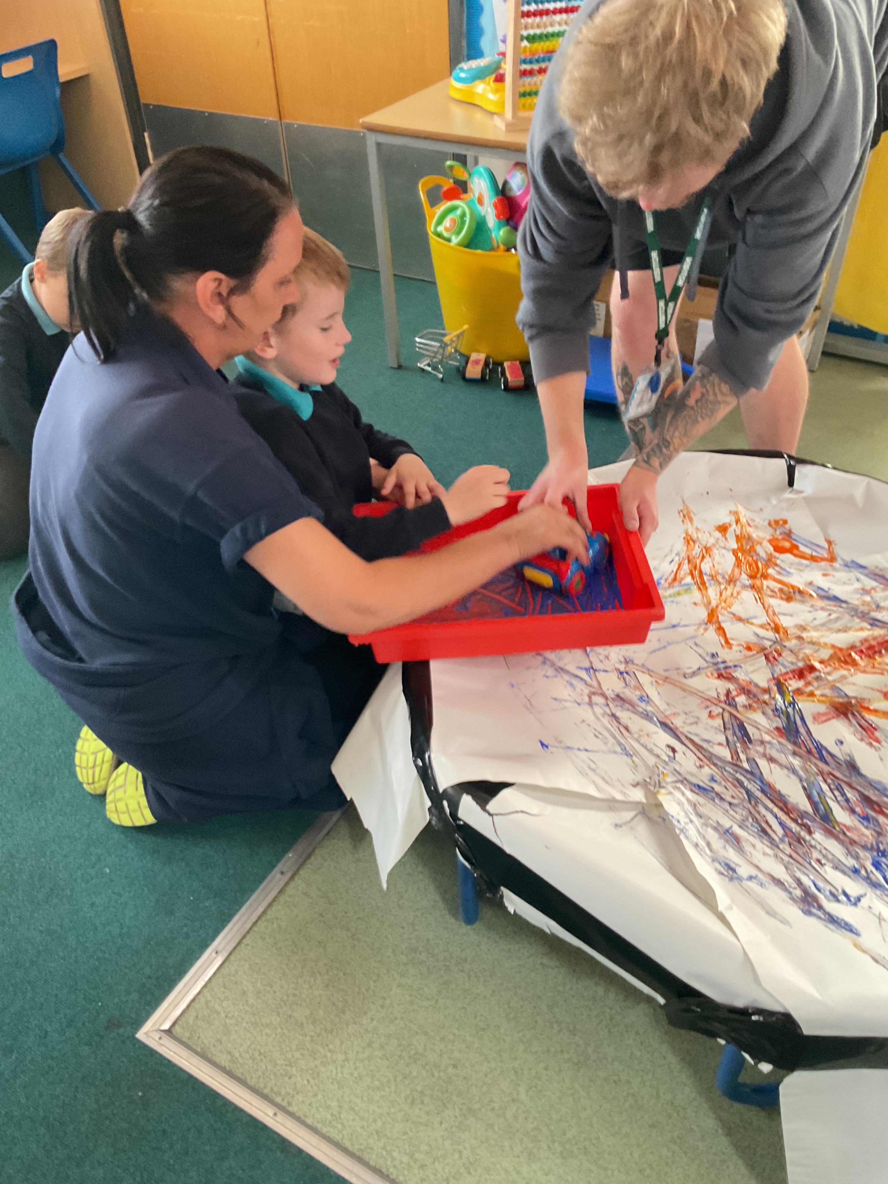 14.5.25 This week the Toucans have enjoyed painting with cars and trucks! They pushed the vehicles through the paint to make tracks on the paper. Great artwork everyone!