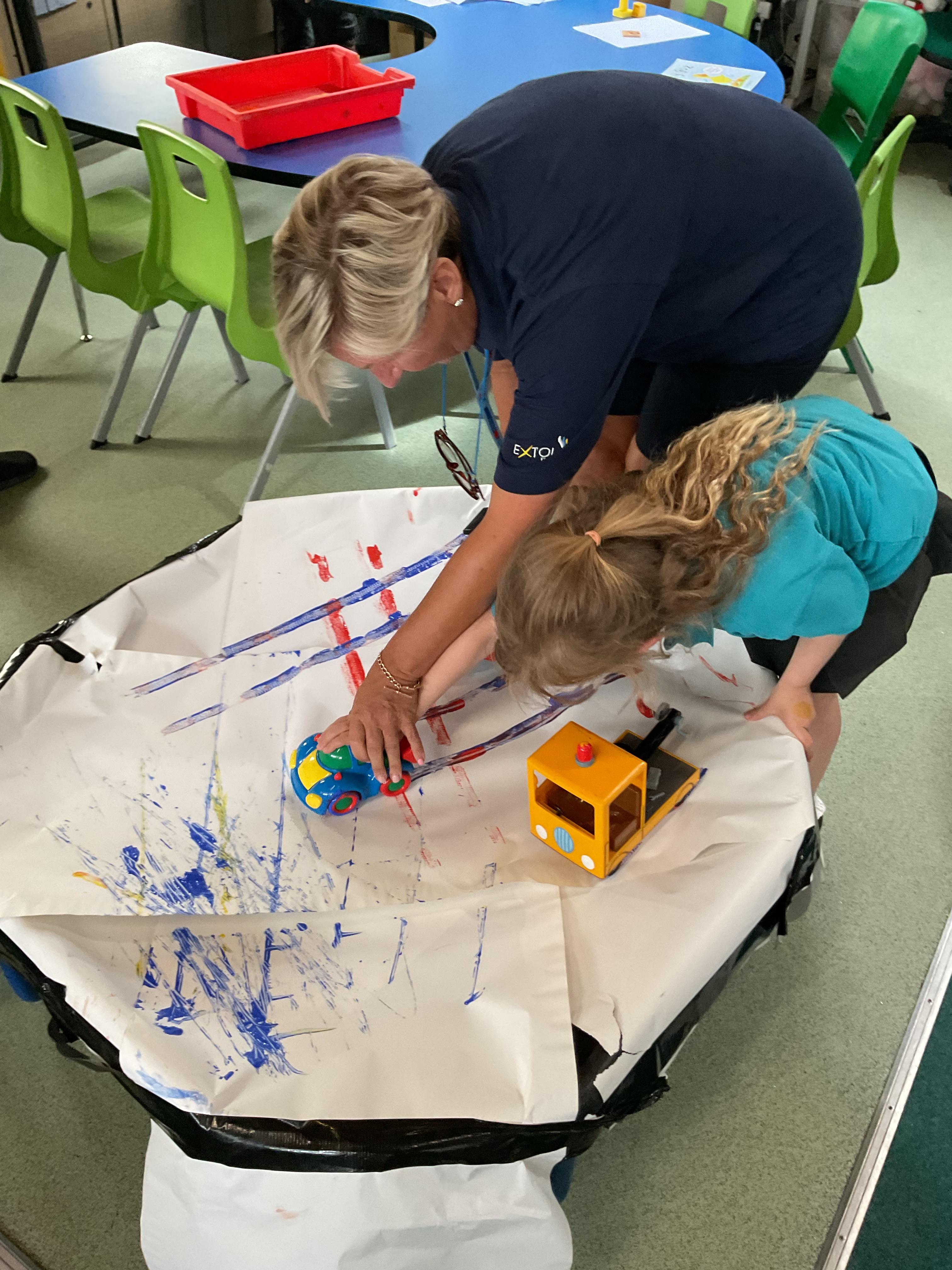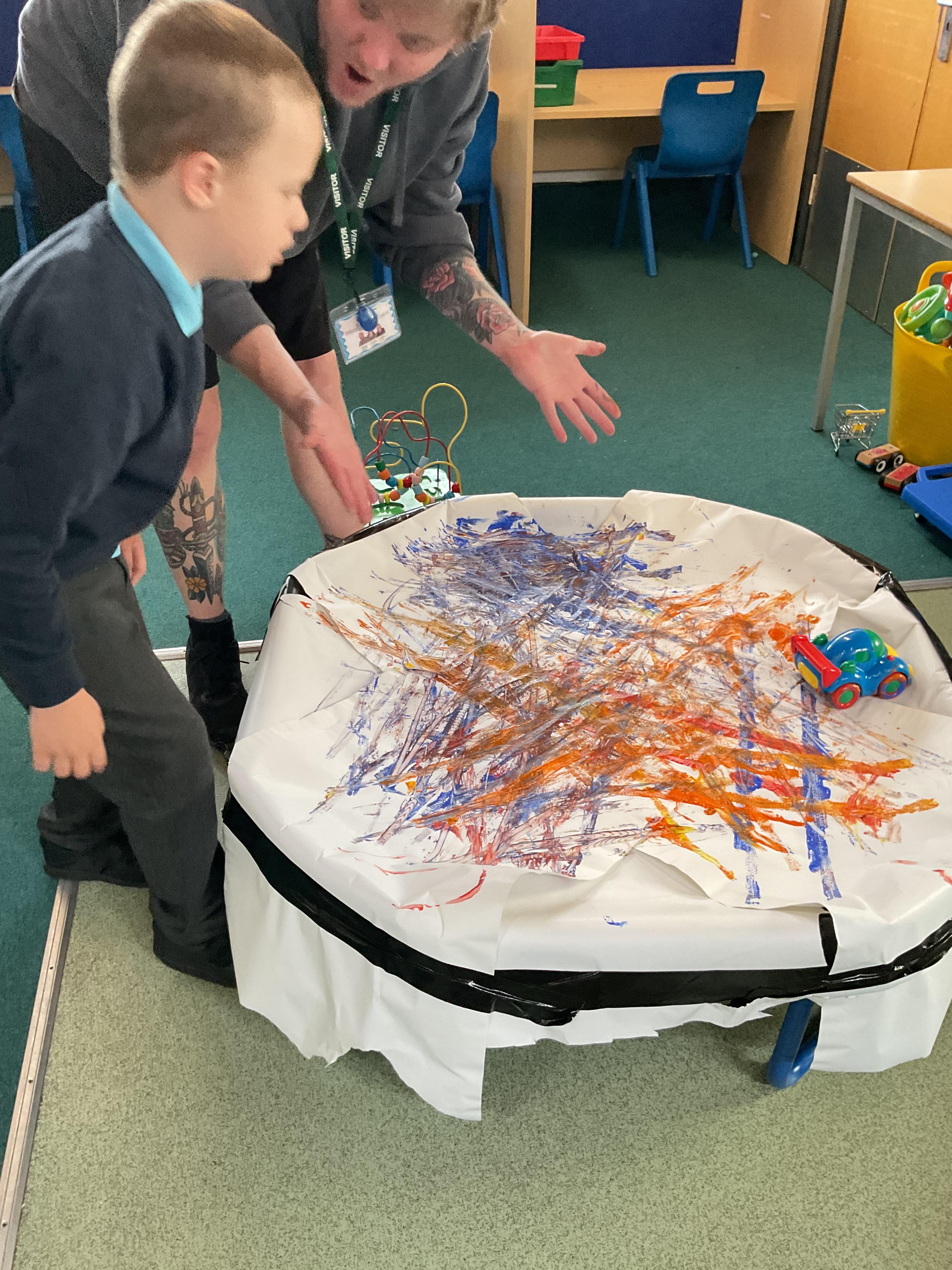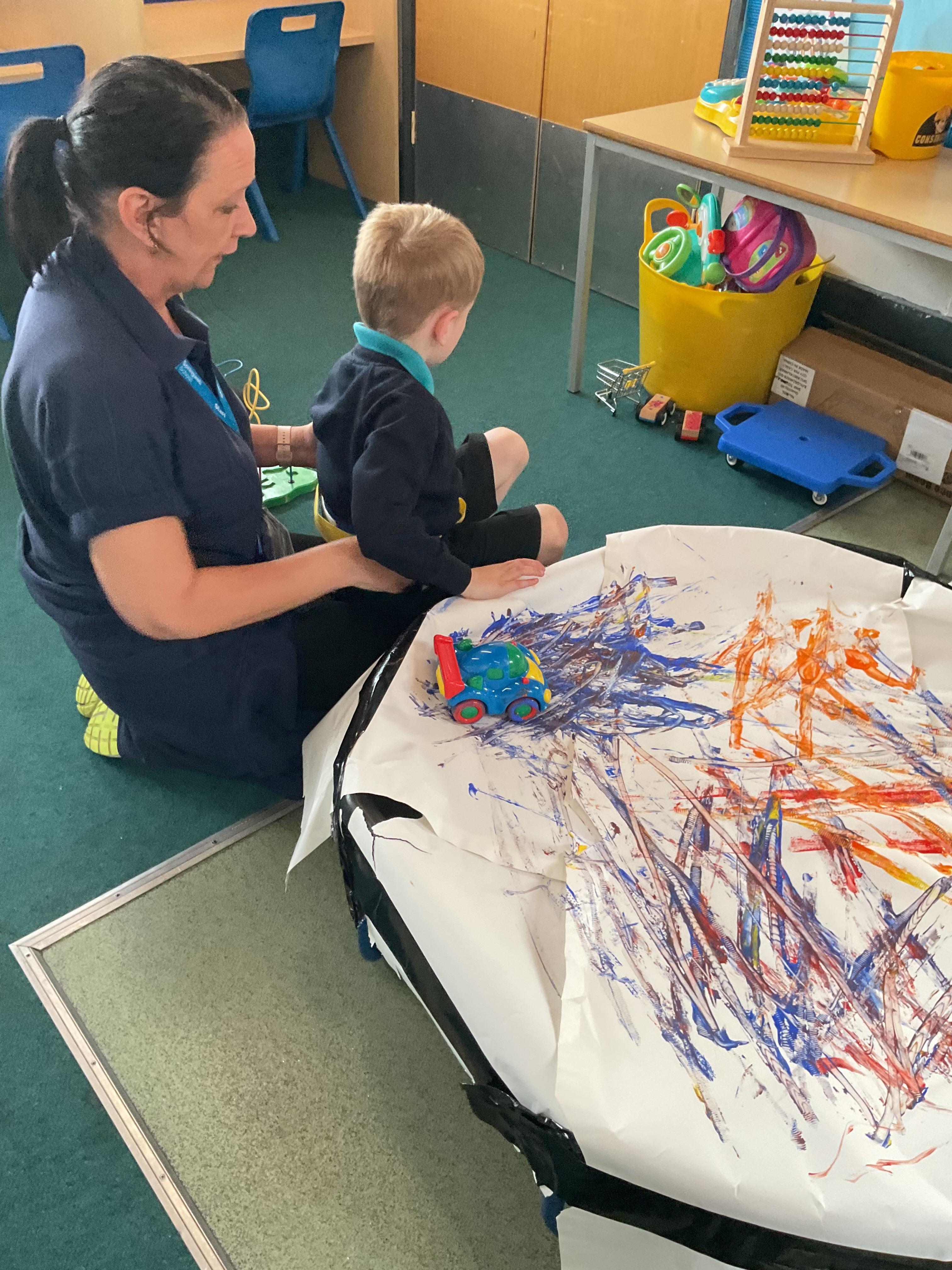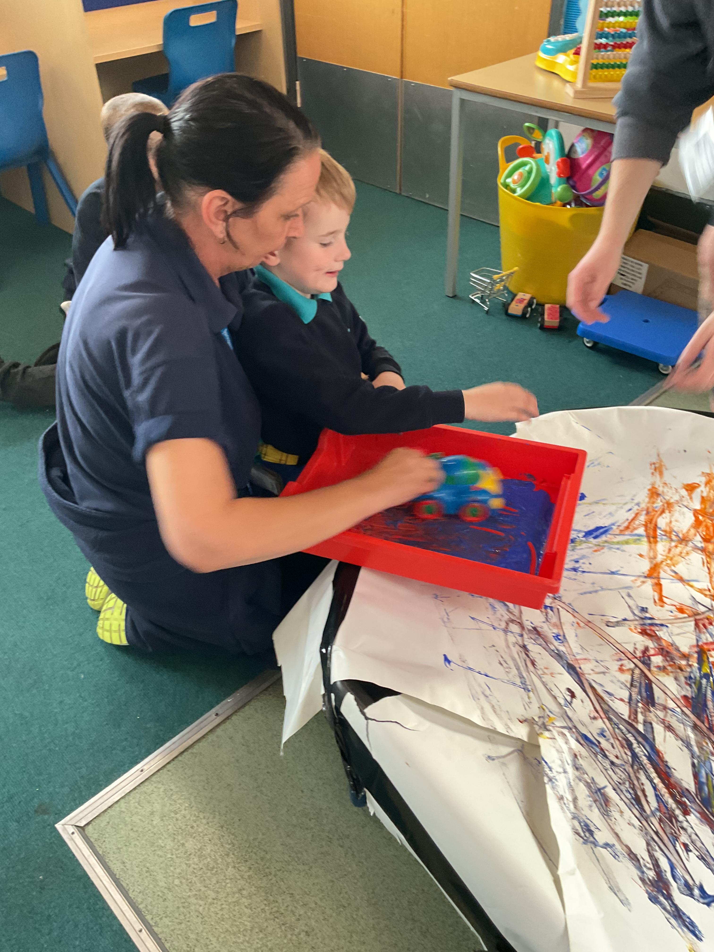 14.5.25 This week the Toucans have enjoyed painting with cars and trucks! They pushed the vehicles through the paint to make tracks on the paper. Great artwork everyone!