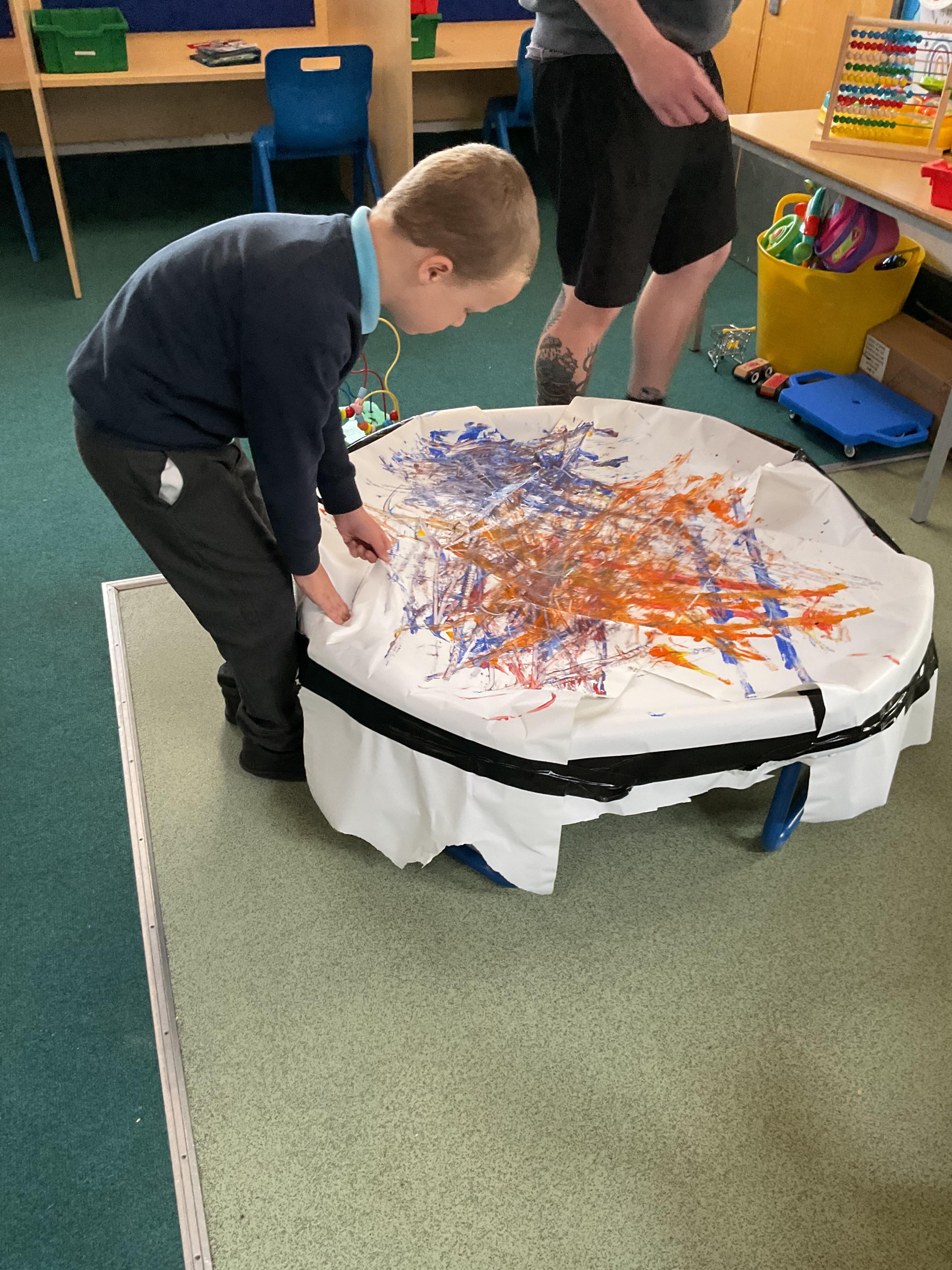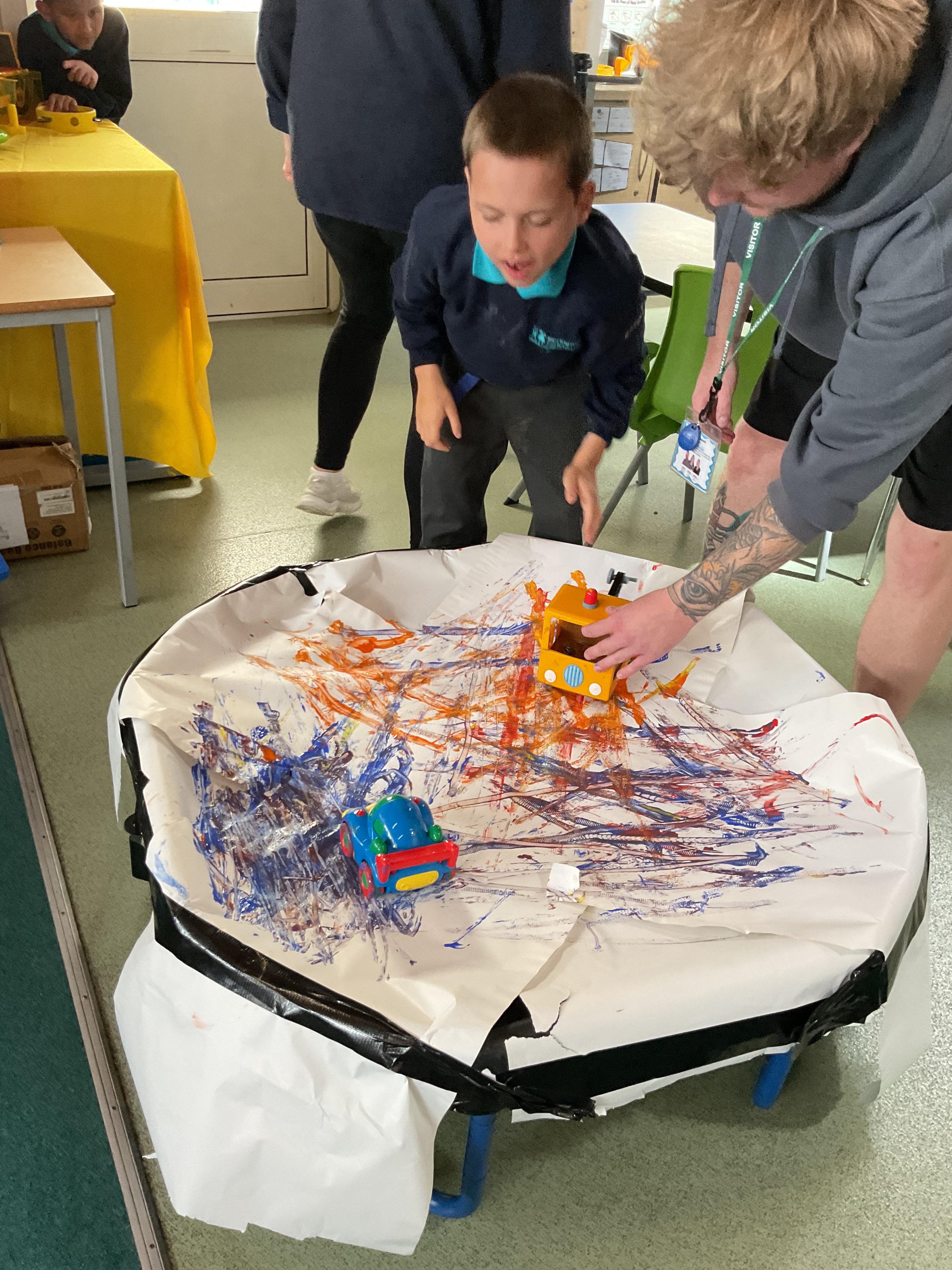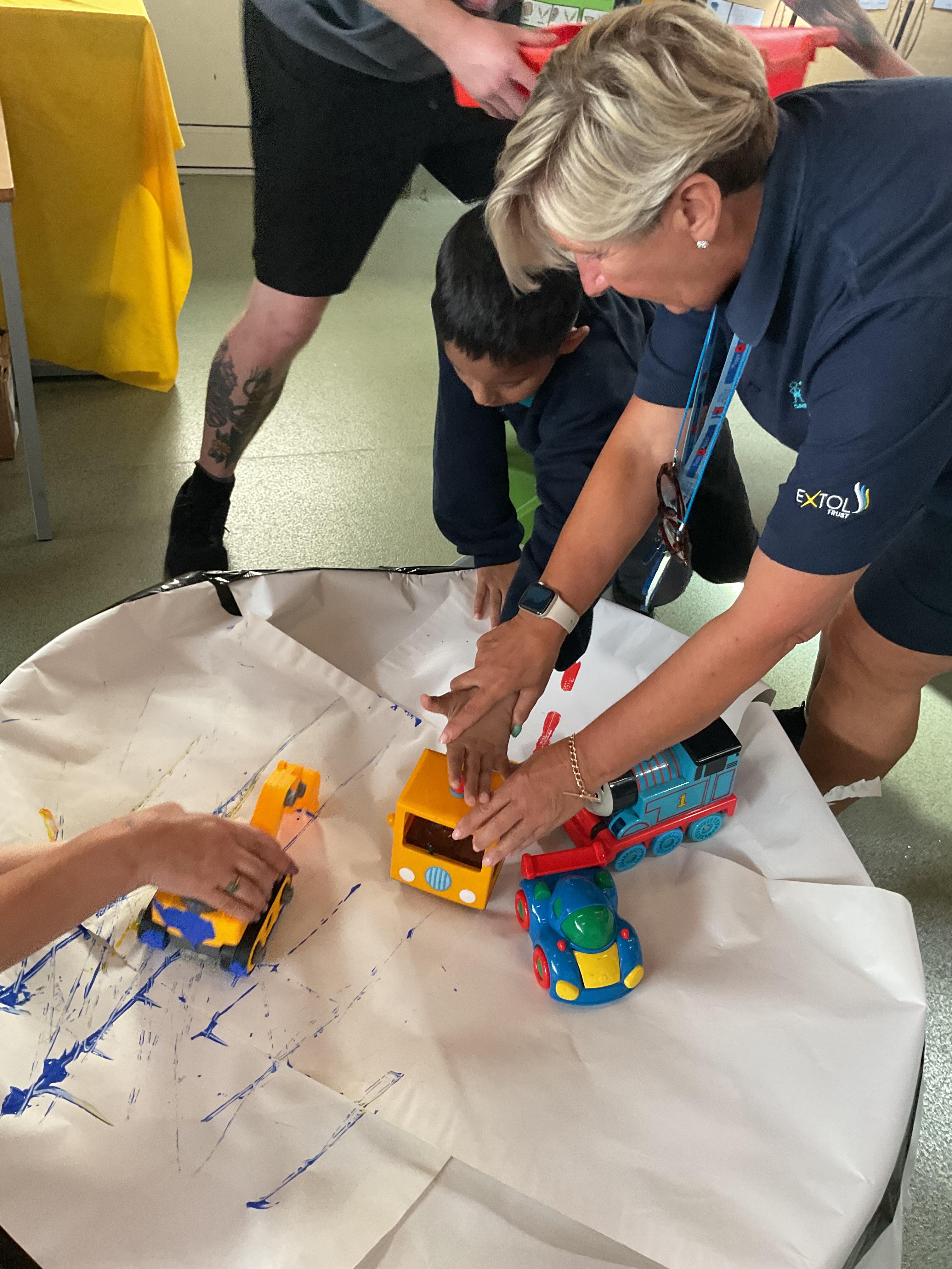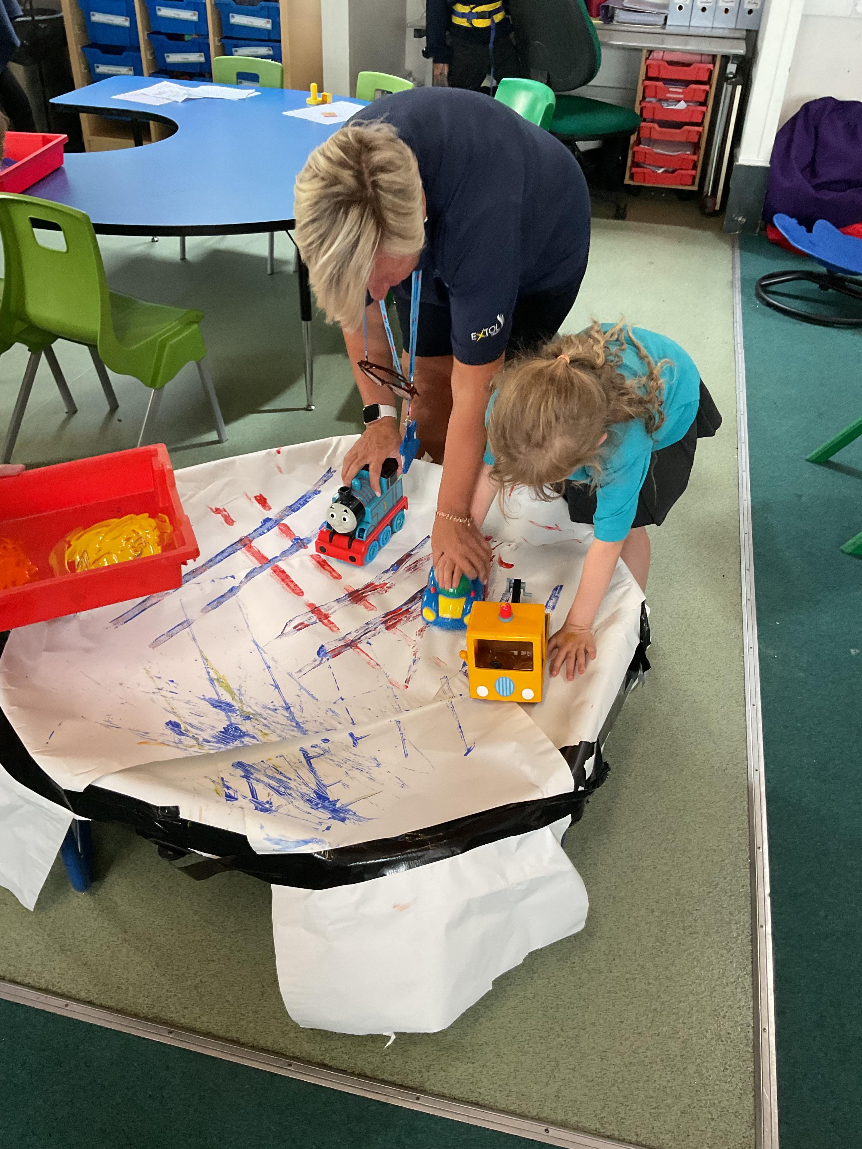 14.5.25 This week the Toucans have enjoyed painting with cars and trucks! They pushed the vehicles through the paint to make tracks on the paper. Great artwork everyone!