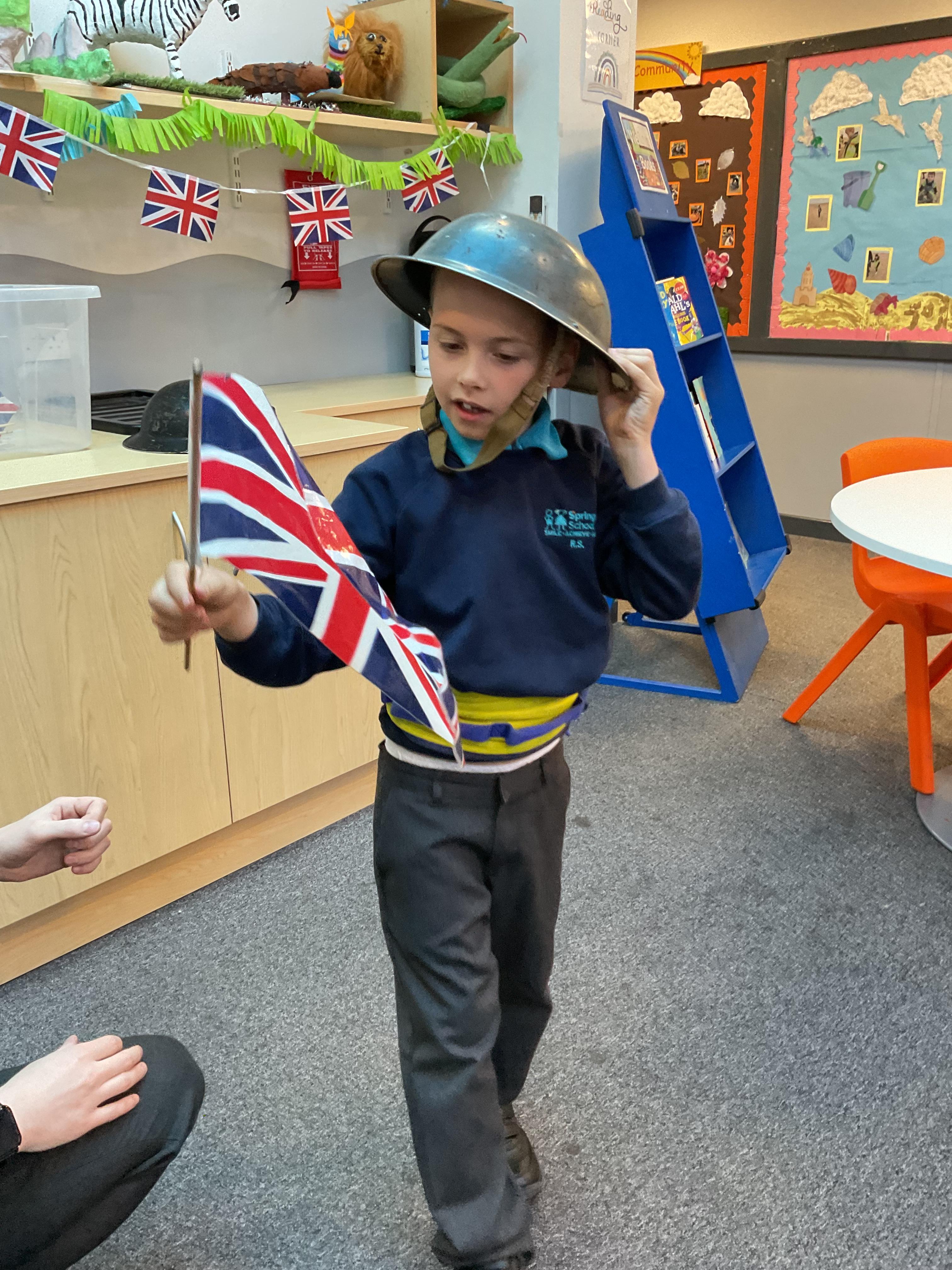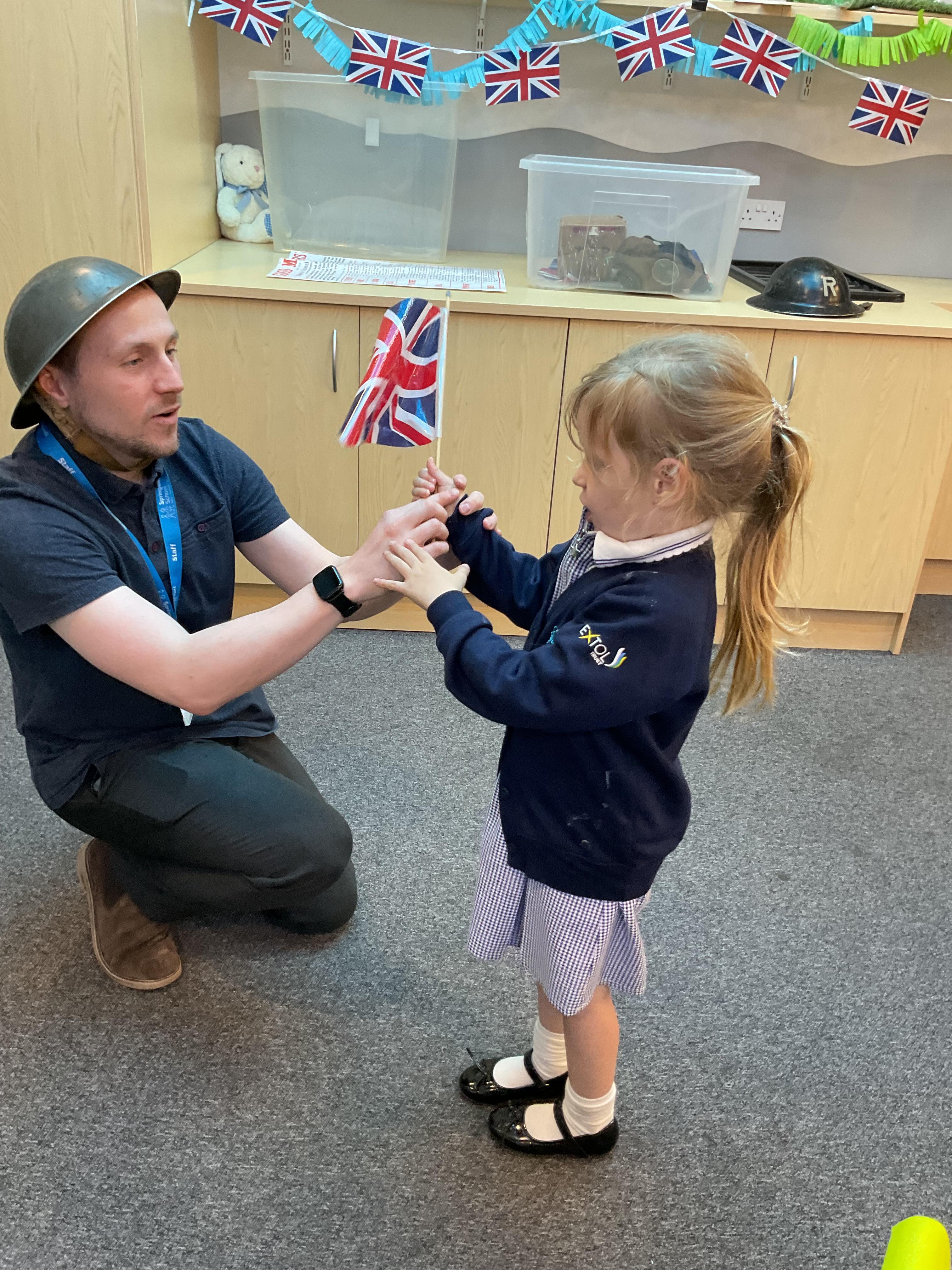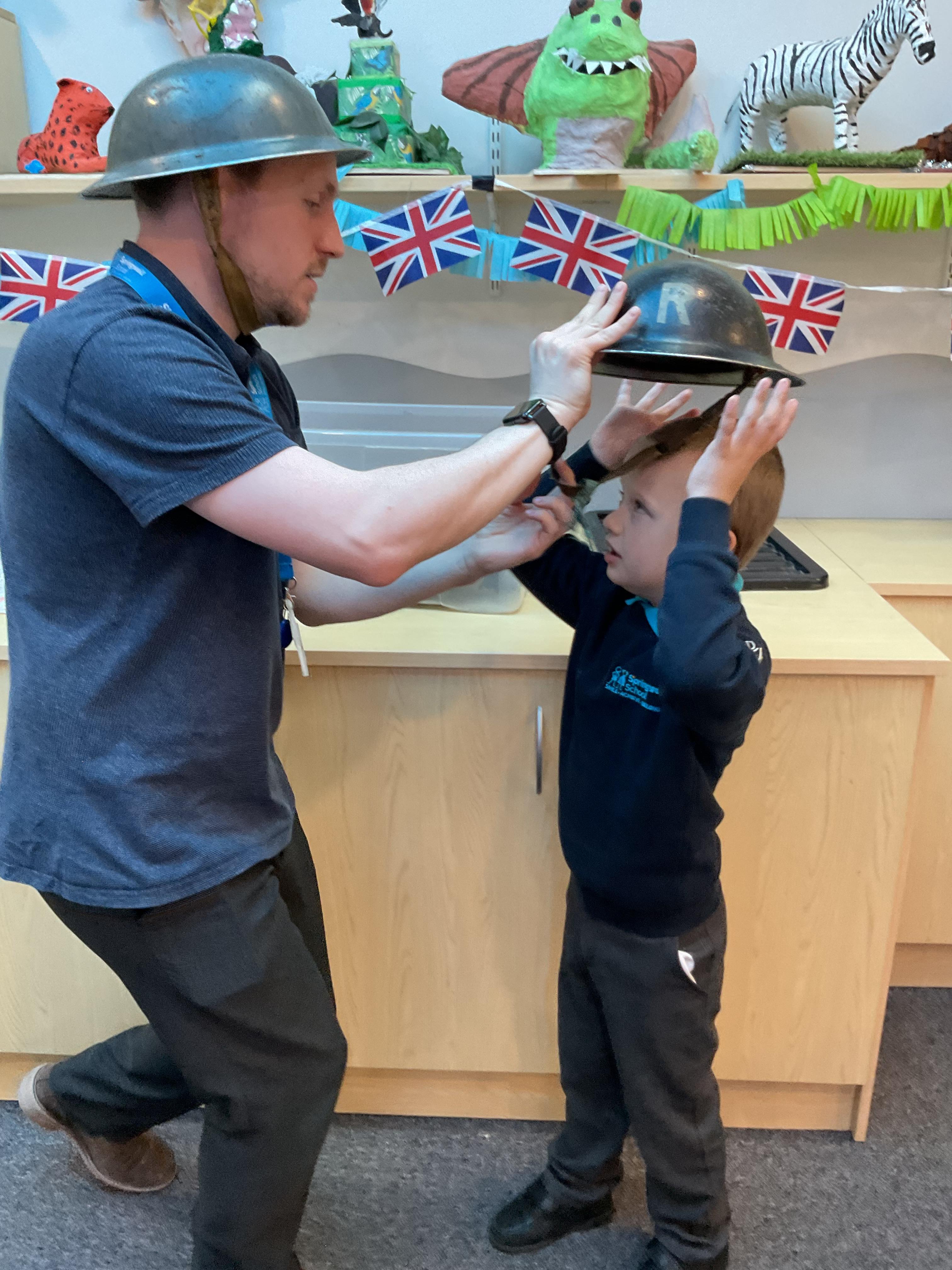 8.5.25 - Today Toucan class celebrated VE Day in our History session! We explored some artefacts from wartime like helmets, gas masks and posters and then waved some Union Jacks!