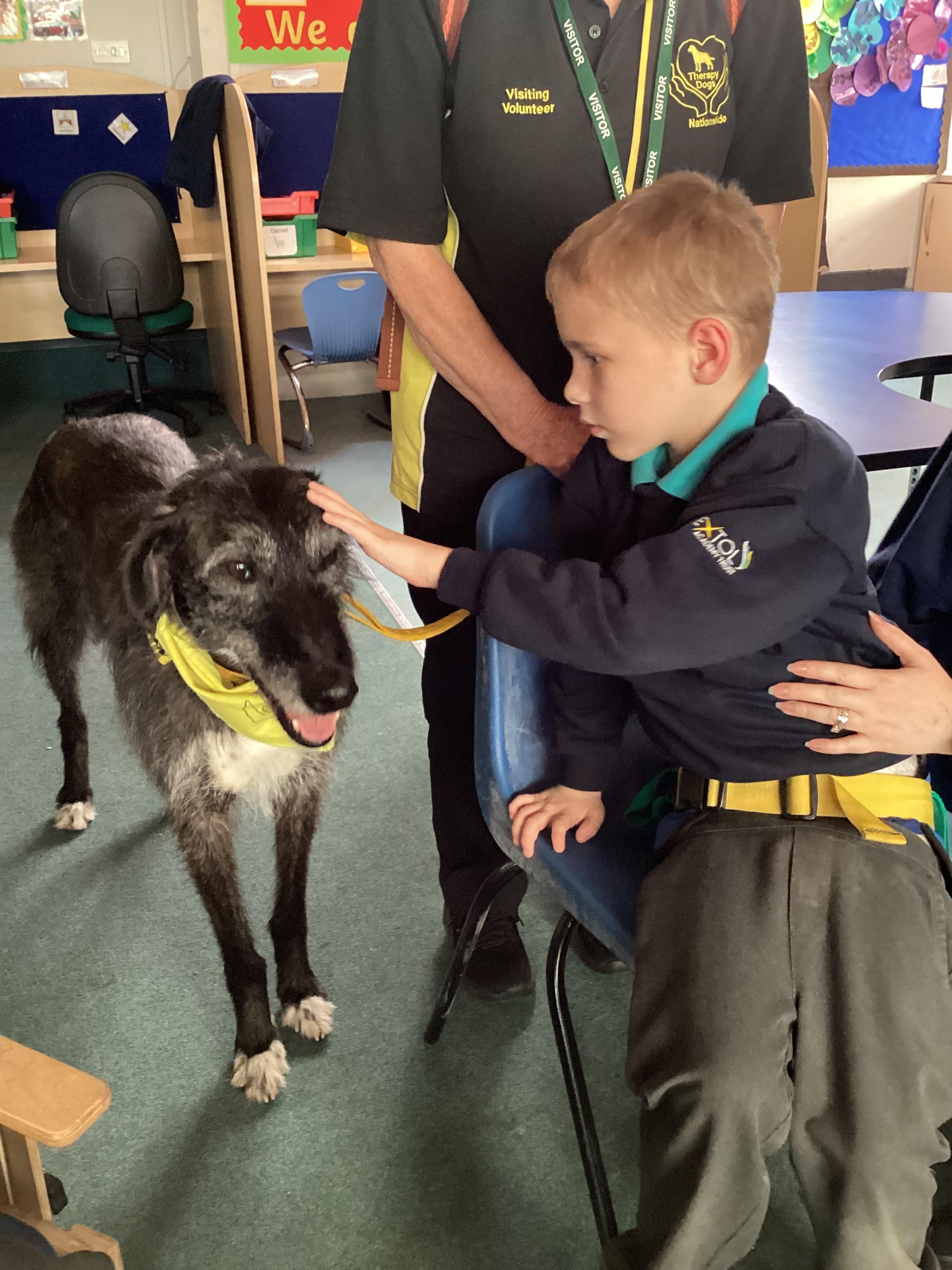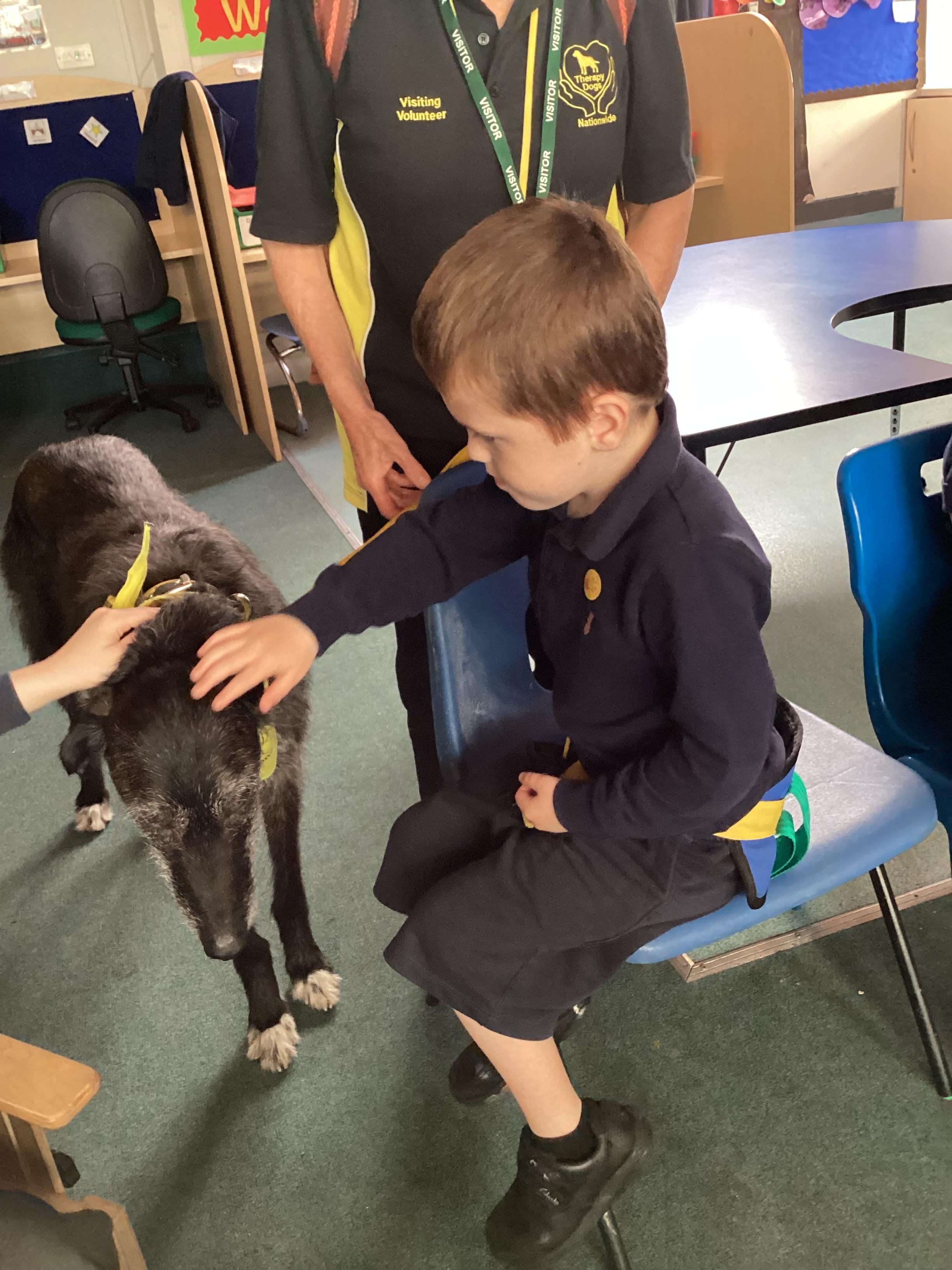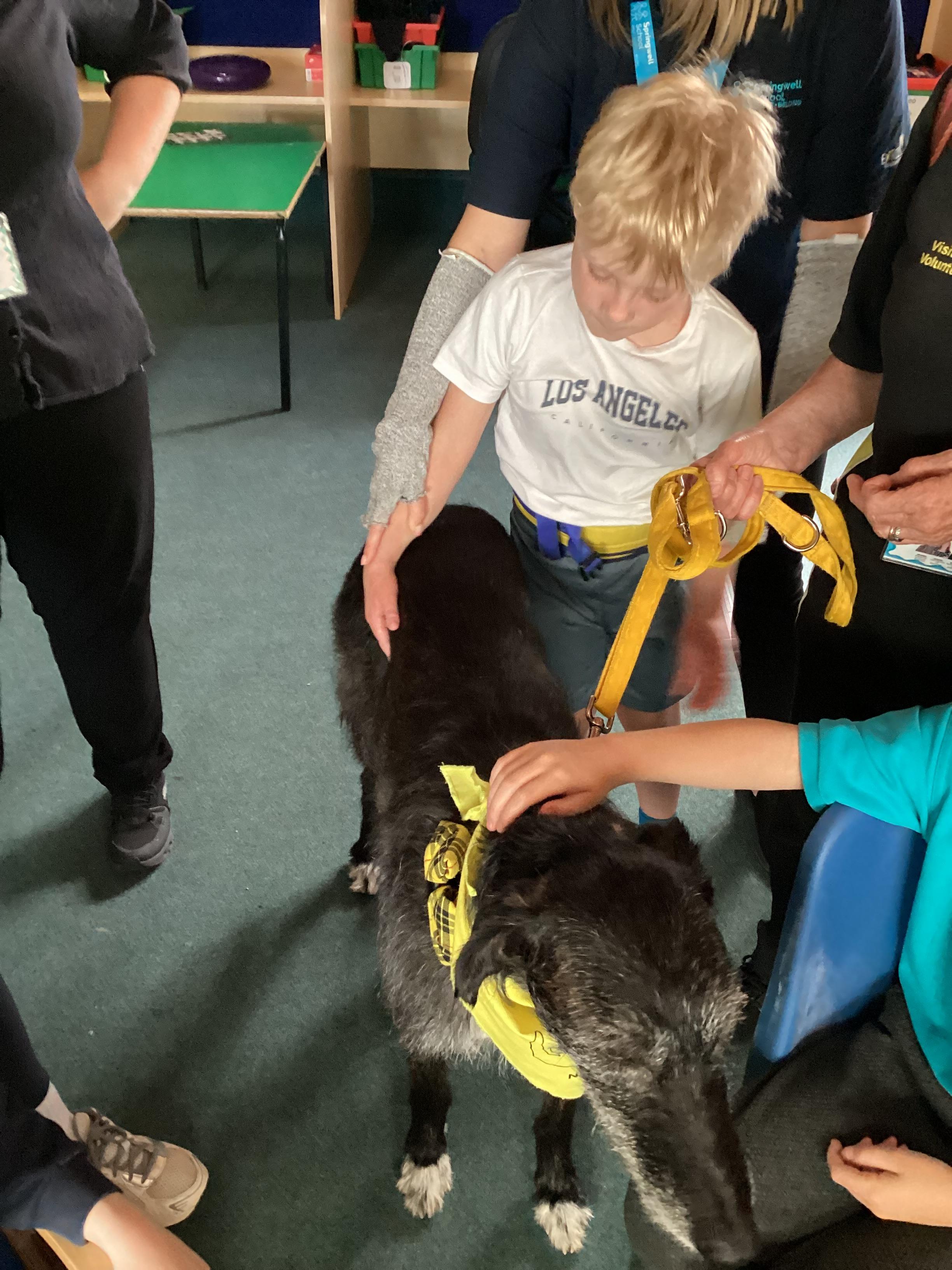 2.7.25- PSHRE- Today we had a visit from Ronnie our 'Pets at Therapy' dog. Llamas enjoyed this social experience and interacting with the dog, stroking and patting him.