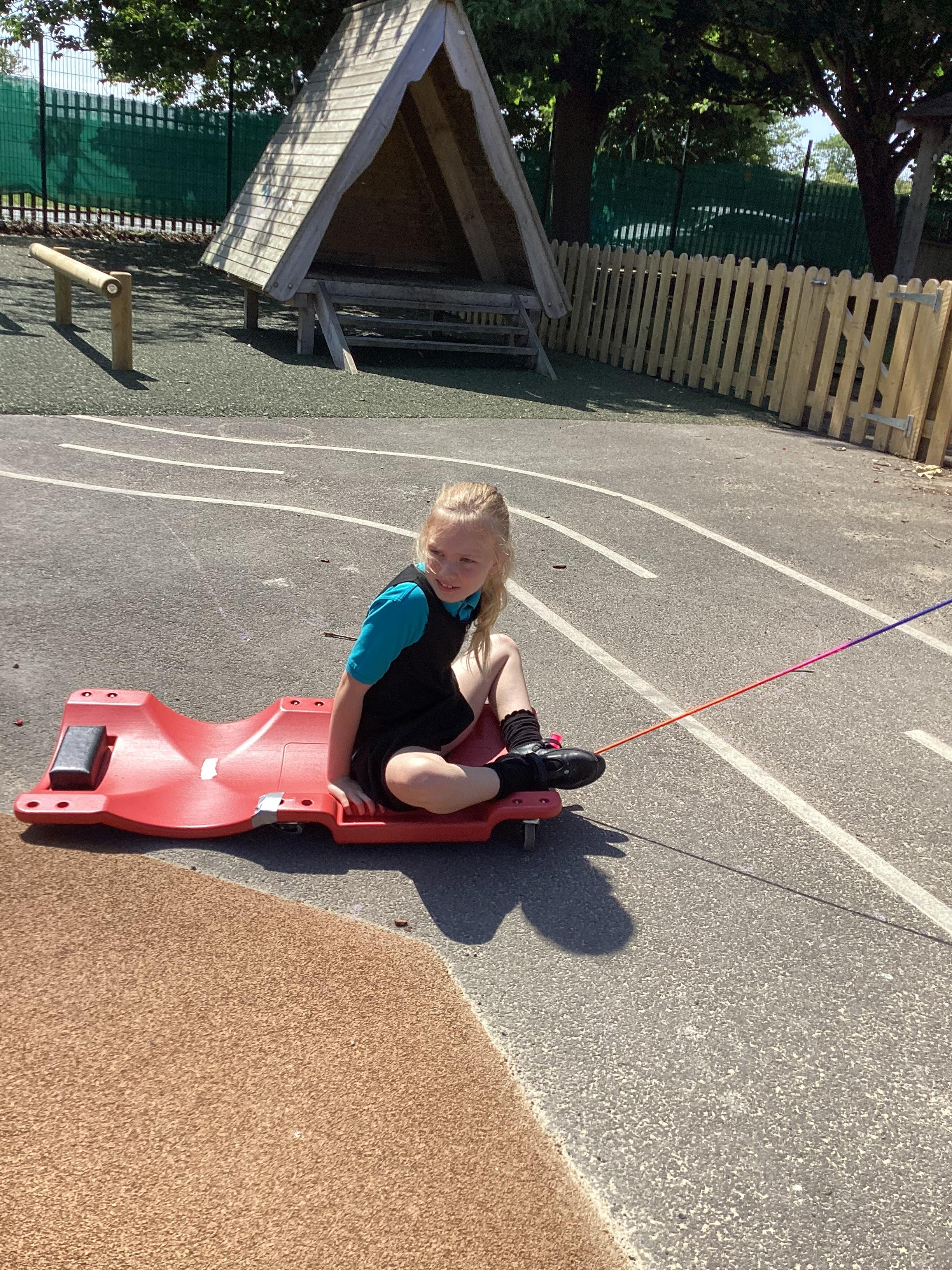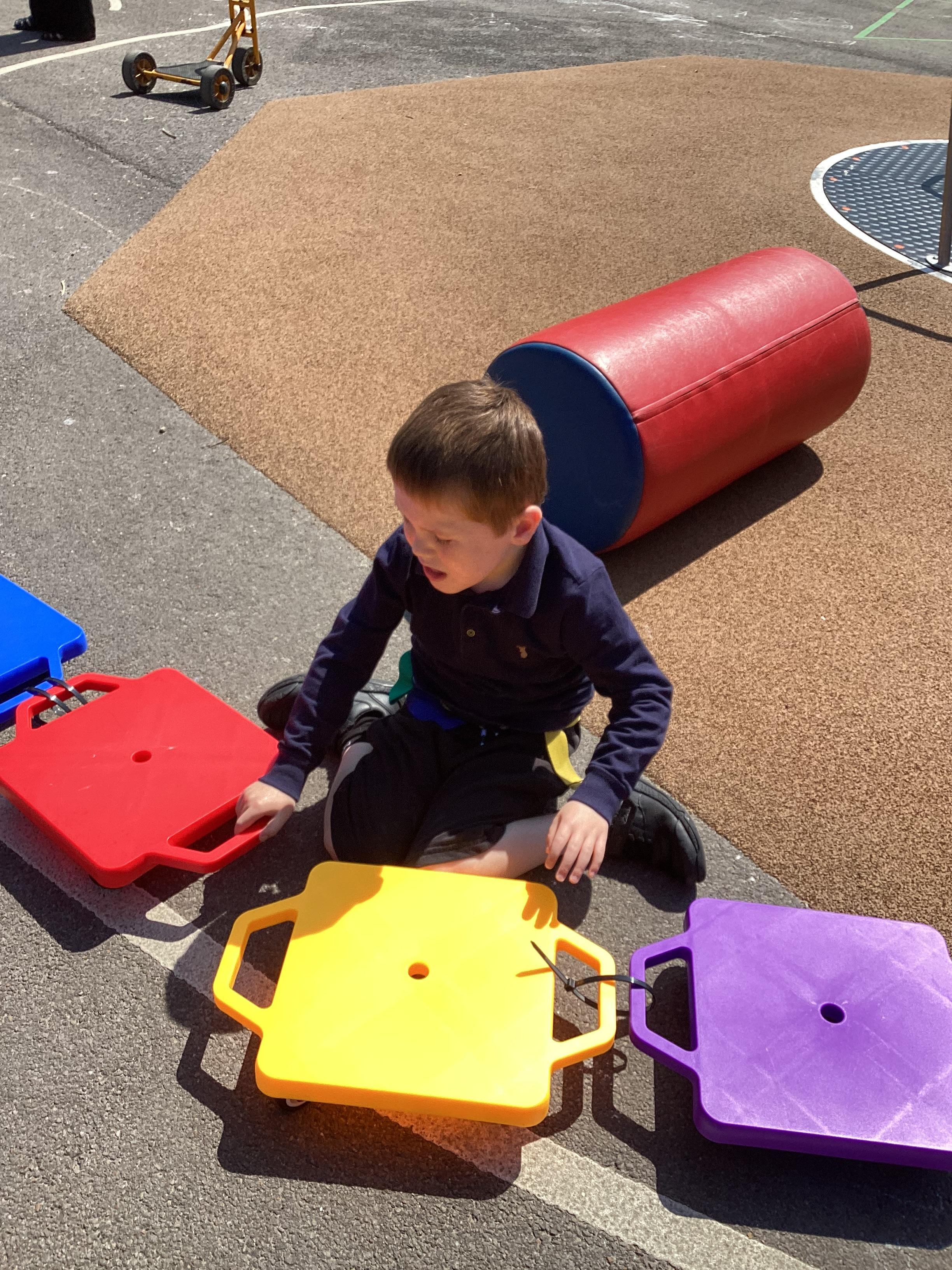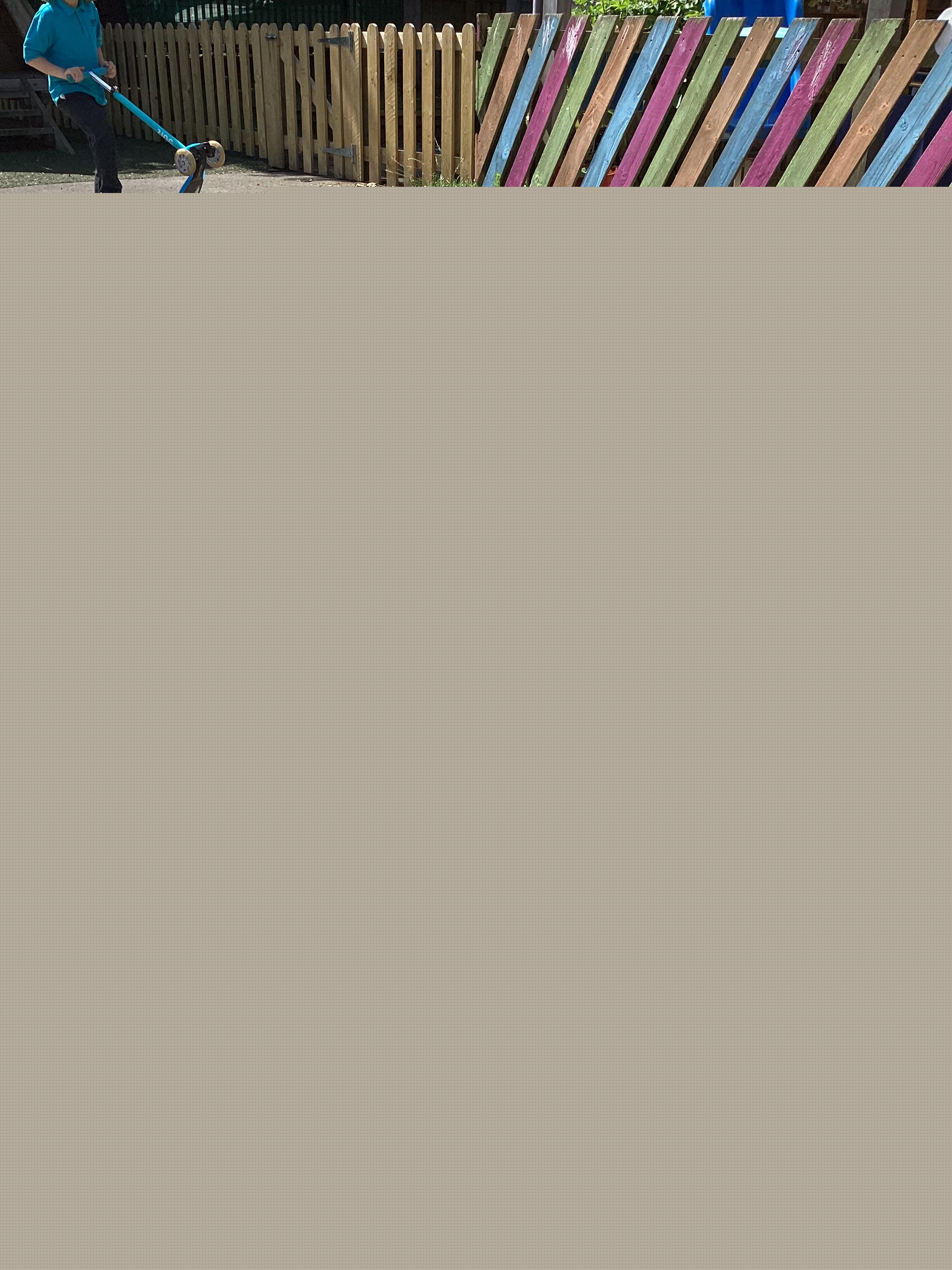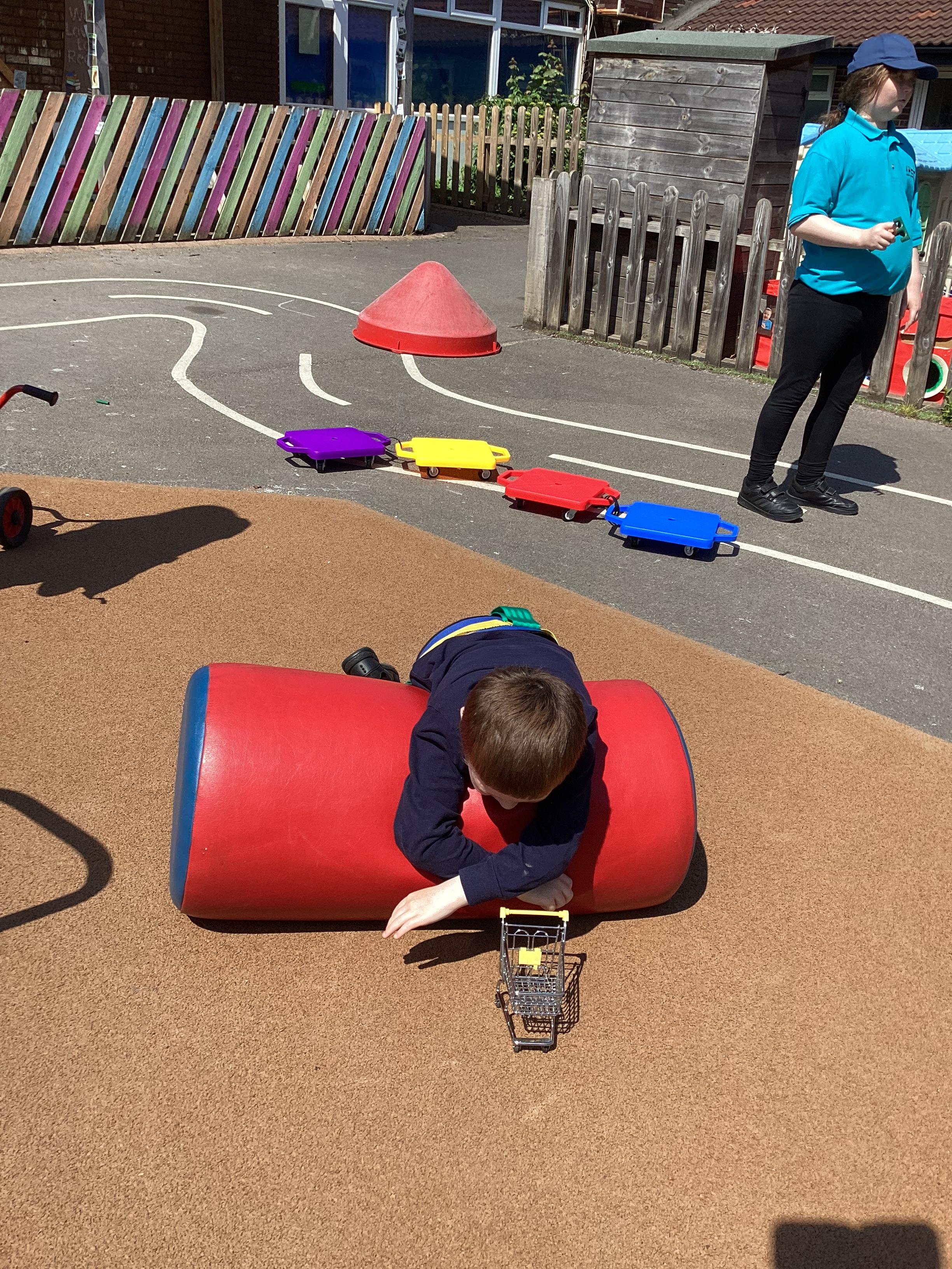 19.6.25- Understanding the world- We used the outdoor equipment such as the log roll, body boards, balls, roundabout, swings, scooters and tricycles to explore different ways of moving ourselves and objects.