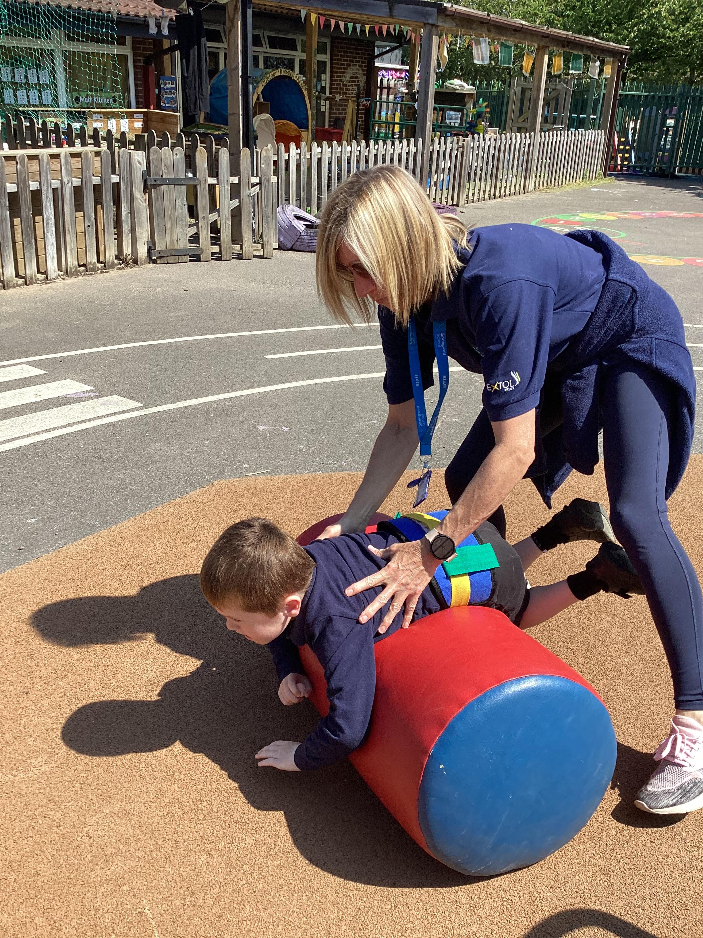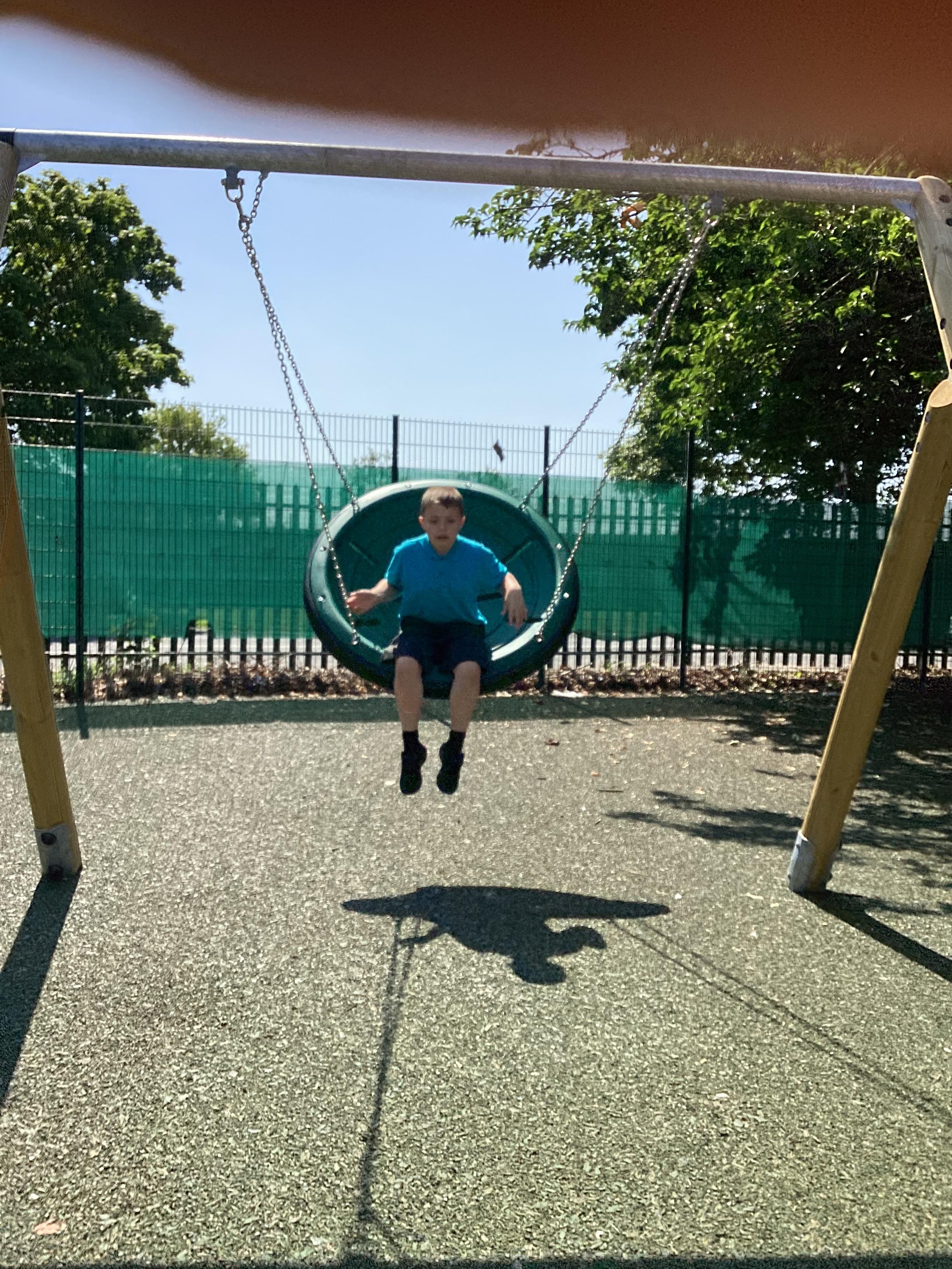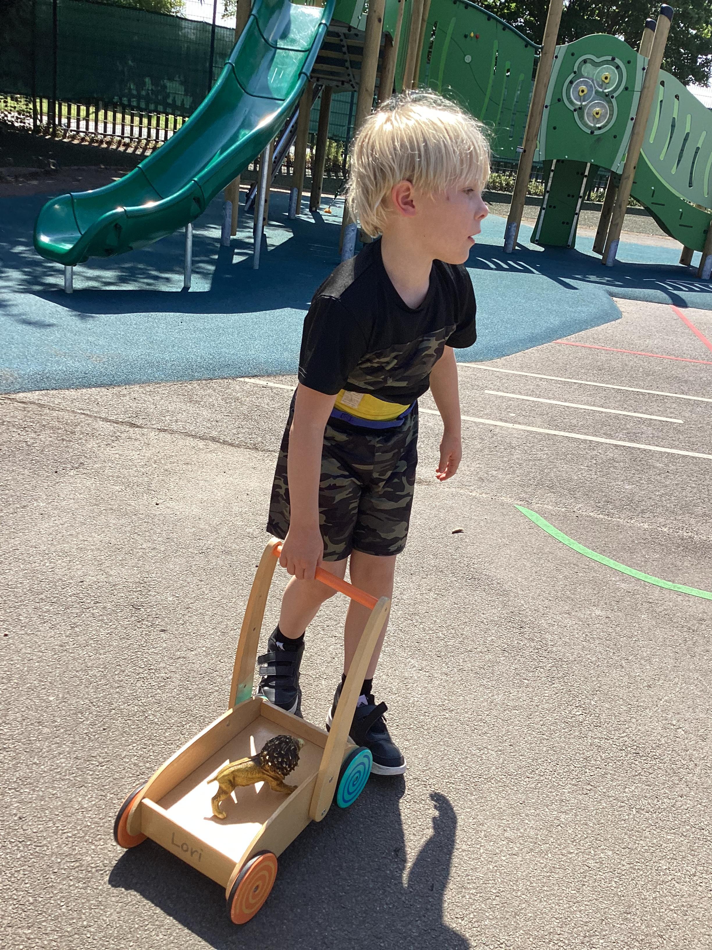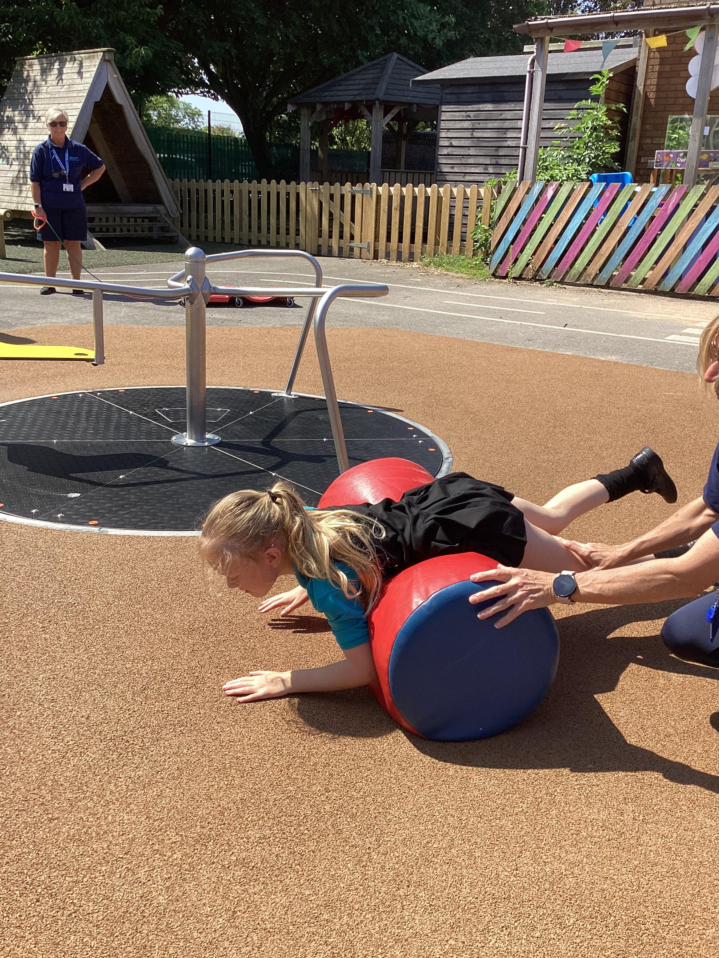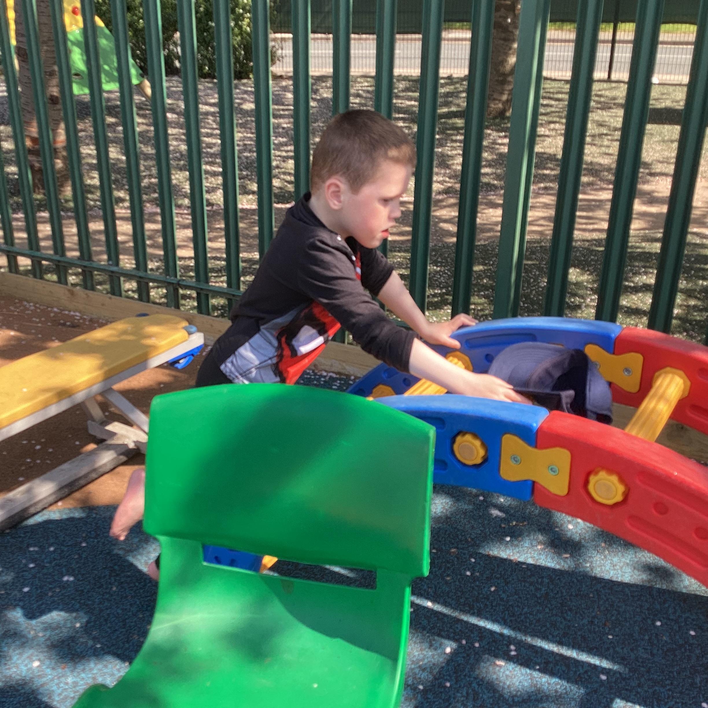 19.6.25- Understanding the world- We used the outdoor equipment such as the log roll, body boards, balls, roundabout, swings, scooters and tricycles to explore different ways of moving ourselves and objects.