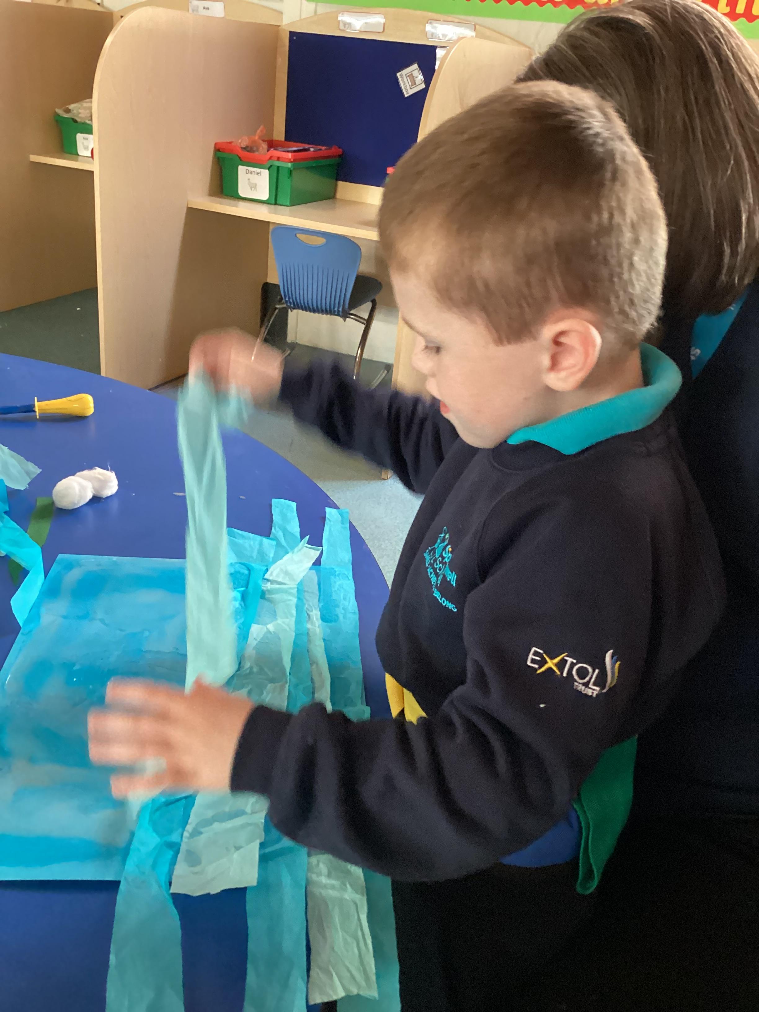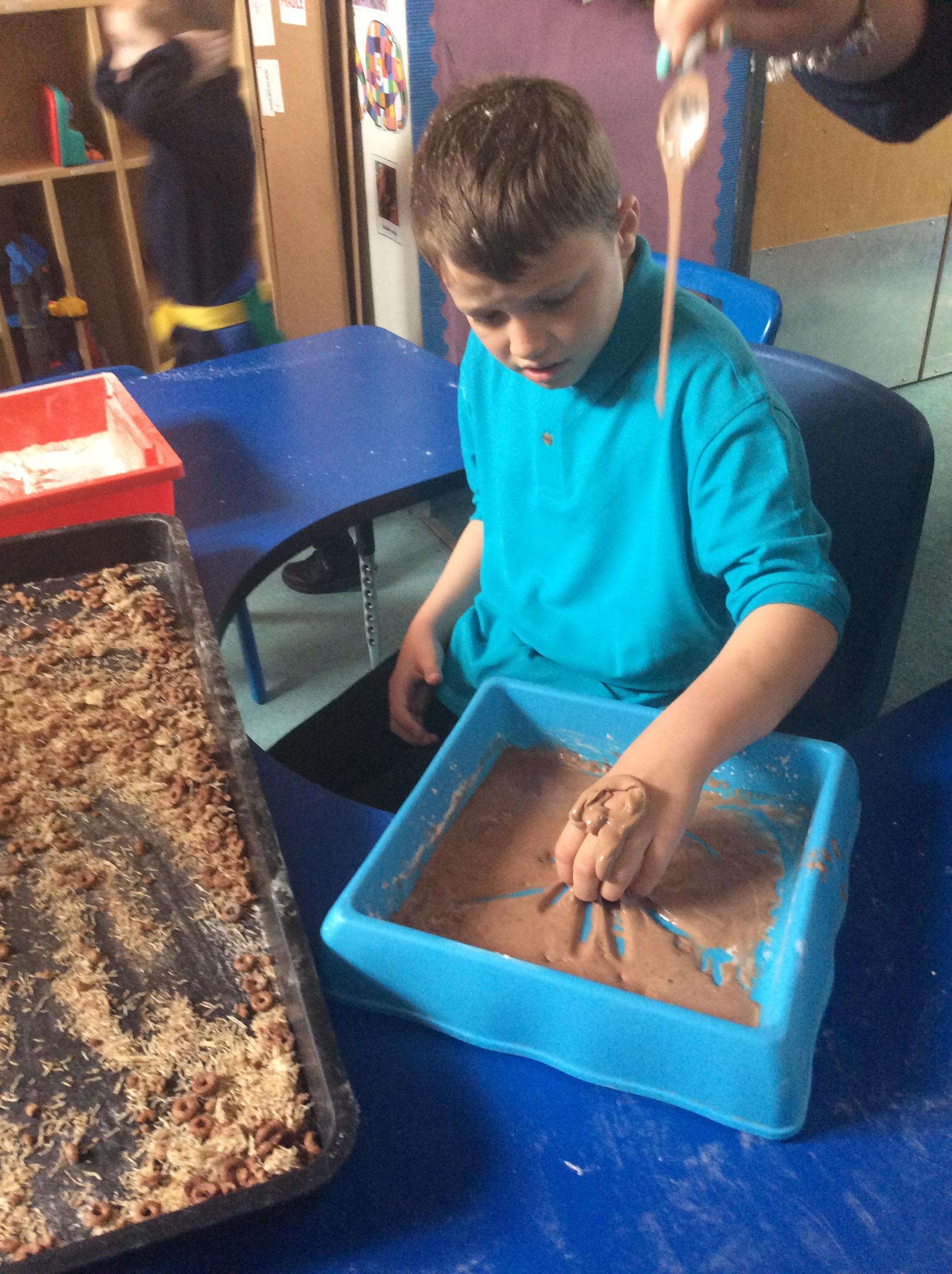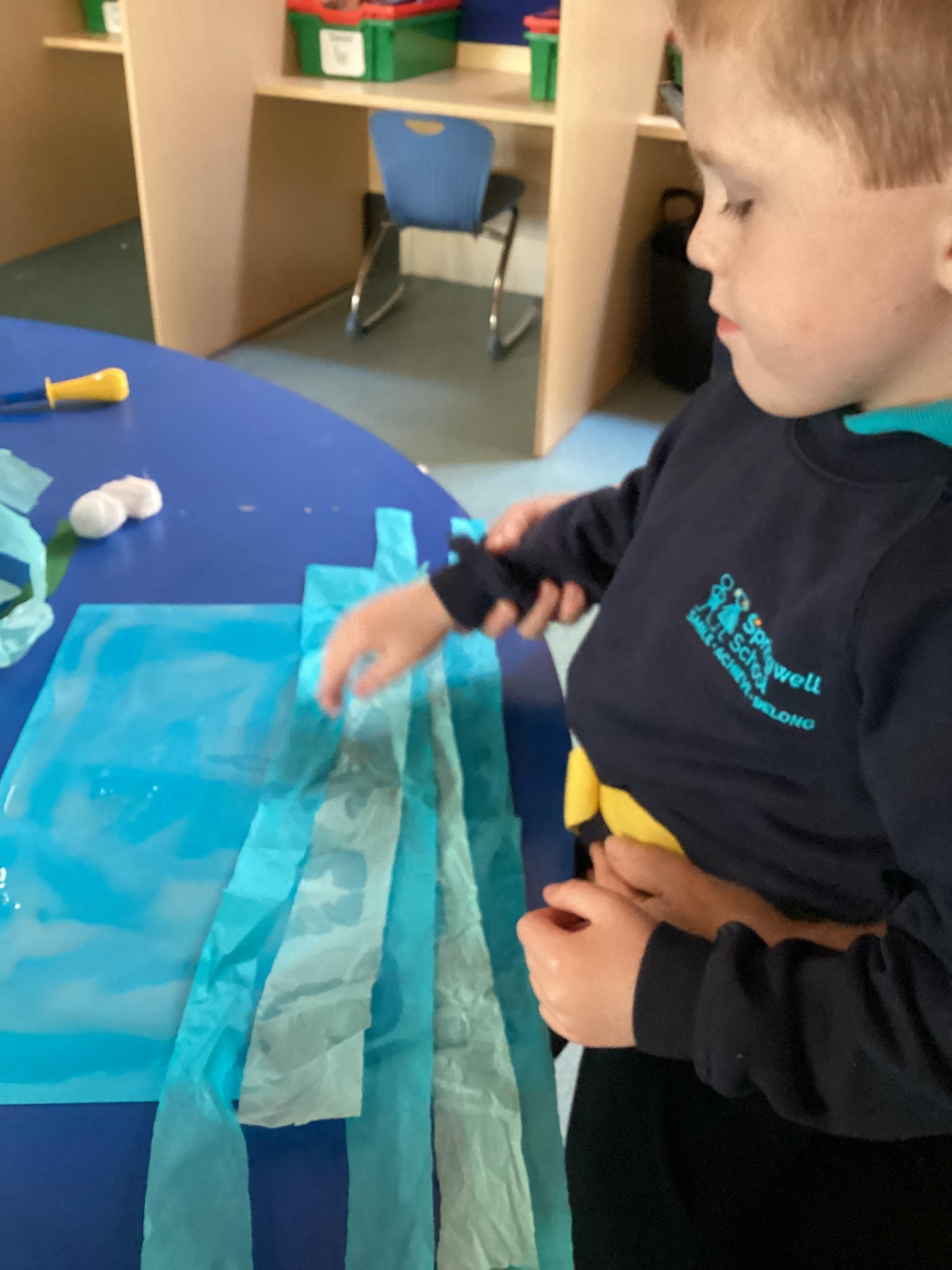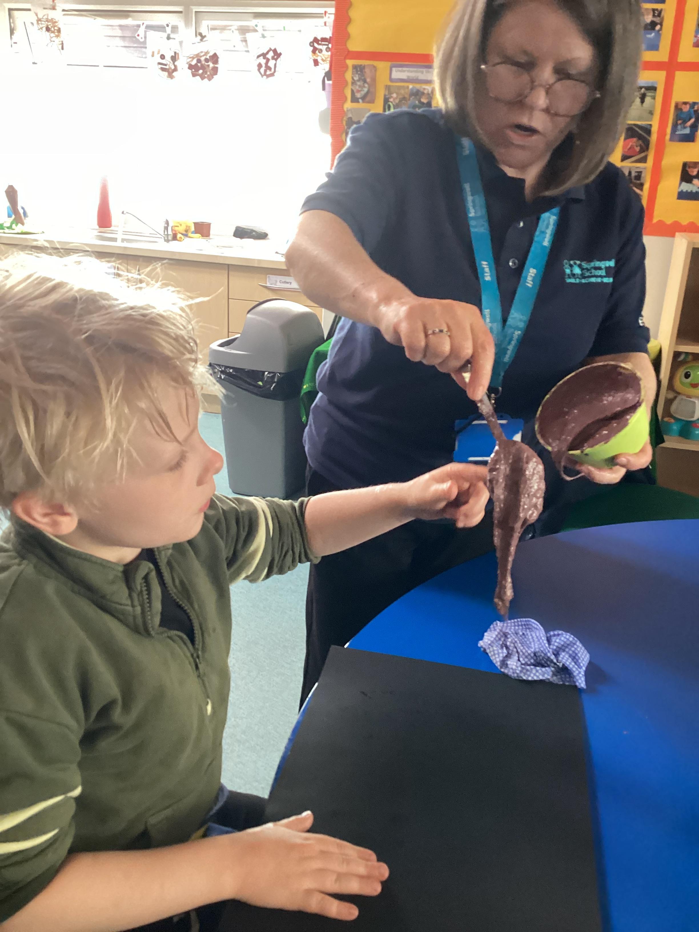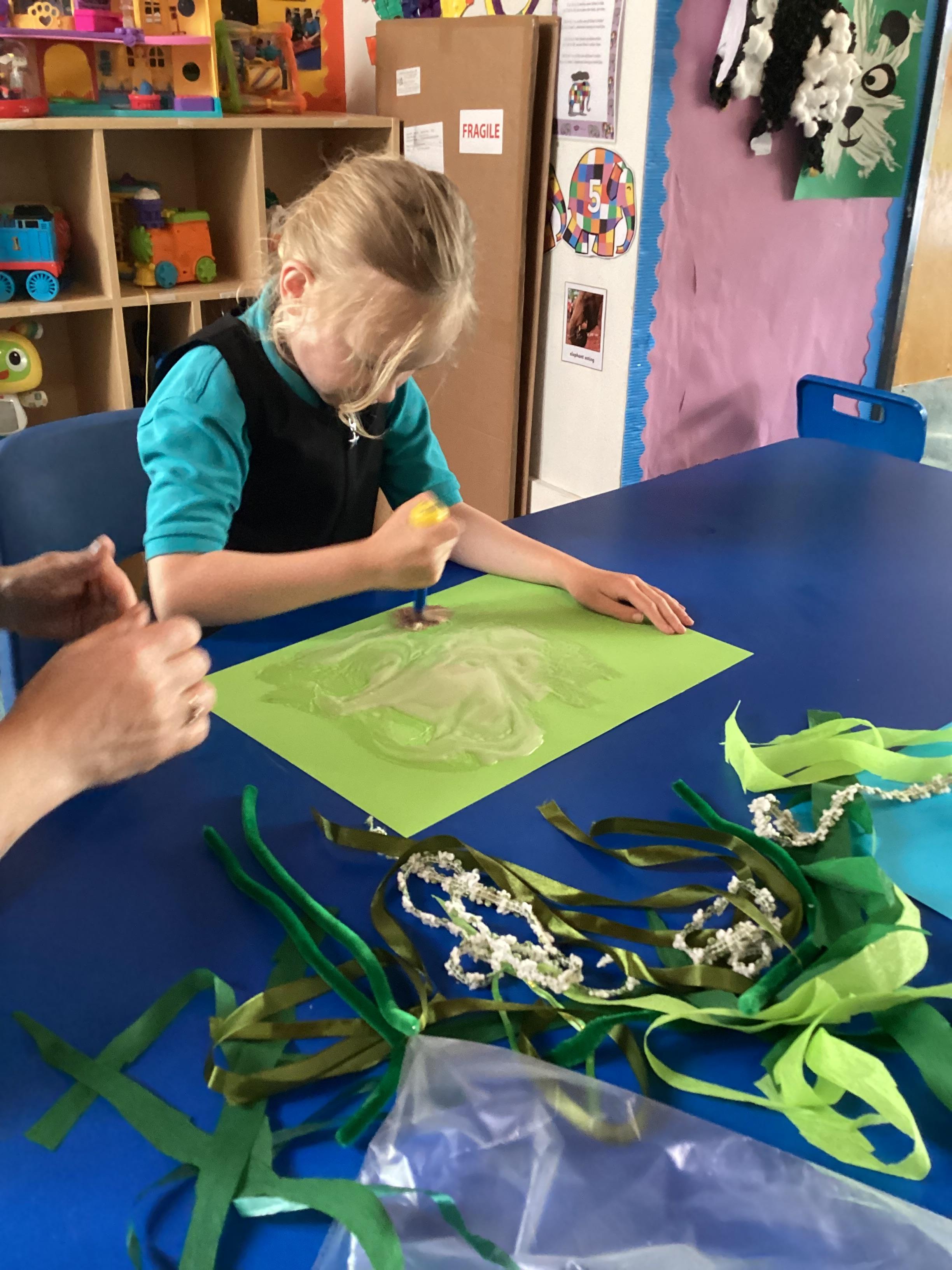 1.5.25- Communication & Language/ Art - Reading our new story 'We're Going on a Bear Hunt' and exploring the different textures (mud, grass, snow, water) by creating different pictures using various materials. )
