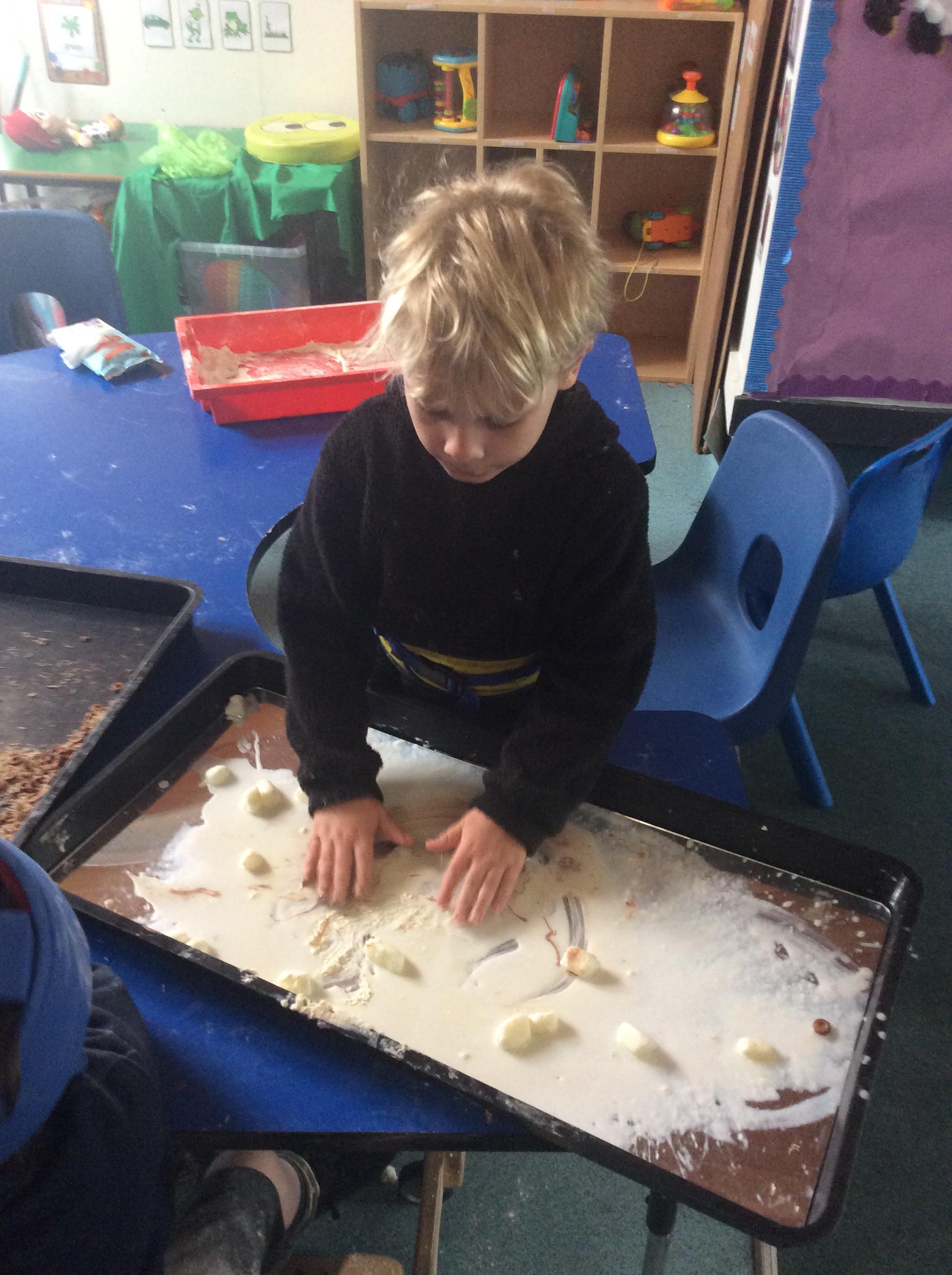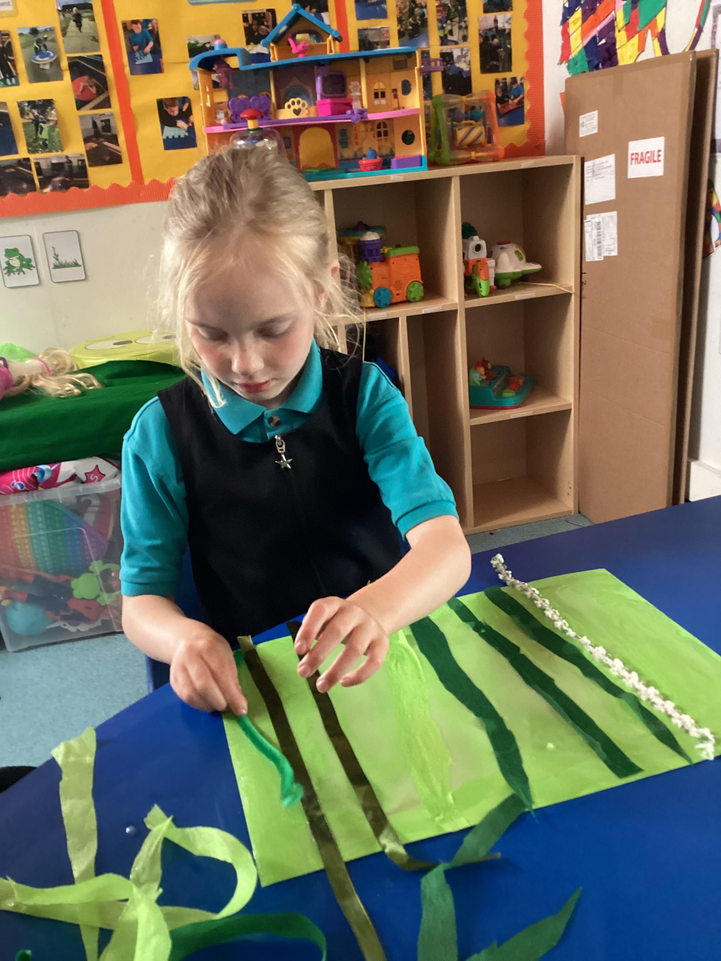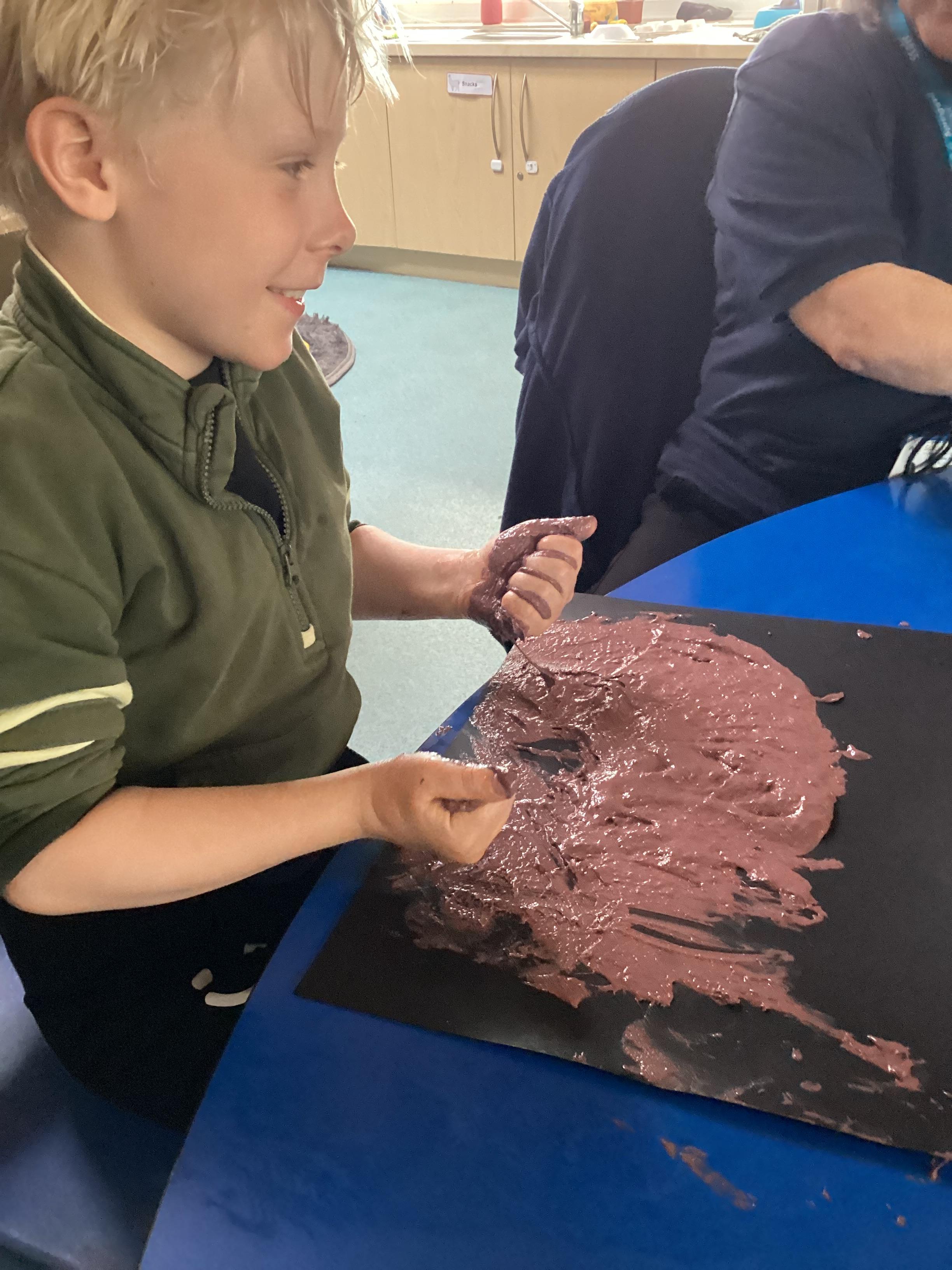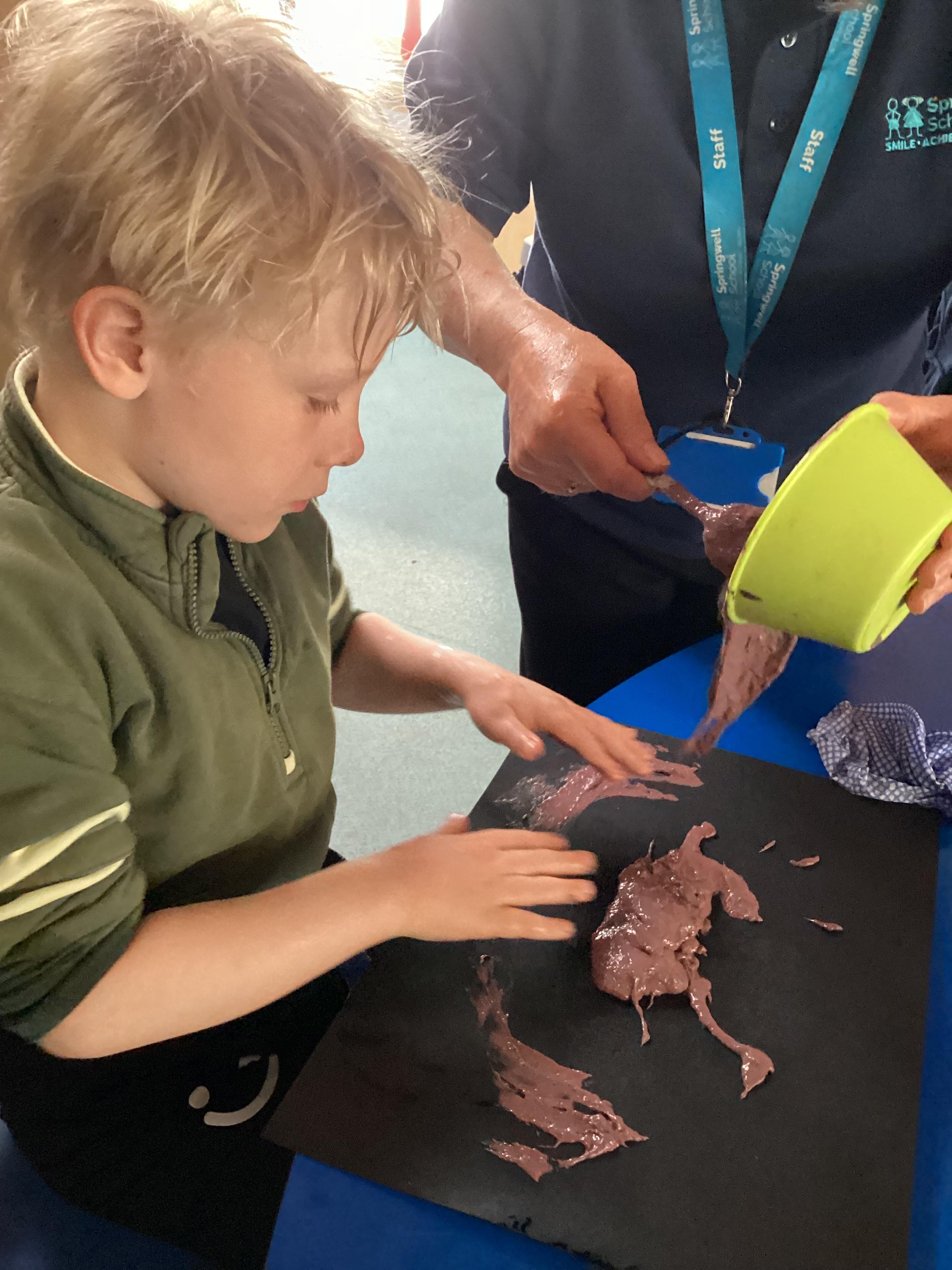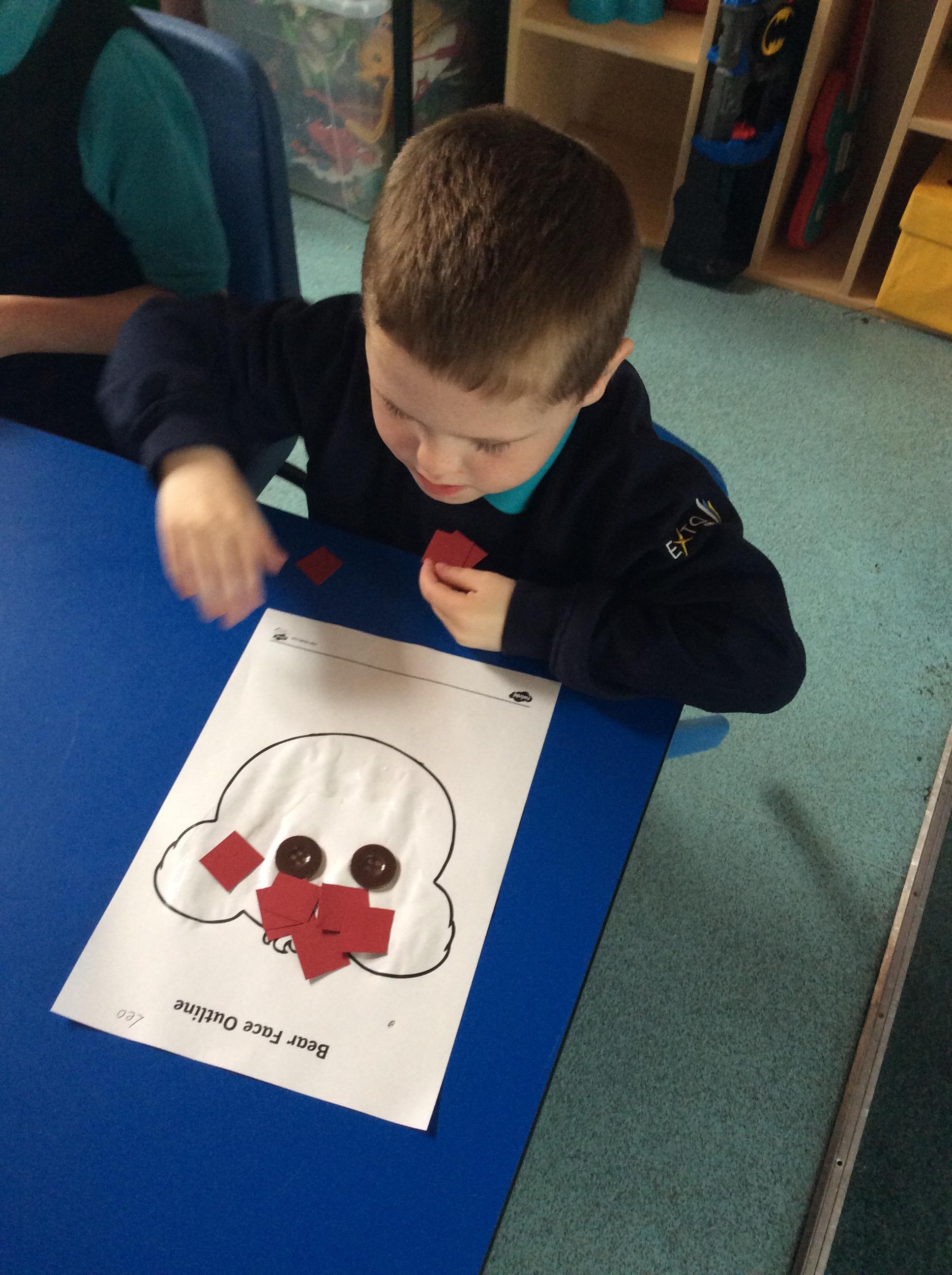 1.5.25- Communication & Language/ Art - Reading our new story 'We're Going on a Bear Hunt' and exploring the different textures (mud, grass, snow, water) by creating different pictures using various materials. )