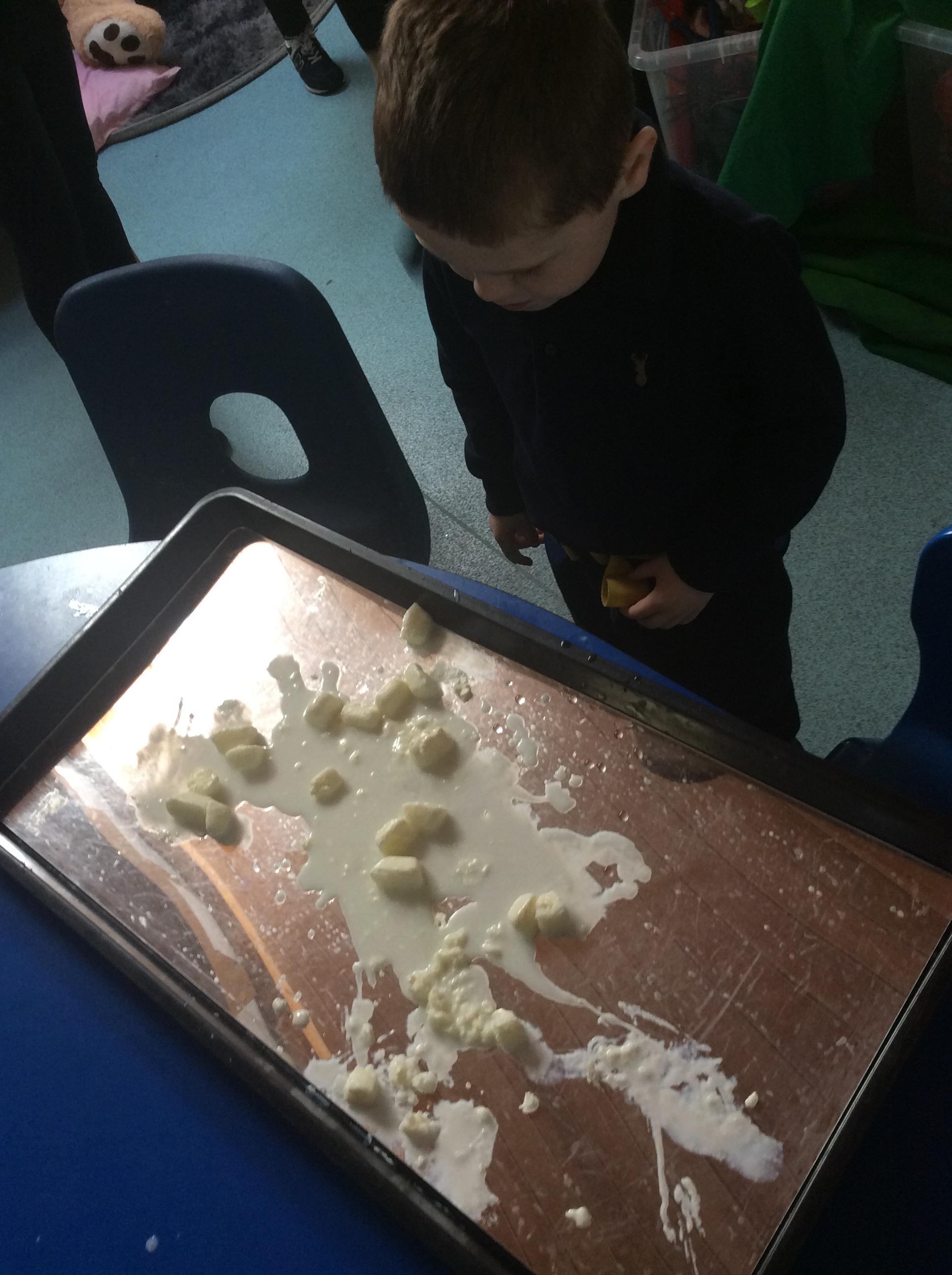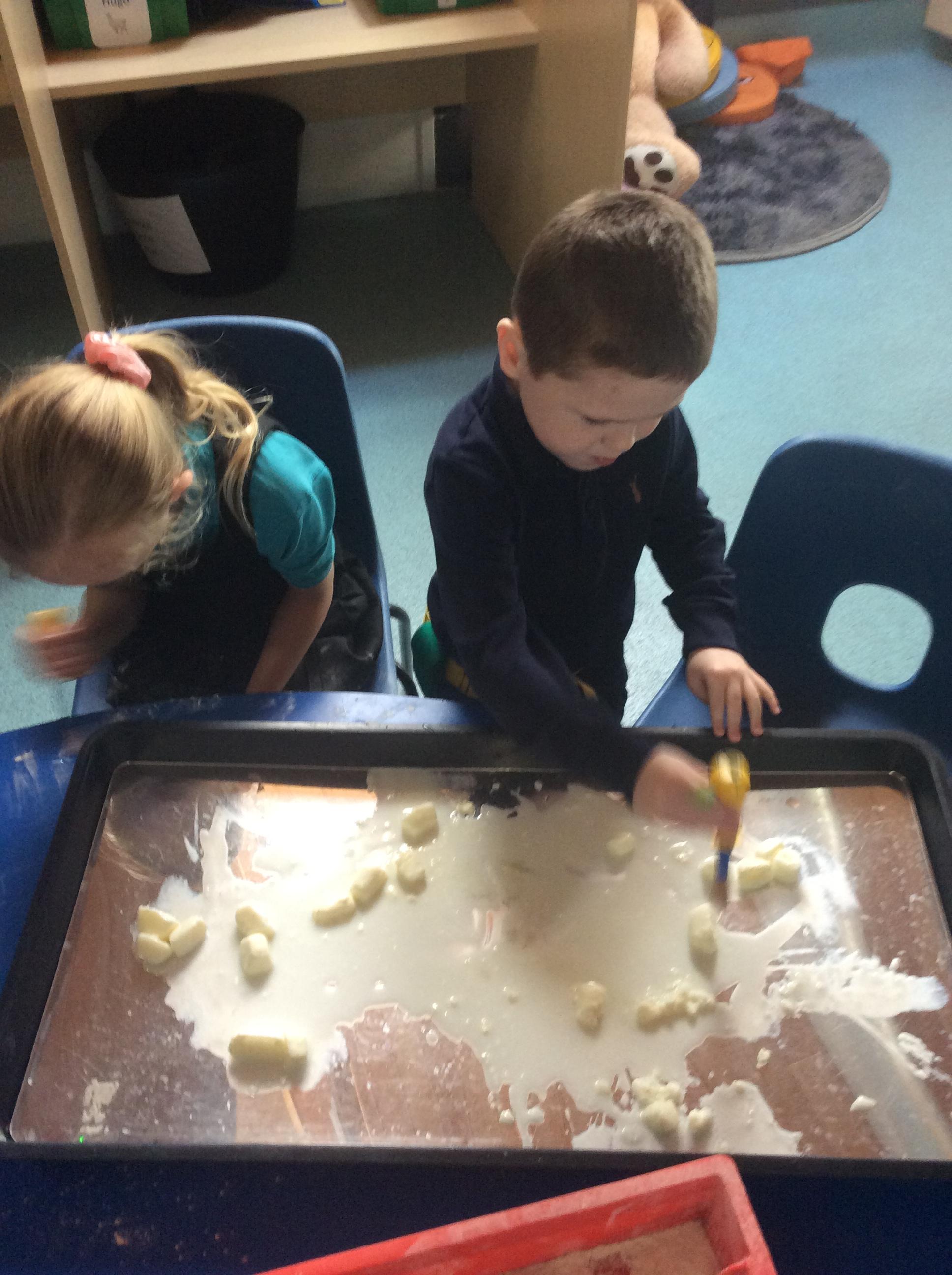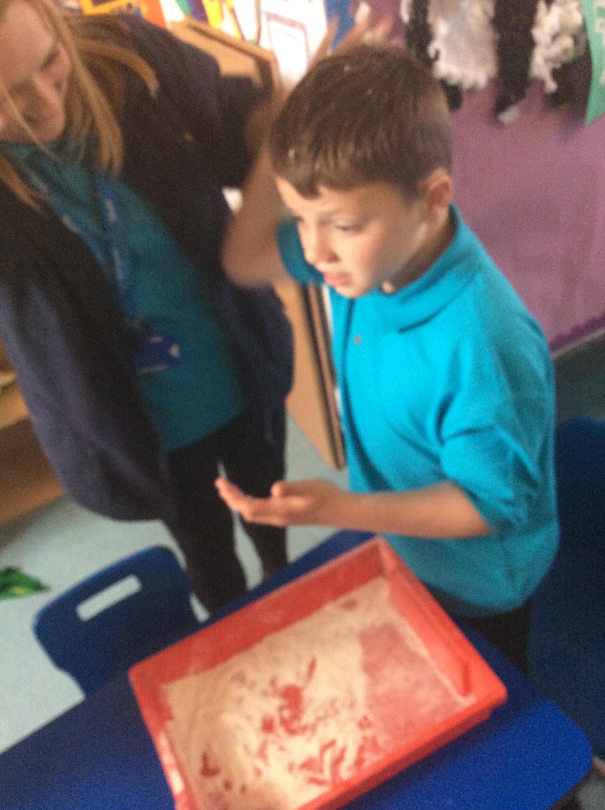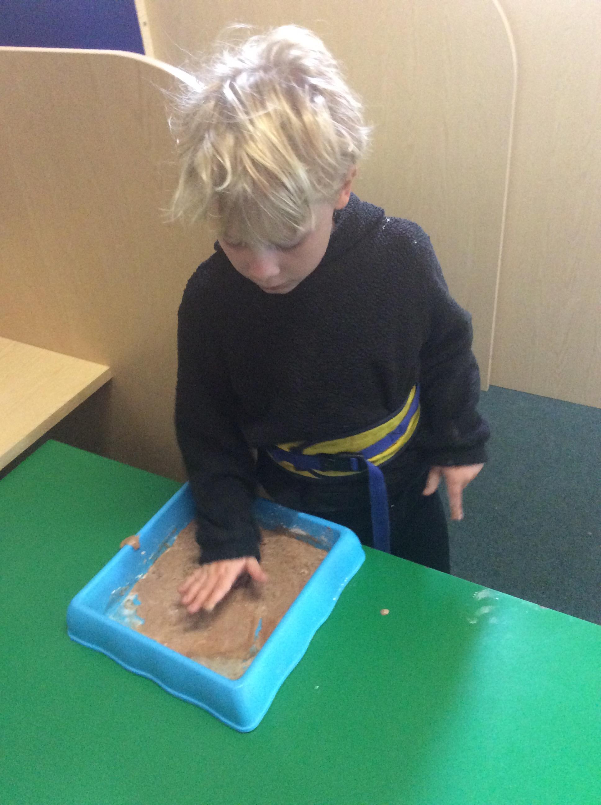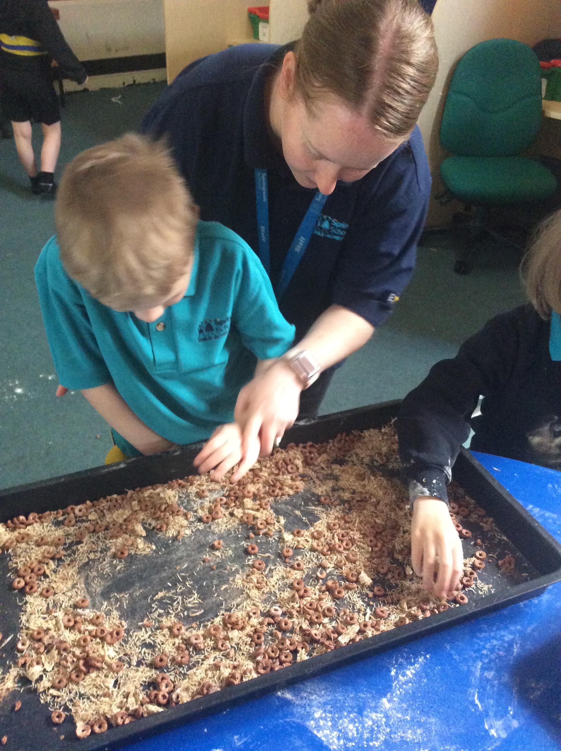 1.5.25- Communication & Language/ Art - Reading our new story 'We're Going on a Bear Hunt' and exploring the different textures (mud, grass, snow, water) by creating different pictures using various materials. )