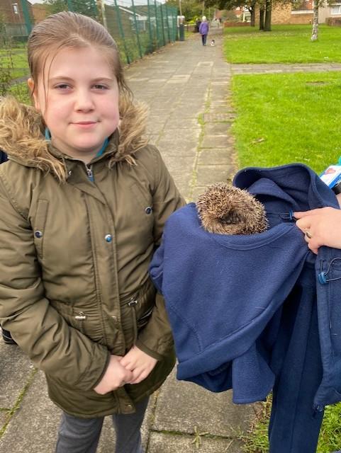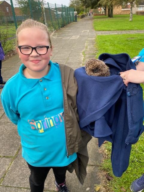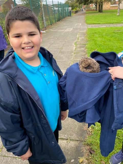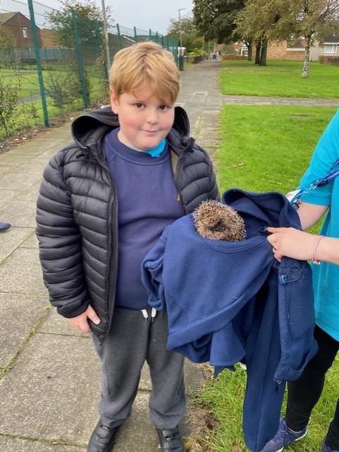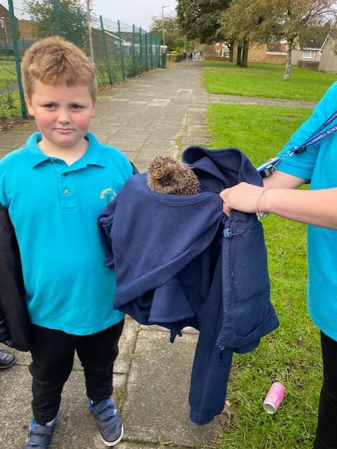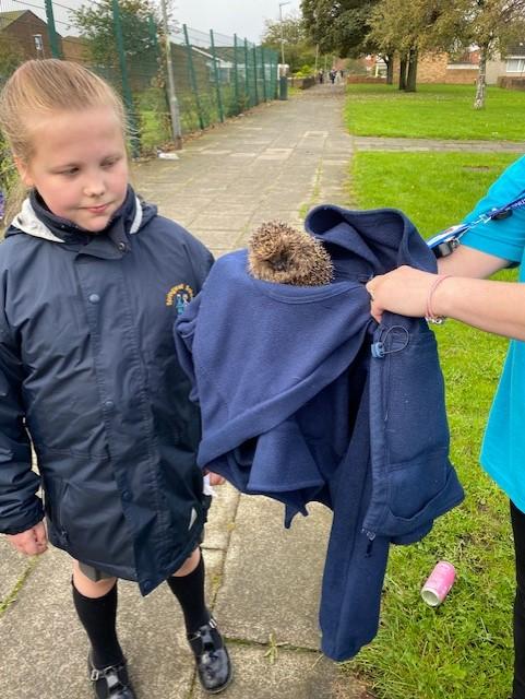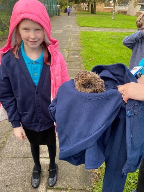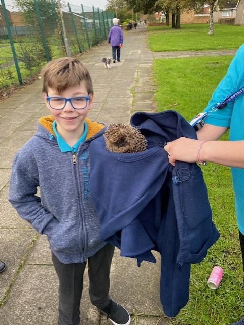 On our Mile -A -Day we found a hedgehog, Shark Class decided to rescue Harry and take him to safety.
