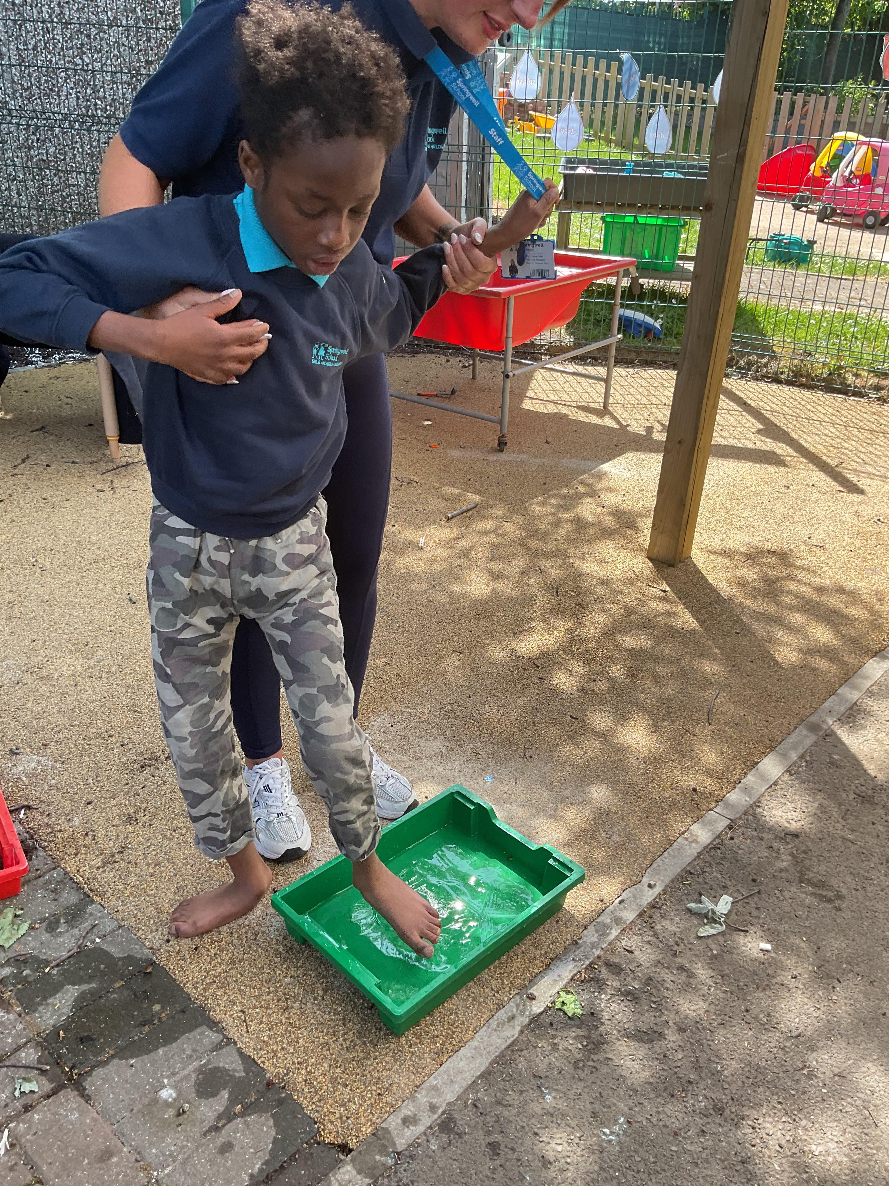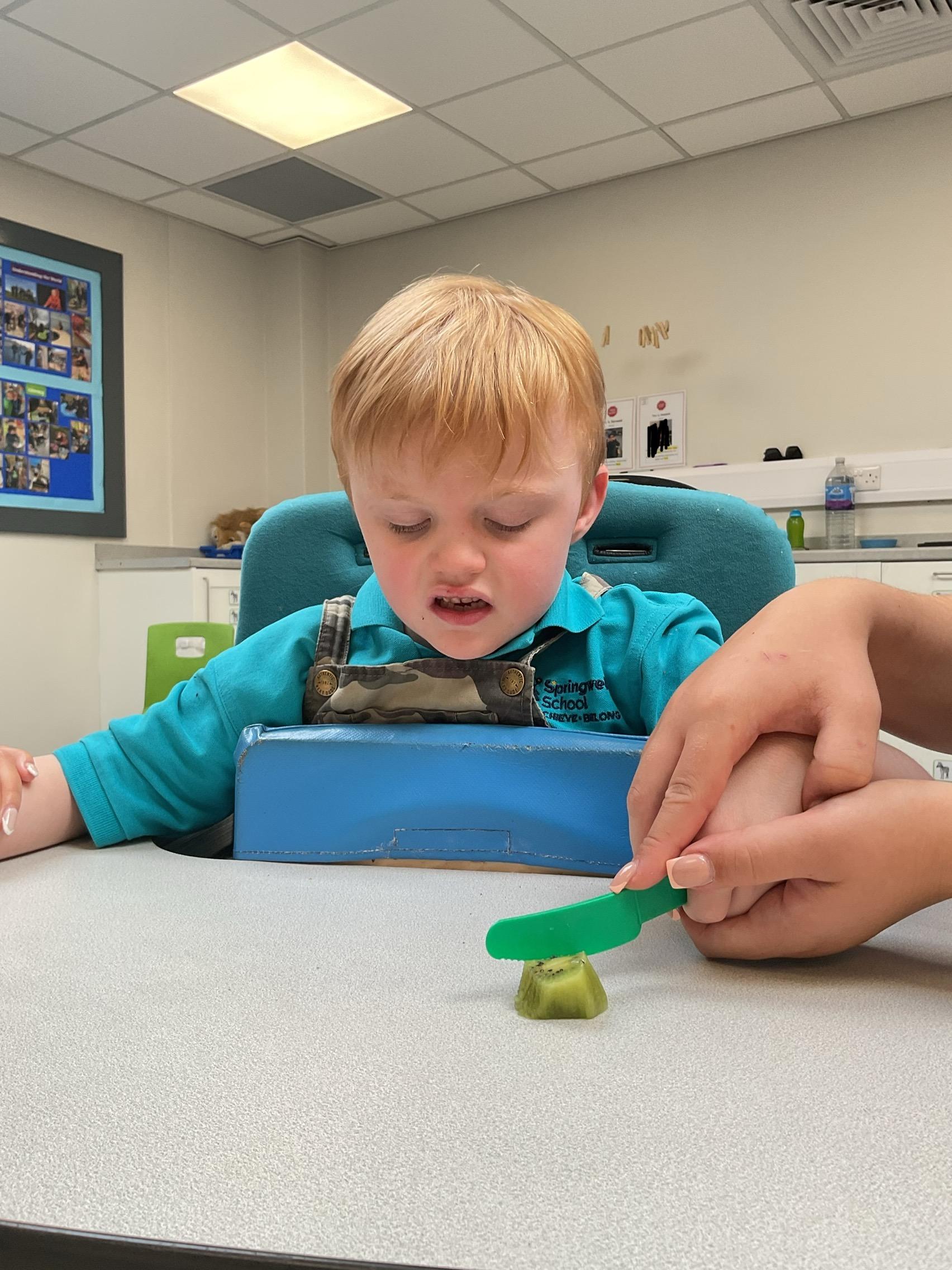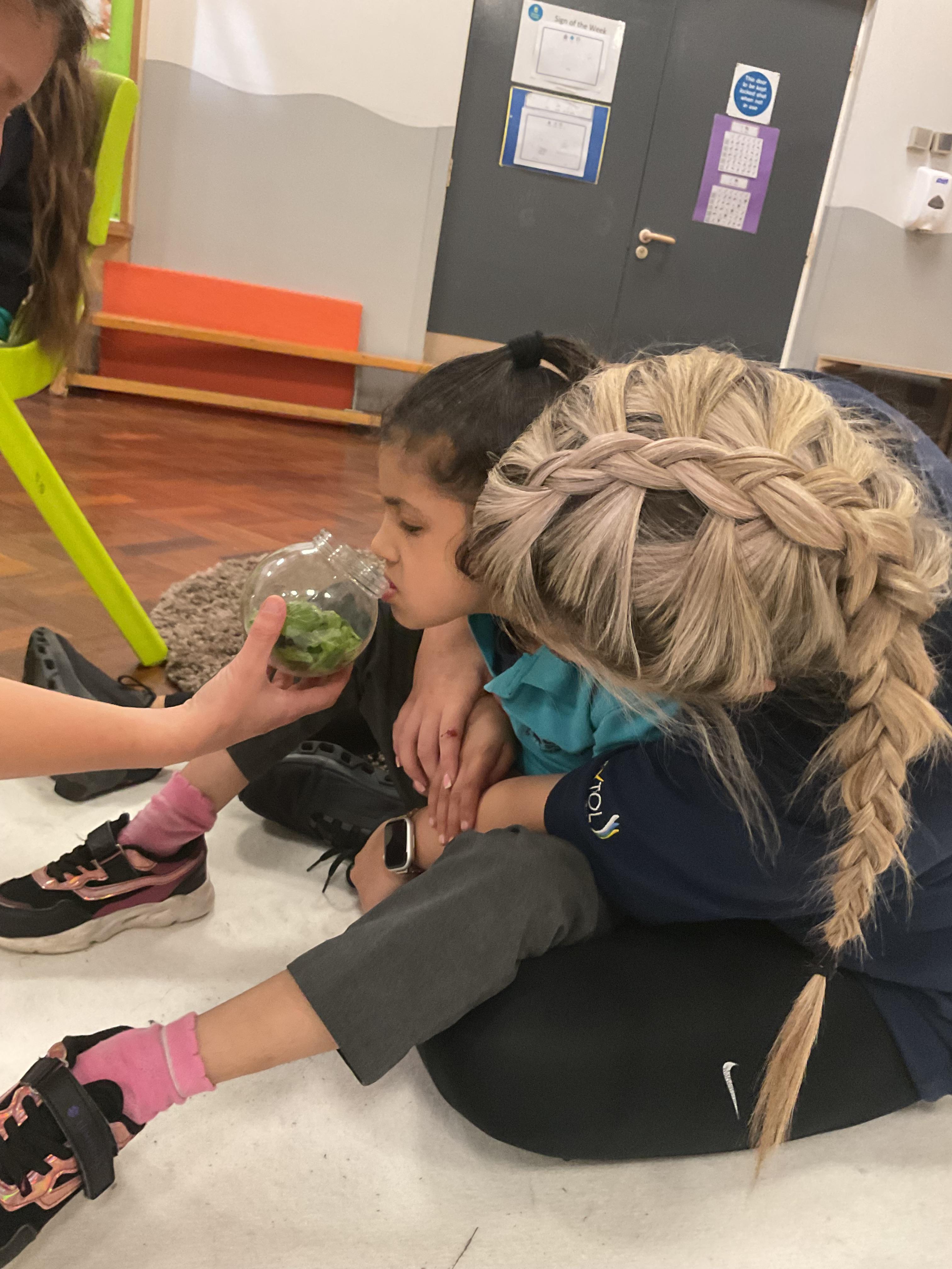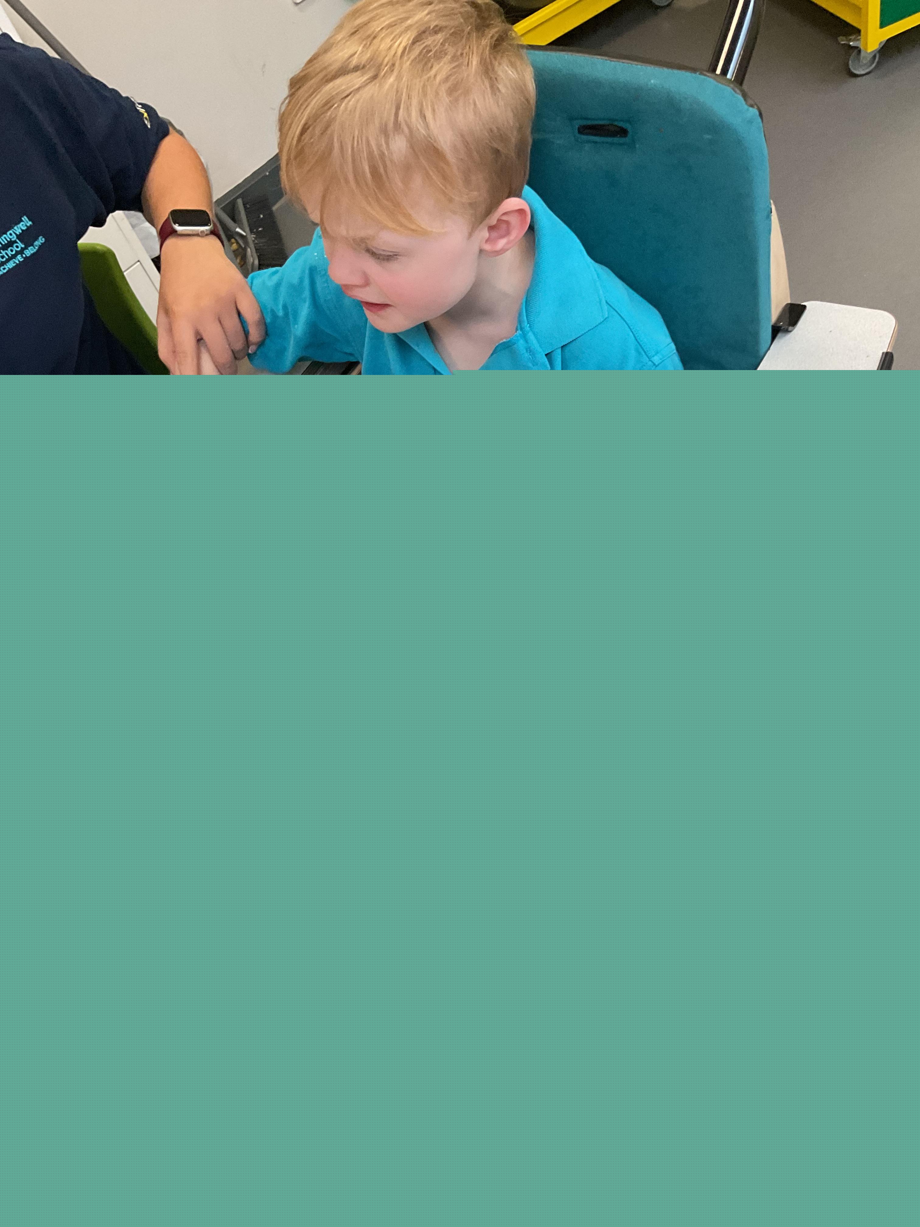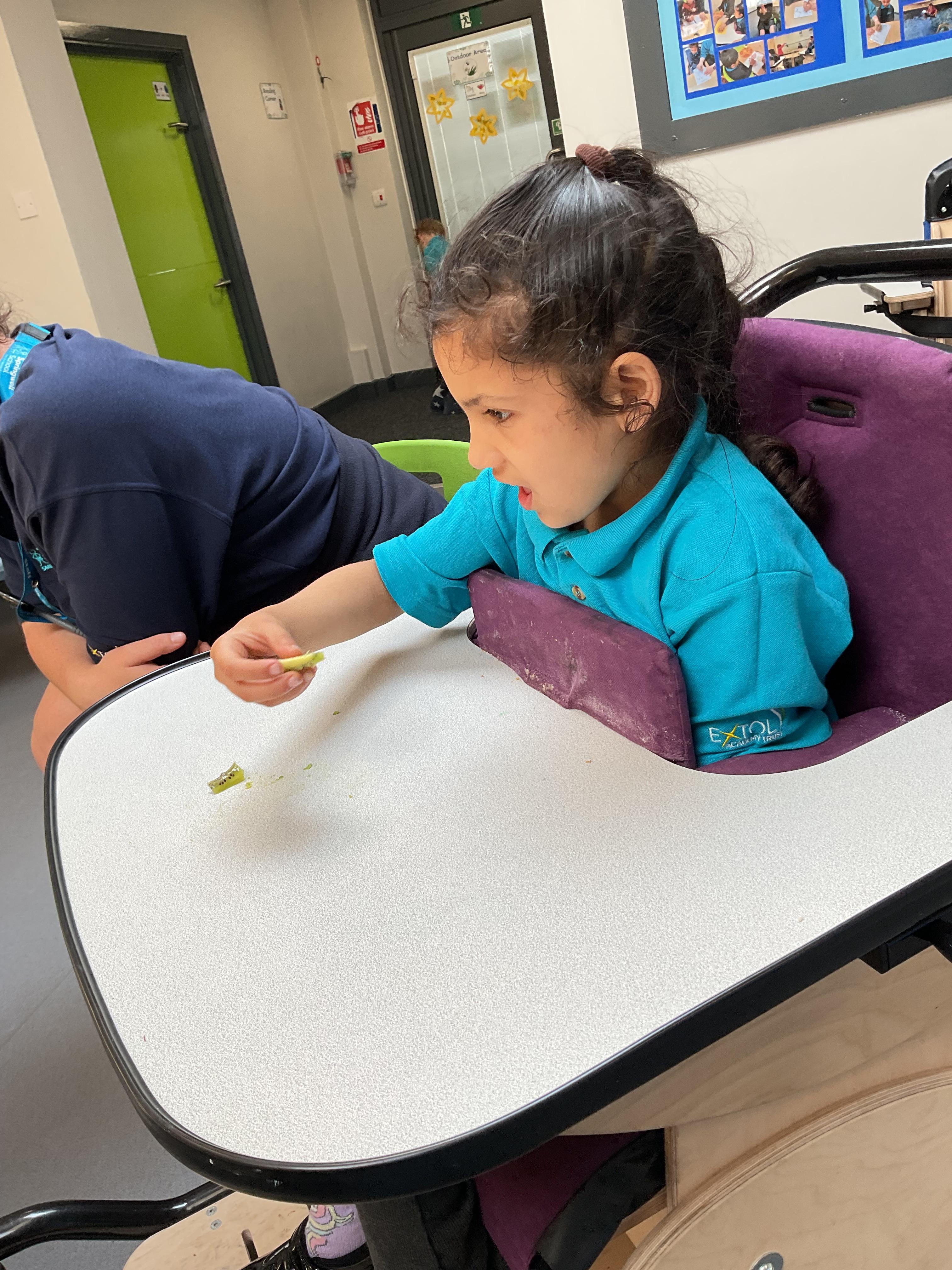 This week in Zebra Class we have made the most of sunshine and got out of the classroom a lot. We have enjoyed lots of water play and exploring in the community. We walked to Lidl and bought some ice lollies for us to enjoy for our snacks. Working on our fine motor skills, we practised cutting, making marks with our fingers and pens. Our colour of the week this week was green, we enjoyed using our senses to explore green foods. Some of us preferred tactile exploring over tasting! All of the children in Zebras really enjoy Attention Time, we are trying really hard to develop and prolong our interest in objects and tracking skills. One of our favourite things to track is bubbles!