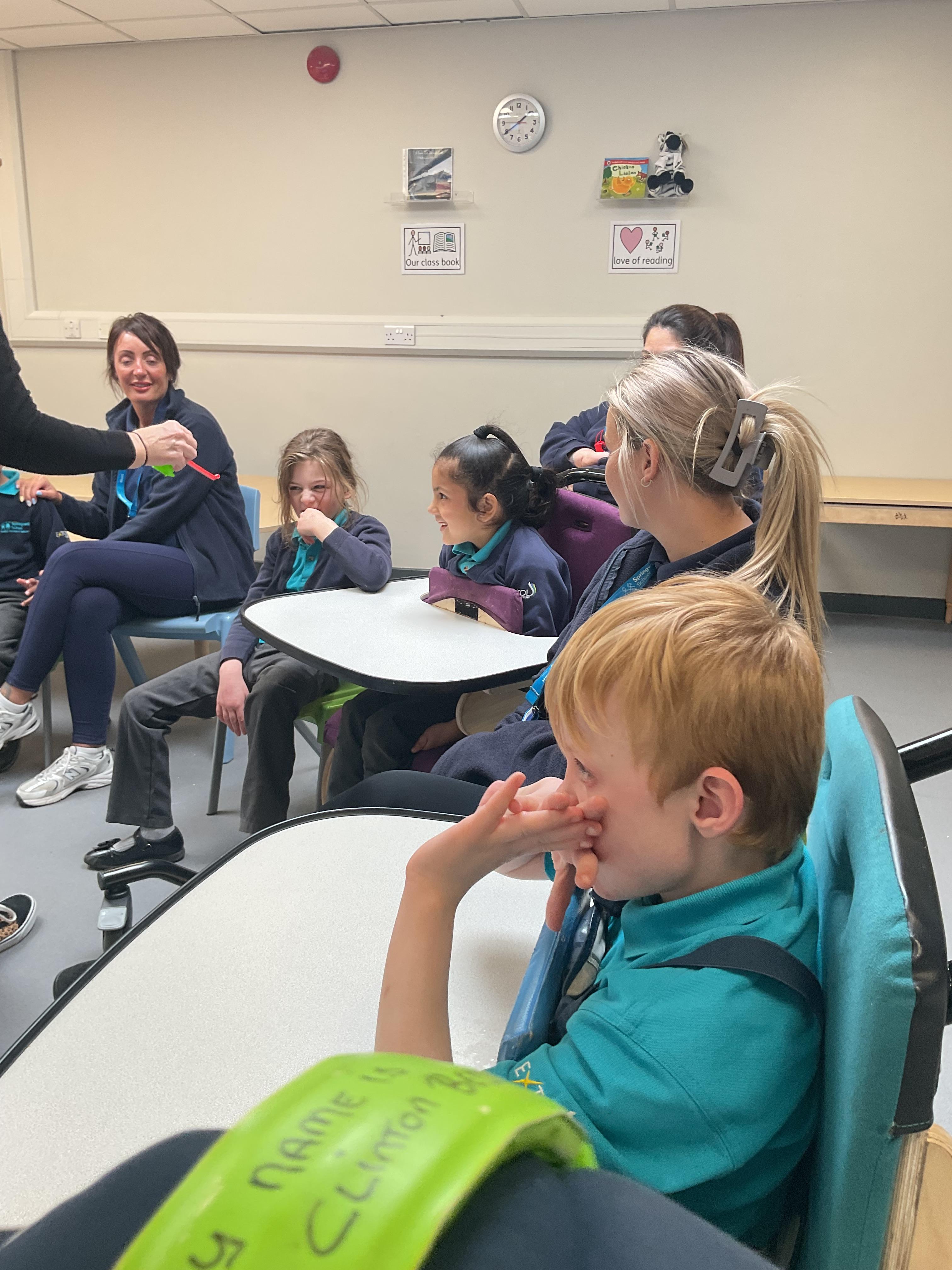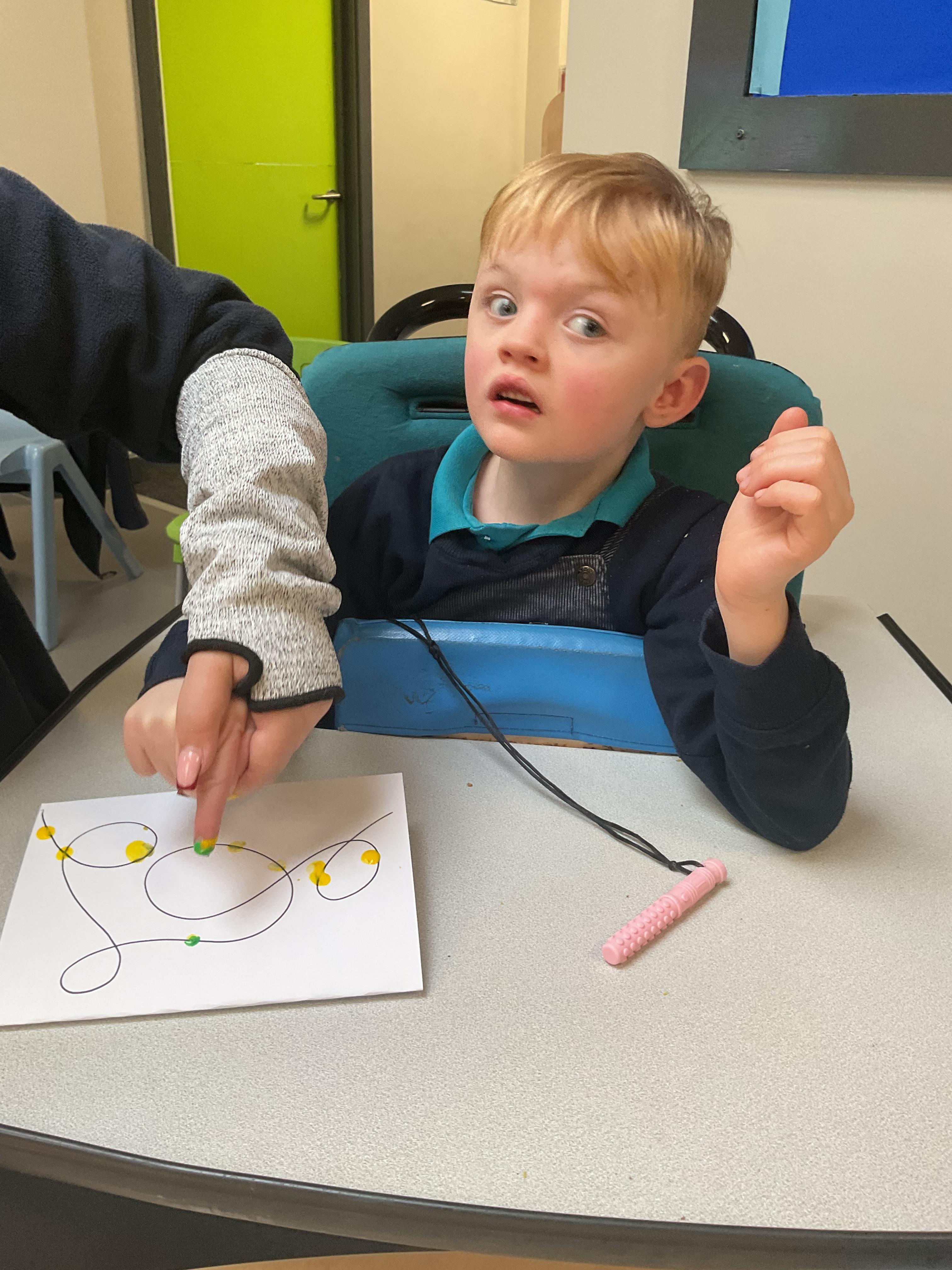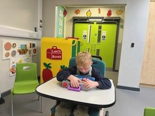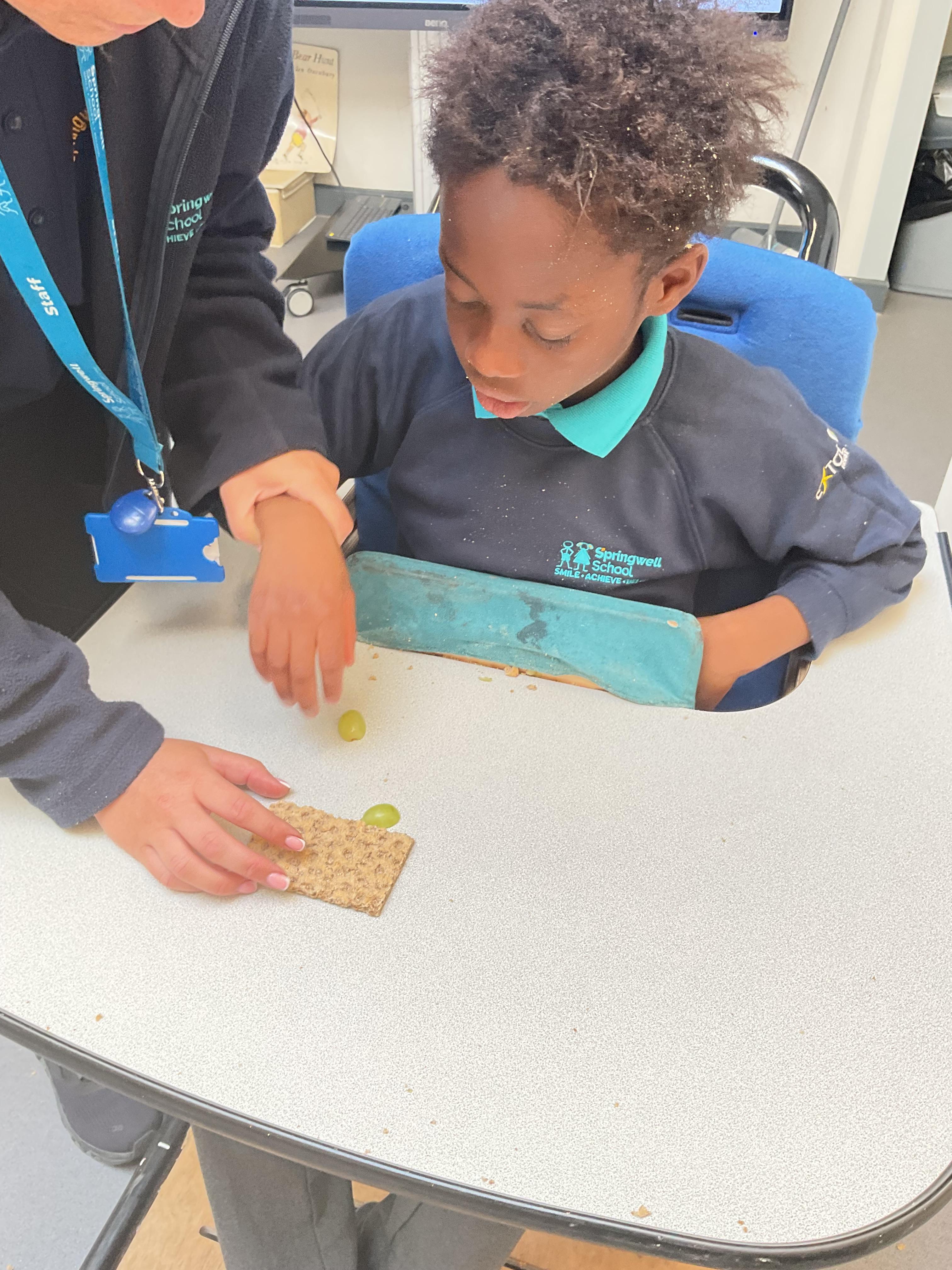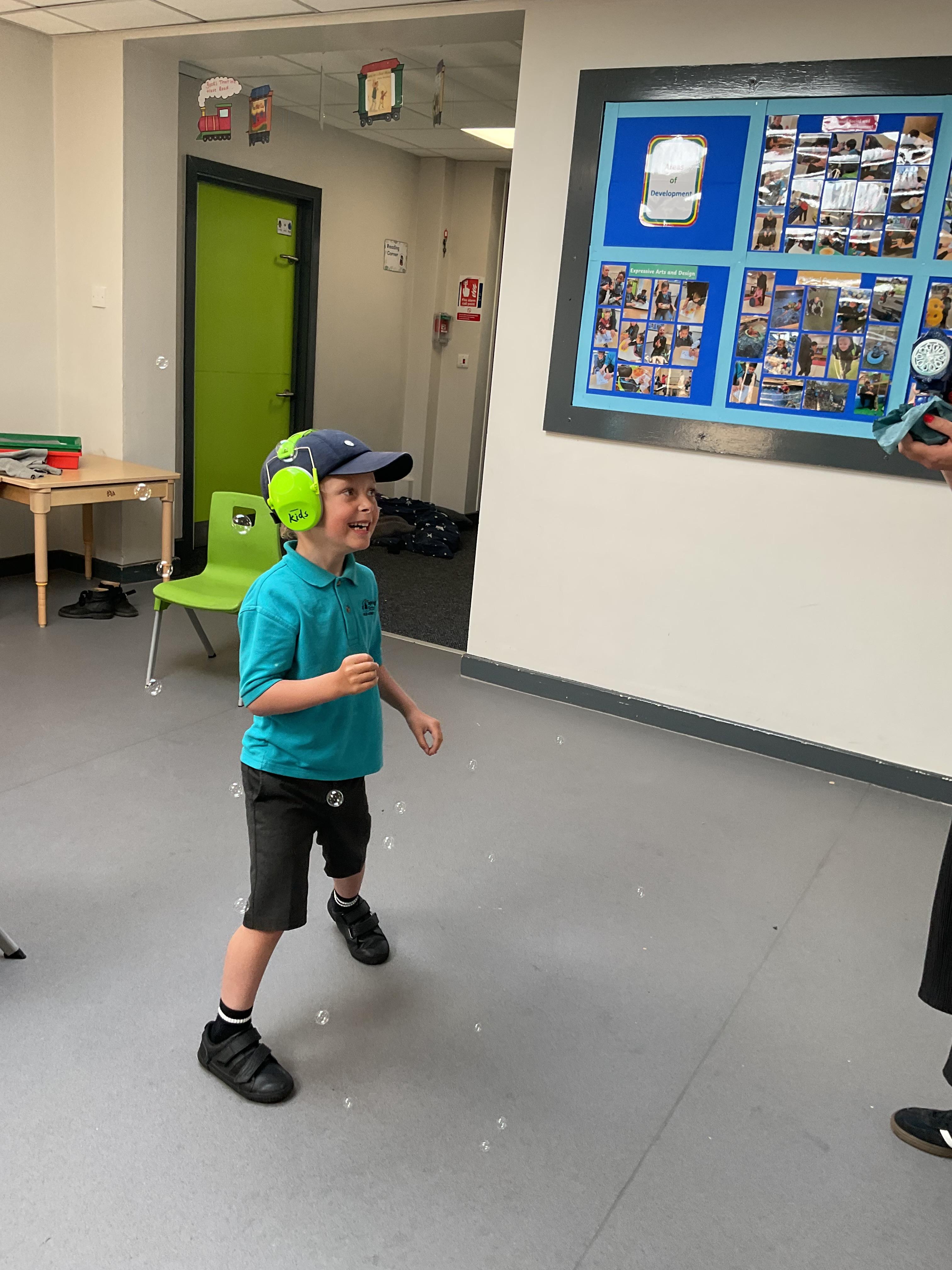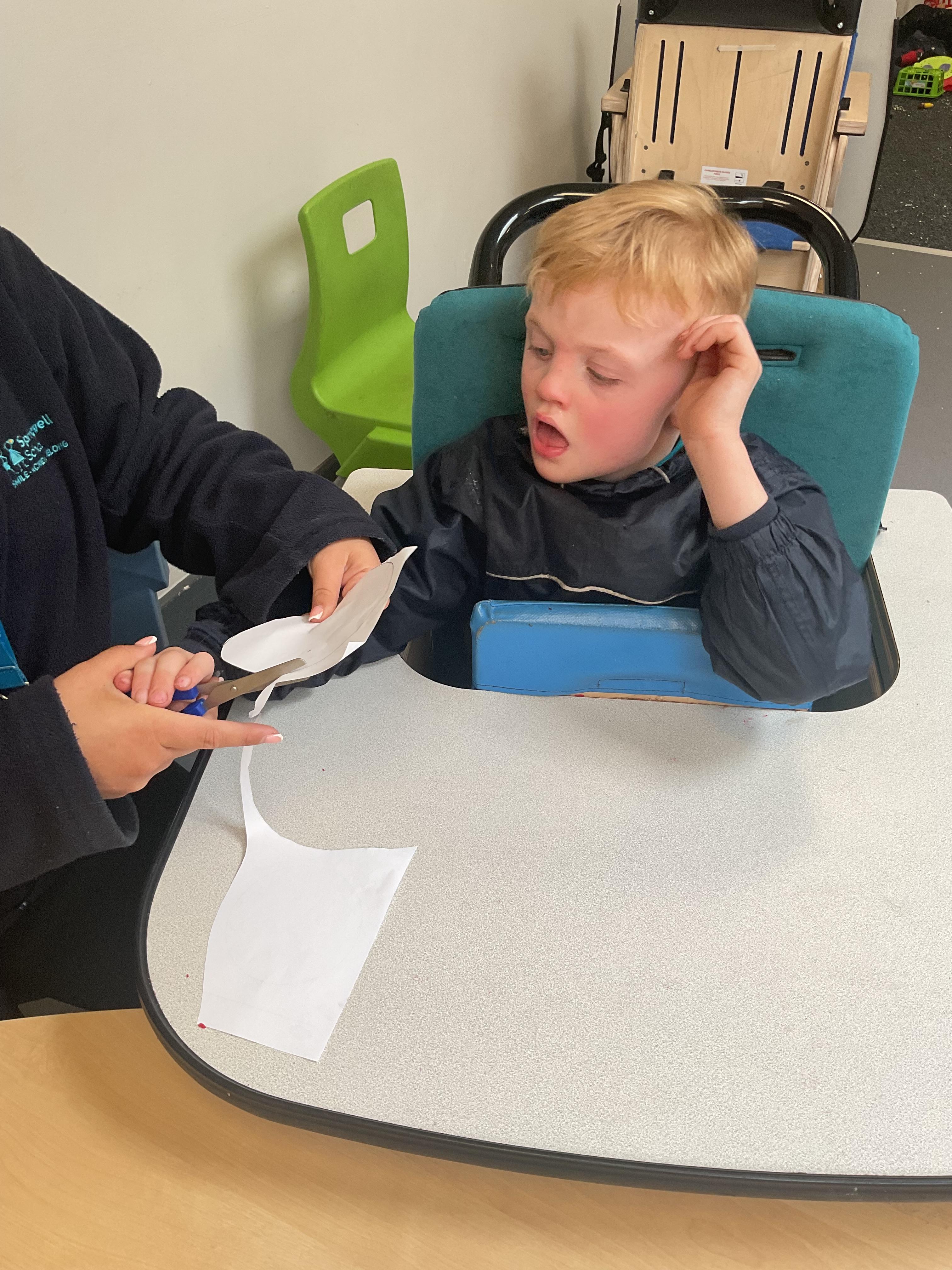 This week in Zebra Class we have made the most of sunshine and got out of the classroom a lot. We have enjoyed lots of water play and exploring in the community. We walked to Lidl and bought some ice lollies for us to enjoy for our snacks. Working on our fine motor skills, we practised cutting, making marks with our fingers and pens. Our colour of the week this week was green, we enjoyed using our senses to explore green foods. Some of us preferred tactile exploring over tasting! All of the children in Zebras really enjoy Attention Time, we are trying really hard to develop and prolong our interest in objects and tracking skills. One of our favourite things to track is bubbles!