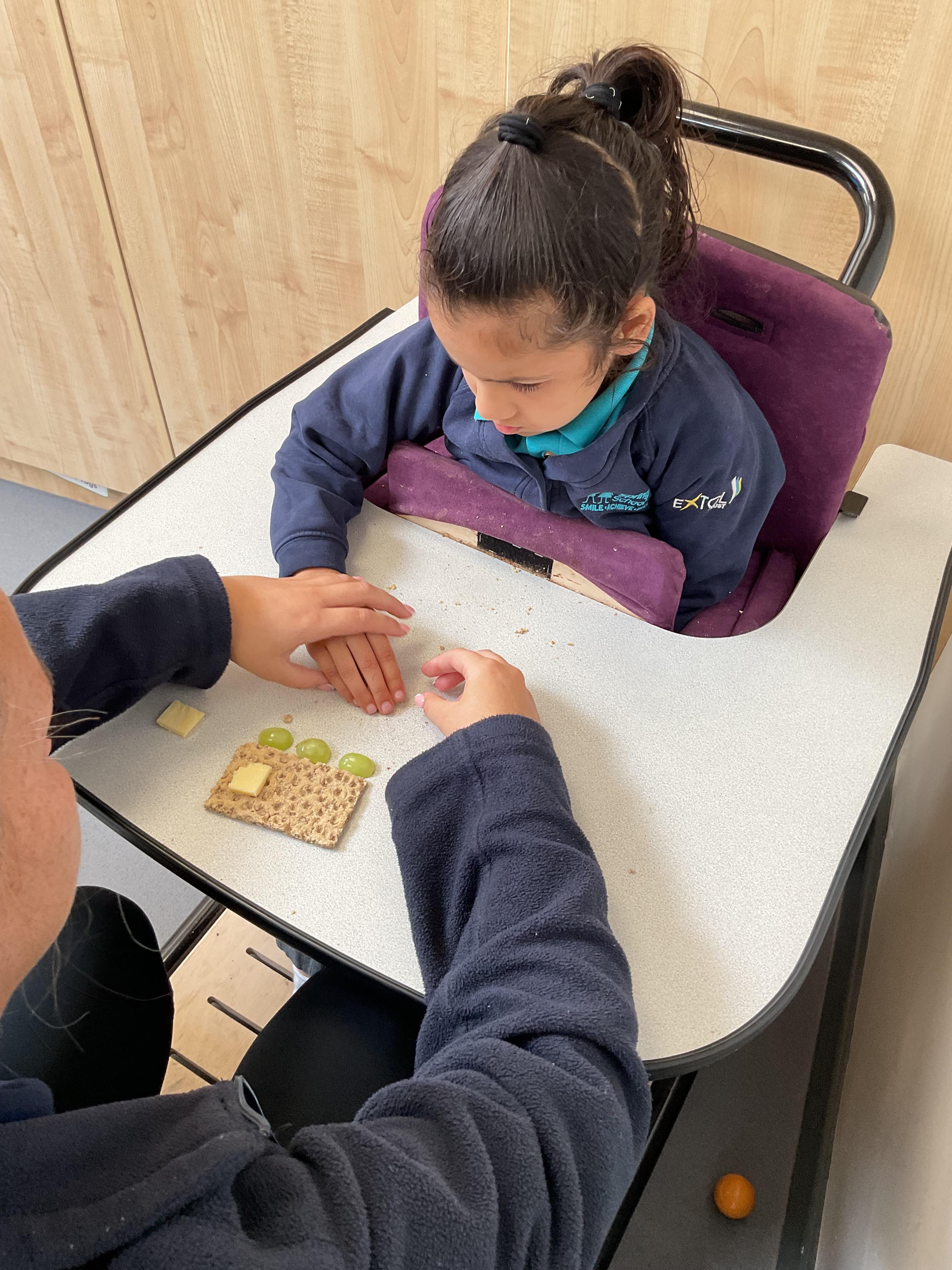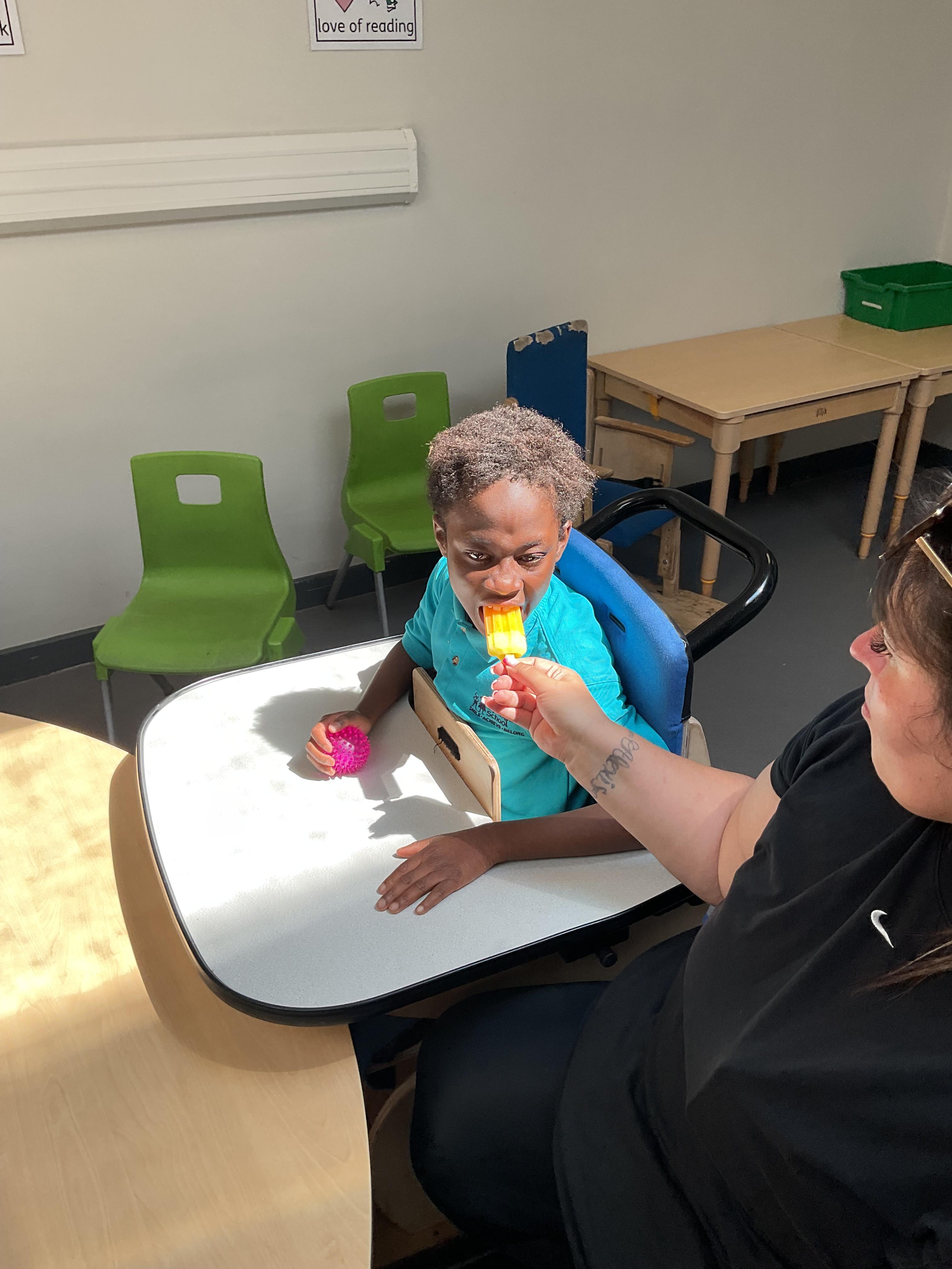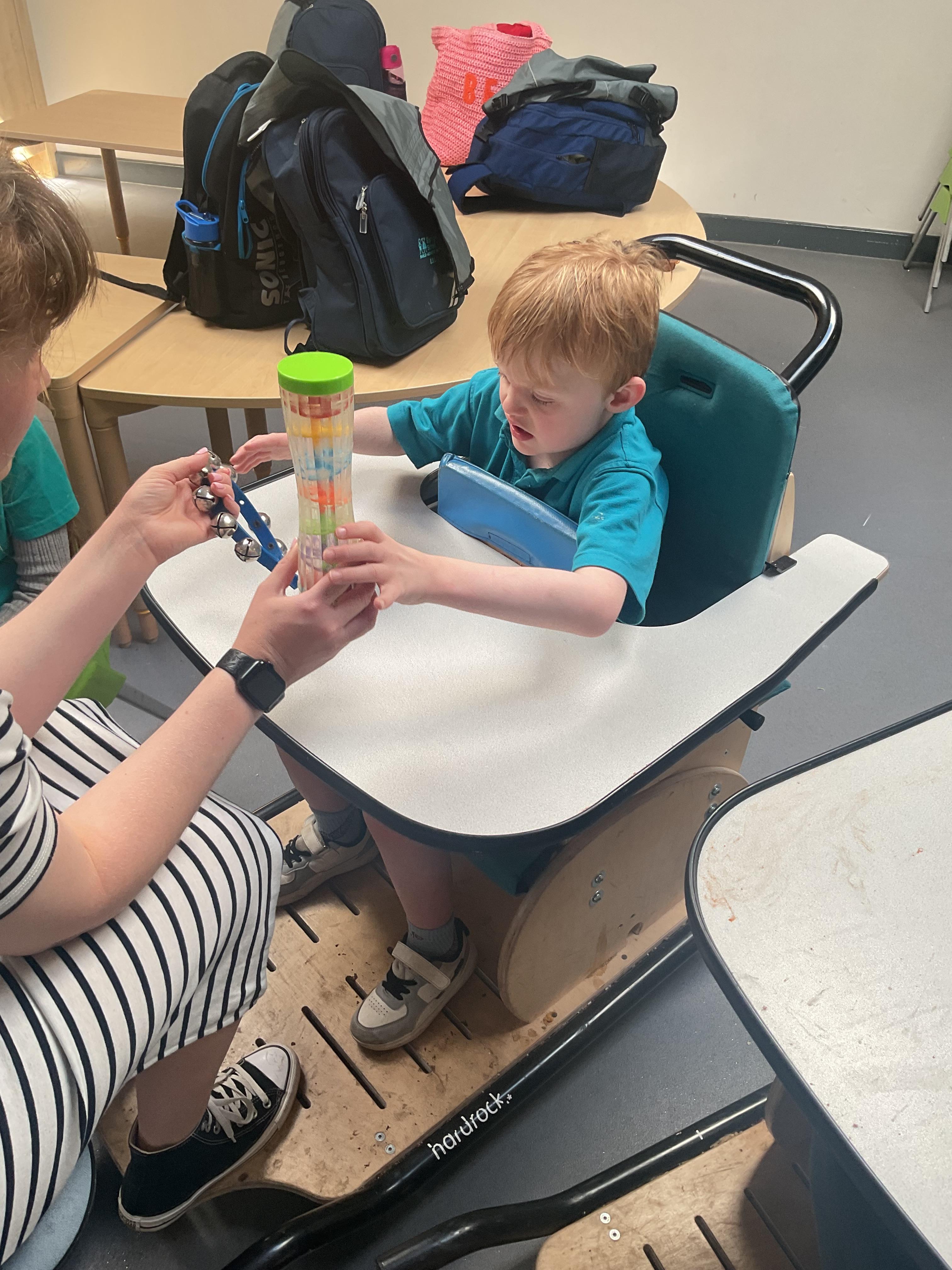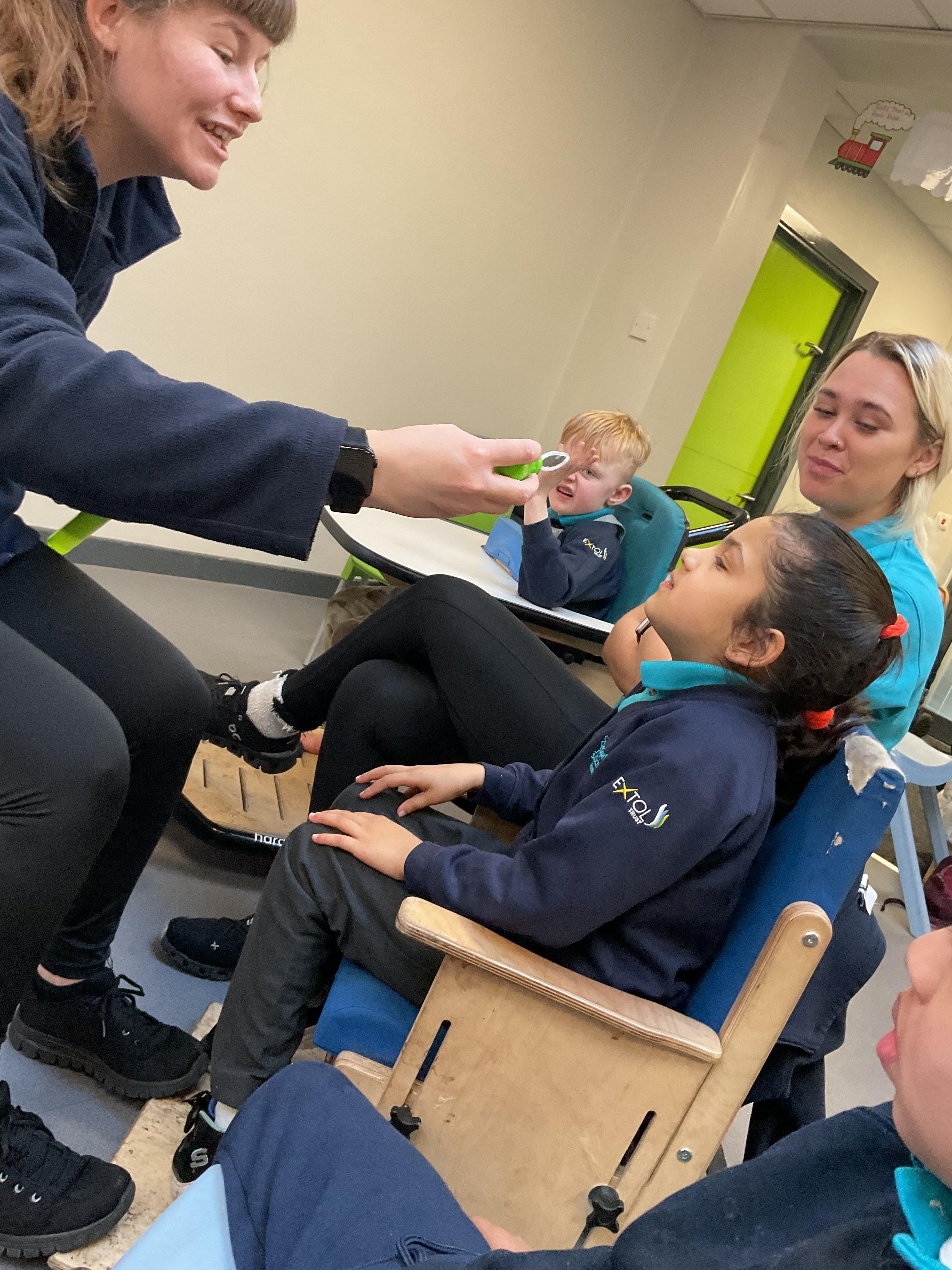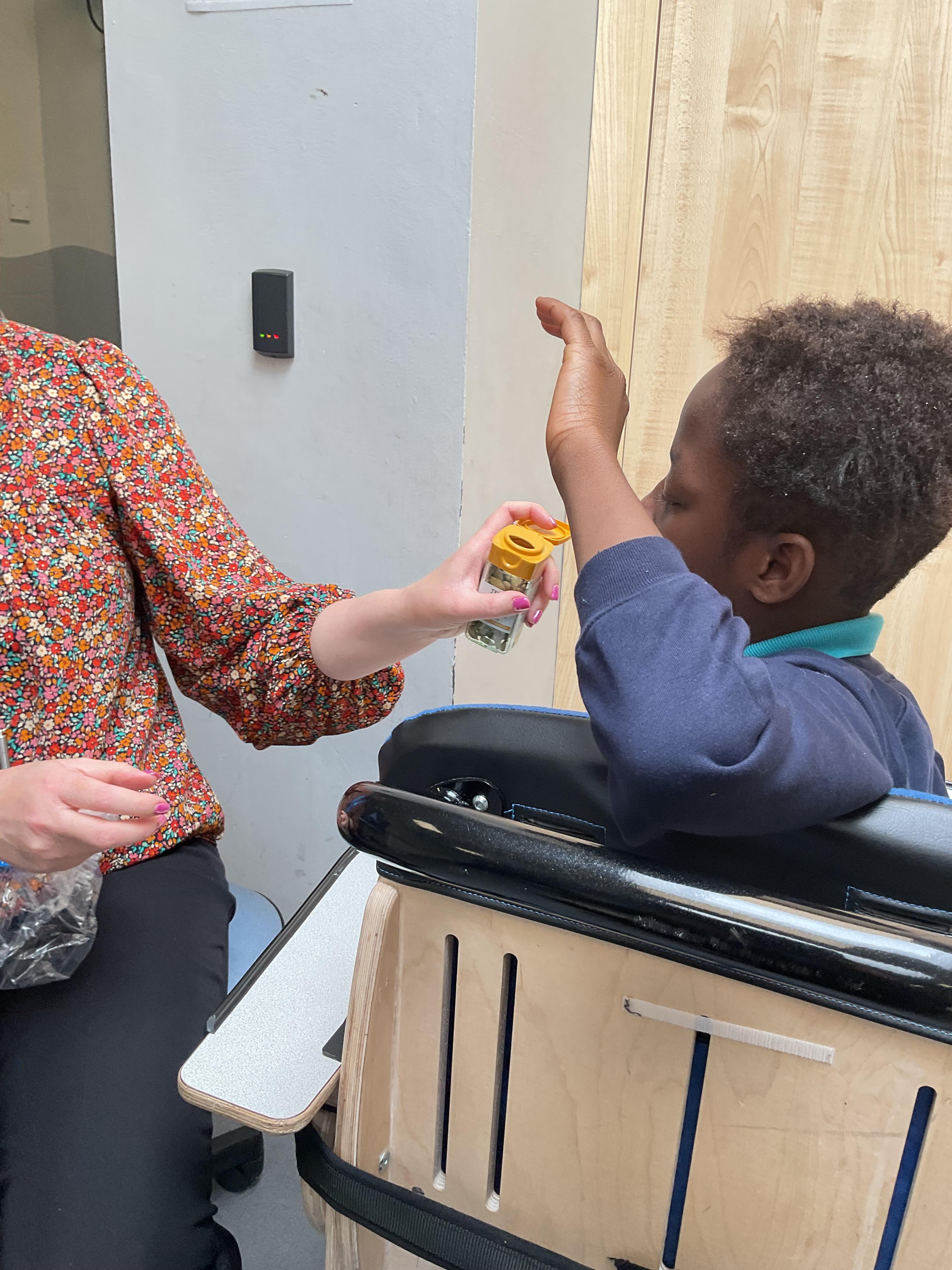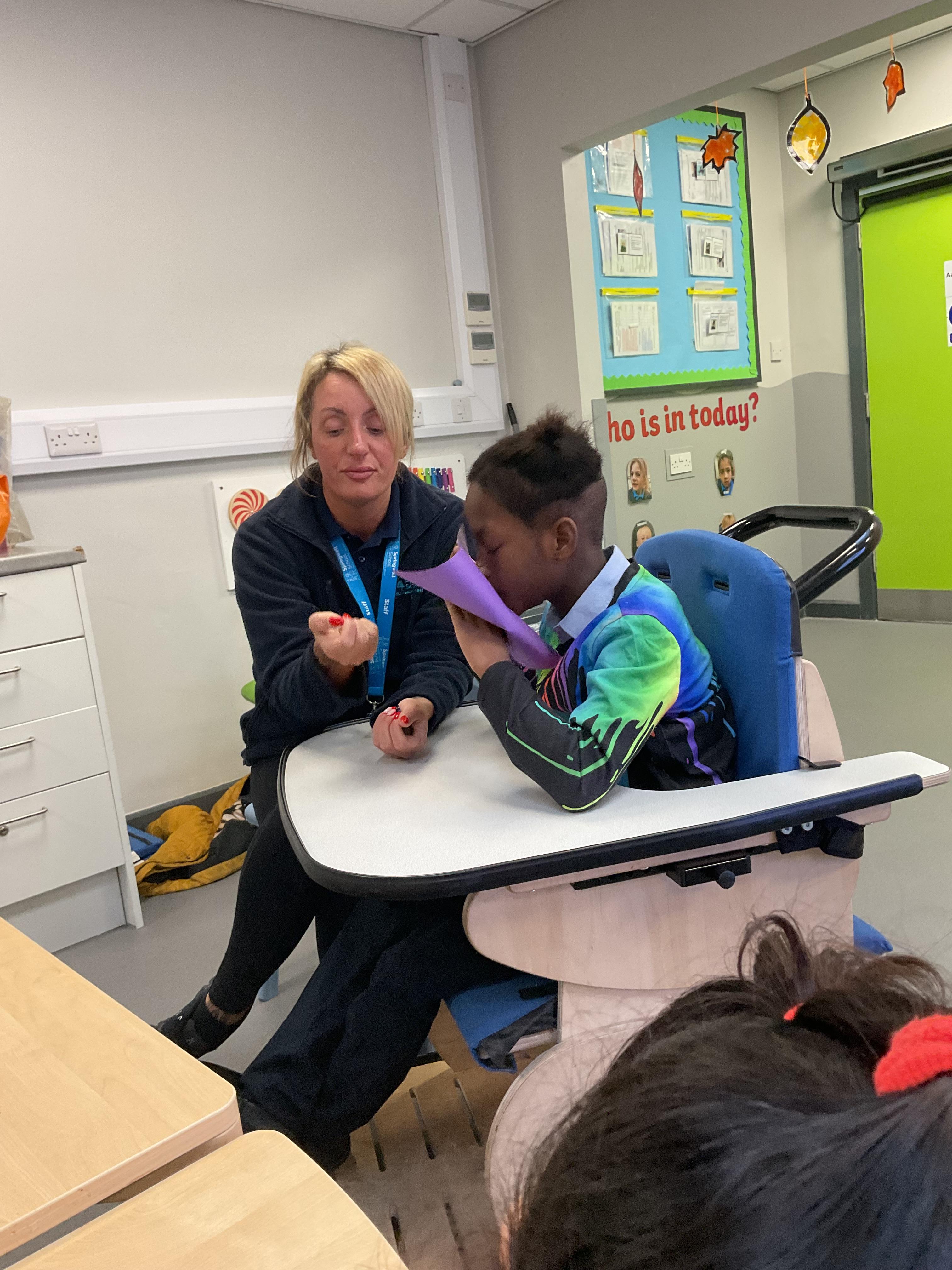 This week in Zebra Class we have made the most of sunshine and got out of the classroom a lot. We have enjoyed lots of water play and exploring in the community. We walked to Lidl and bought some ice lollies for us to enjoy for our snacks. Working on our fine motor skills, we practised cutting, making marks with our fingers and pens. Our colour of the week this week was green, we enjoyed using our senses to explore green foods. Some of us preferred tactile exploring over tasting! All of the children in Zebras really enjoy Attention Time, we are trying really hard to develop and prolong our interest in objects and tracking skills. One of our favourite things to track is bubbles!
