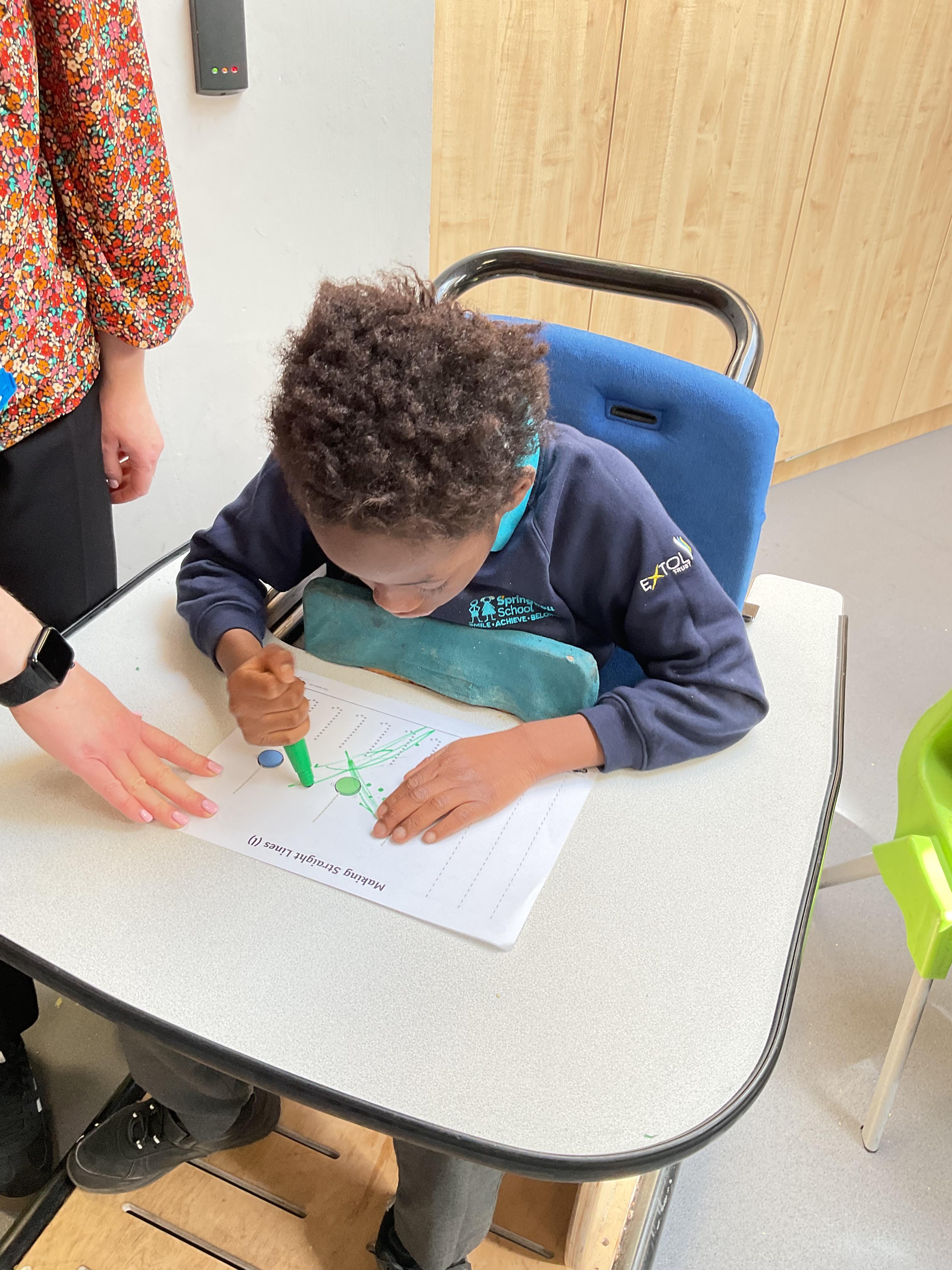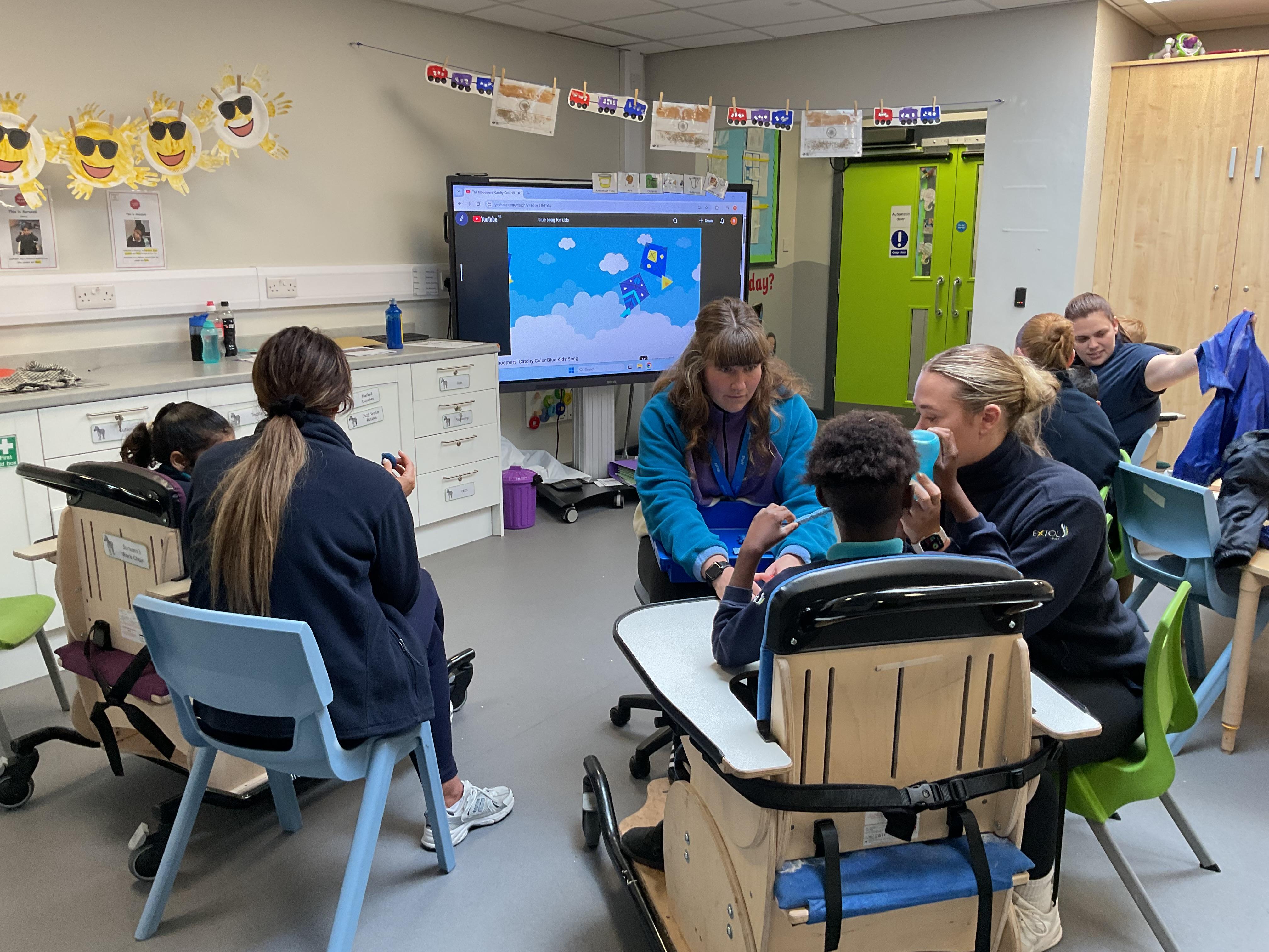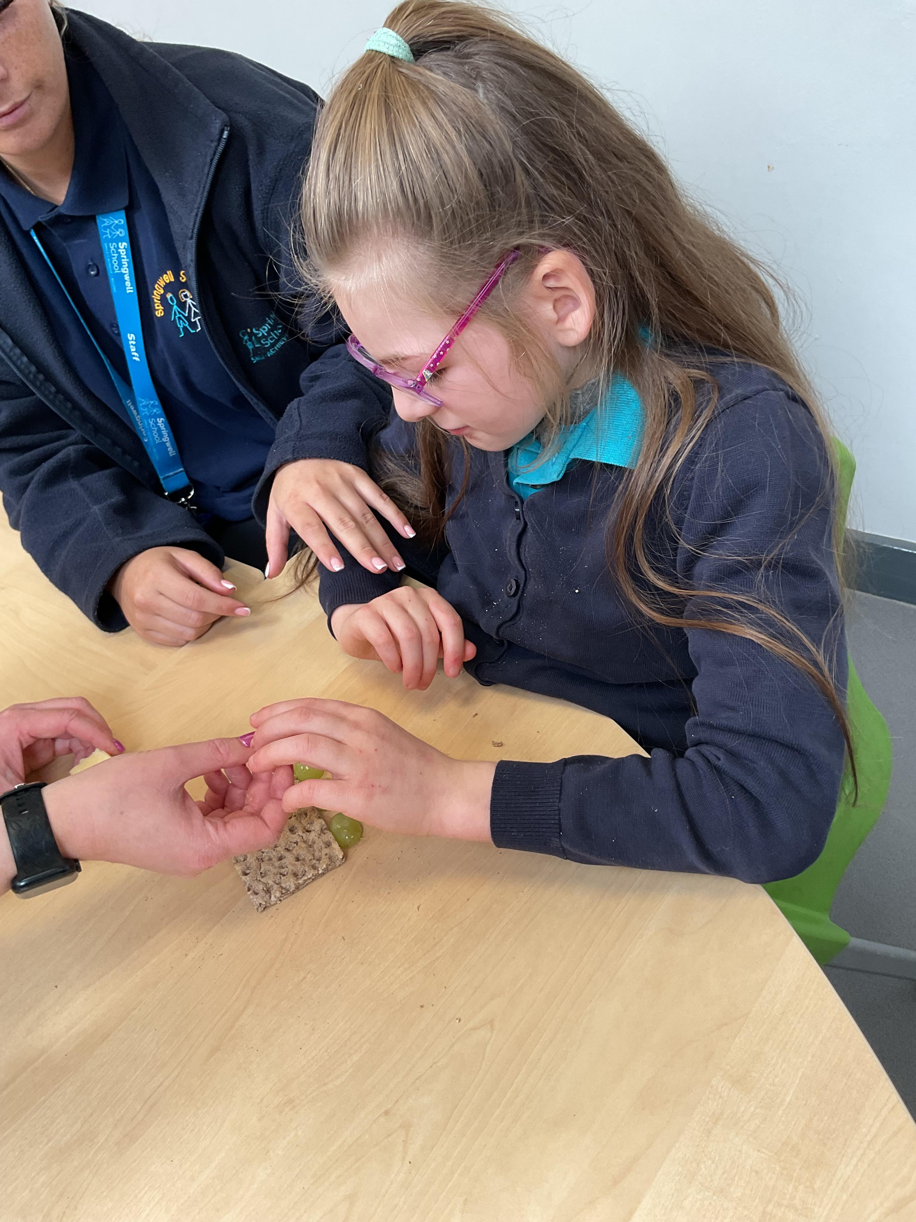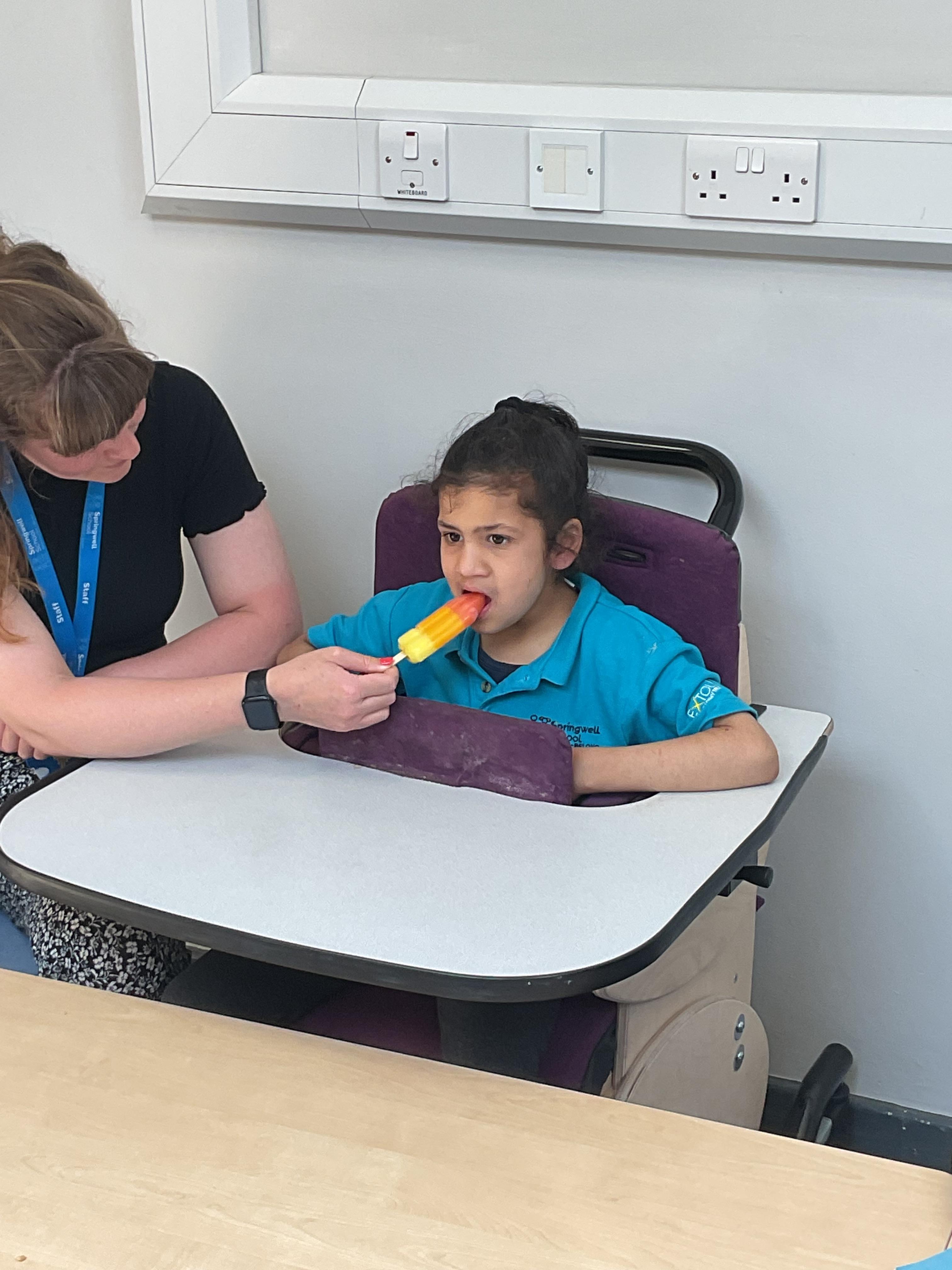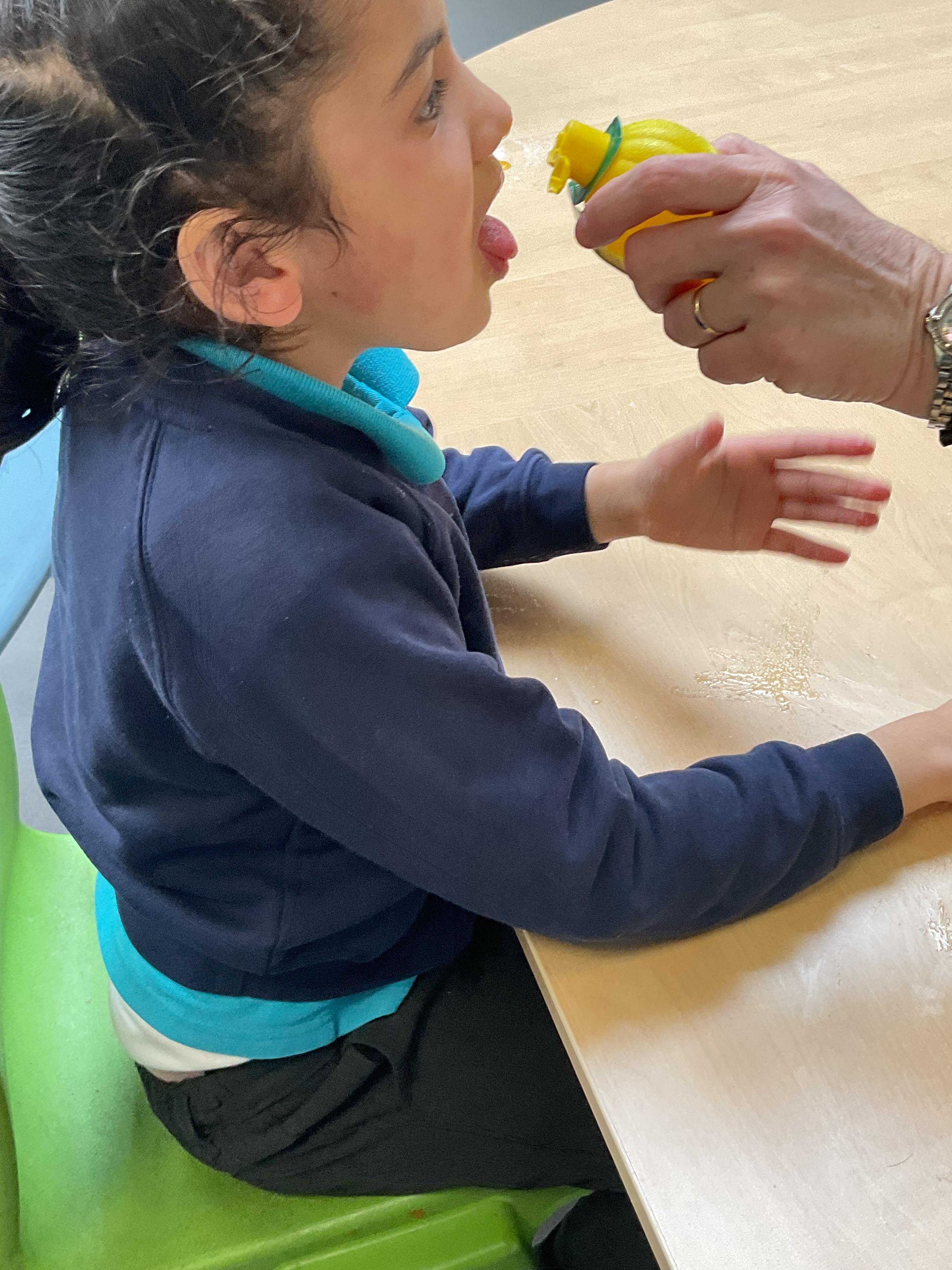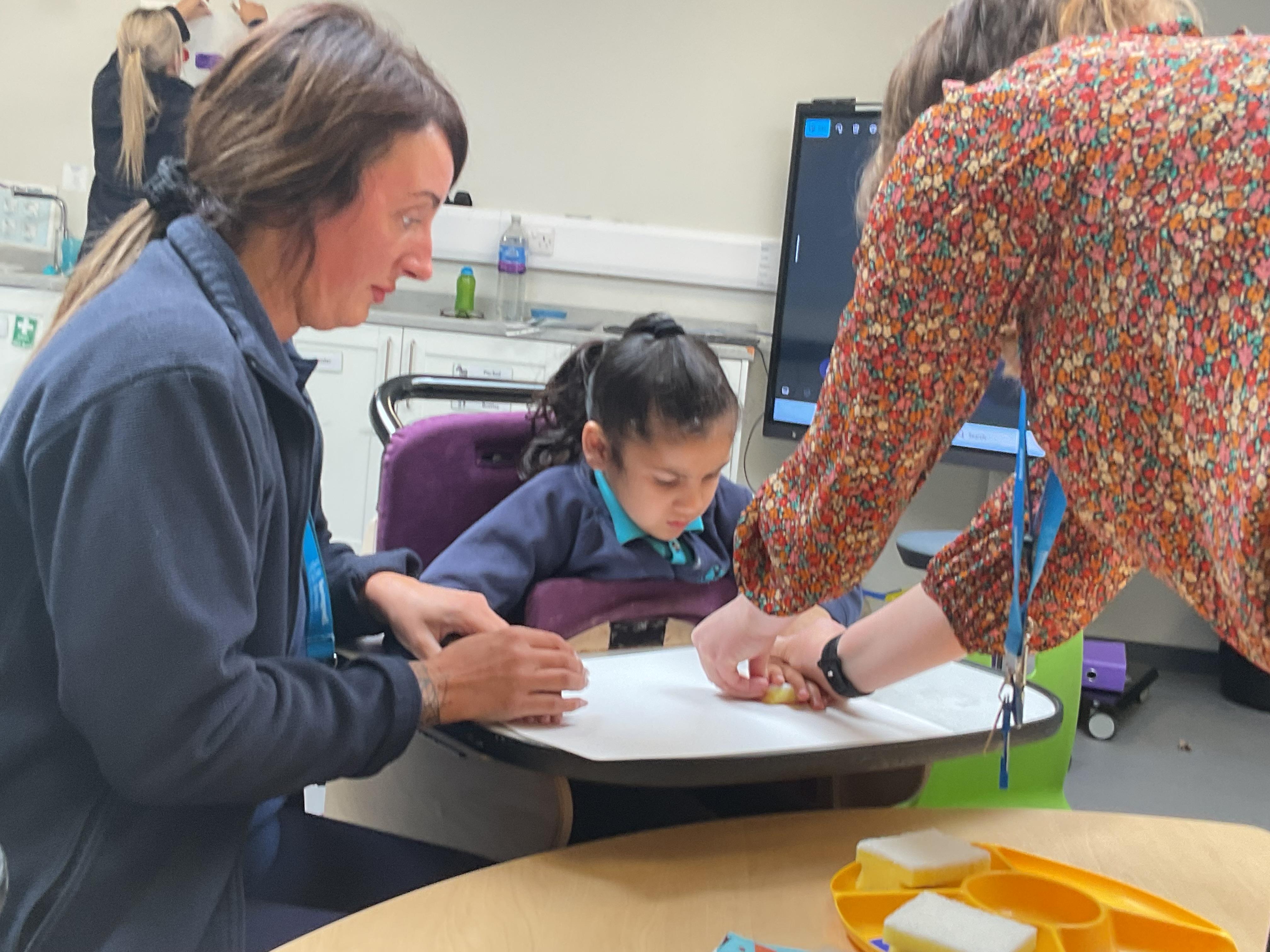 This week in Zebra Class we have made the most of sunshine and got out of the classroom a lot. We have enjoyed lots of water play and exploring in the community. We walked to Lidl and bought some ice lollies for us to enjoy for our snacks. Working on our fine motor skills, we practised cutting, making marks with our fingers and pens. Our colour of the week this week was green, we enjoyed using our senses to explore green foods. Some of us preferred tactile exploring over tasting! All of the children in Zebras really enjoy Attention Time, we are trying really hard to develop and prolong our interest in objects and tracking skills. One of our favourite things to track is bubbles!