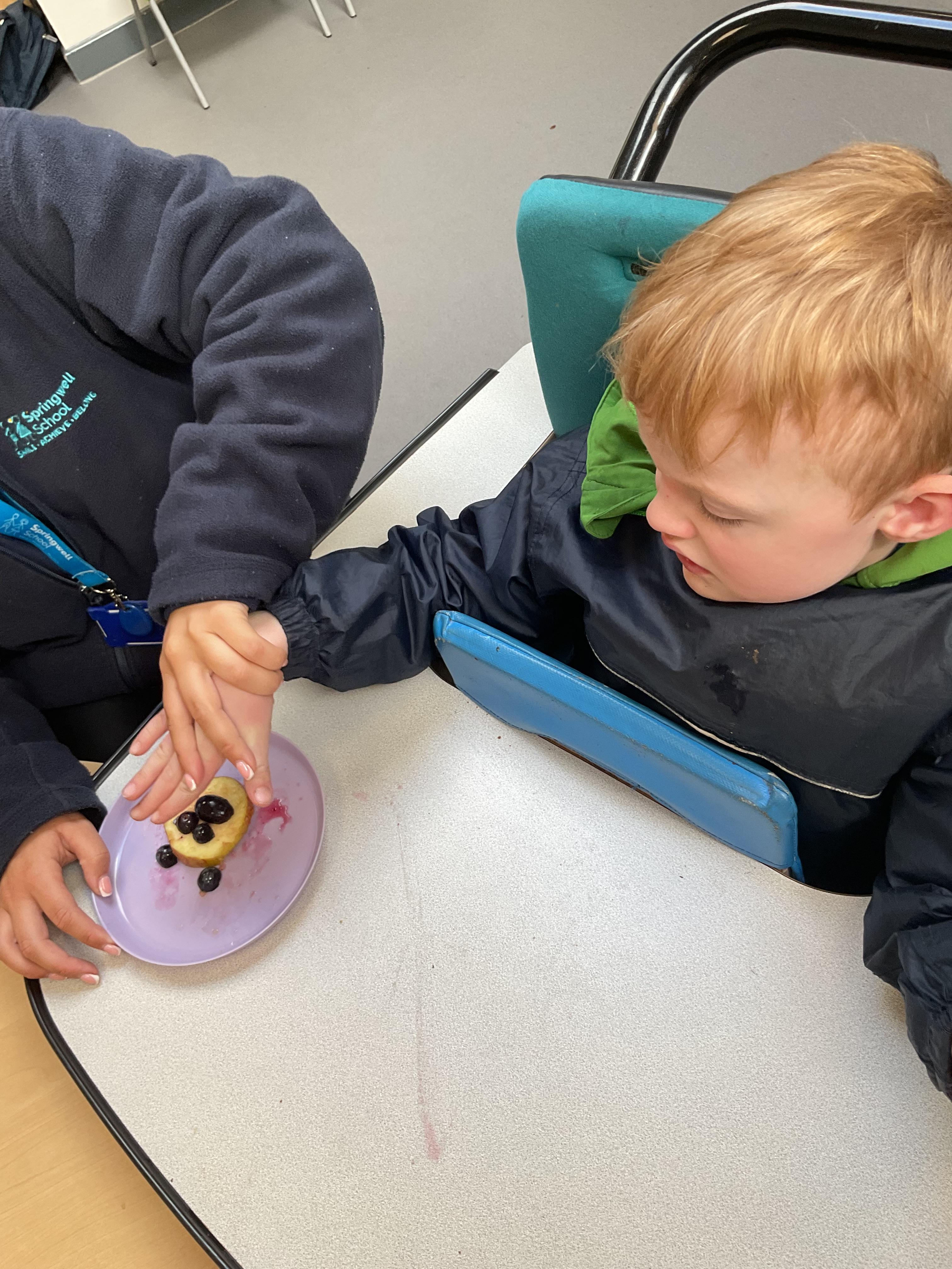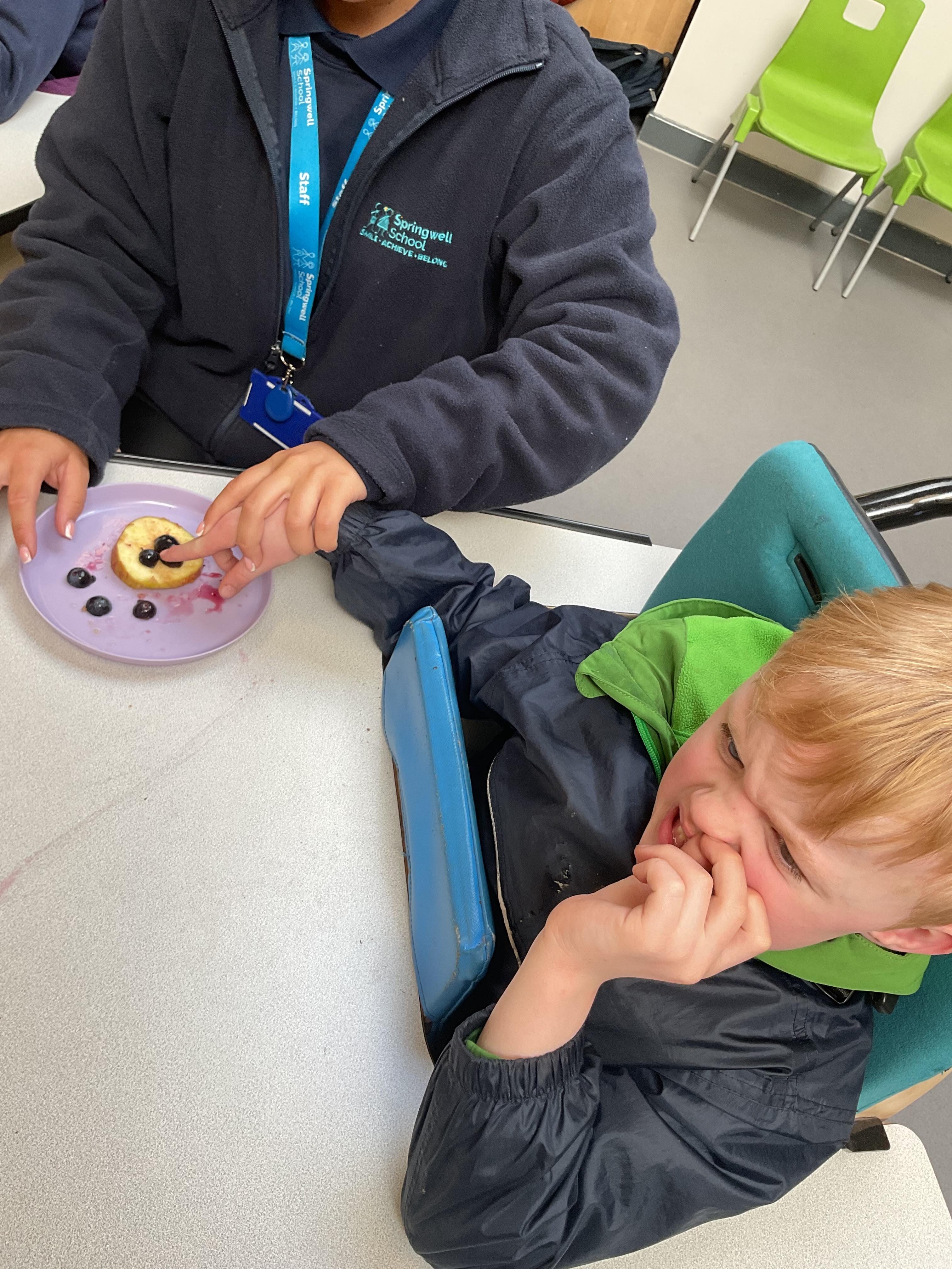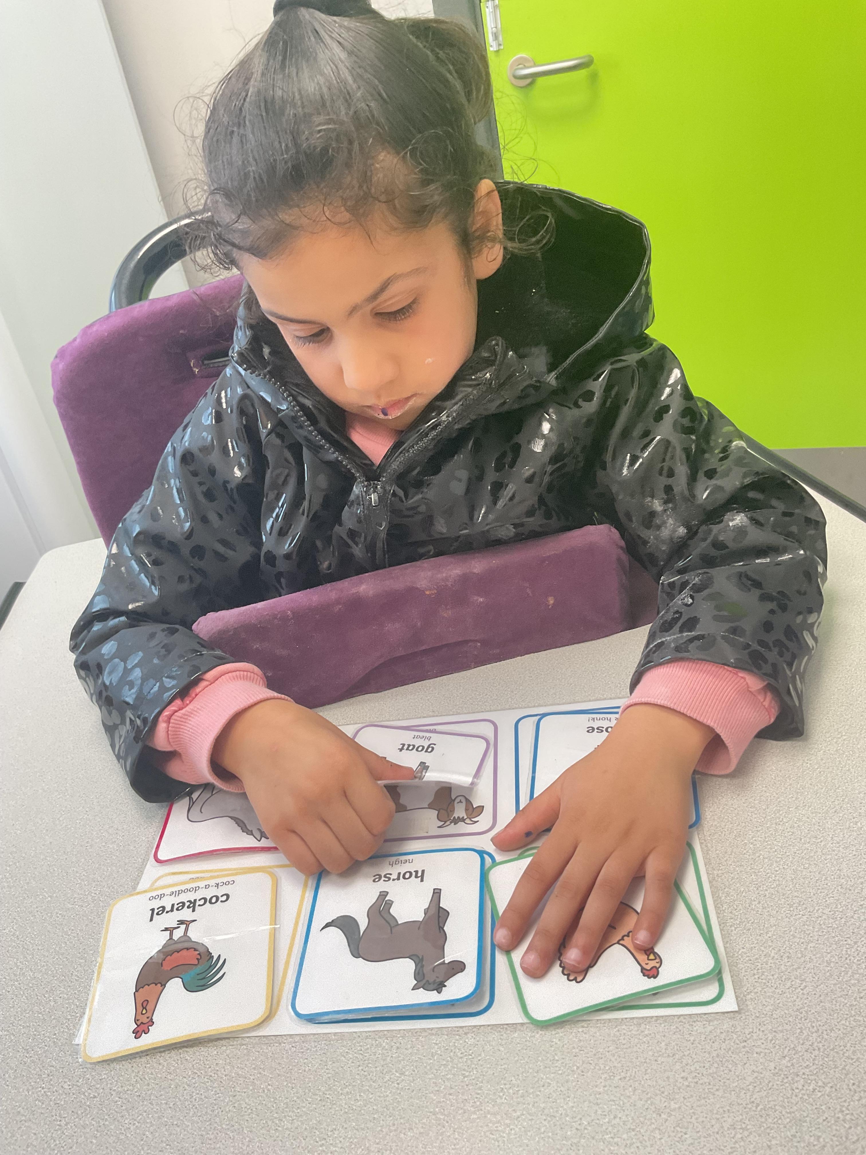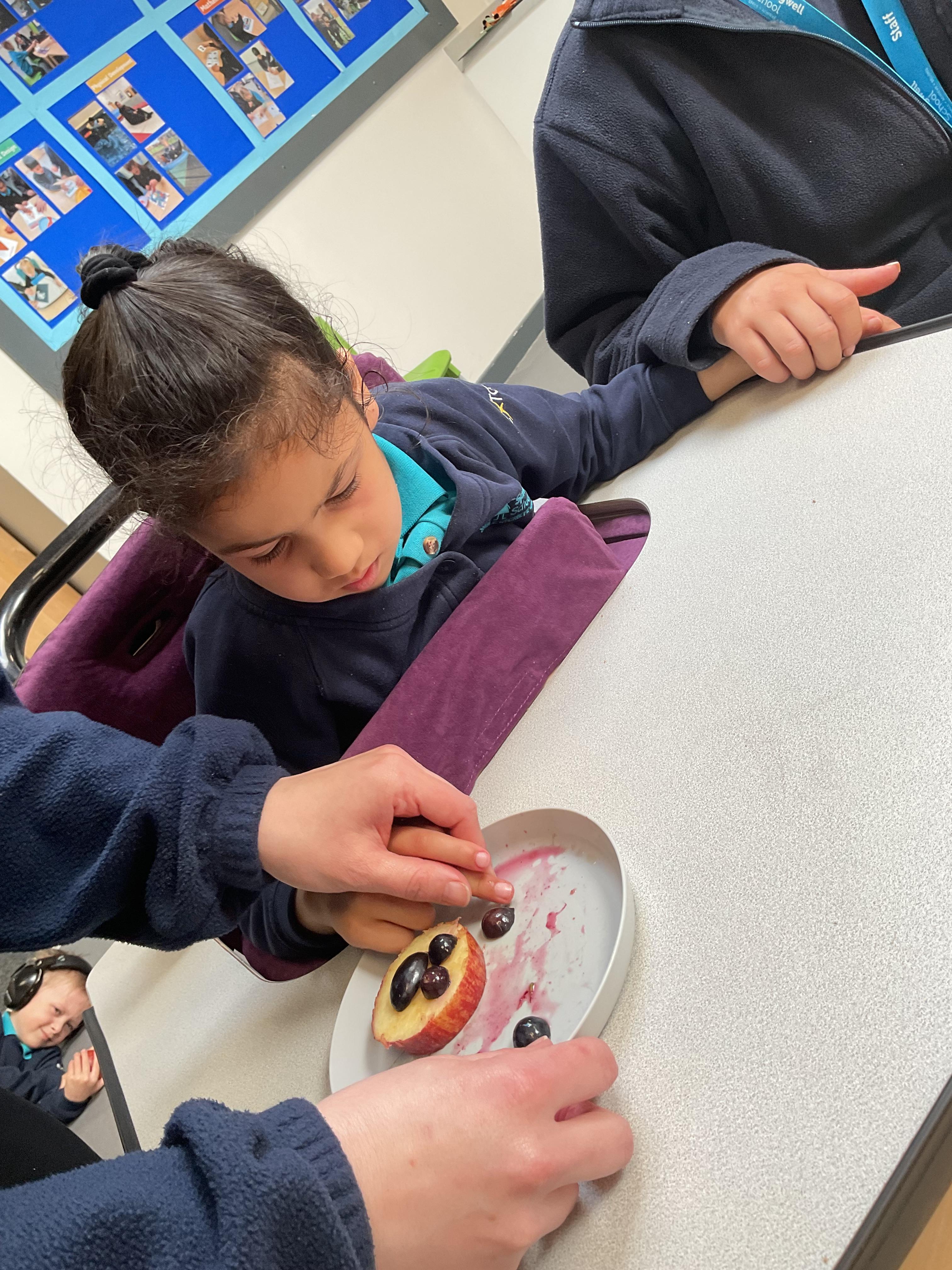 This week was wonderful for the Zebras! We started with art, where children used two different PECs cards to communicate their preferred colour of pen for mark-making. Each child then worked on their fine motor skills by colouring their little uniform character for our new school display. Great job, Zebras! Later, we ventured into the garden for some sensory play, we practised our pouring skills by transferring oats from one cup to another and picking up pasta with tweezers. In maths, we worked on our number recognition by matching the numbers 1-6. In our cooking session, we prepared some delicious and healthy snacks. We began by selecting our favourite fruits and chopping them up. We carefully observed as the yogurt was poured into the tin and then we added the different fruits before freezing the mixture to create fruit ice cream. At snack time, we used PECs symbols to communicate which fruit we wanted to try and it was scrumptious. In literacy, we continued our sensory story “A Train Ride through India”. We engaged with the props, smelt different spices and even listened to the sound of the train. On Thursday, we hopped on the bus to visit Tweddle Farm, where we enjoyed looking at various animals. Our favourite were the chickens! Afterwards, we gathered into the barn to read the story “Chicken Licken”. We finished the week with an exciting but messy attention autism session, where we cracked eggs on the floor and watched a dancing chicken.