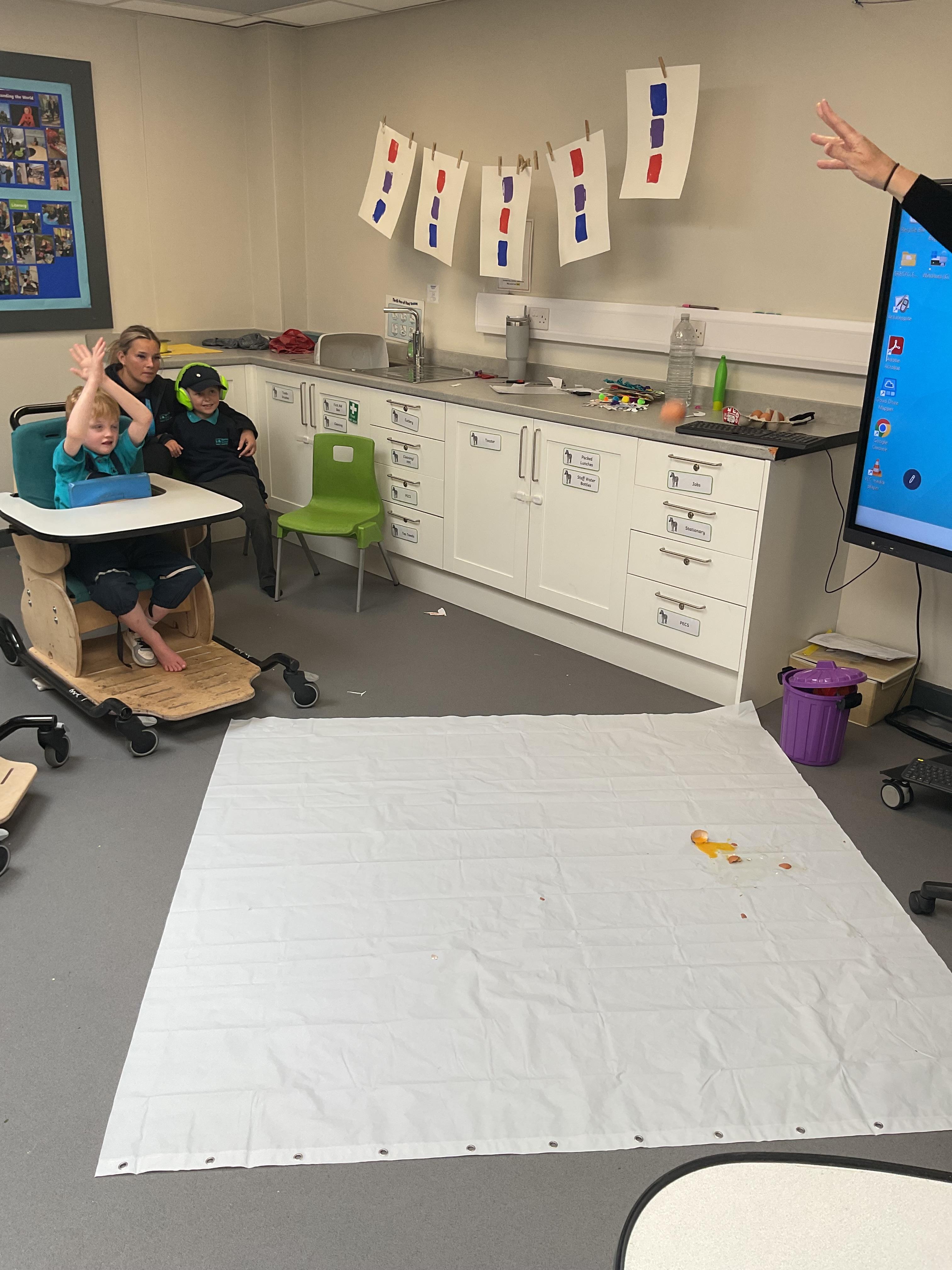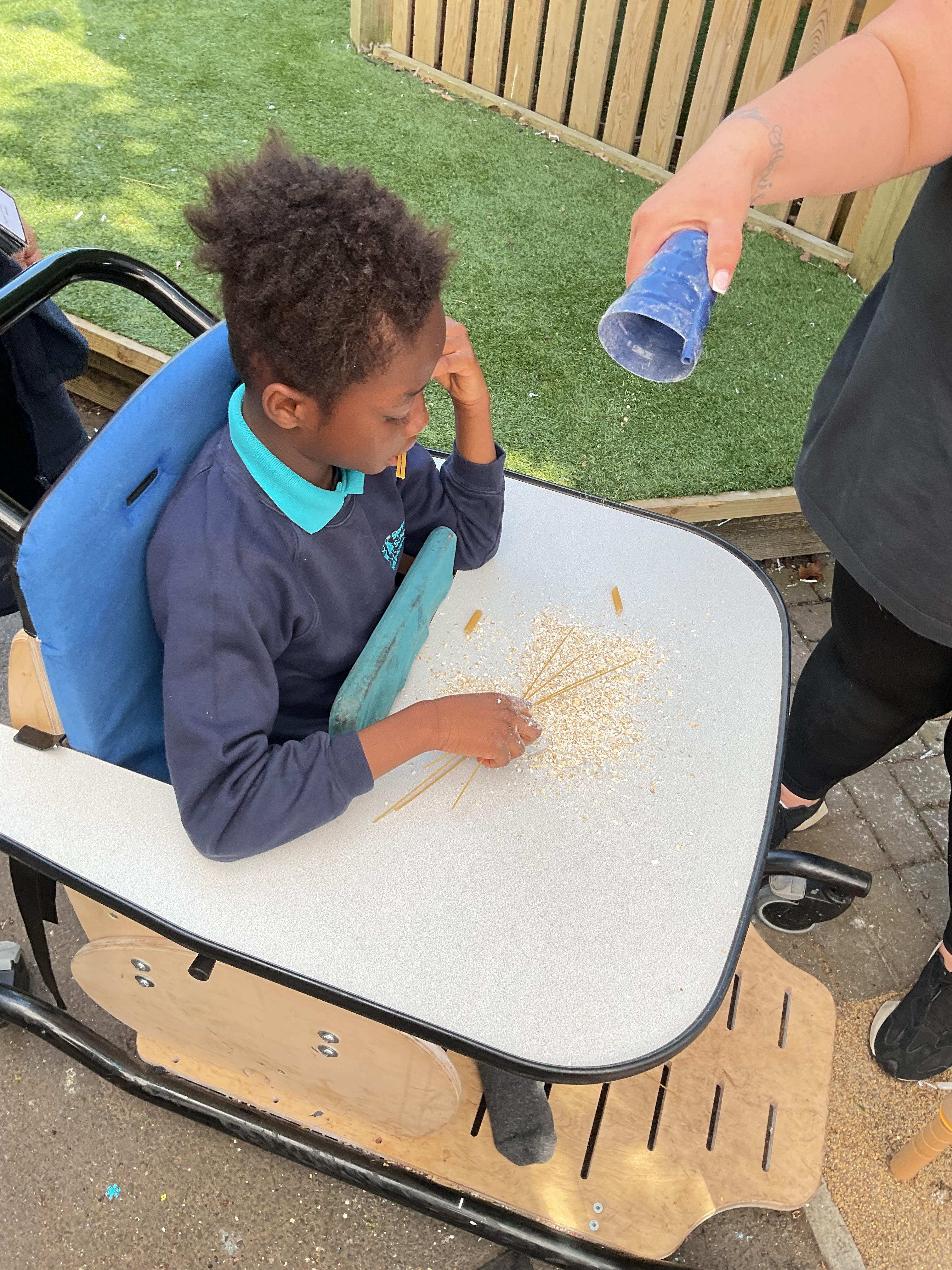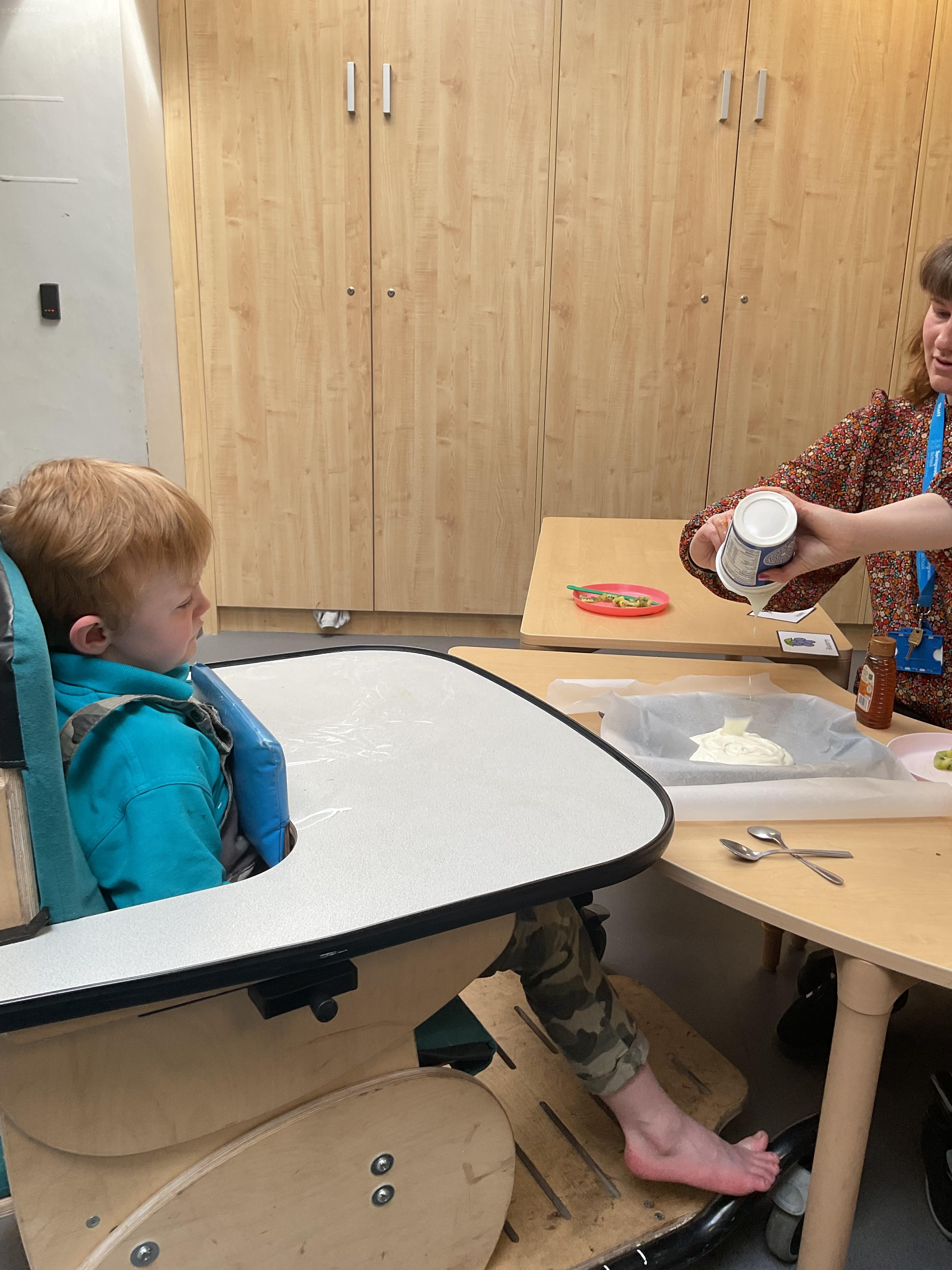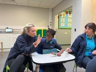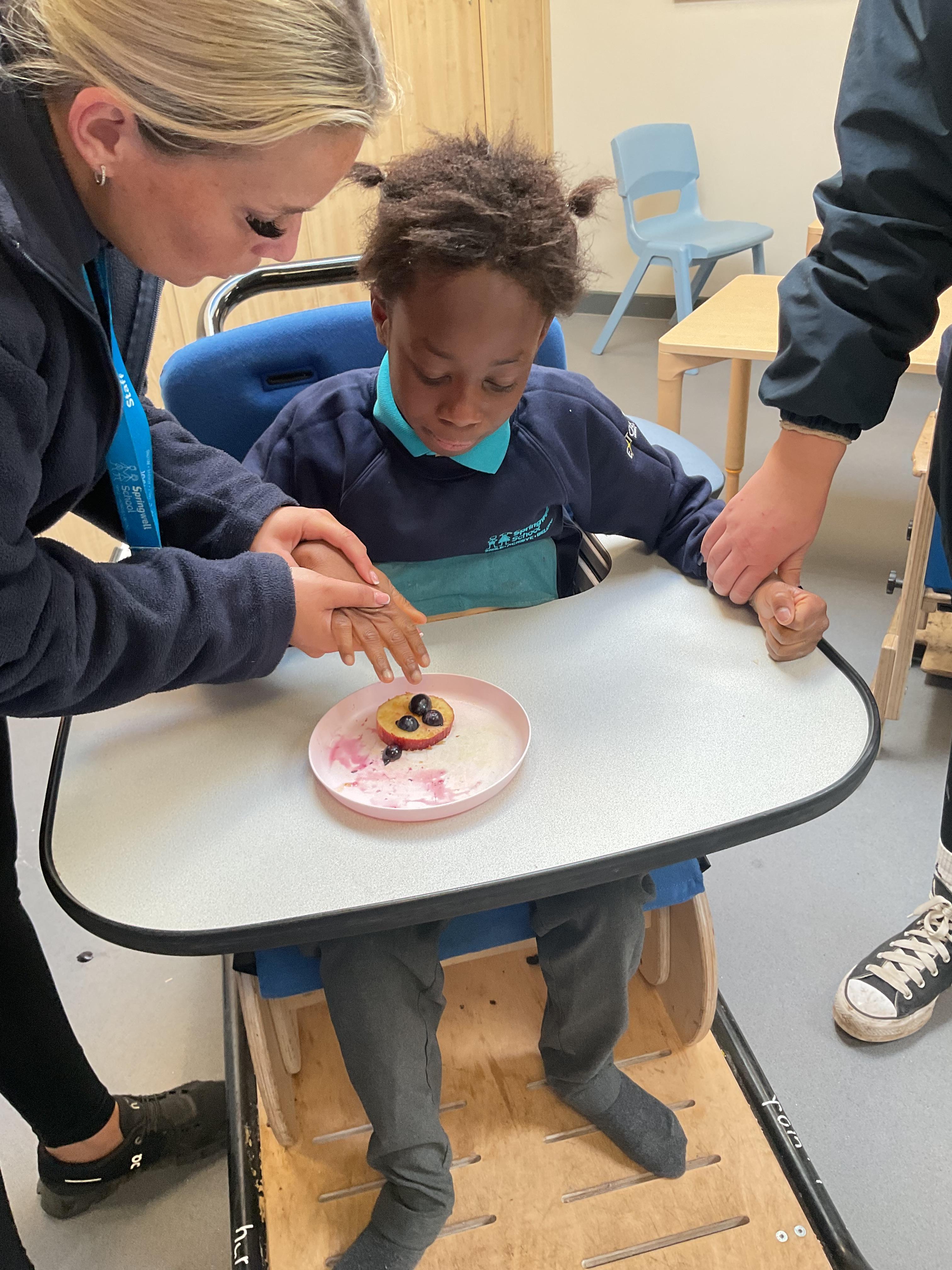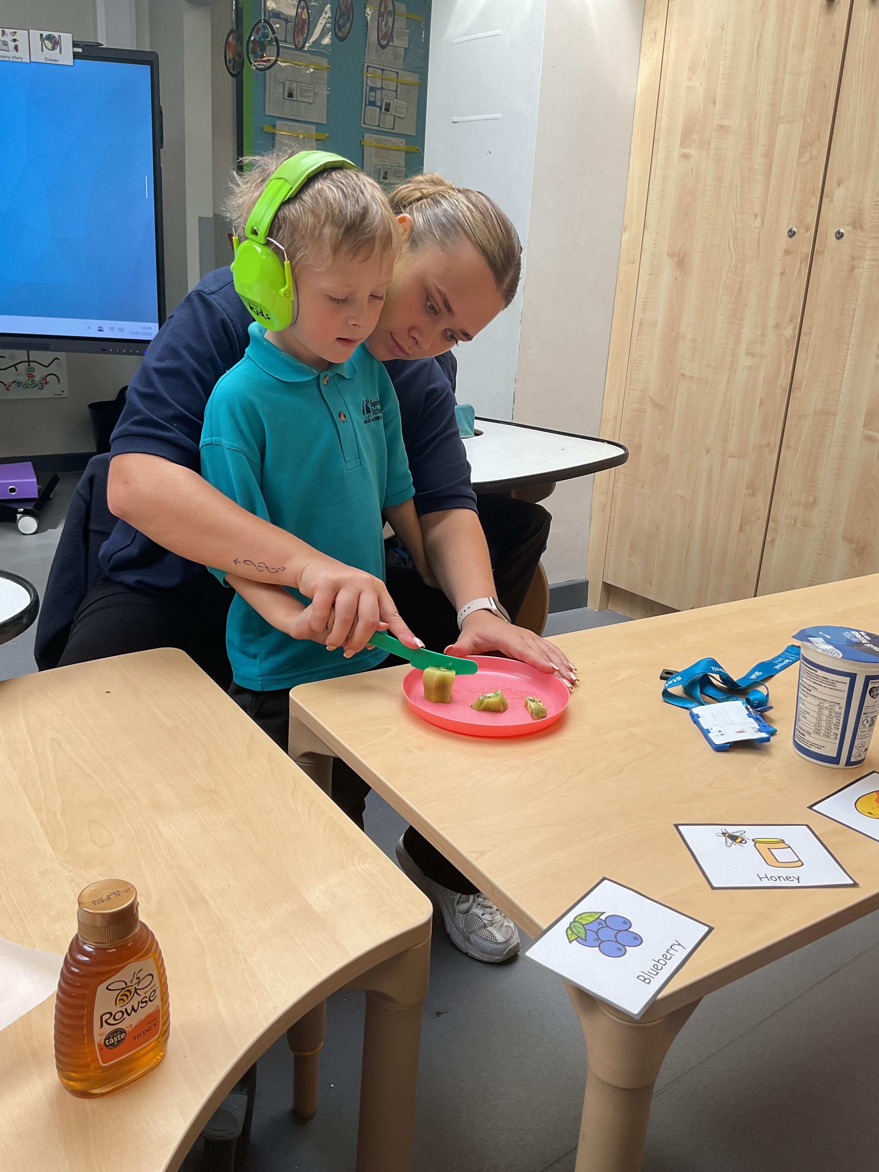 This week was wonderful for the Zebras! We started with art, where children used two different PECs cards to communicate their preferred colour of pen for mark-making. Each child then worked on their fine motor skills by colouring their little uniform character for our new school display. Great job, Zebras! Later, we ventured into the garden for some sensory play, we practised our pouring skills by transferring oats from one cup to another and picking up pasta with tweezers. In maths, we worked on our number recognition by matching the numbers 1-6. In our cooking session, we prepared some delicious and healthy snacks. We began by selecting our favourite fruits and chopping them up. We carefully observed as the yogurt was poured into the tin and then we added the different fruits before freezing the mixture to create fruit ice cream. At snack time, we used PECs symbols to communicate which fruit we wanted to try and it was scrumptious. In literacy, we continued our sensory story “A Train Ride through India”. We engaged with the props, smelt different spices and even listened to the sound of the train. On Thursday, we hopped on the bus to visit Tweddle Farm, where we enjoyed looking at various animals. Our favourite were the chickens! Afterwards, we gathered into the barn to read the story “Chicken Licken”. We finished the week with an exciting but messy attention autism session, where we cracked eggs on the floor and watched a dancing chicken.