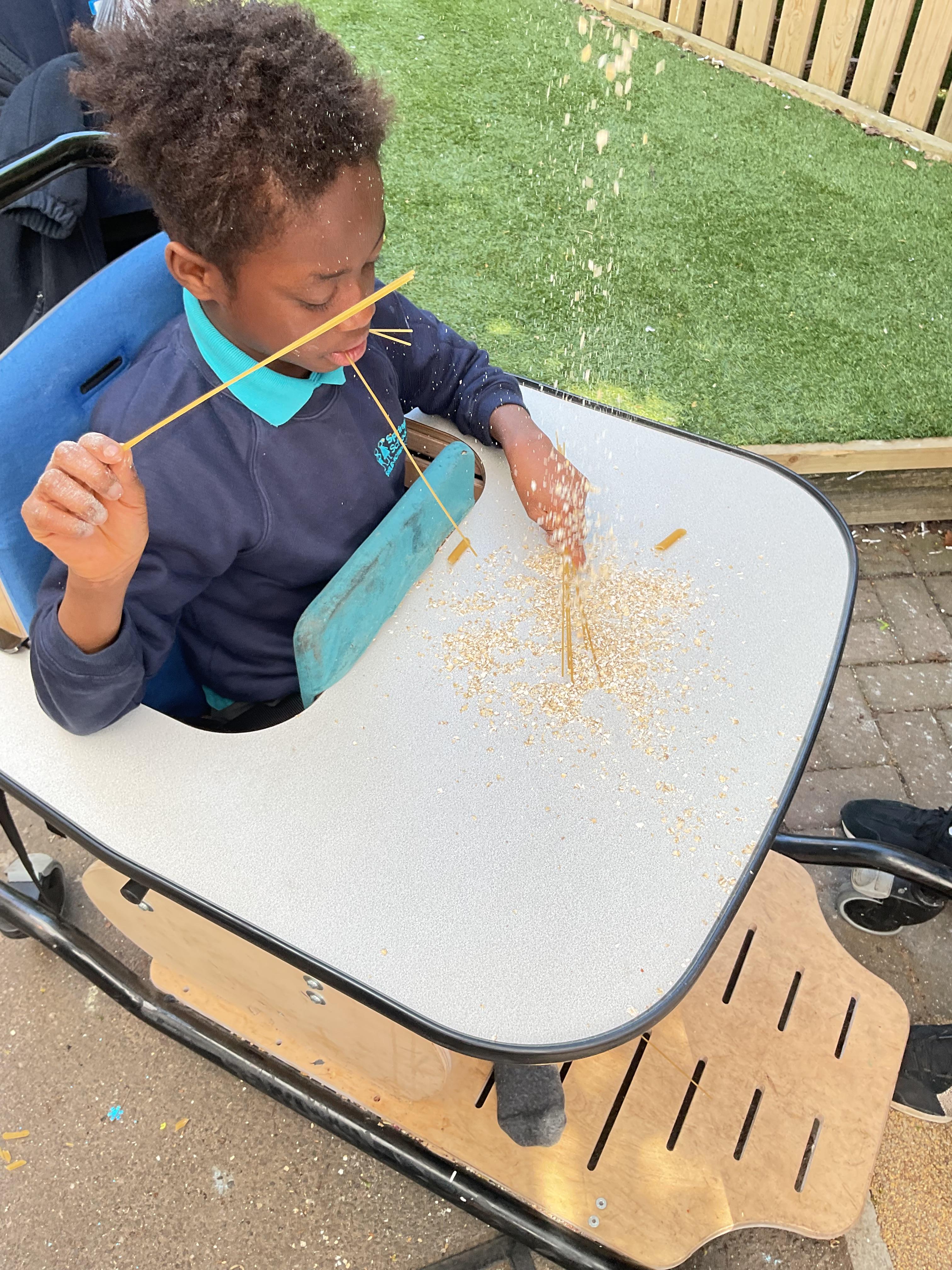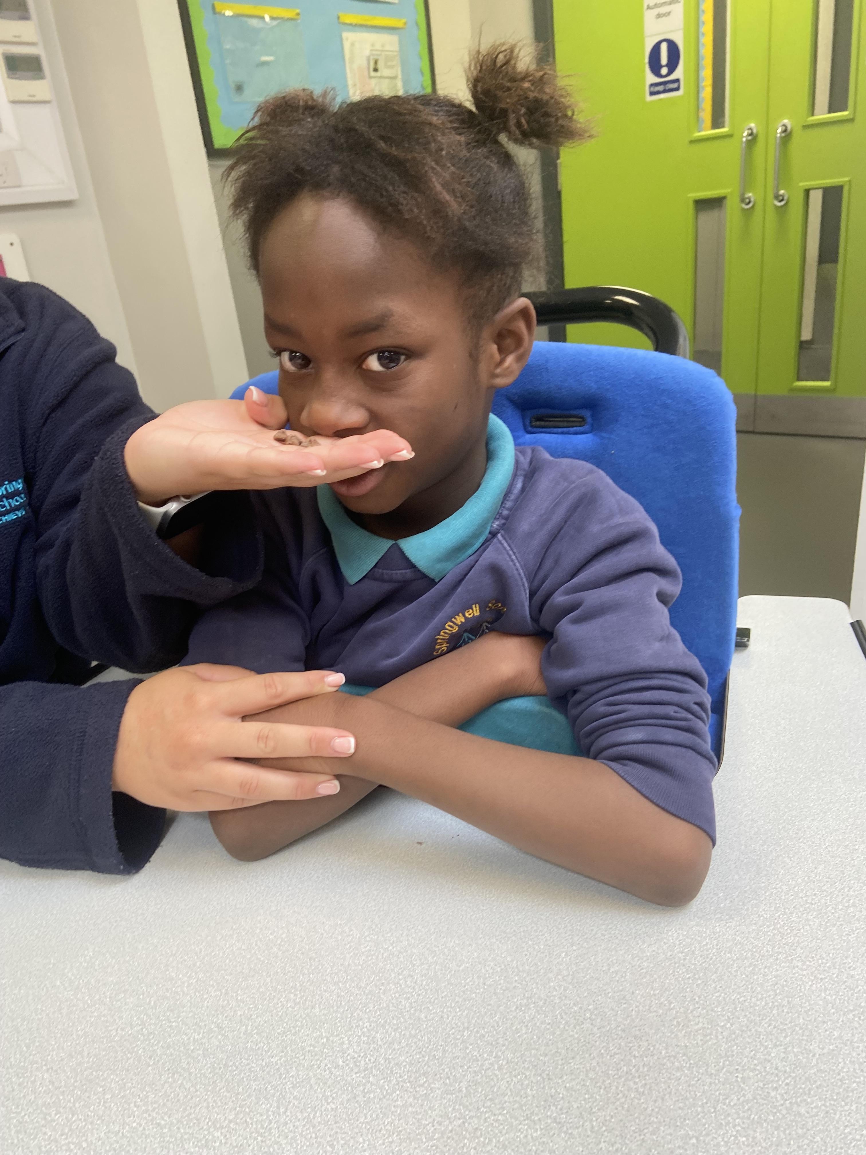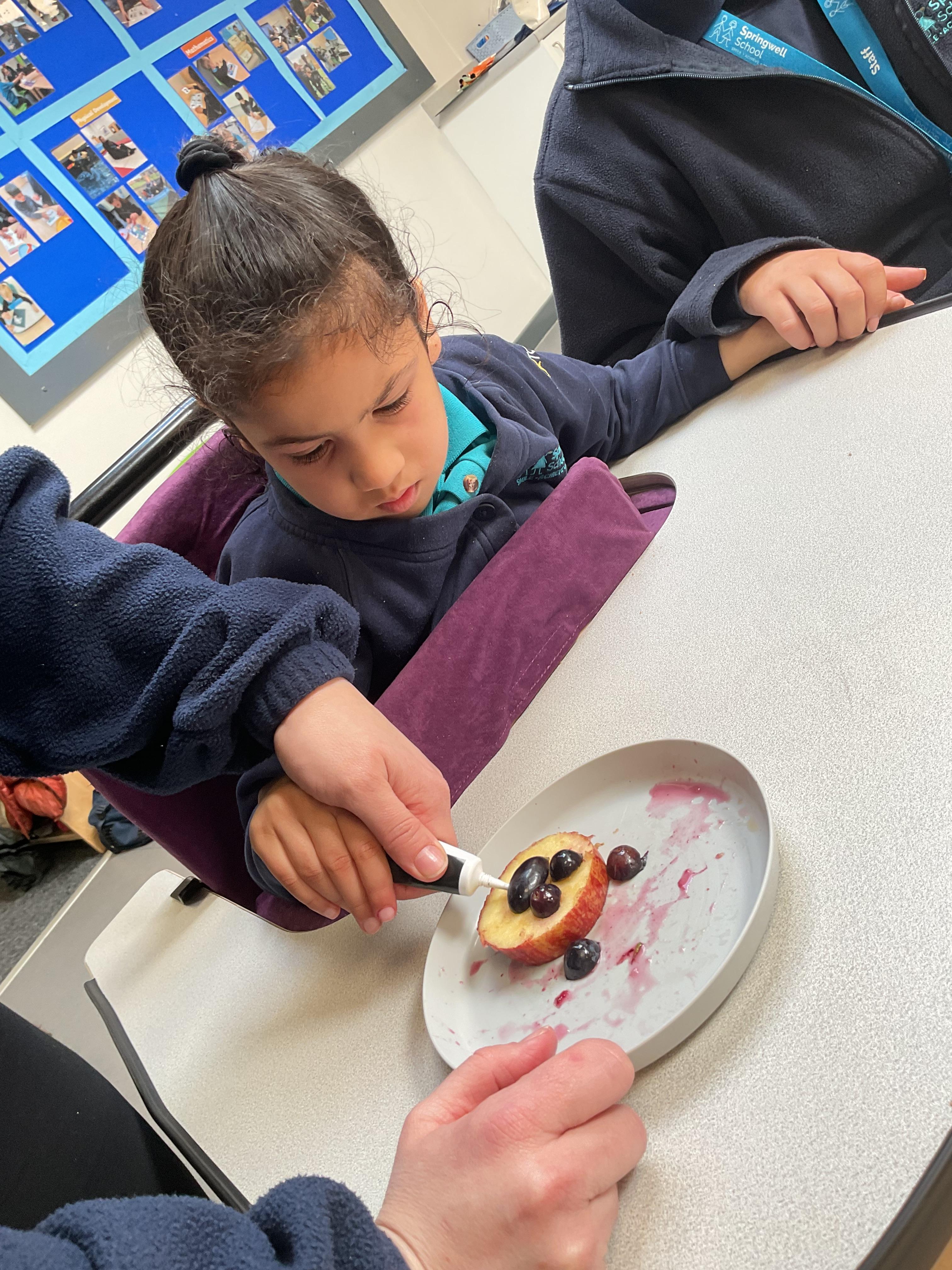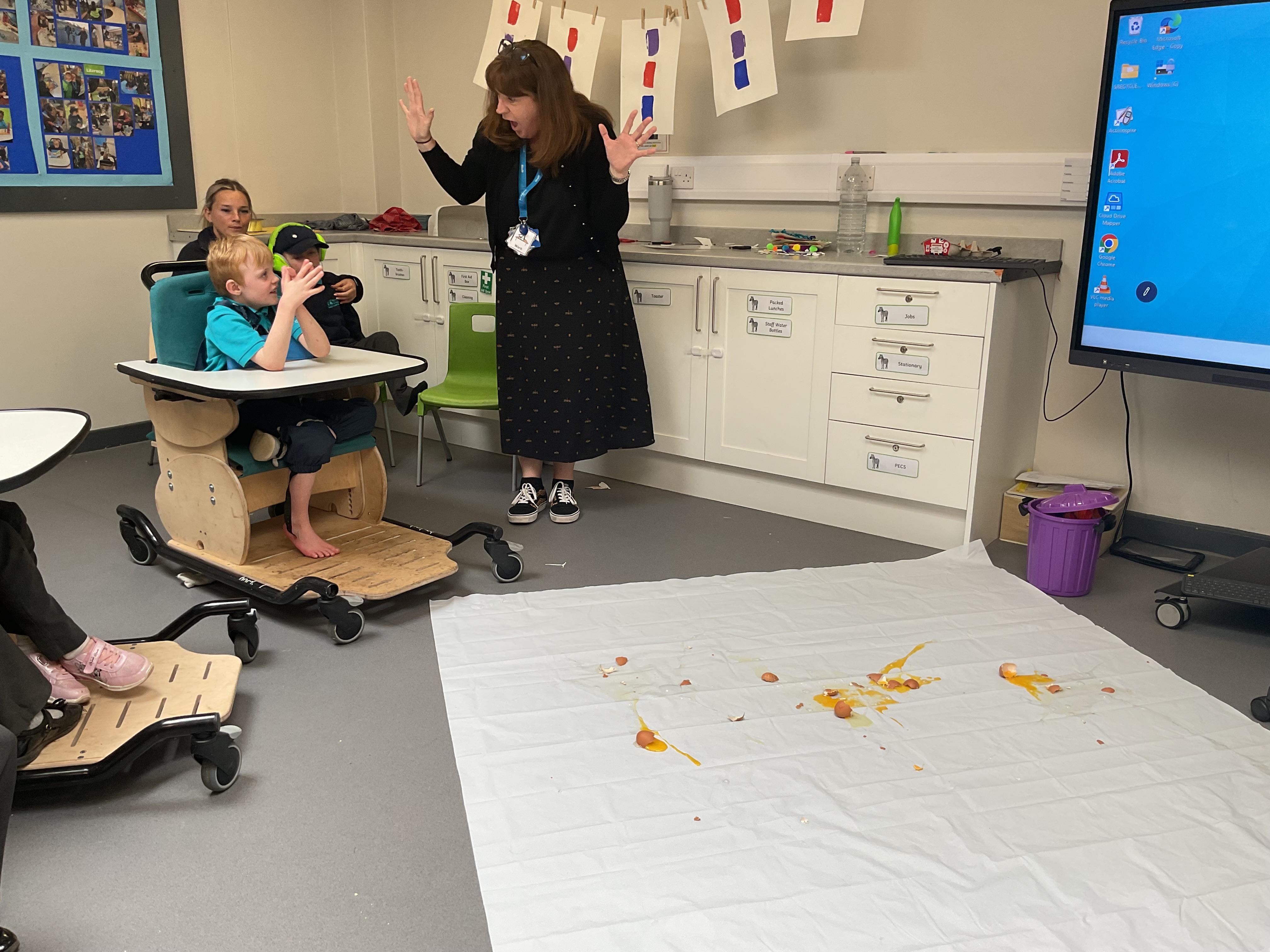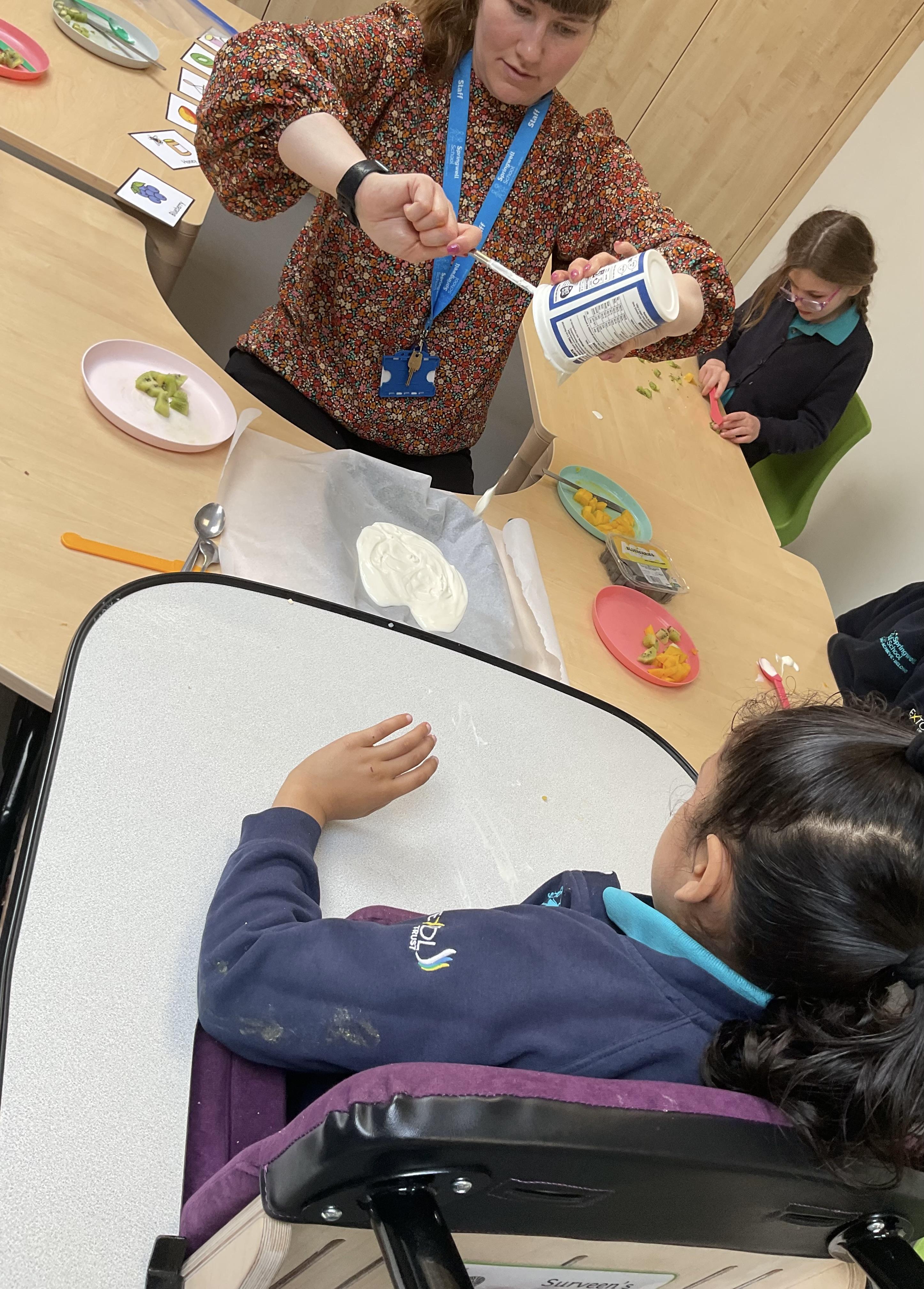 This week was wonderful for the Zebras! We started with art, where children used two different PECs cards to communicate their preferred colour of pen for mark-making. Each child then worked on their fine motor skills by colouring their little uniform character for our new school display. Great job, Zebras! Later, we ventured into the garden for some sensory play, we practised our pouring skills by transferring oats from one cup to another and picking up pasta with tweezers. In maths, we worked on our number recognition by matching the numbers 1-6. In our cooking session, we prepared some delicious and healthy snacks. We began by selecting our favourite fruits and chopping them up. We carefully observed as the yogurt was poured into the tin and then we added the different fruits before freezing the mixture to create fruit ice cream. At snack time, we used PECs symbols to communicate which fruit we wanted to try and it was scrumptious. In literacy, we continued our sensory story “A Train Ride through India”. We engaged with the props, smelt different spices and even listened to the sound of the train. On Thursday, we hopped on the bus to visit Tweddle Farm, where we enjoyed looking at various animals. Our favourite were the chickens! Afterwards, we gathered into the barn to read the story “Chicken Licken”. We finished the week with an exciting but messy attention autism session, where we cracked eggs on the floor and watched a dancing chicken.