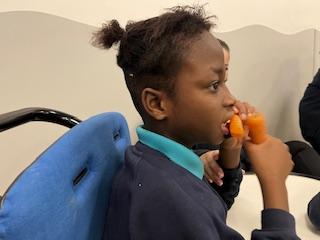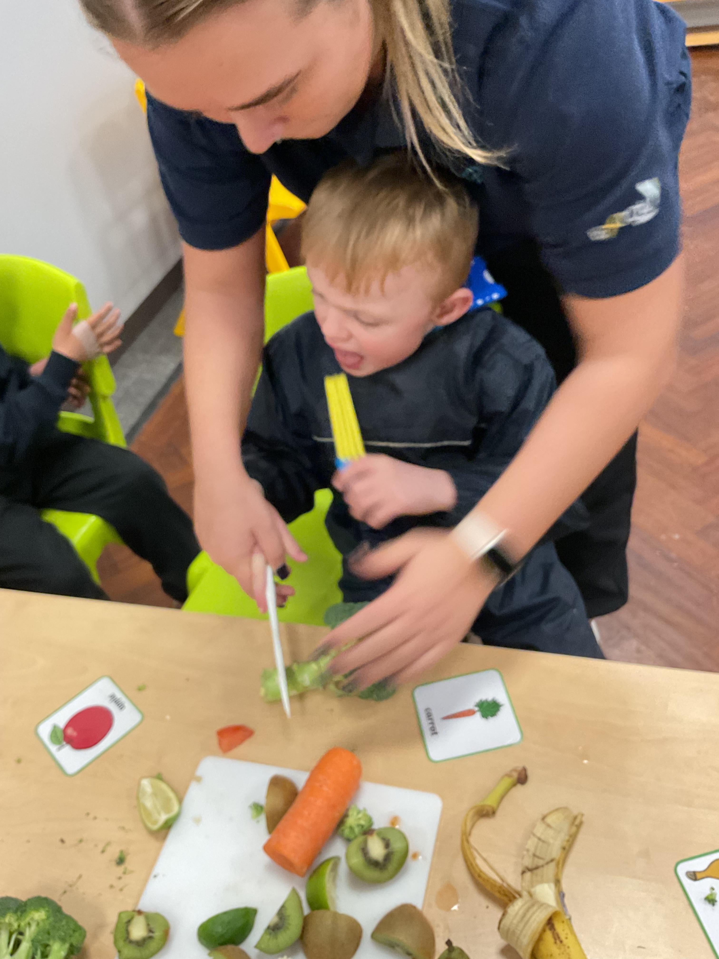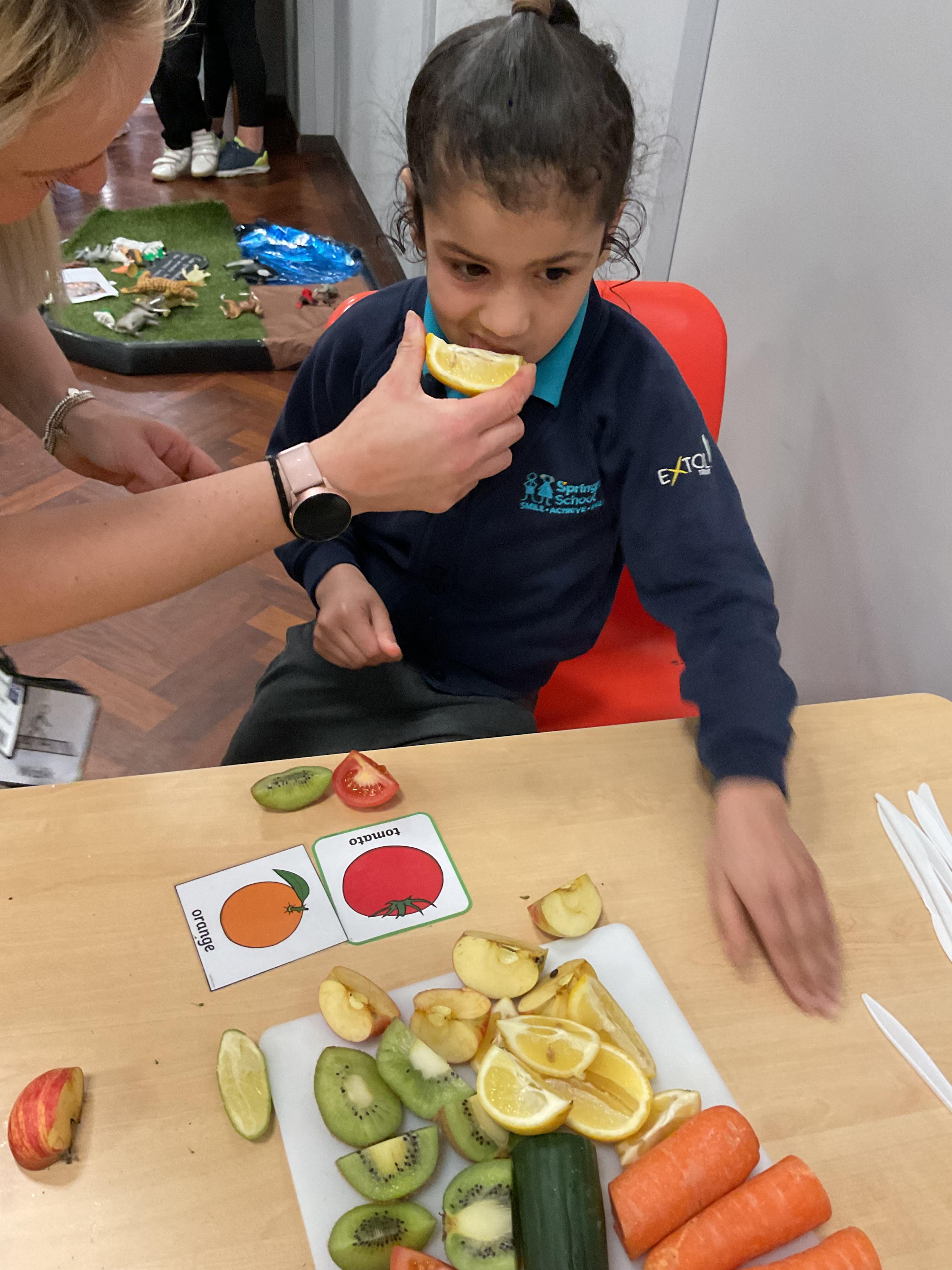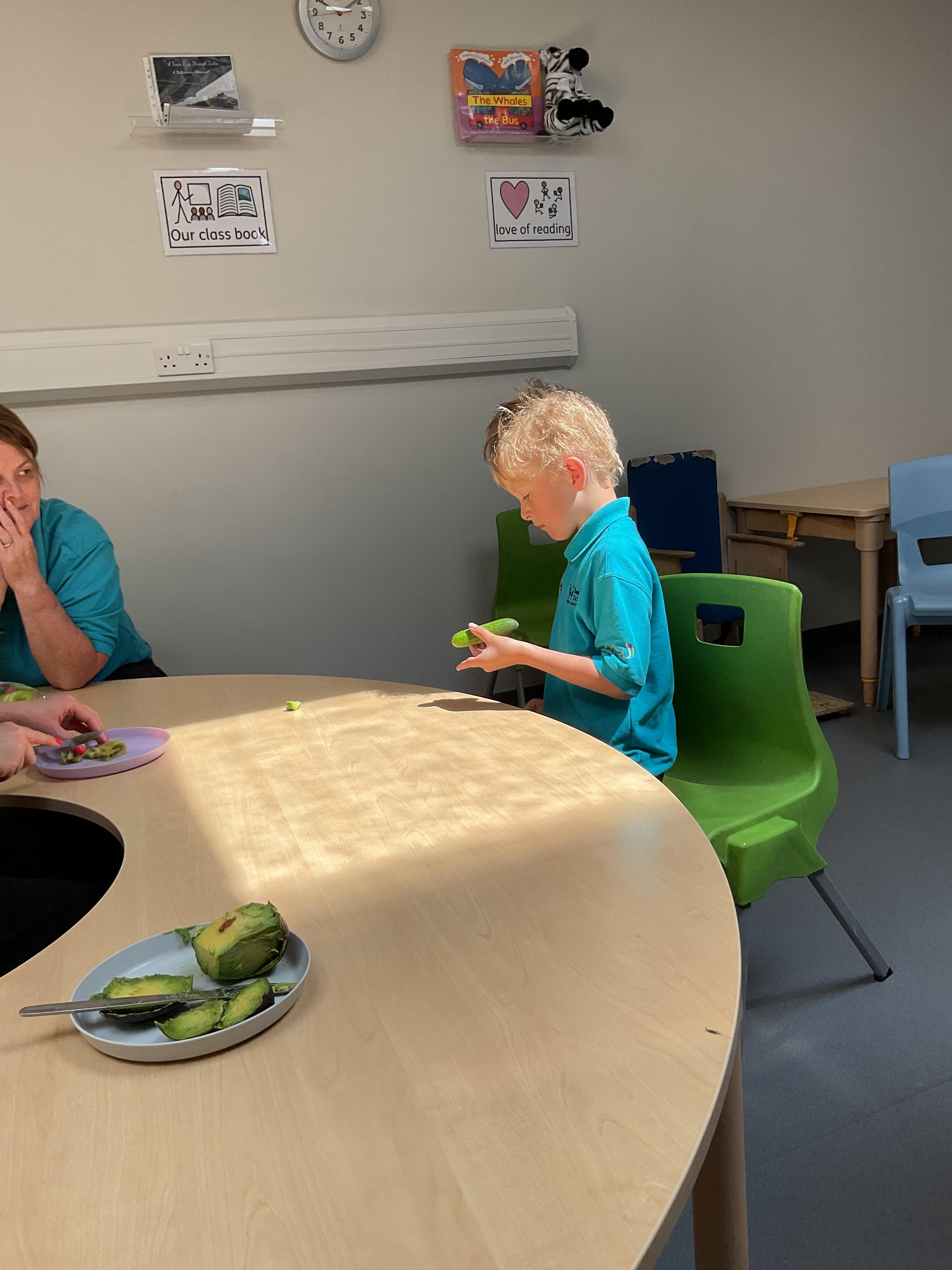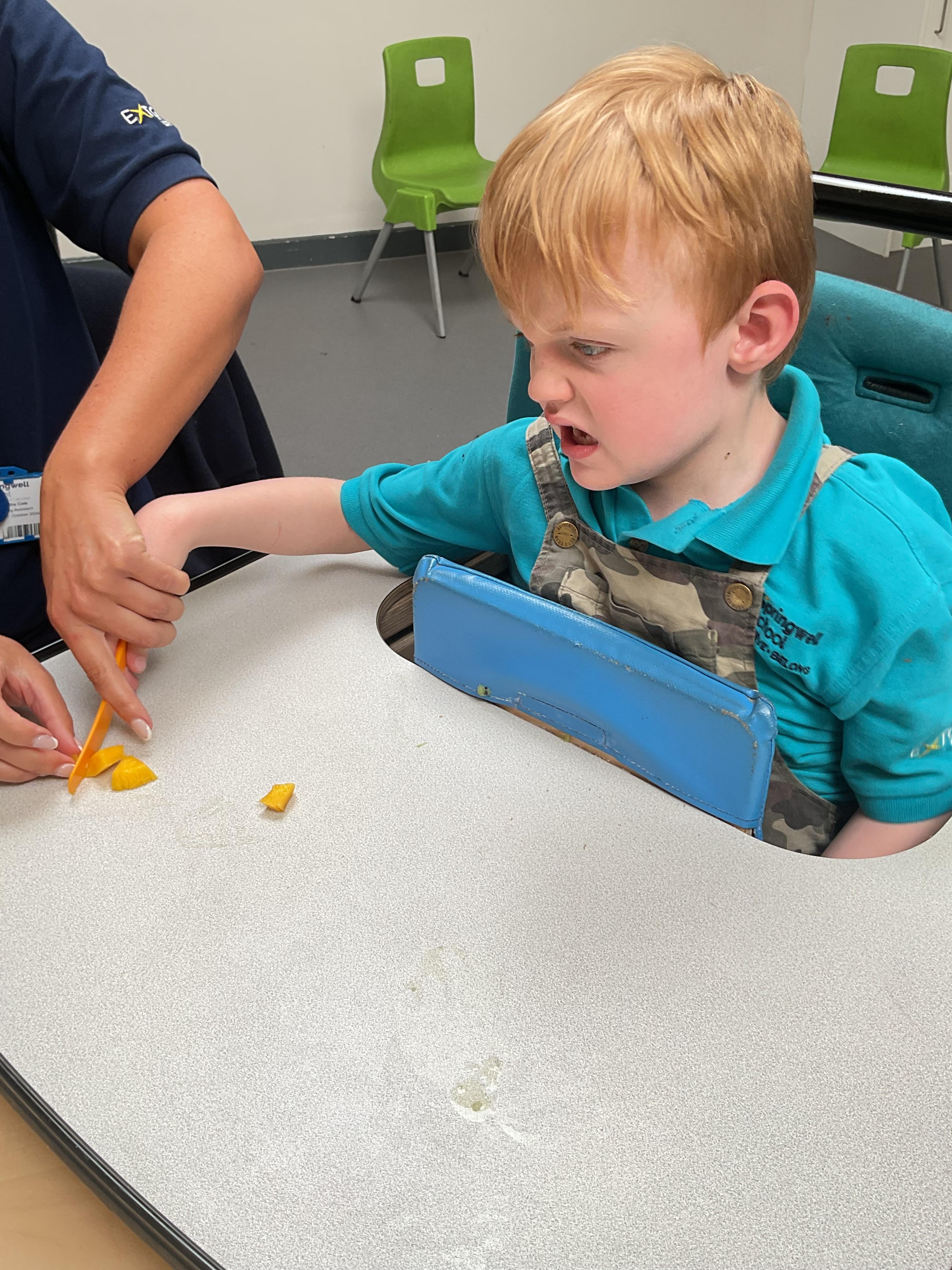 Today, it was our Wednesday assembly. We learnt the Makaton signs for lots of different types of food and then we tried to cut them up and taste them. Some of the vegetables we liked very much and some, we did not like at all!
