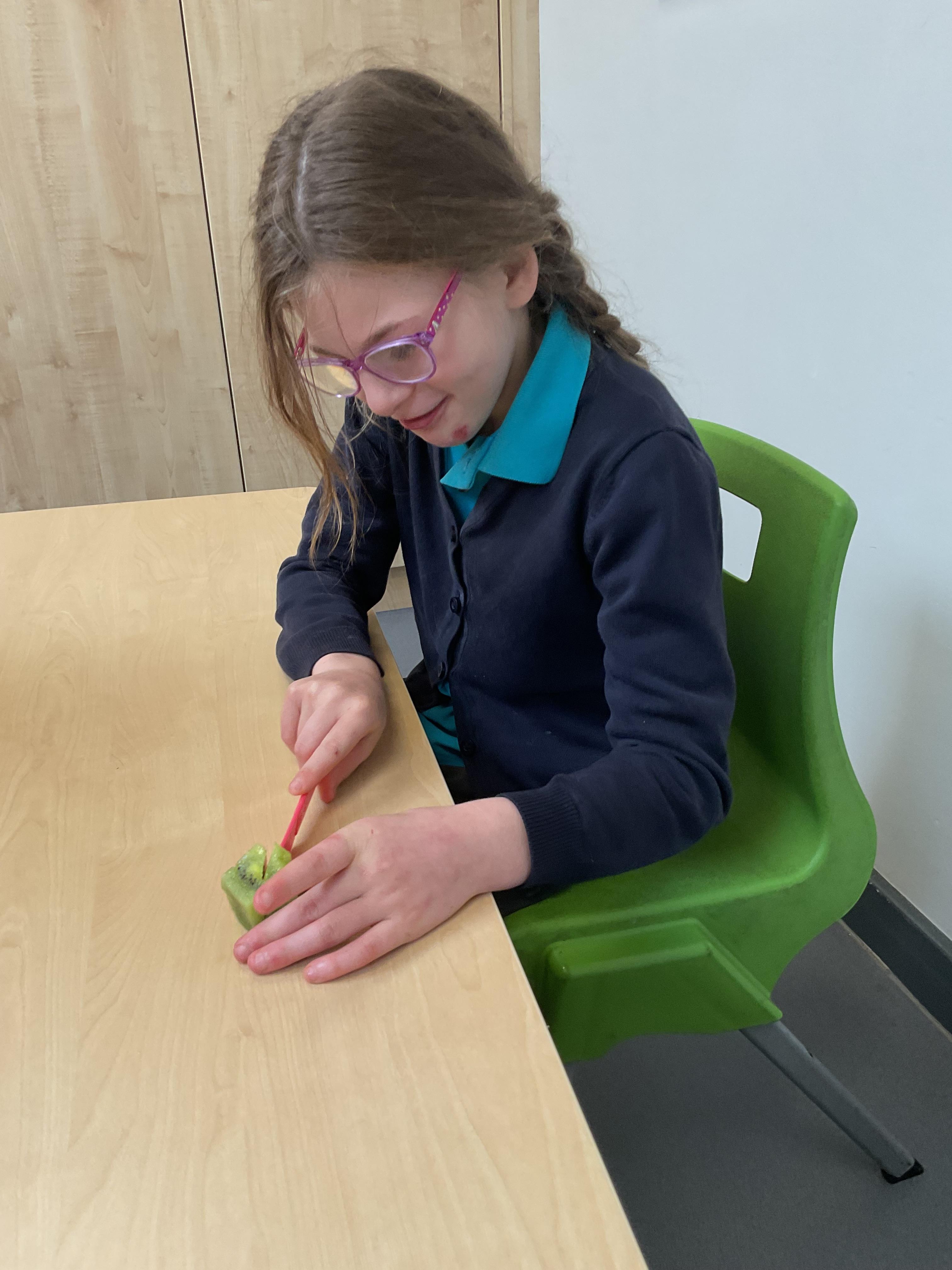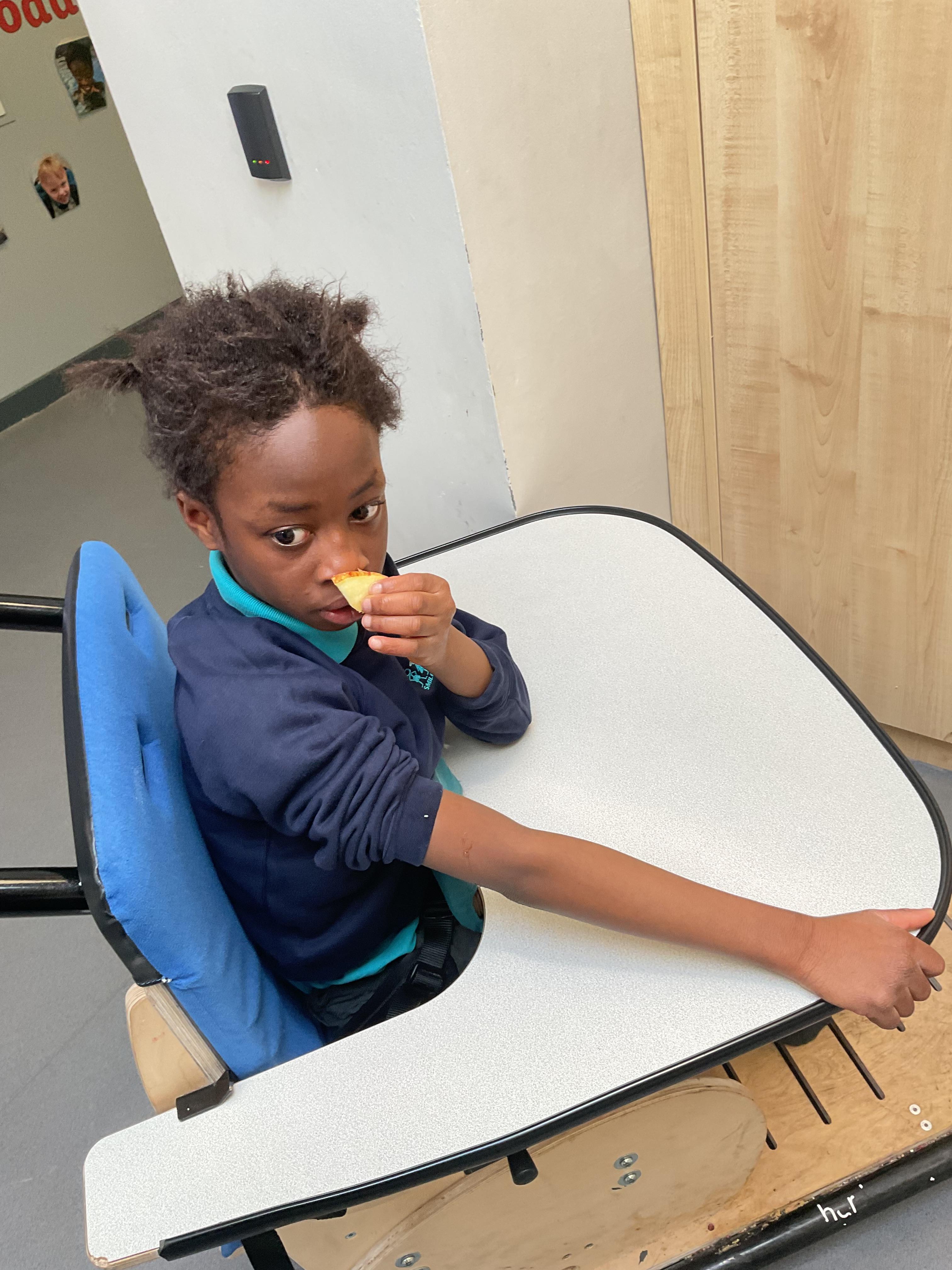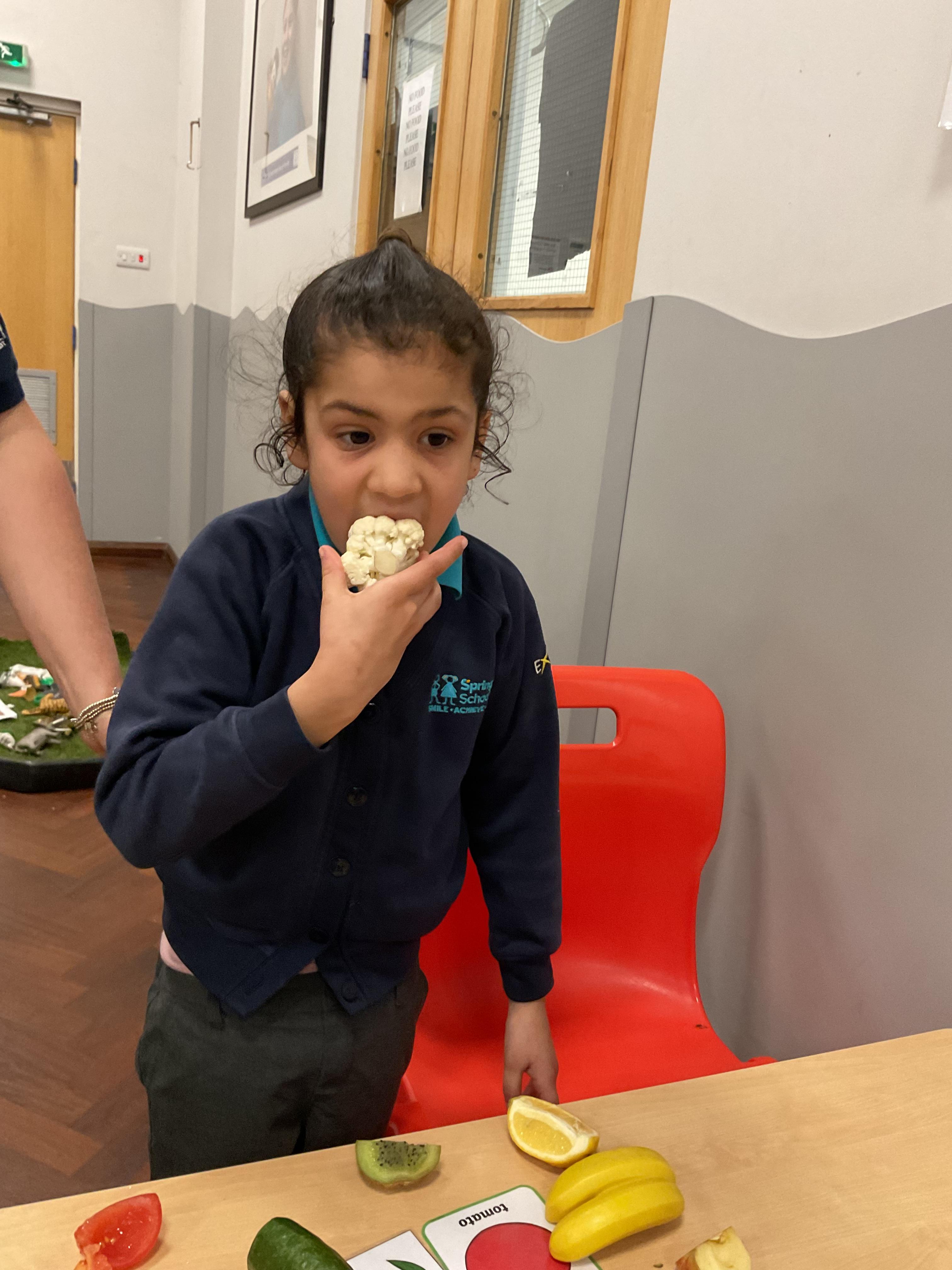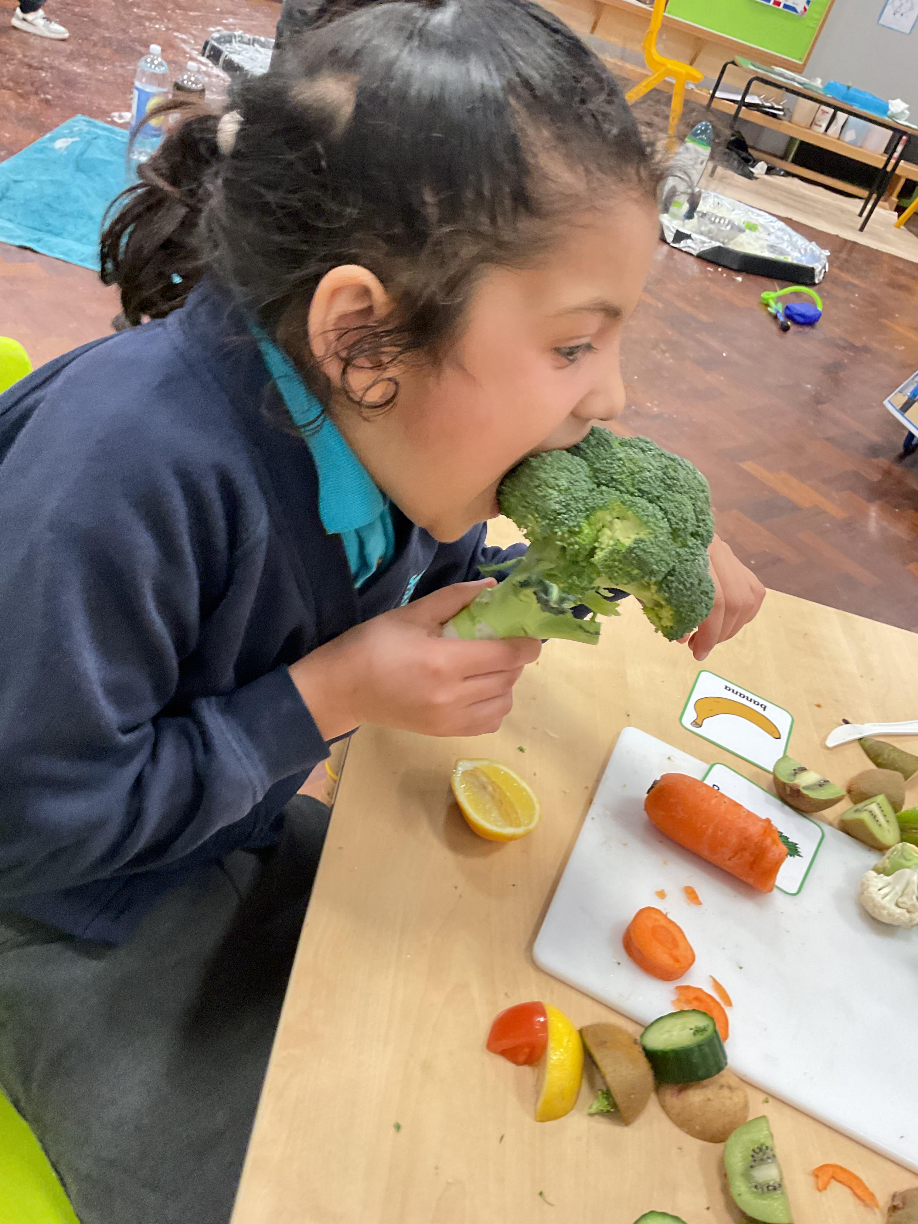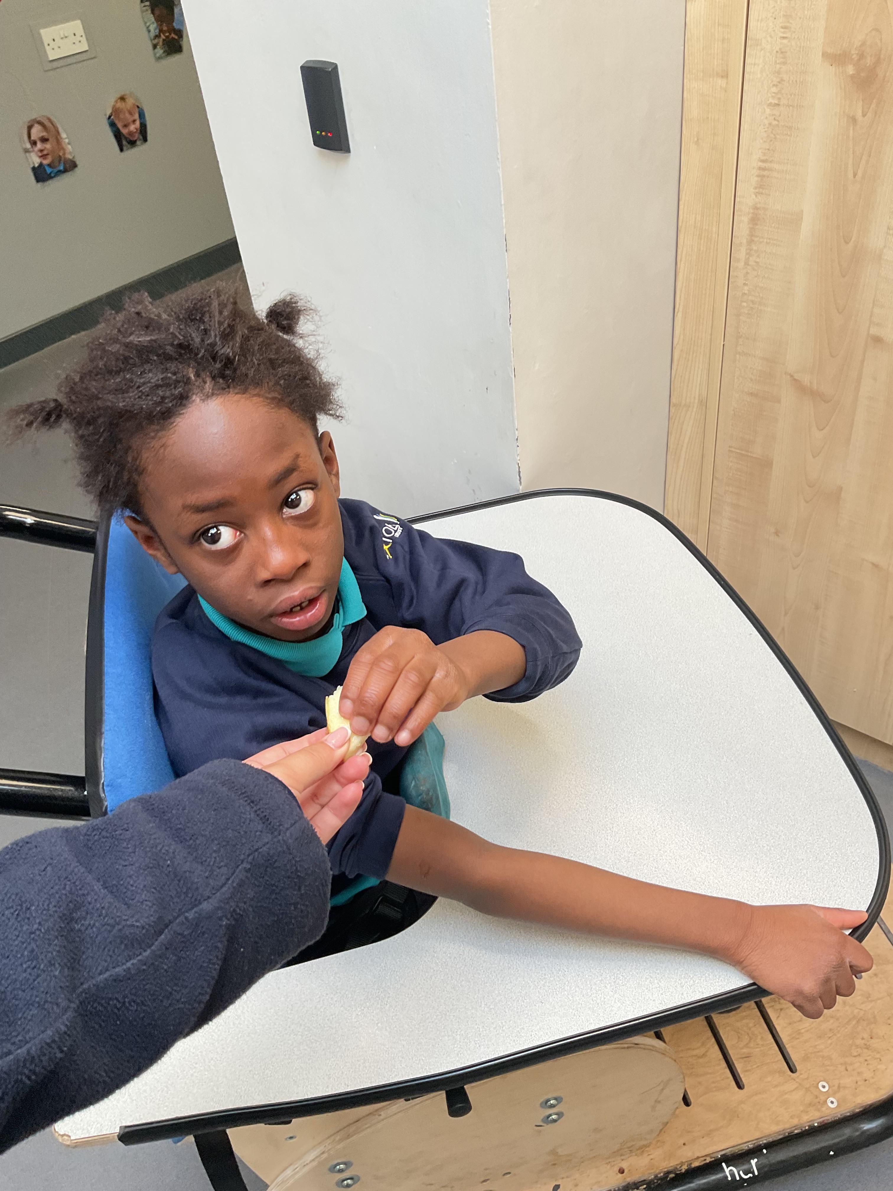 Today, it was our Wednesday assembly. We learnt the Makaton signs for lots of different types of food and then we tried to cut them up and taste them. Some of the vegetables we liked very much and some, we did not like at all!