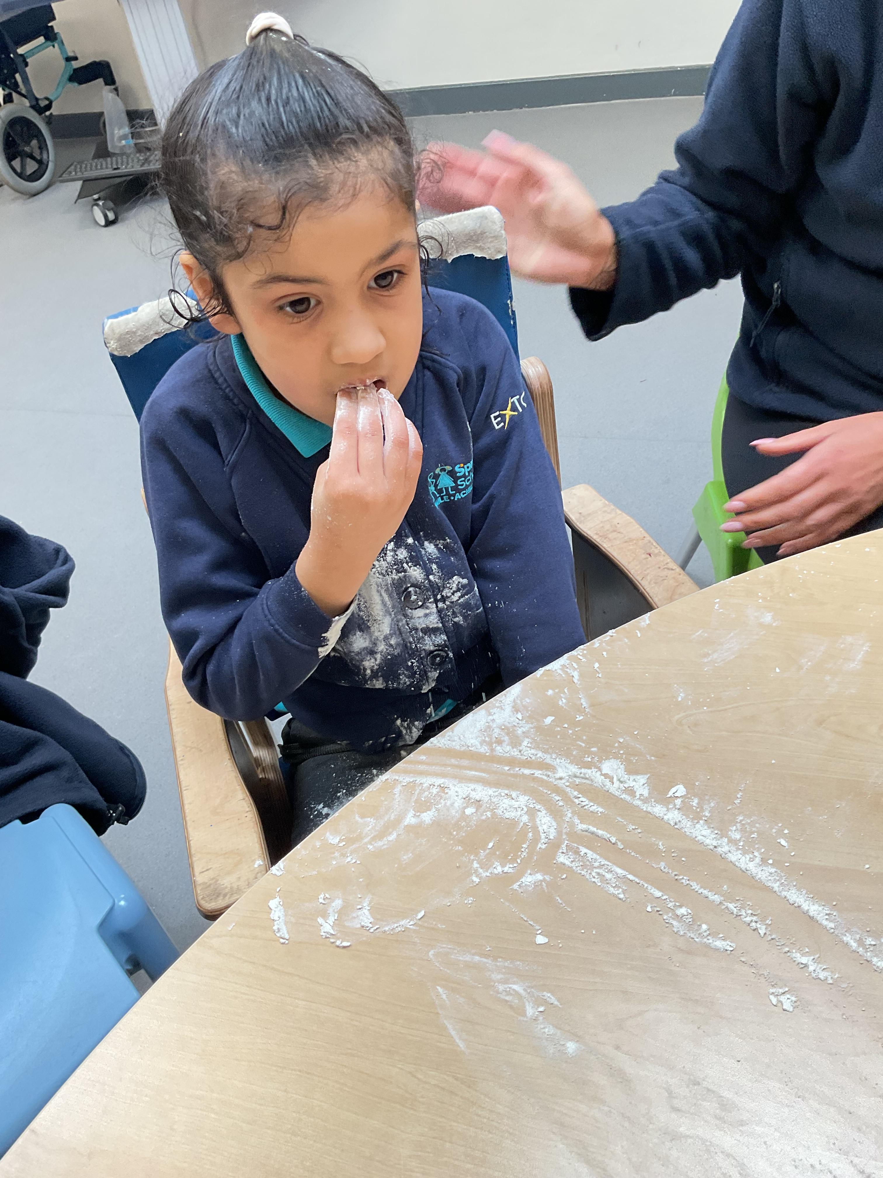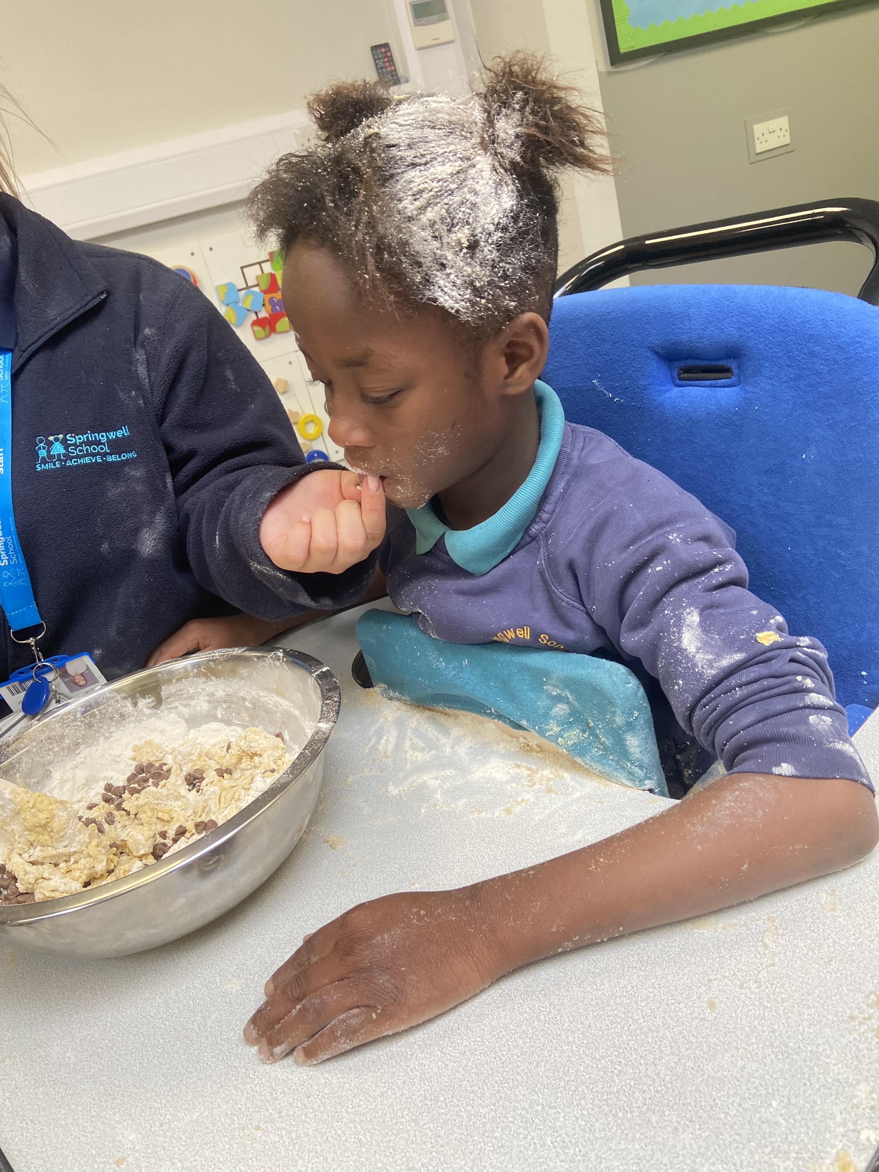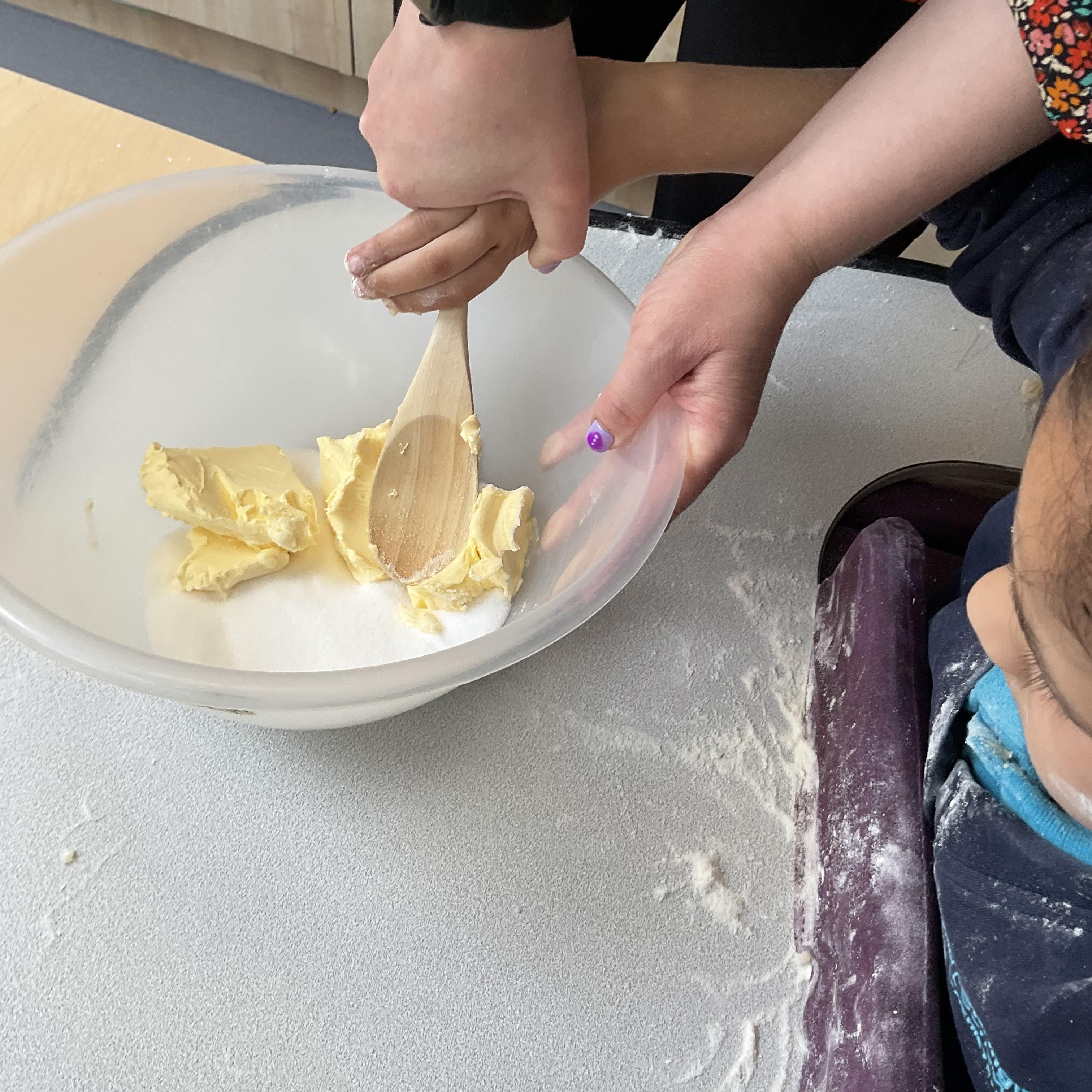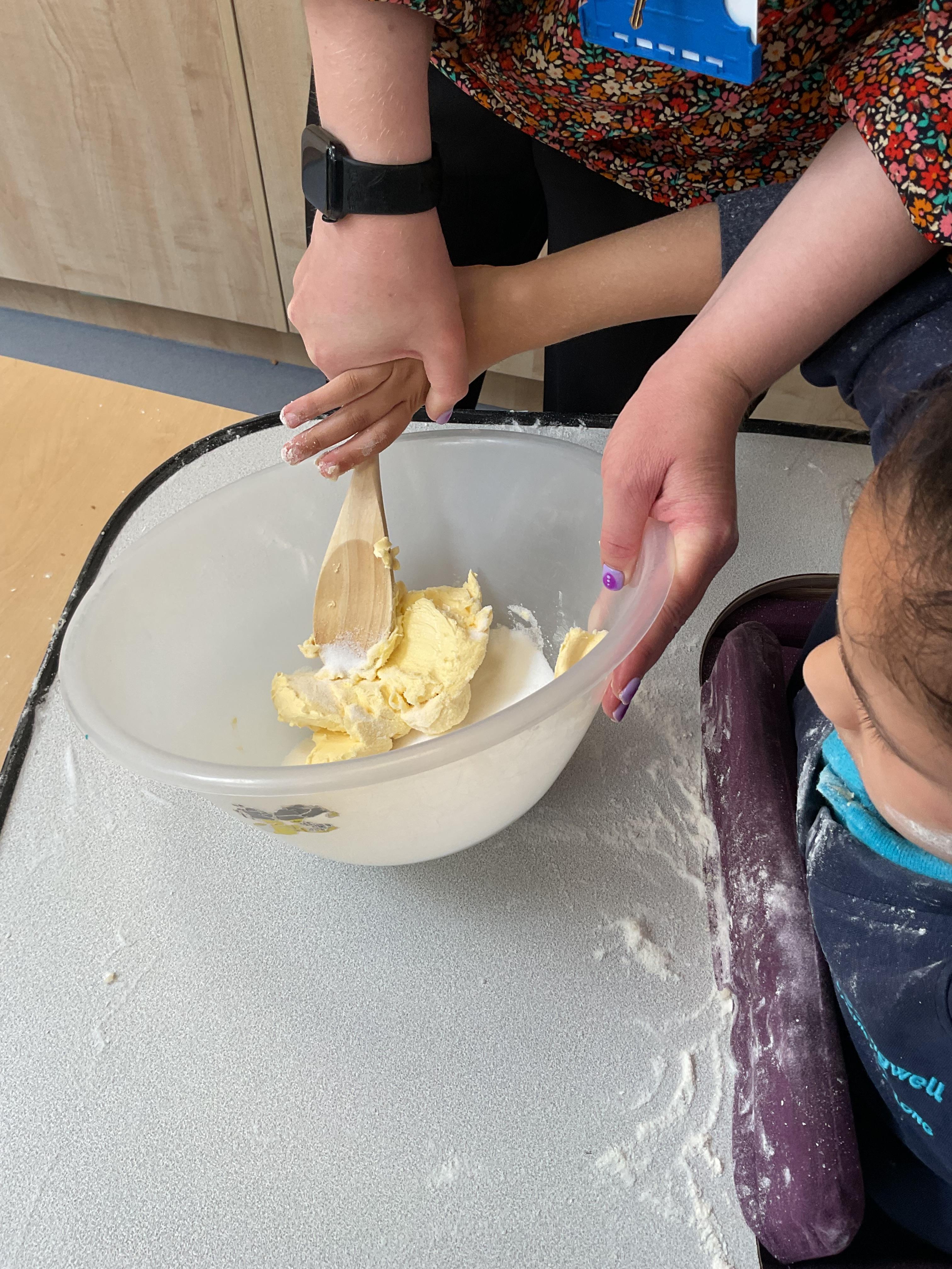 Today, we got very messy! We made some egg free chocolate chip cookies. Taking turns, we explored all the different ingredients (some of our children liked it more than others!) using our senses. Some of our children enjoyed watching the ingredients falling like the flour, others liked tactile exploration mixing the ingredients together and using fine motor skills to shape the cookies. Whilst some really liked using their taste to explore the ingredients (I bet you can guess who!). We had a lovely time and the cookies tasted delicious, we shared them for our snack.