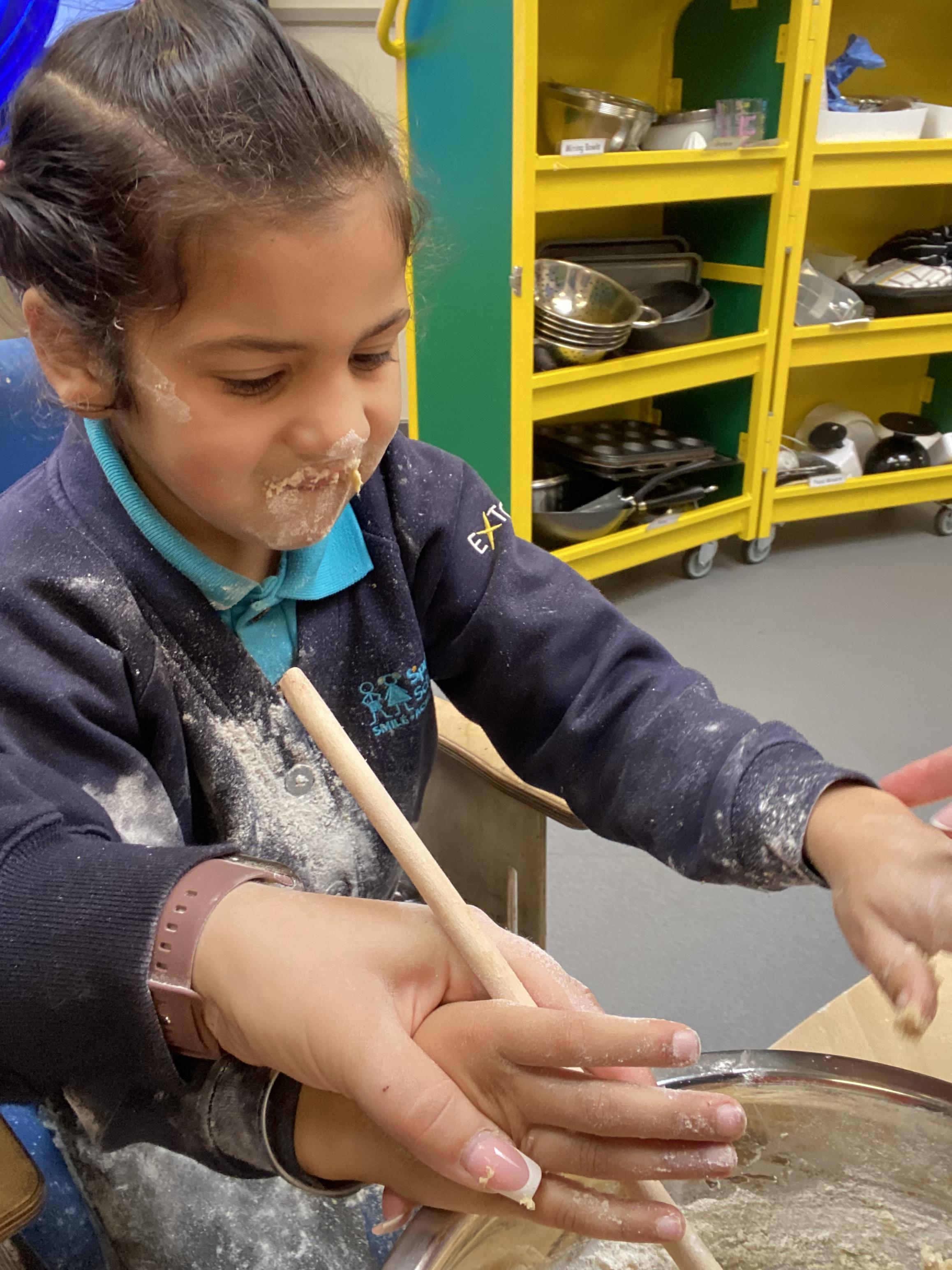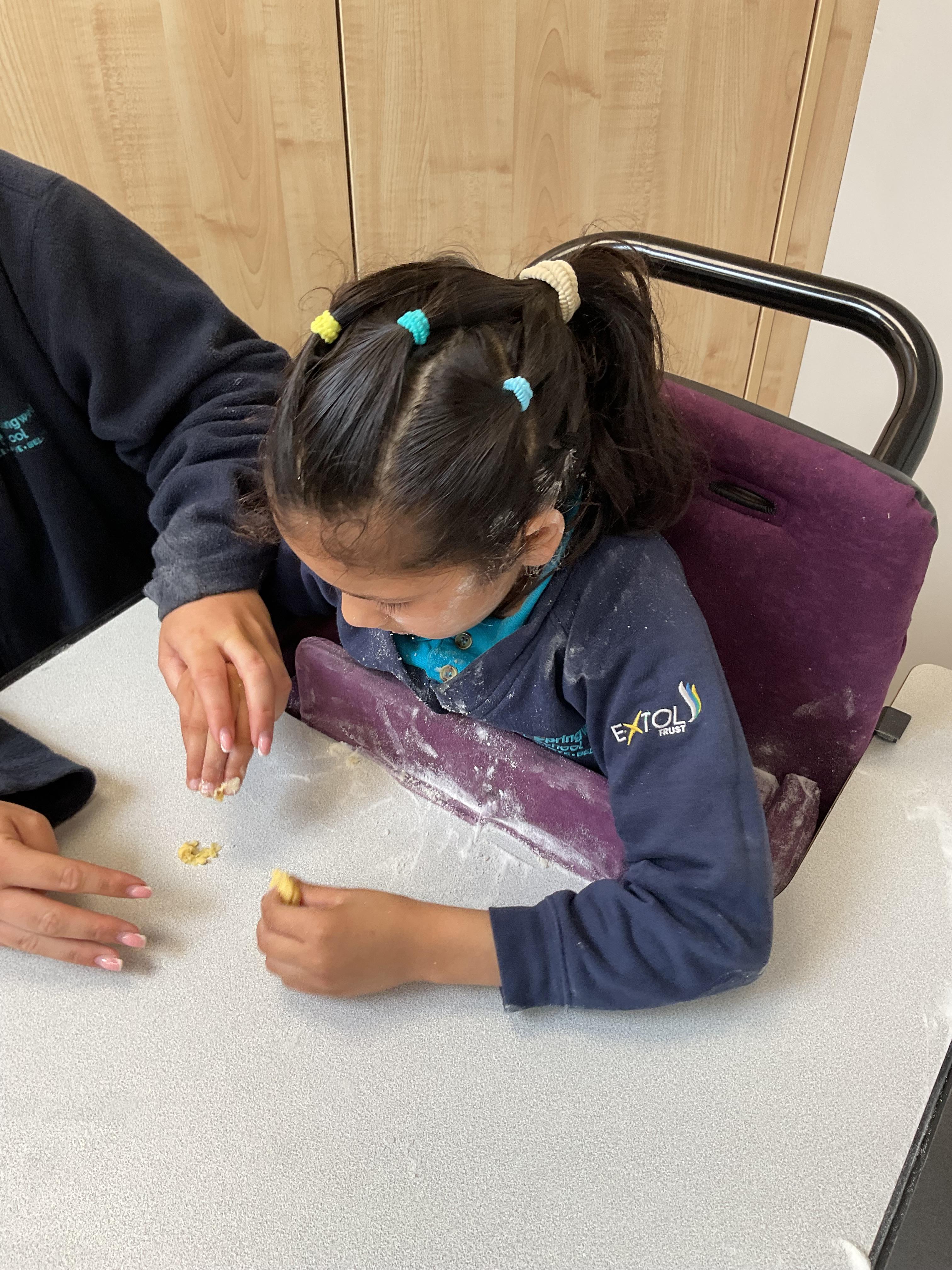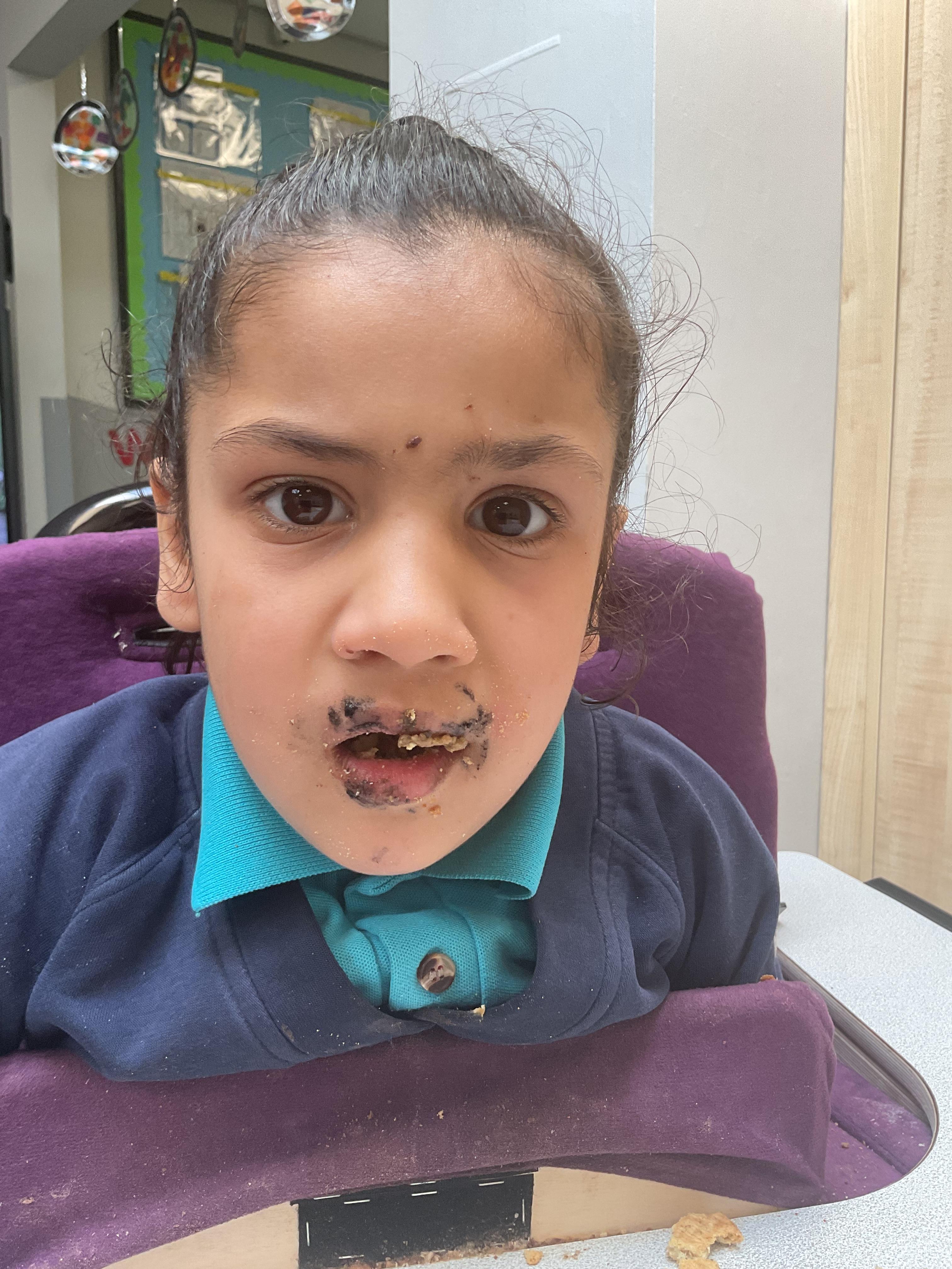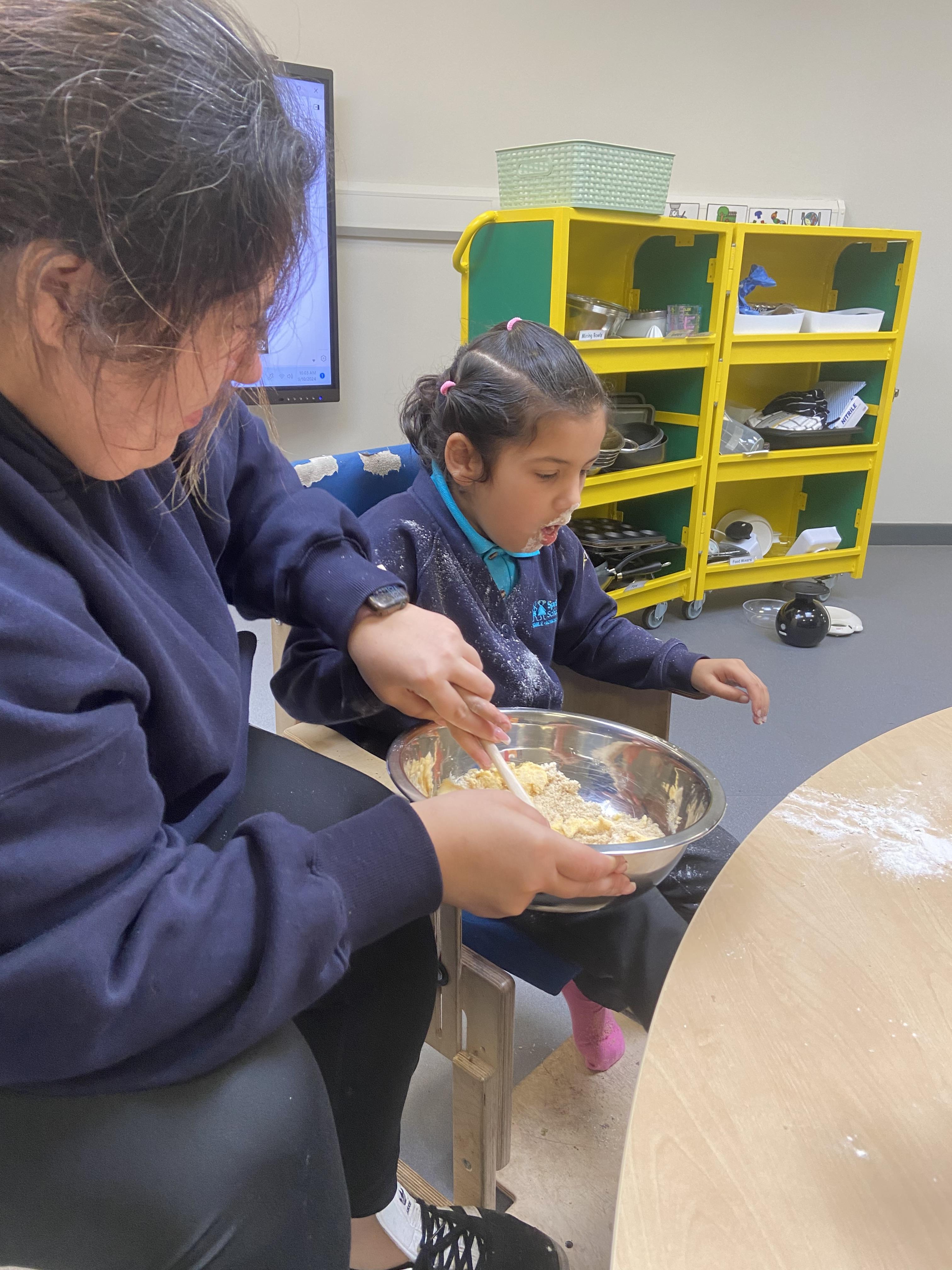 Today, we got very messy! We made some egg free chocolate chip cookies. Taking turns, we explored all the different ingredients (some of our children liked it more than others!) using our senses. Some of our children enjoyed watching the ingredients falling like the flour, others liked tactile exploration mixing the ingredients together and using fine motor skills to shape the cookies. Whilst some really liked using their taste to explore the ingredients (I bet you can guess who!). We had a lovely time and the cookies tasted delicious, we shared them for our snack.