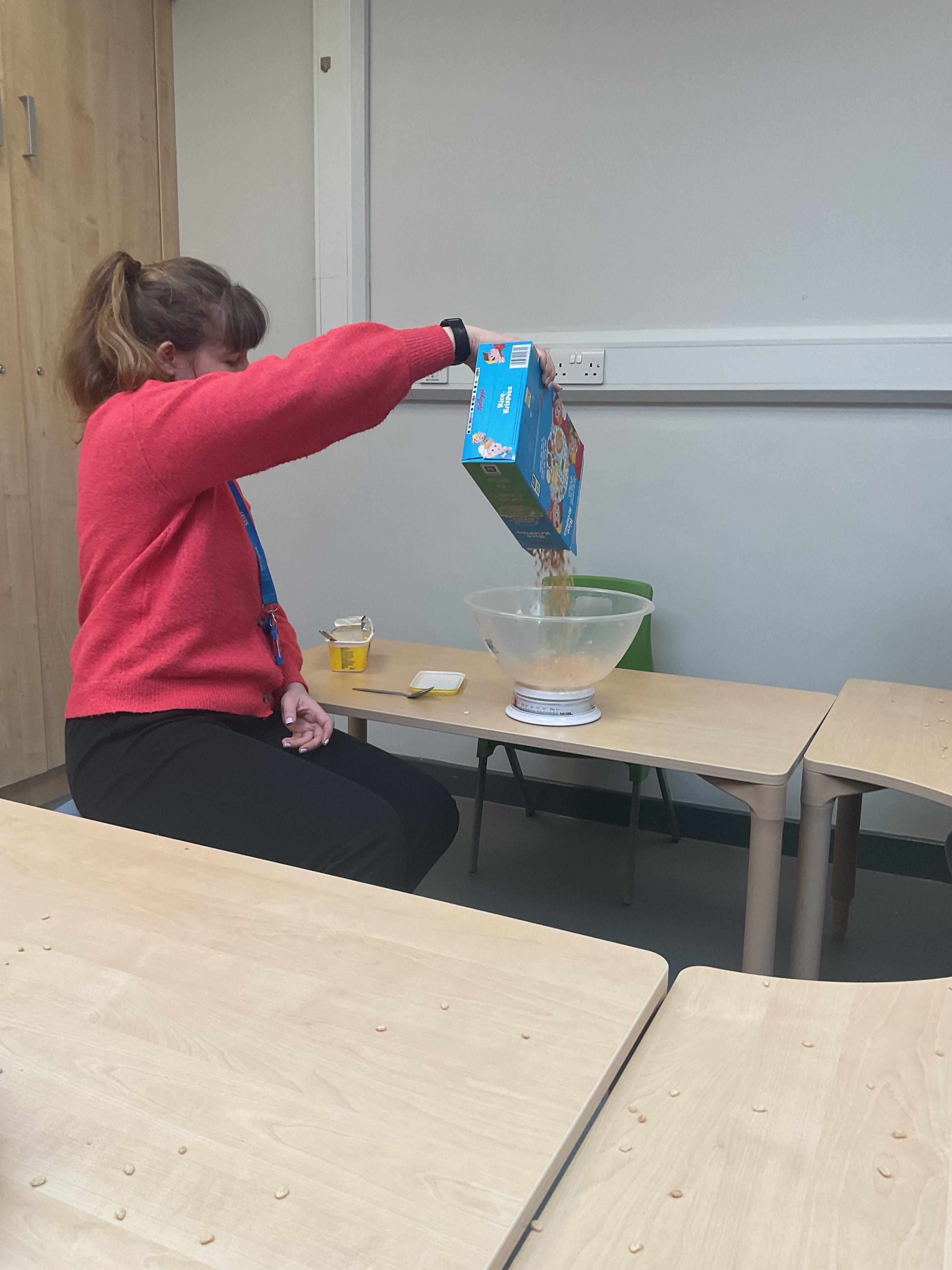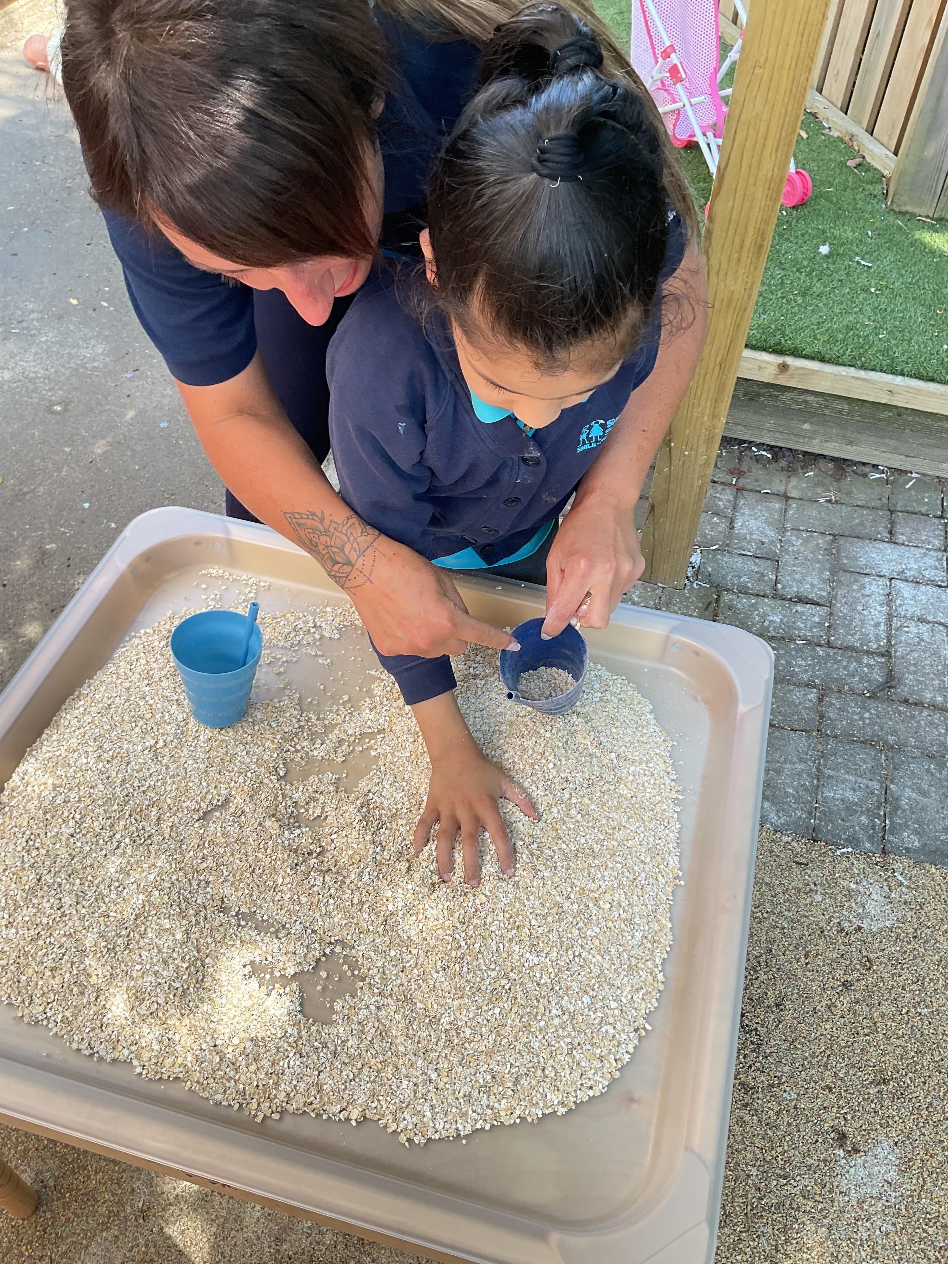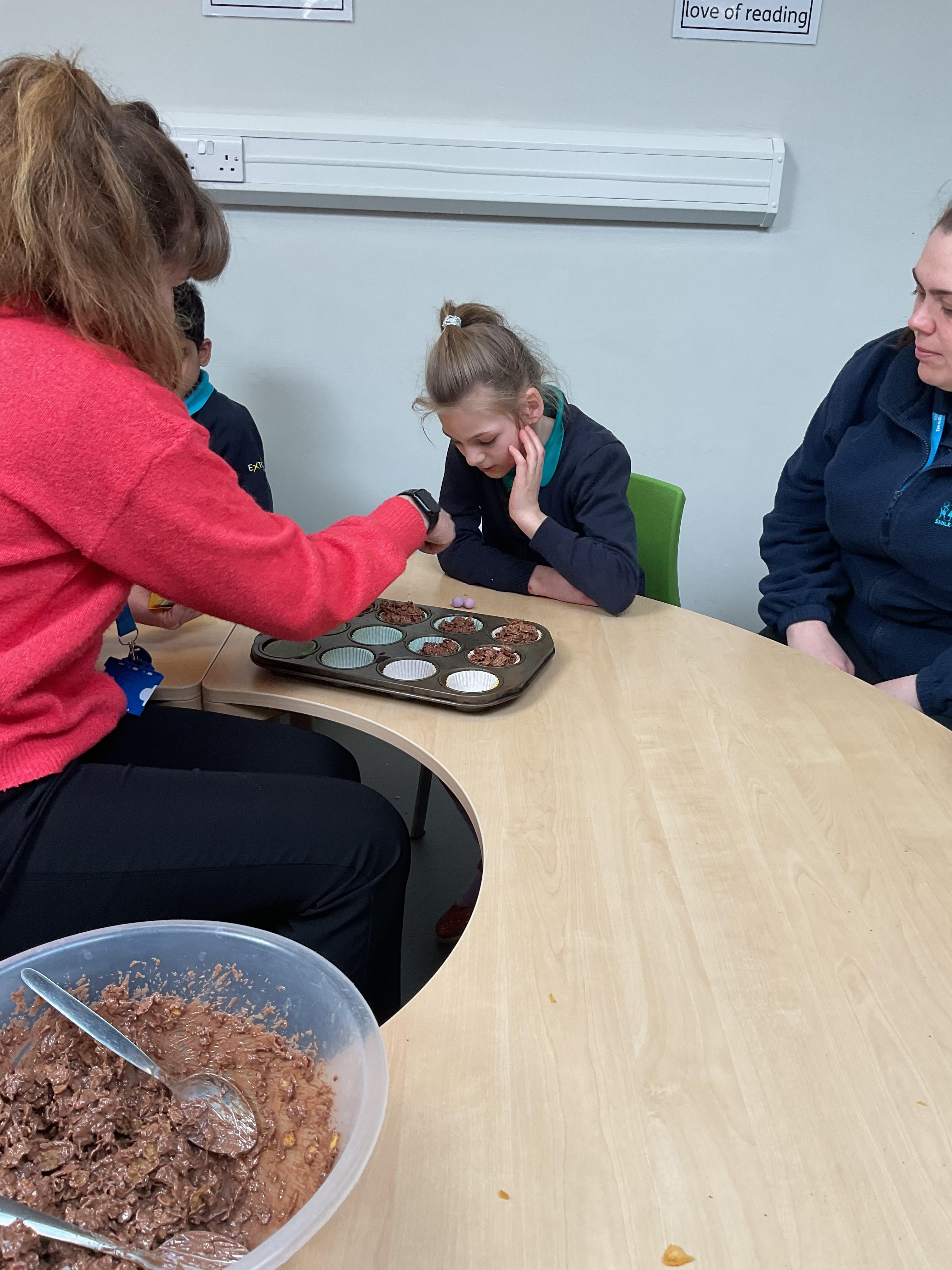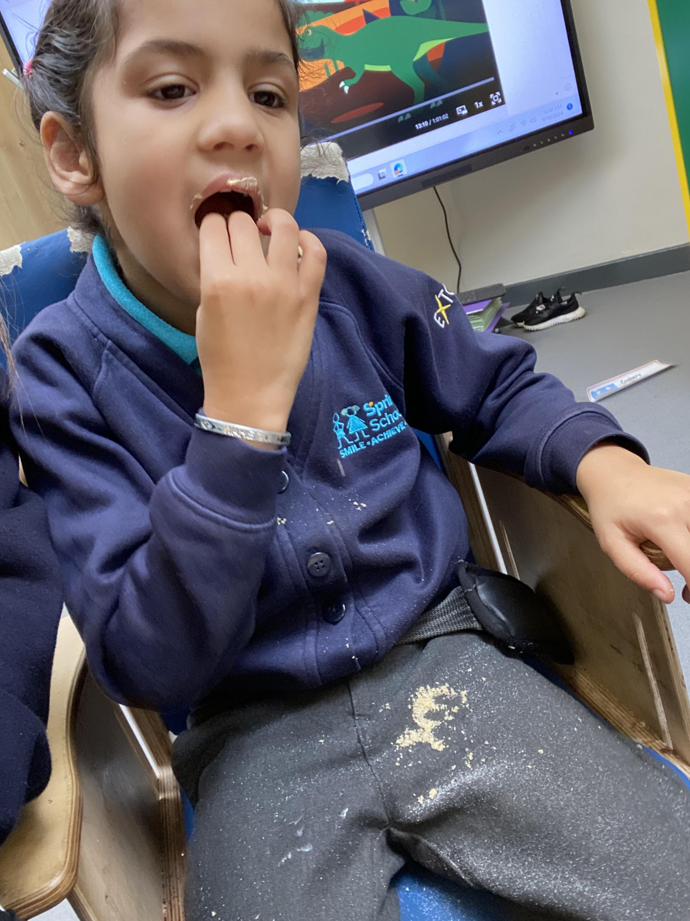 Today, we got very messy! We made some egg free chocolate chip cookies. Taking turns, we explored all the different ingredients (some of our children liked it more than others!) using our senses. Some of our children enjoyed watching the ingredients falling like the flour, others liked tactile exploration mixing the ingredients together and using fine motor skills to shape the cookies. Whilst some really liked using their taste to explore the ingredients (I bet you can guess who!). We had a lovely time and the cookies tasted delicious, we shared them for our snack.