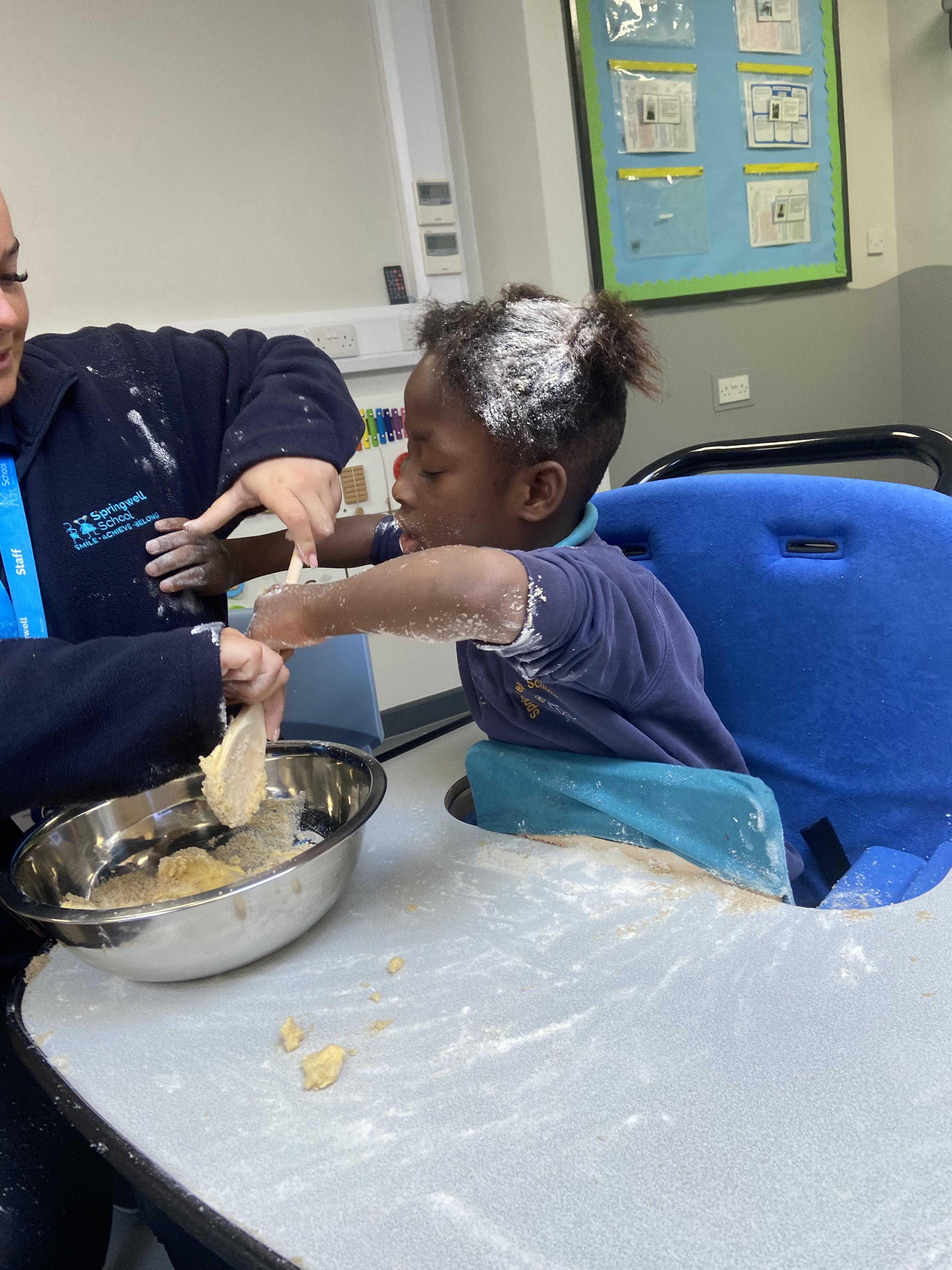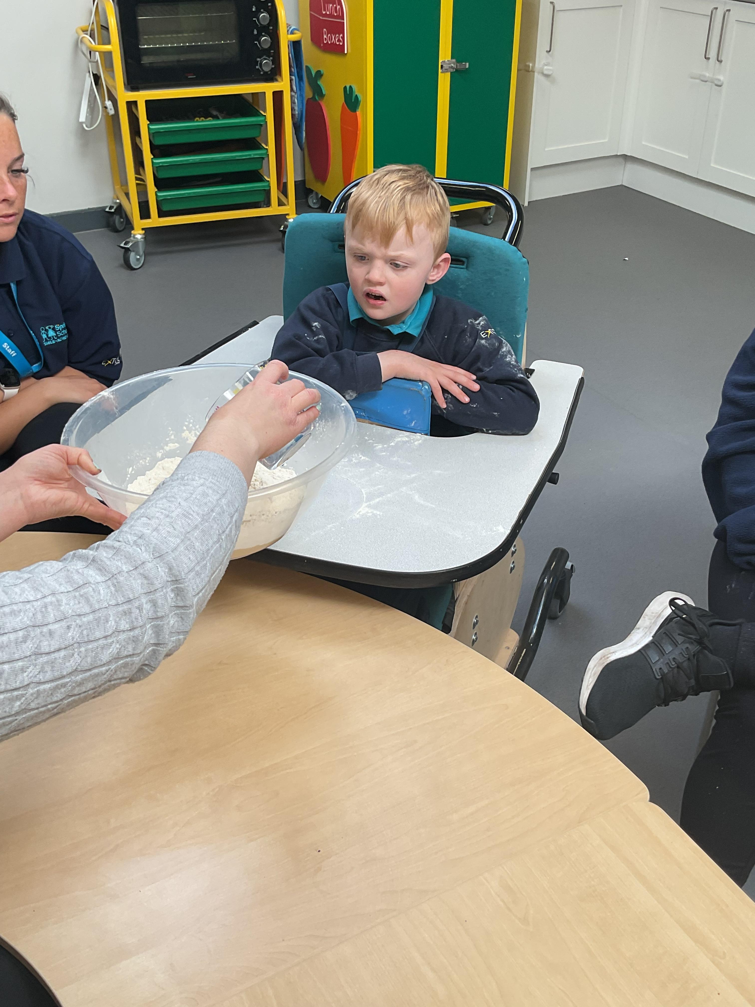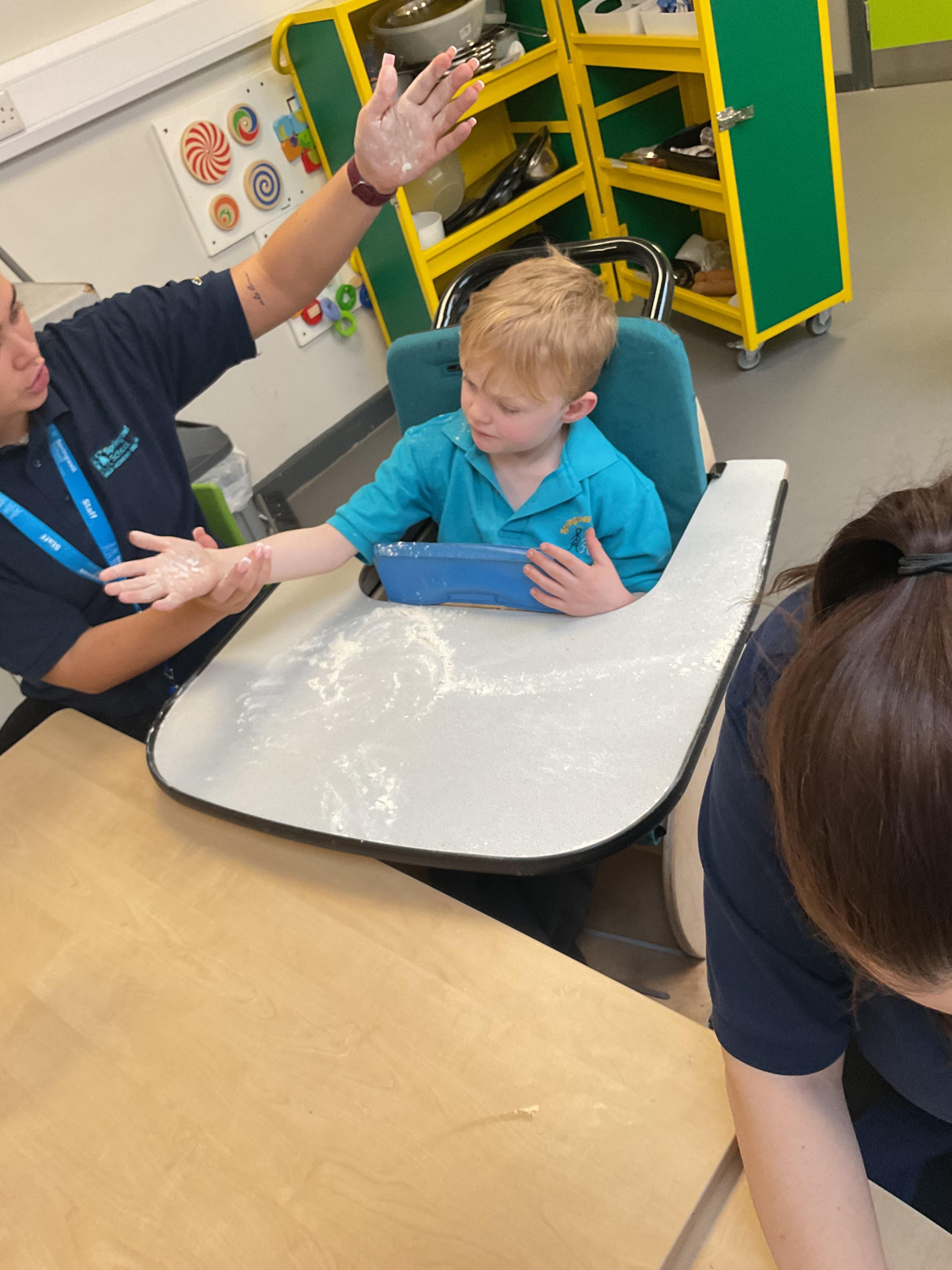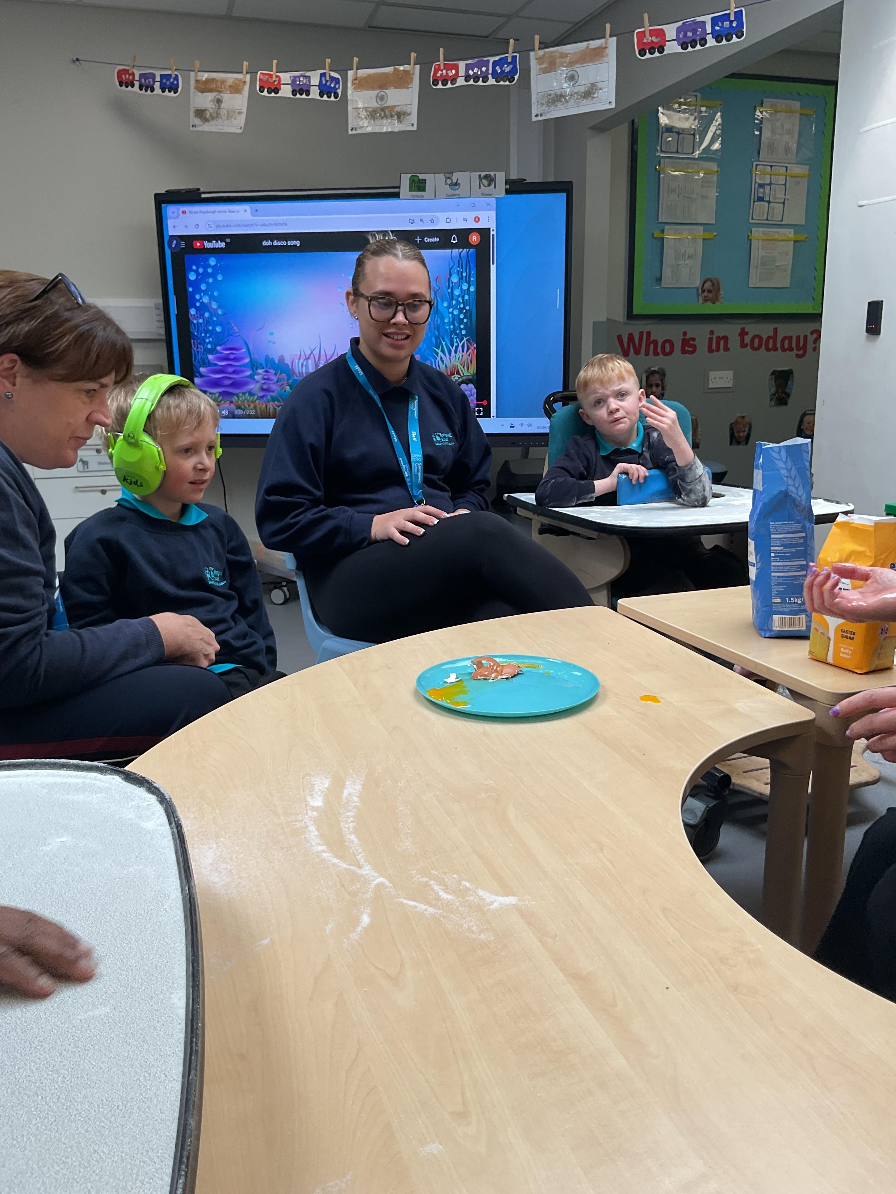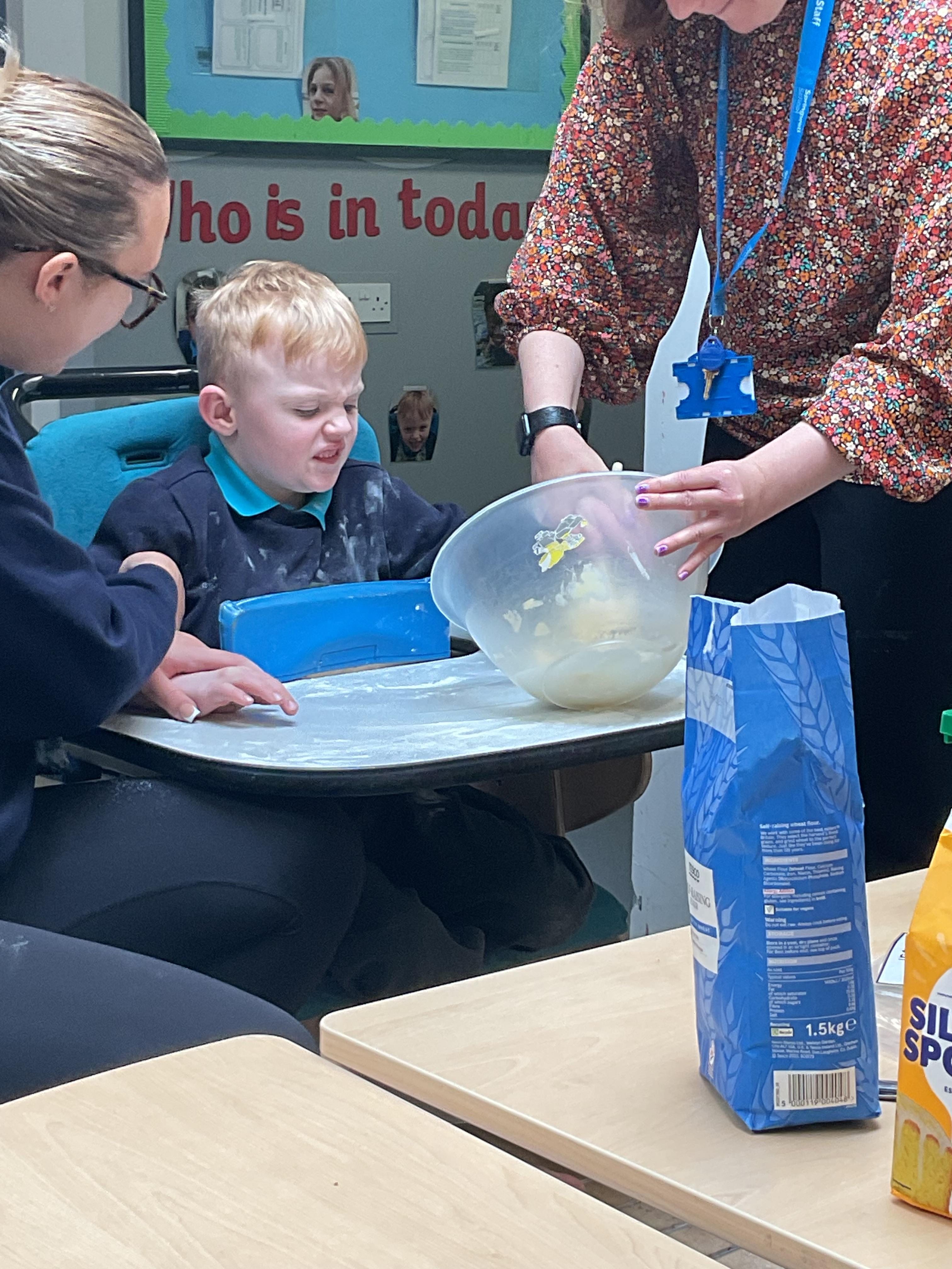 This week zebras focused on their individual communication targets and have been practicing communicating in school with PECs. All zebras have worked so hard communicating at breakfast time, communicating in a range of classroom activities and during physical activities such as rebound therapy. We started the week improving our fine motor skills by carefully tracing over dotted lines with our chosen colour. In dough disco, we practised rolling the dough, splatting the dough and pinching the dough with our fingers. At the end of the week, we got messy in cookery by exploring the flour, splatting the eggs and mark making with the sugar. By mixing the ingredients together we made cakes and then iced them later, these were delicious. Our favourite time of the week was getting all of our energy out on the trampoline. This week our focus was for the children to stay in the centre of the trampoline independently but most of all we had fun!