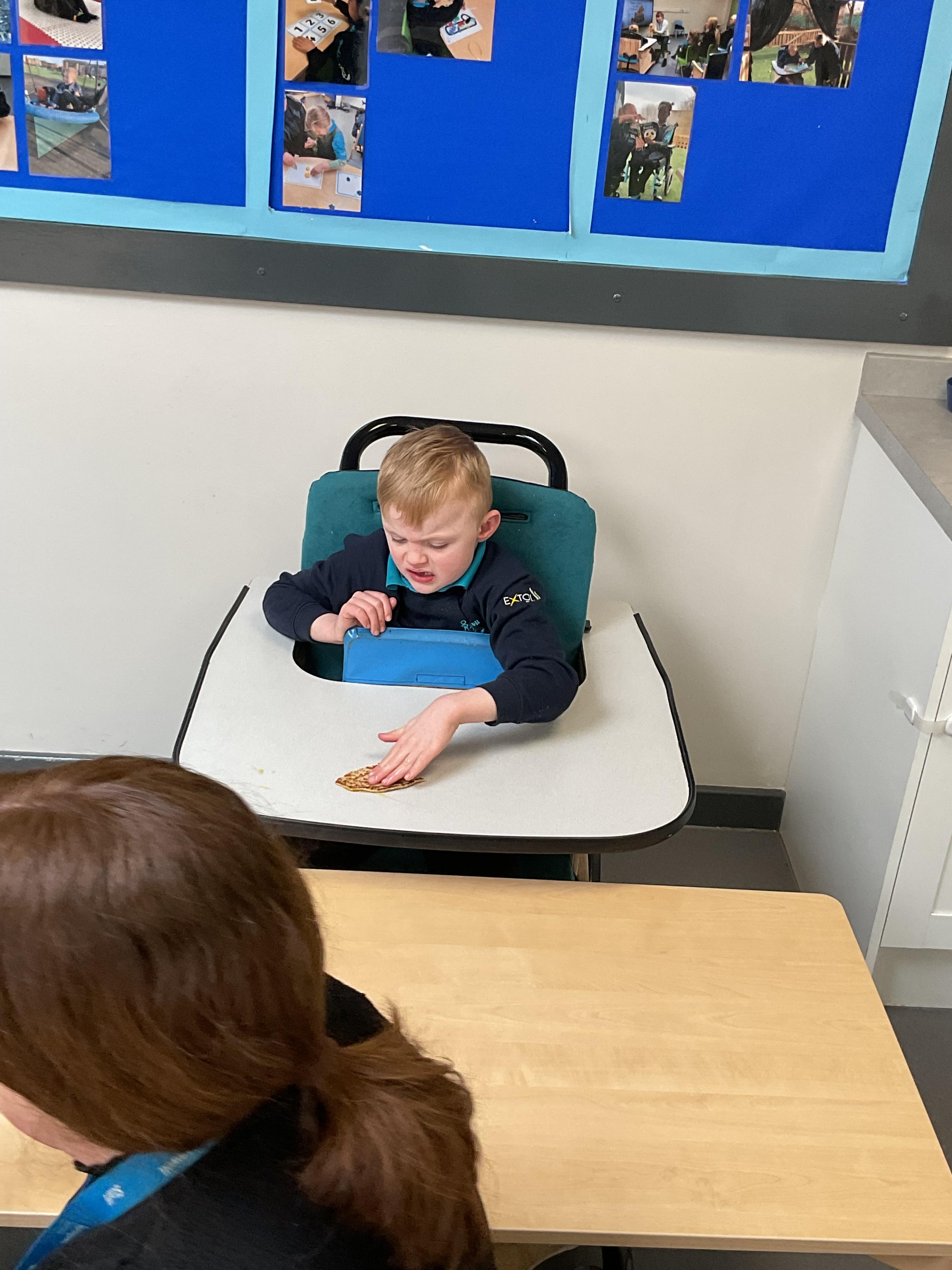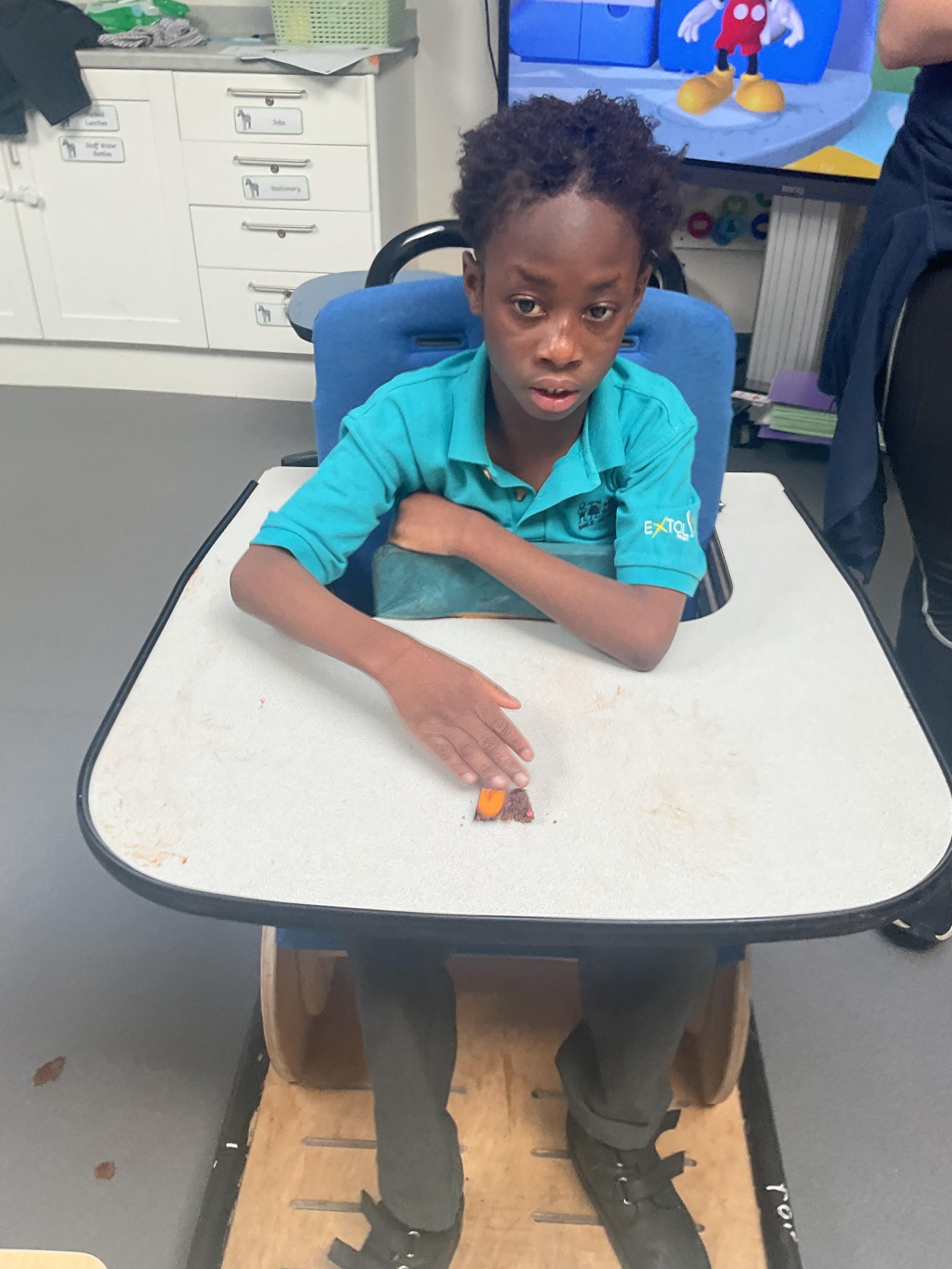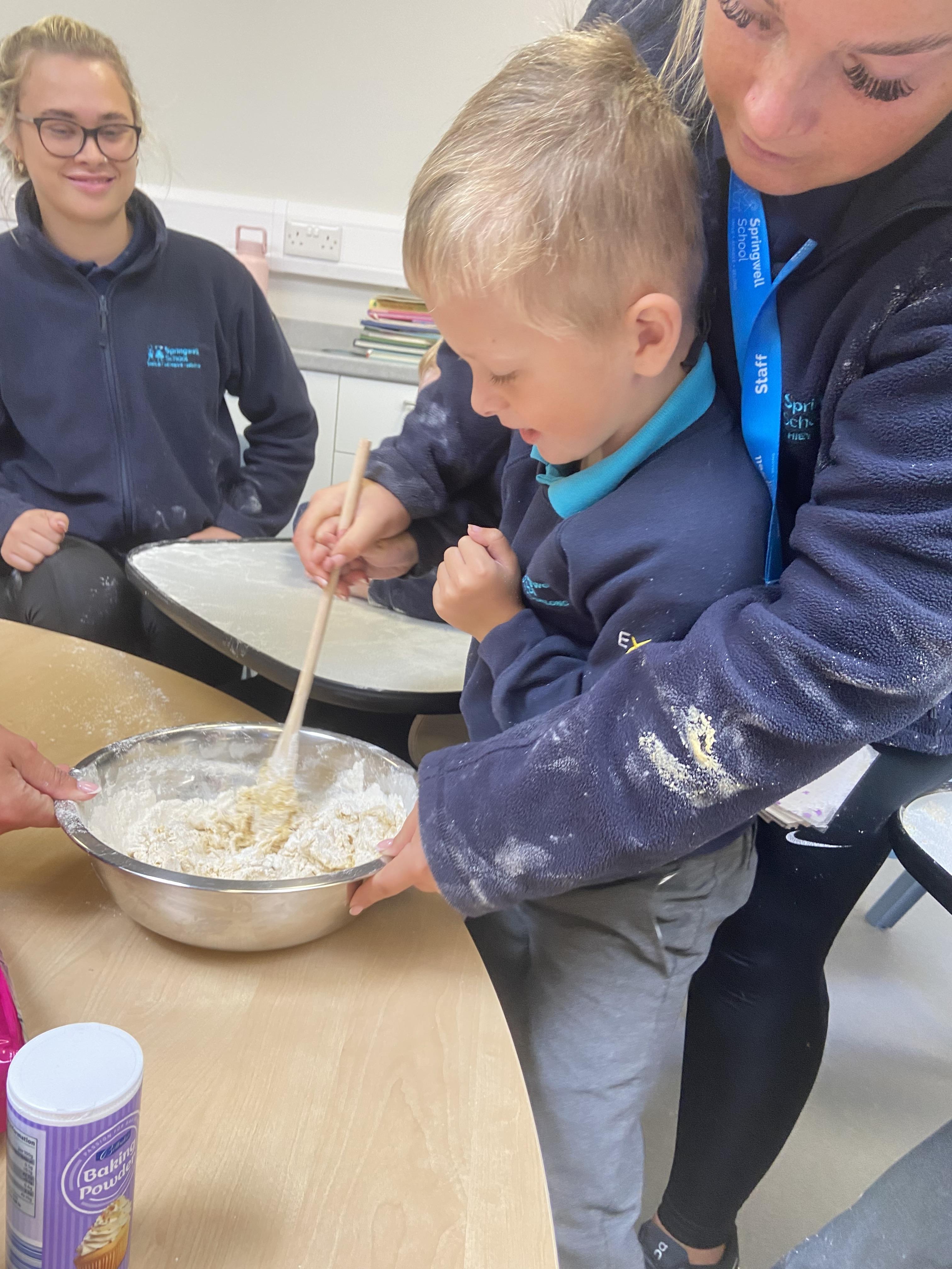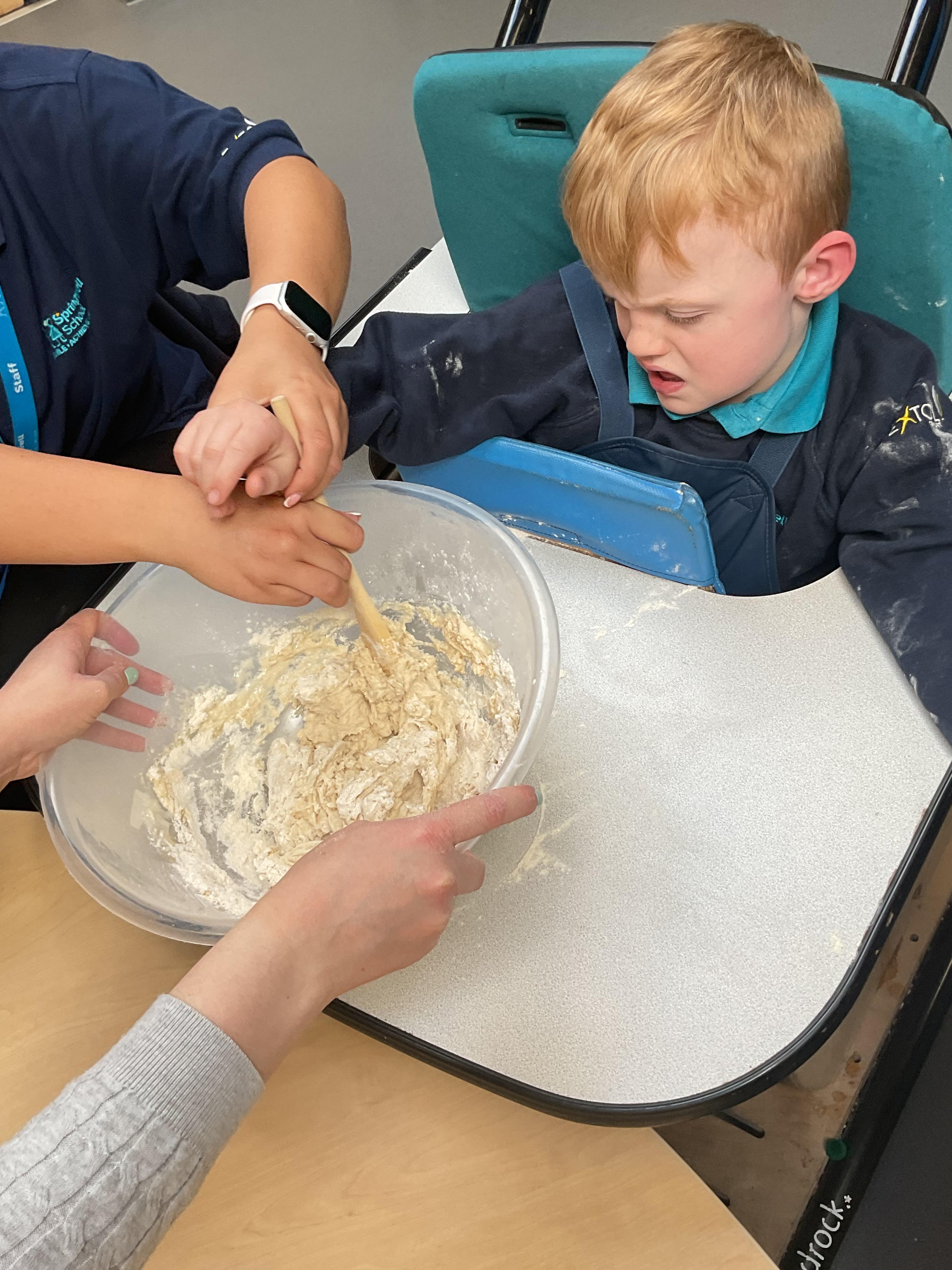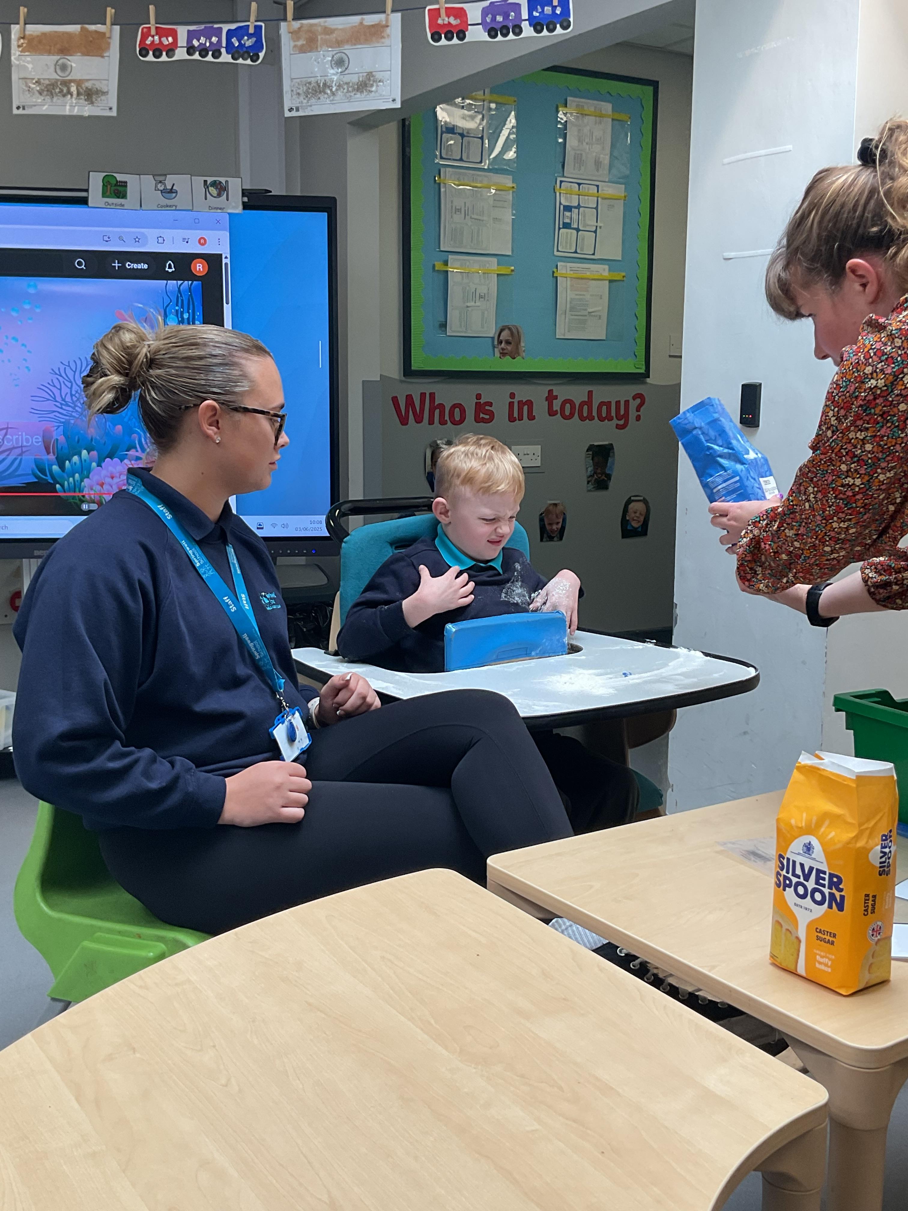 This week zebras focused on their individual communication targets and have been practicing communicating in school with PECs. All zebras have worked so hard communicating at breakfast time, communicating in a range of classroom activities and during physical activities such as rebound therapy. We started the week improving our fine motor skills by carefully tracing over dotted lines with our chosen colour. In dough disco, we practised rolling the dough, splatting the dough and pinching the dough with our fingers. At the end of the week, we got messy in cookery by exploring the flour, splatting the eggs and mark making with the sugar. By mixing the ingredients together we made cakes and then iced them later, these were delicious. Our favourite time of the week was getting all of our energy out on the trampoline. This week our focus was for the children to stay in the centre of the trampoline independently but most of all we had fun!