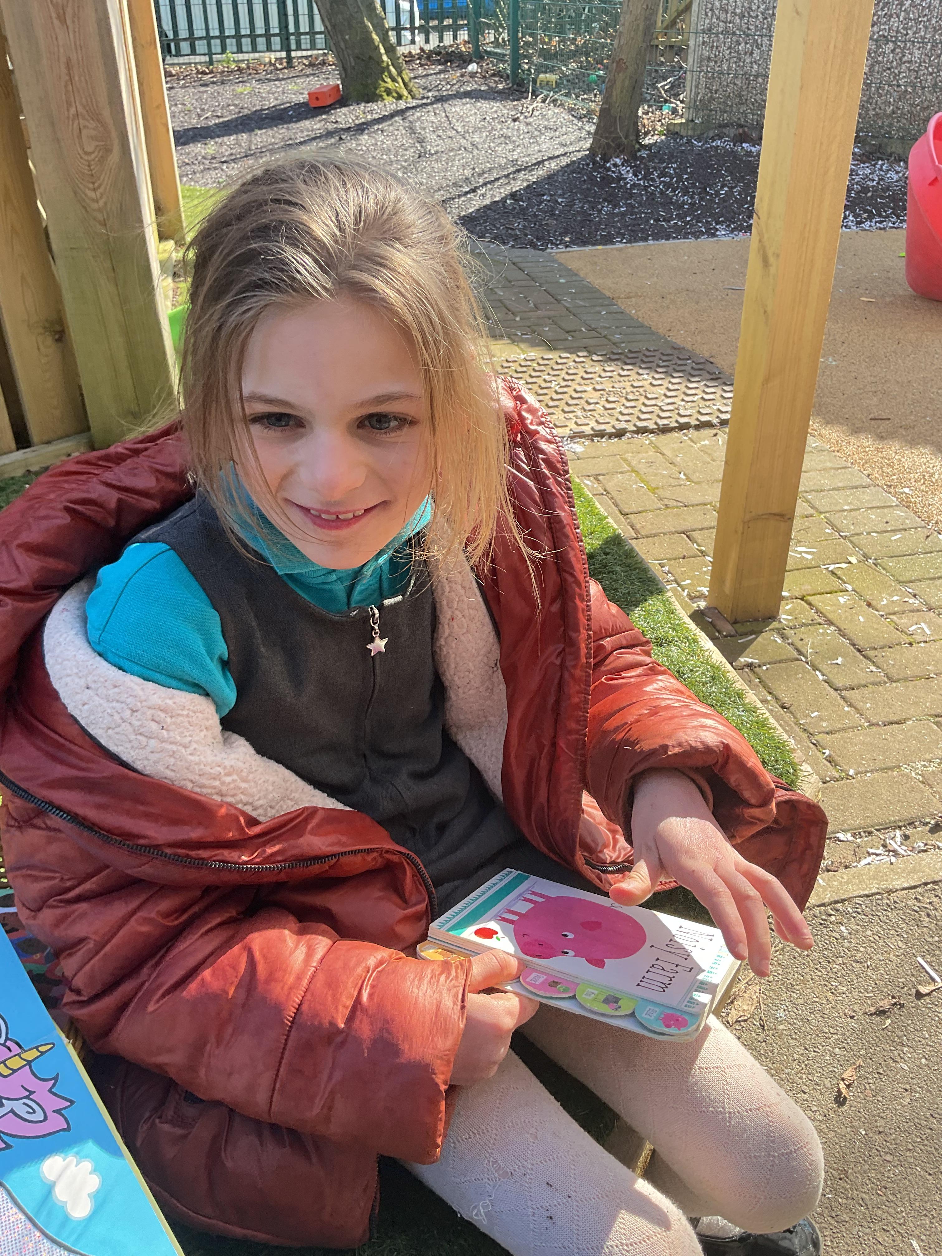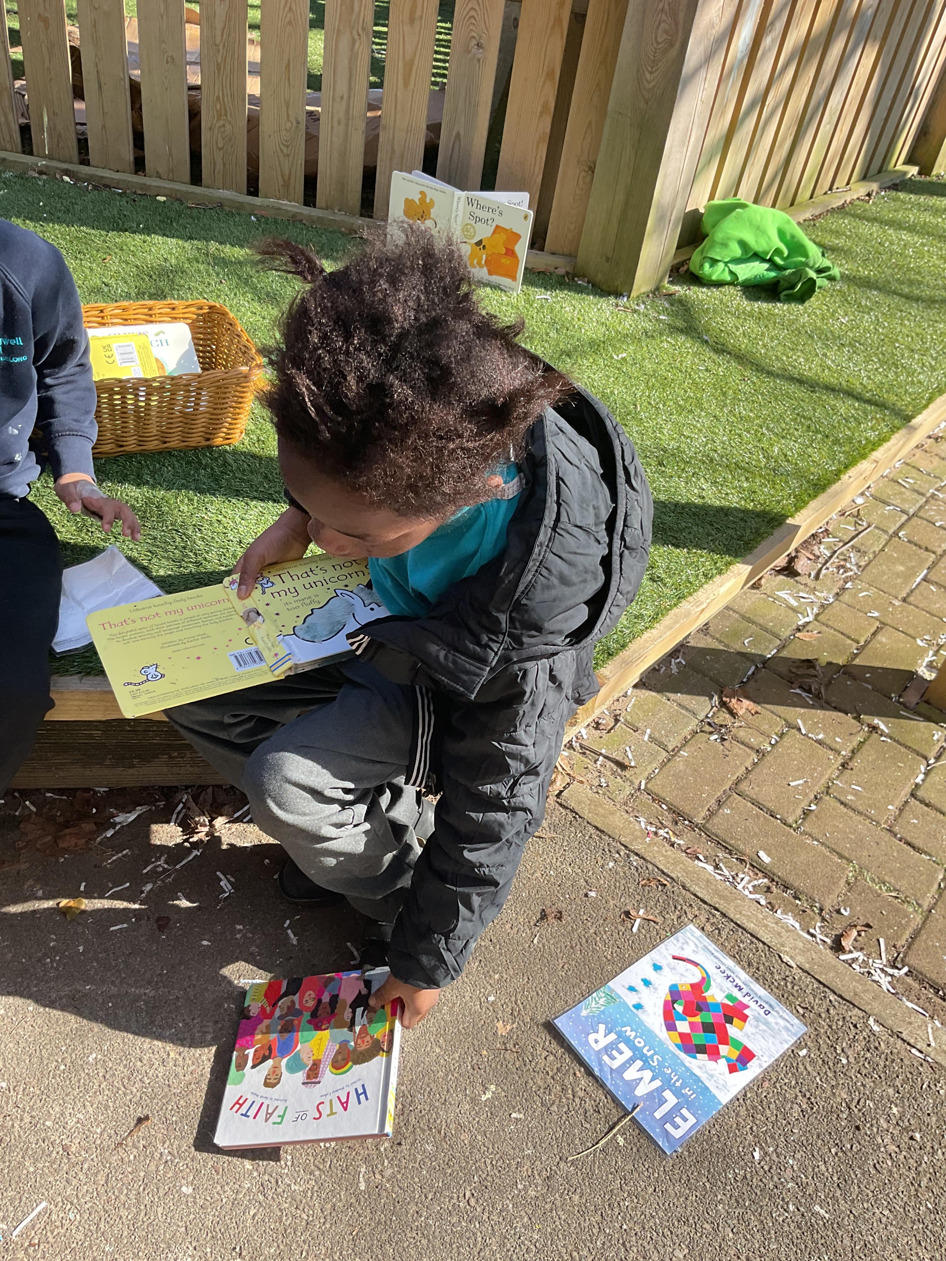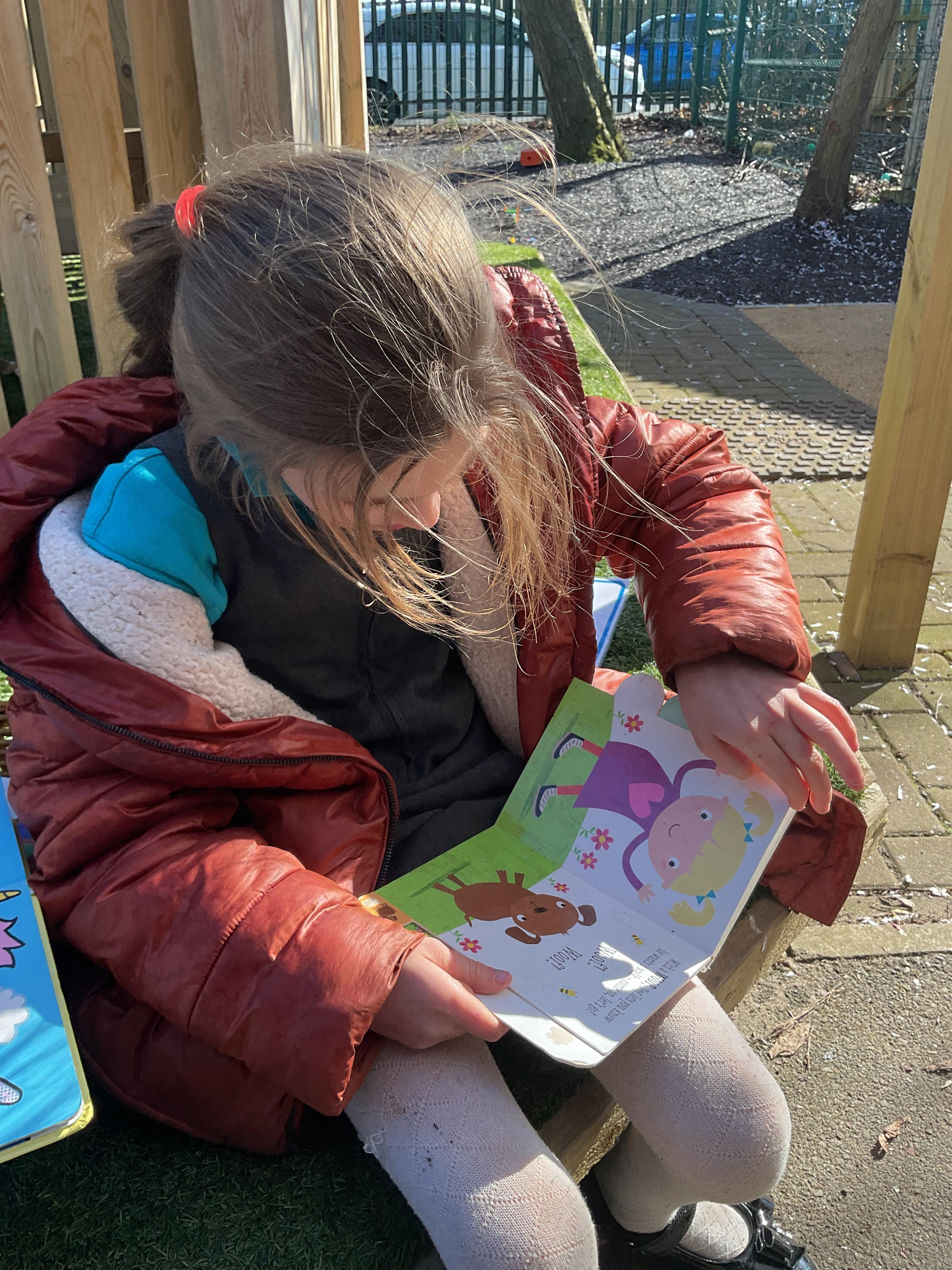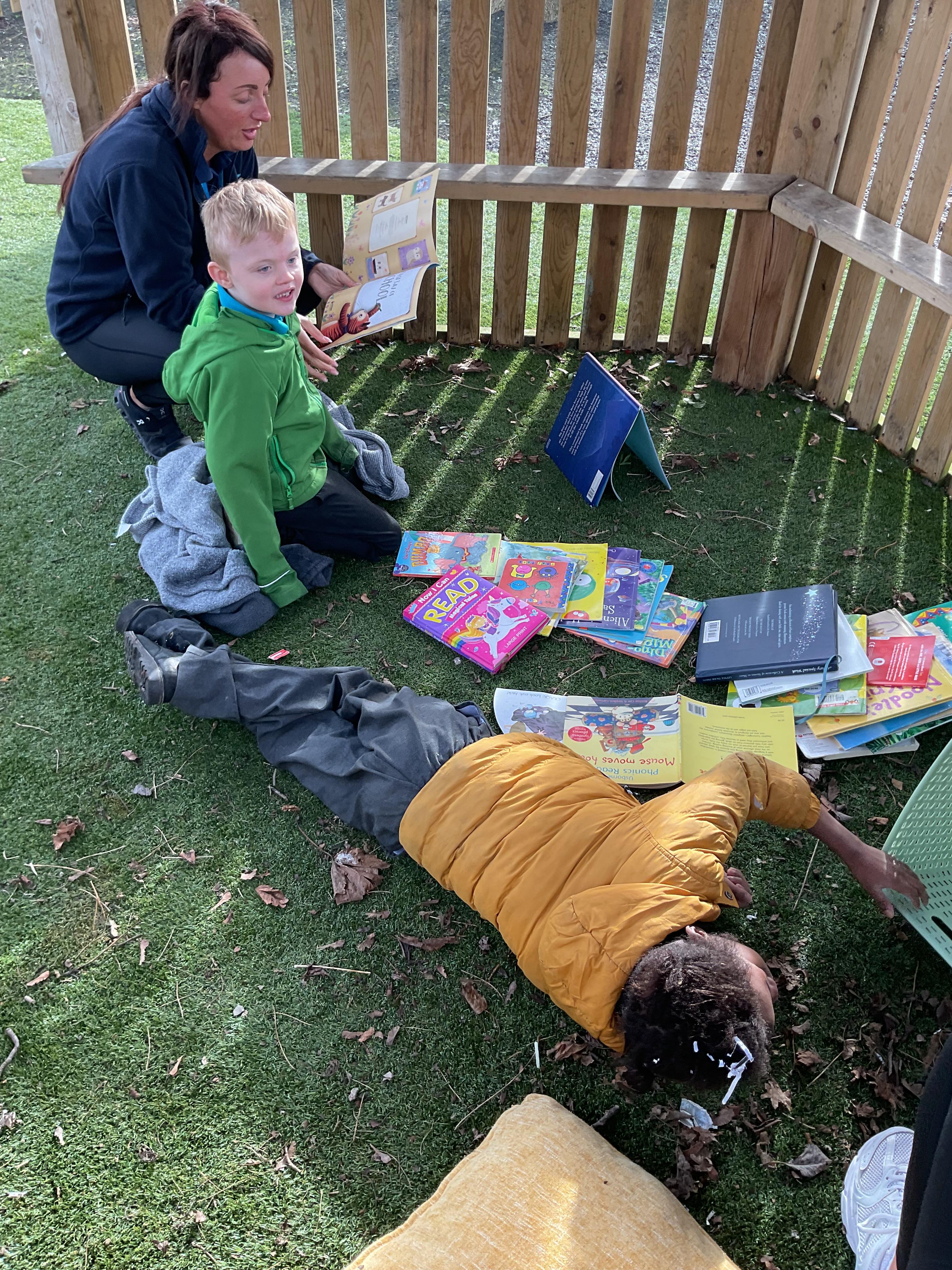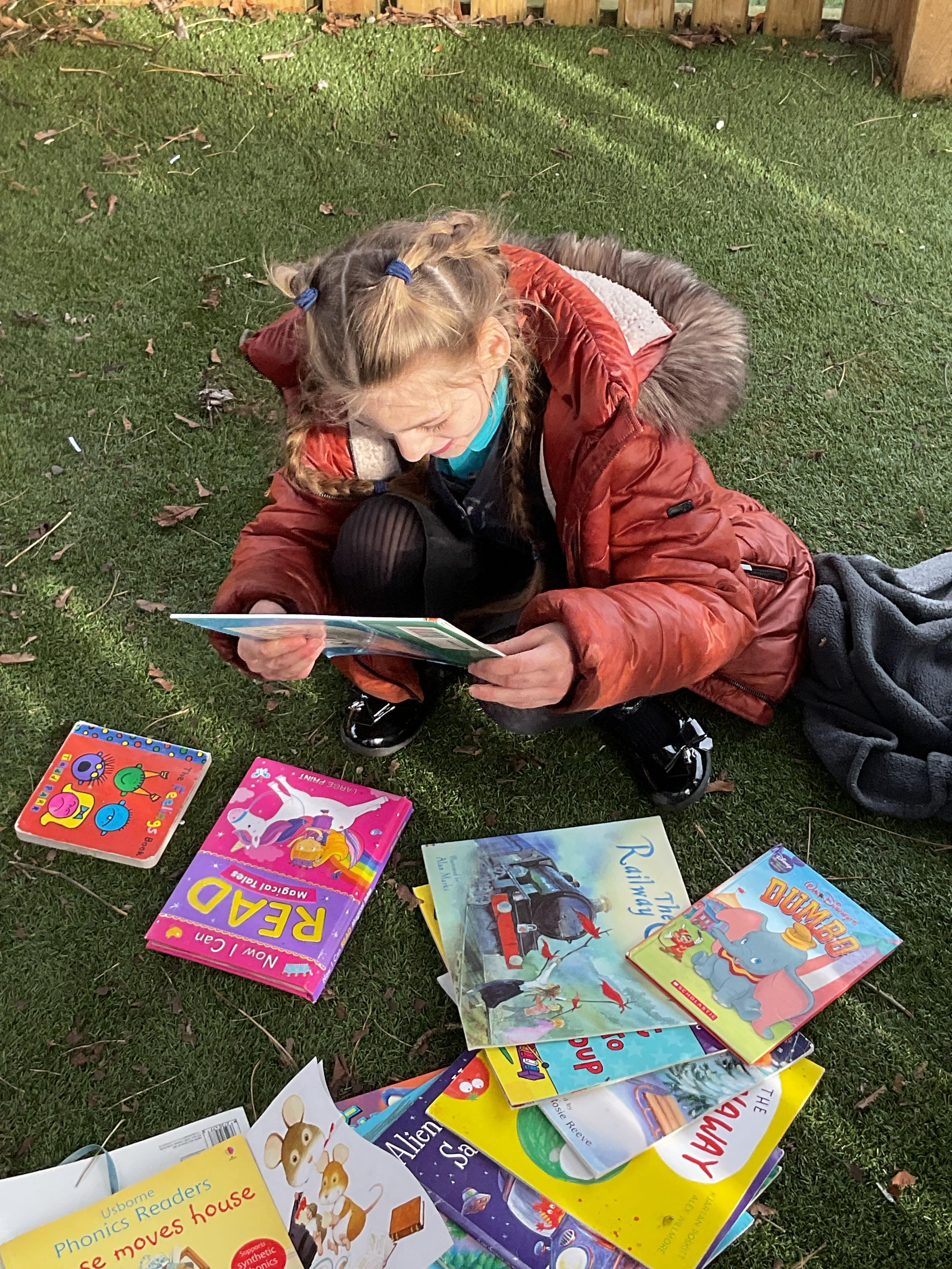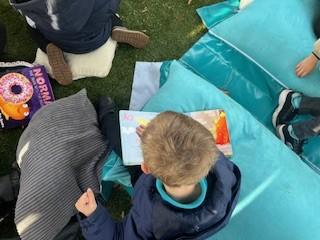 Today, we went outside to read and explore some texts together. We absolutely loved it. We all chose a different text and had a cosy time reading on our cushions. We enjoyed turning the pages, looking at the pictures and listening to our adult read the words to us. We are already looking forward to next time.