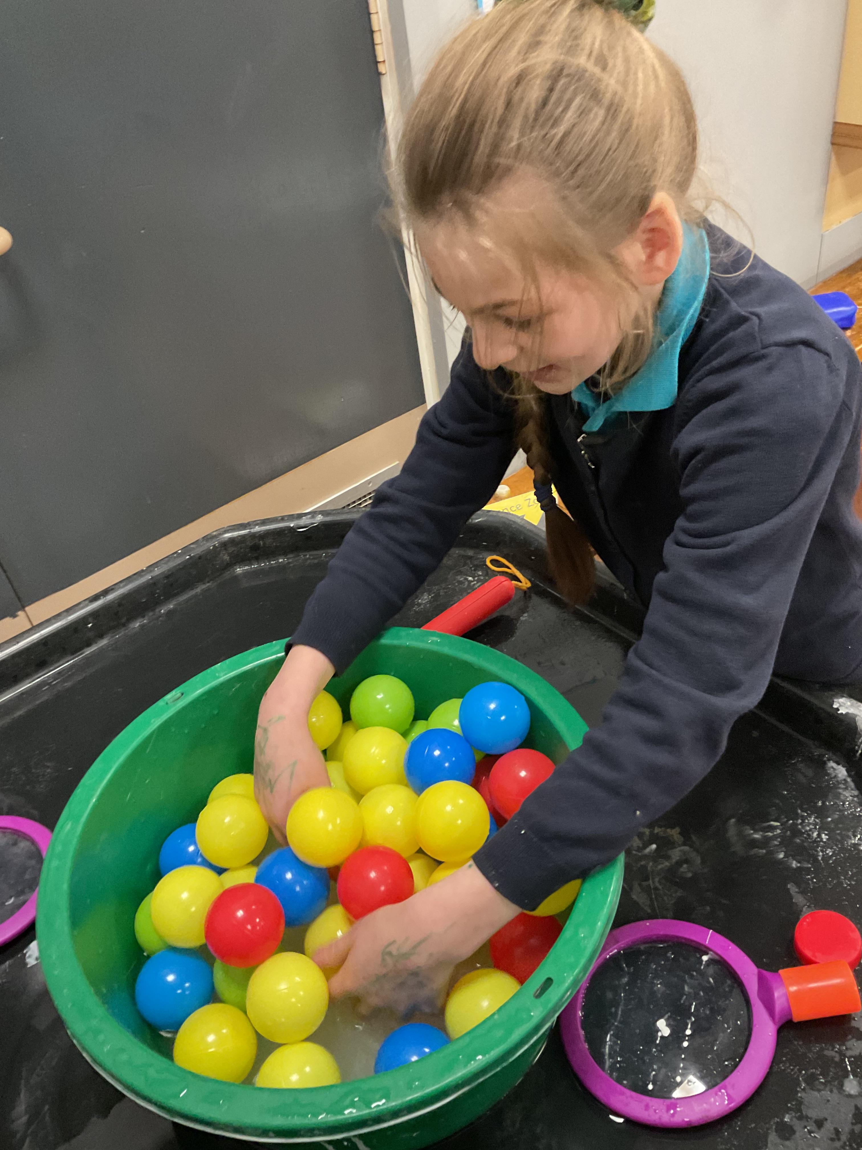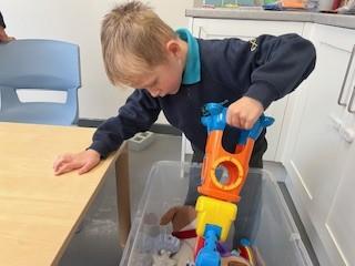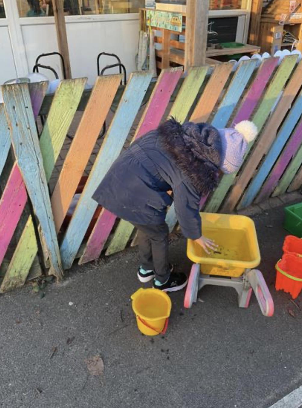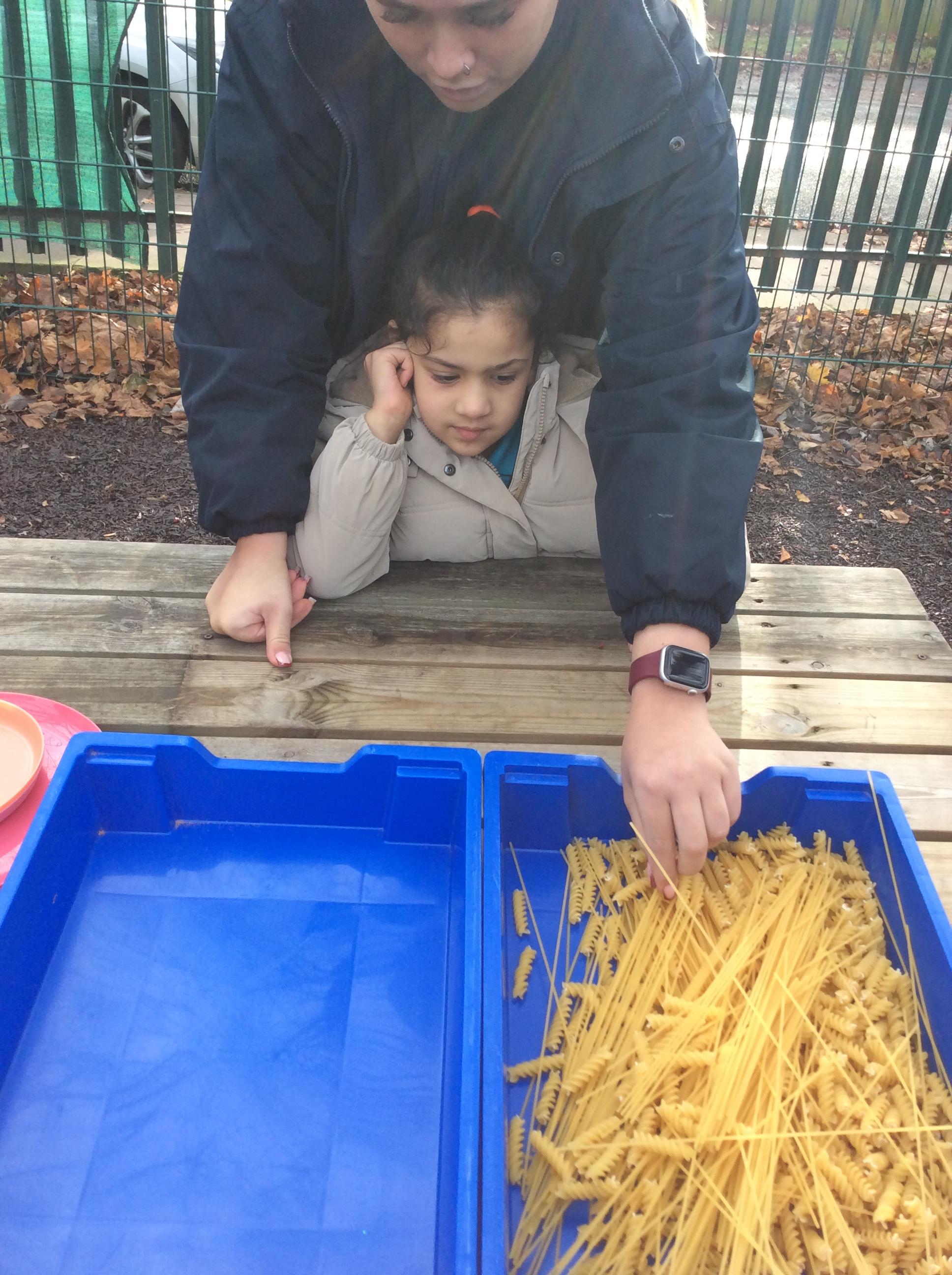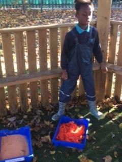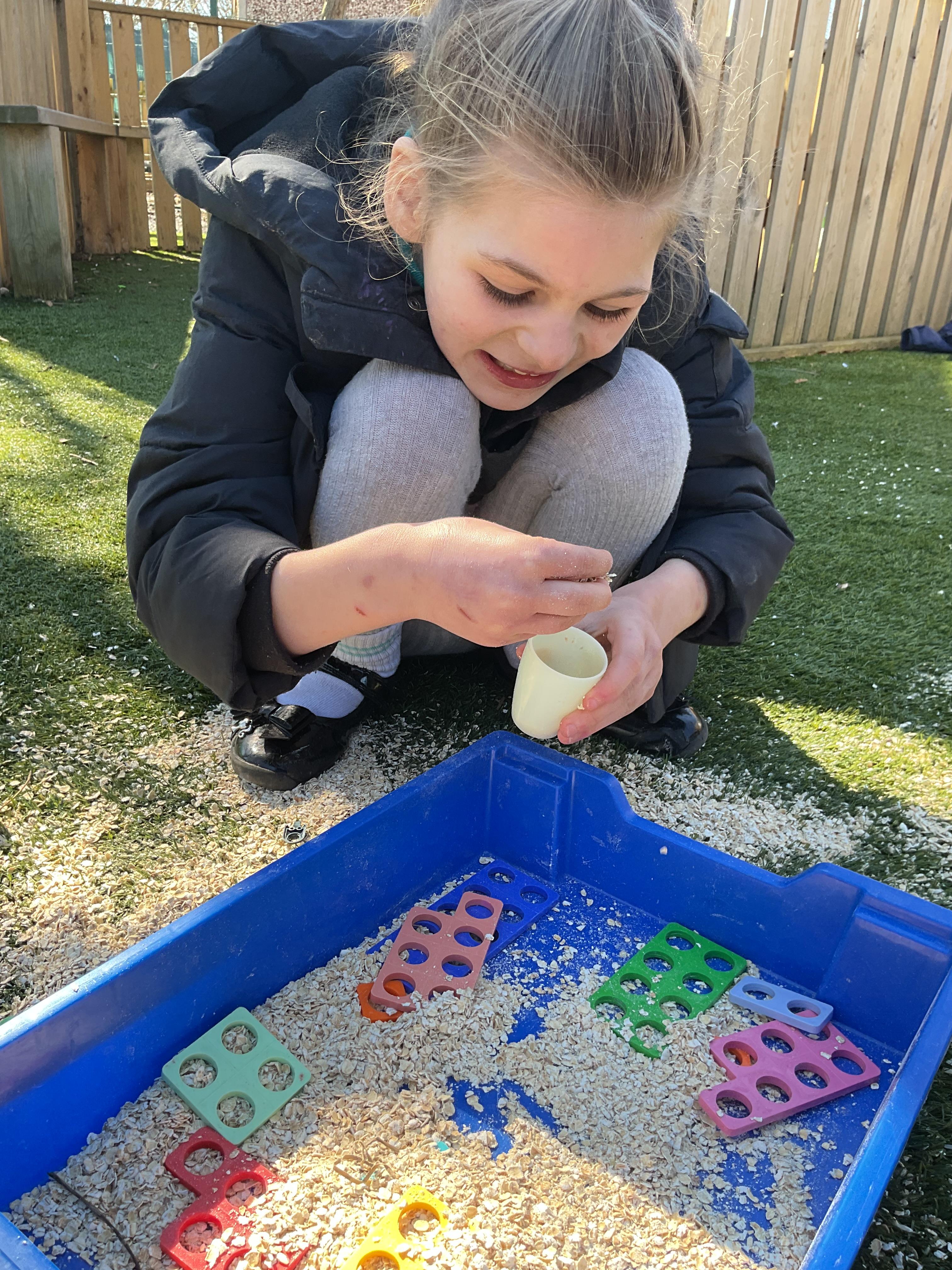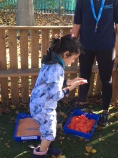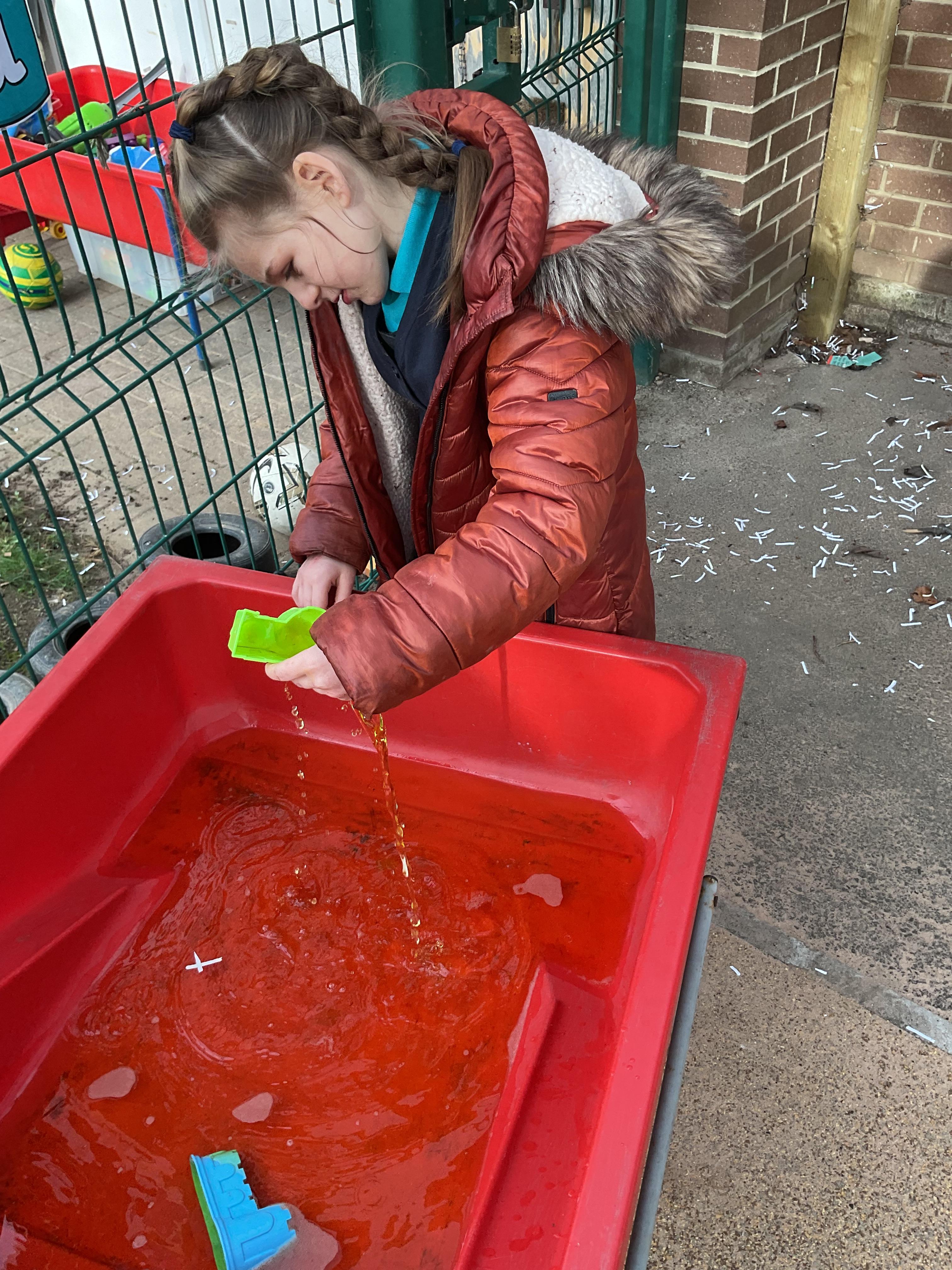 Today, we went outside to investigate Maths. We explored some colour, our pouring skills, our matching skills and our sorting skills. It was very cold and a bit messy but we all had a fantastic time.