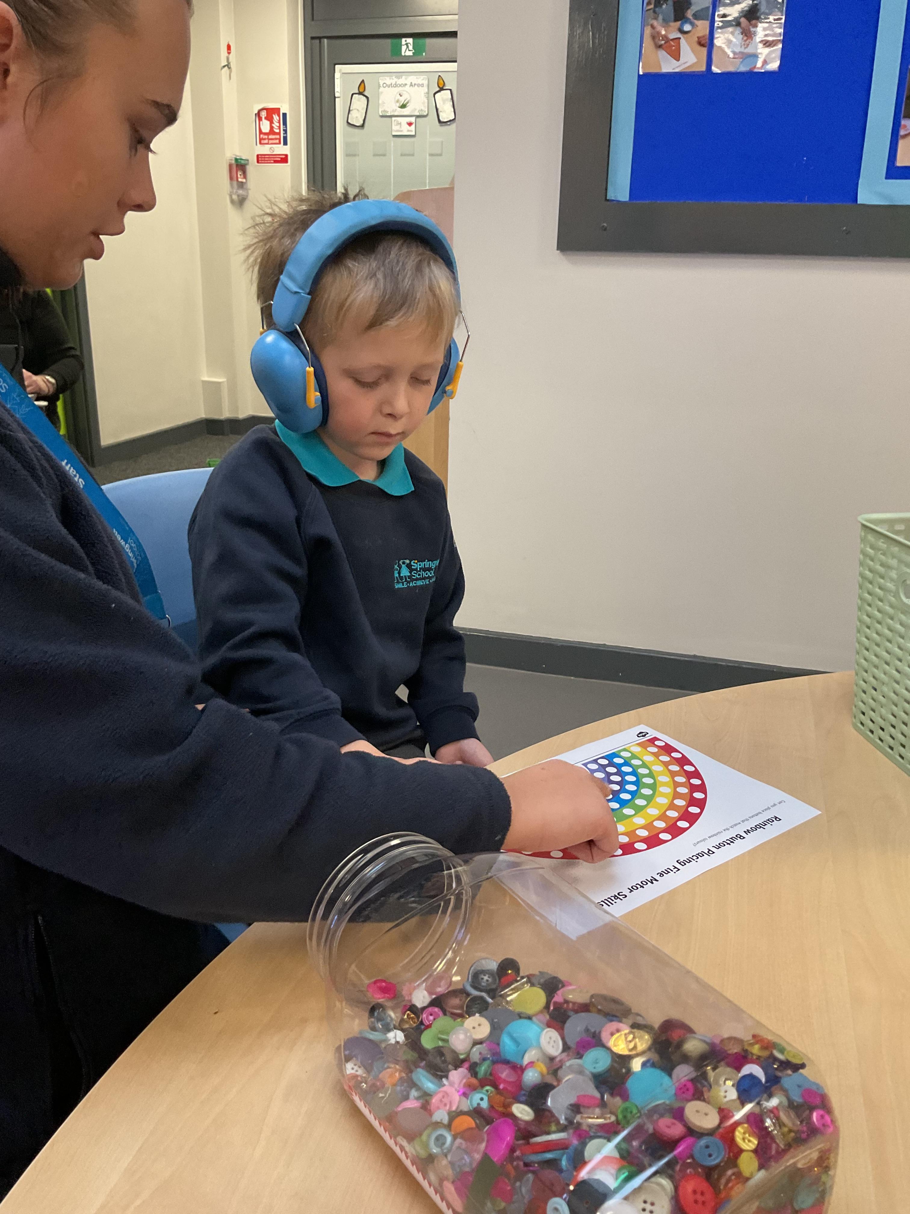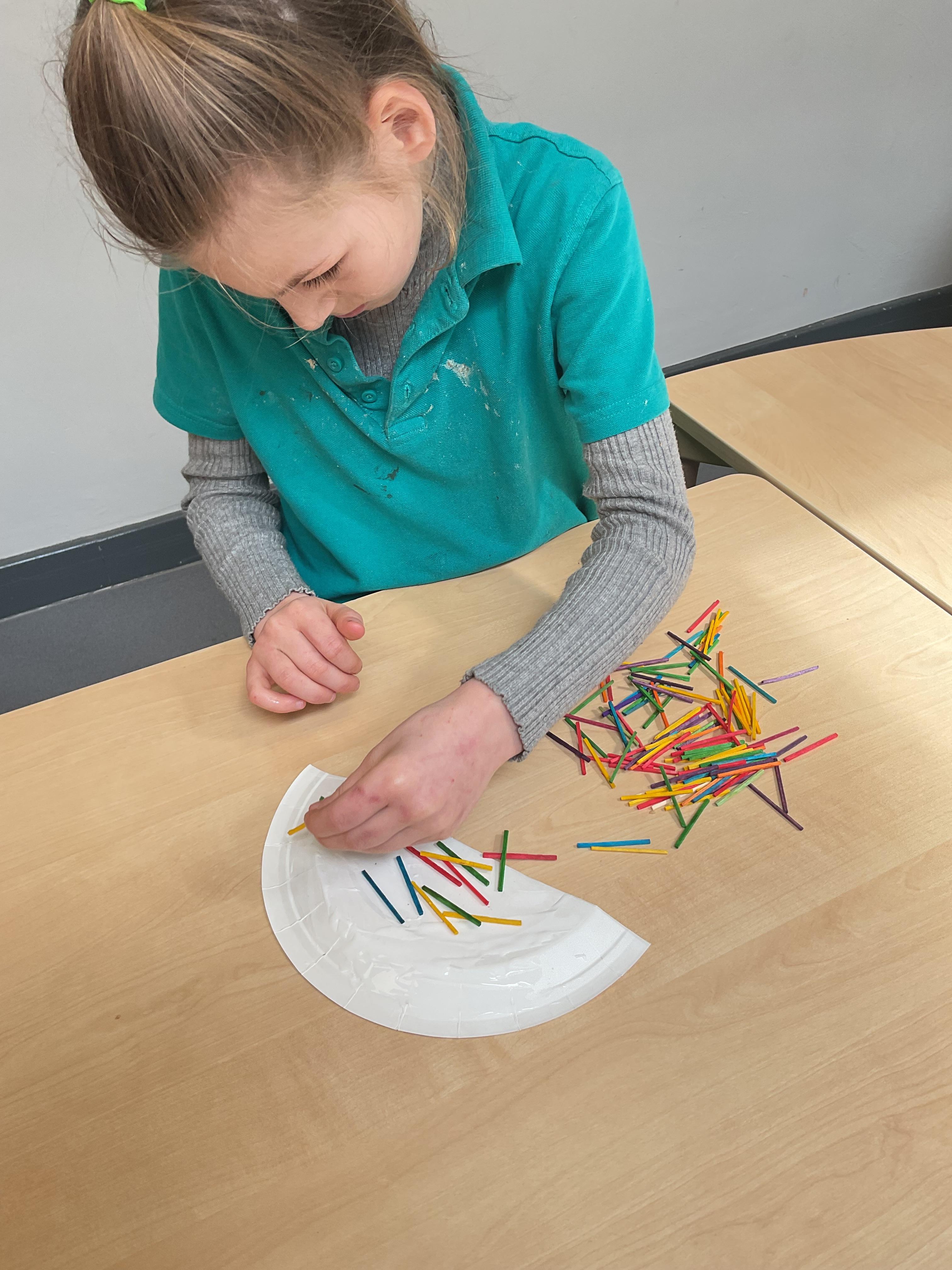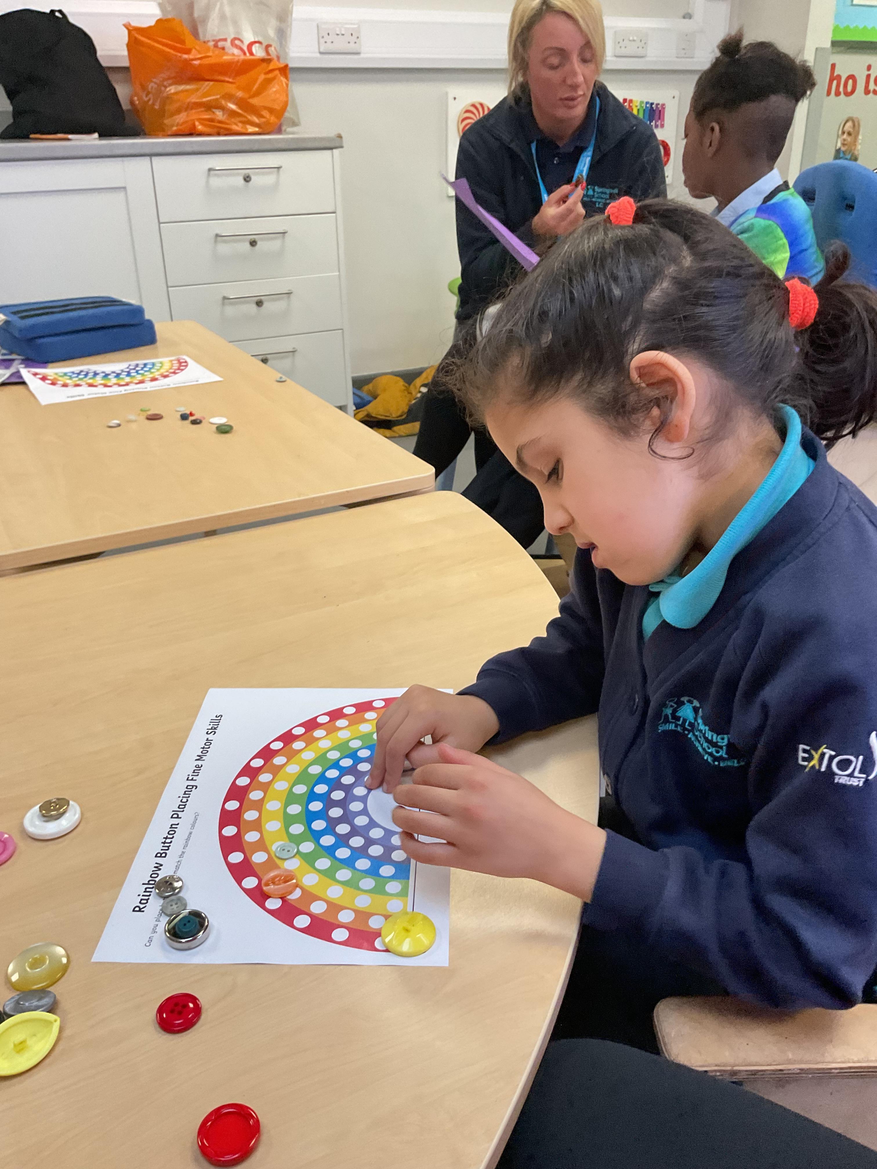 in the water, this was so fun and messy! The children then showed interest in finding the coloured bears in the shredded paper, after being so busy outside some children used their fine motor skills to pick coloured buttons to glue on our rainbows.