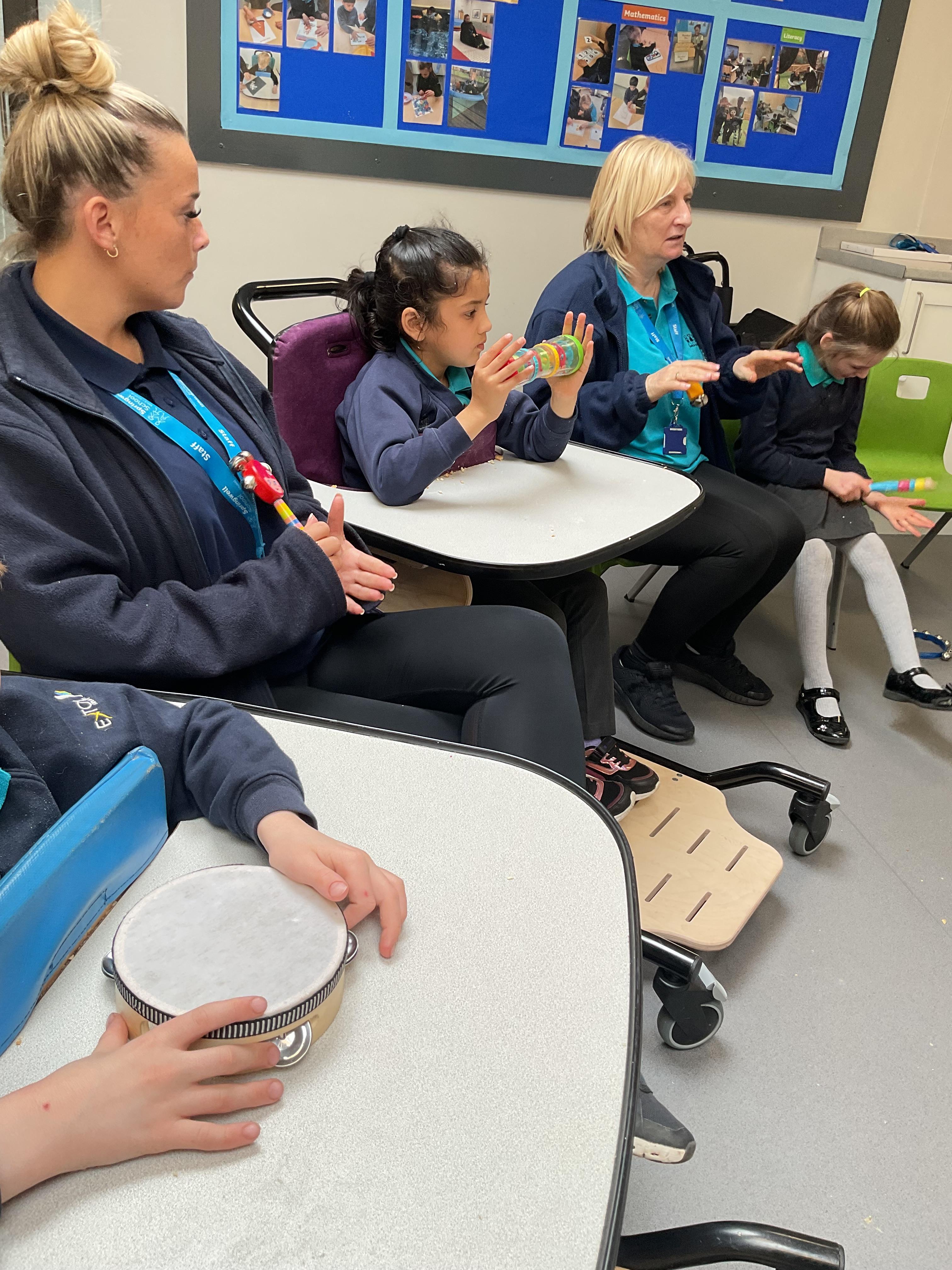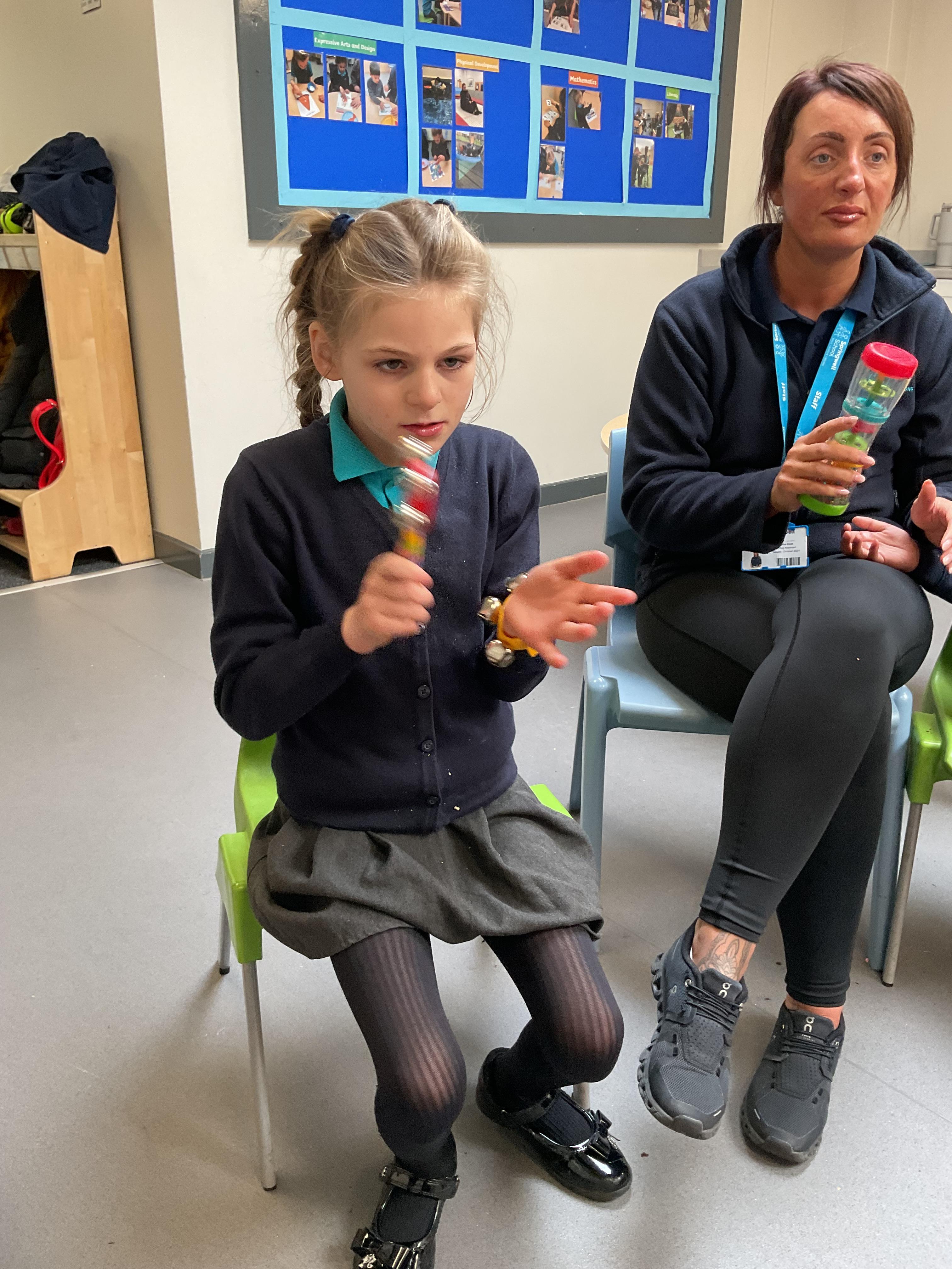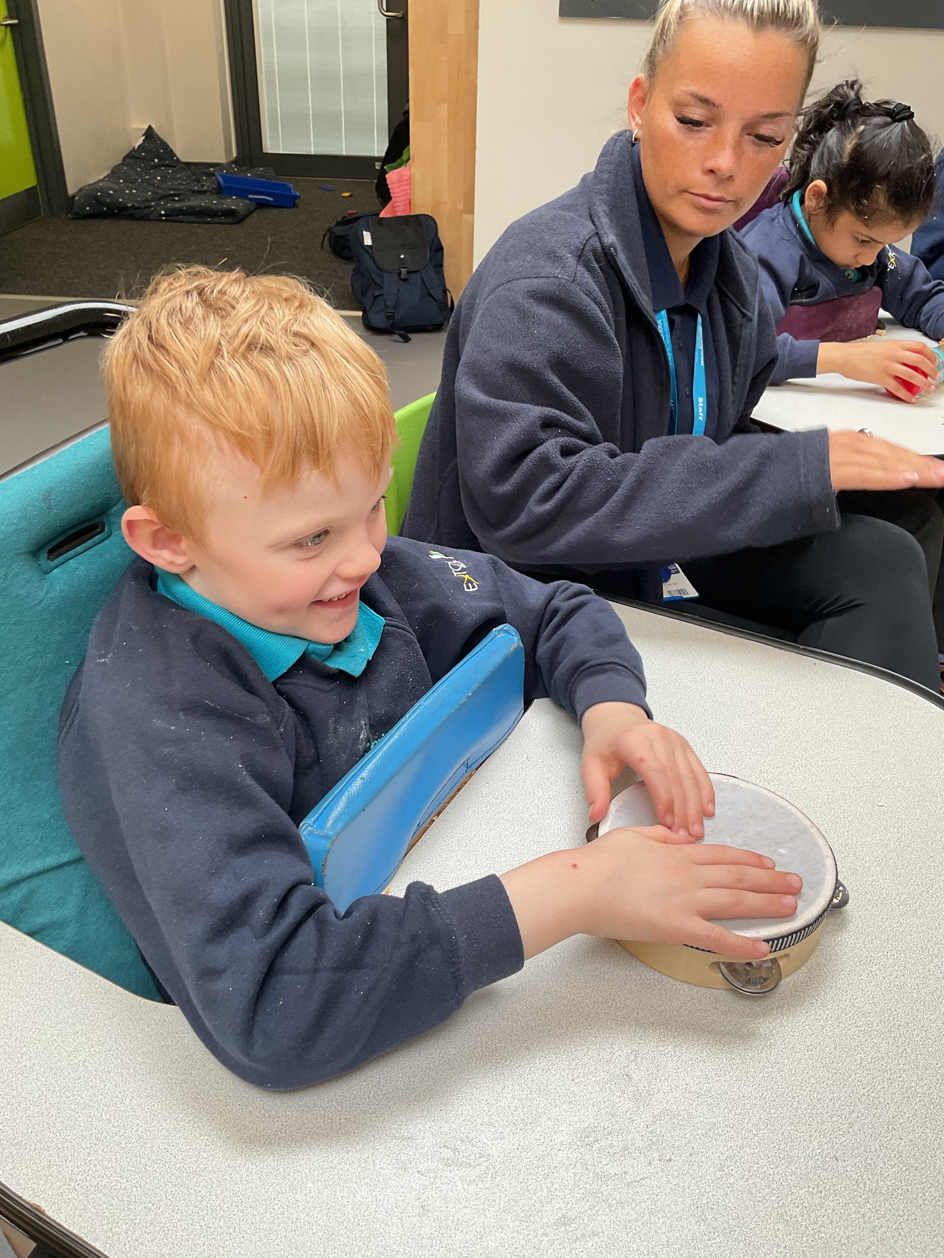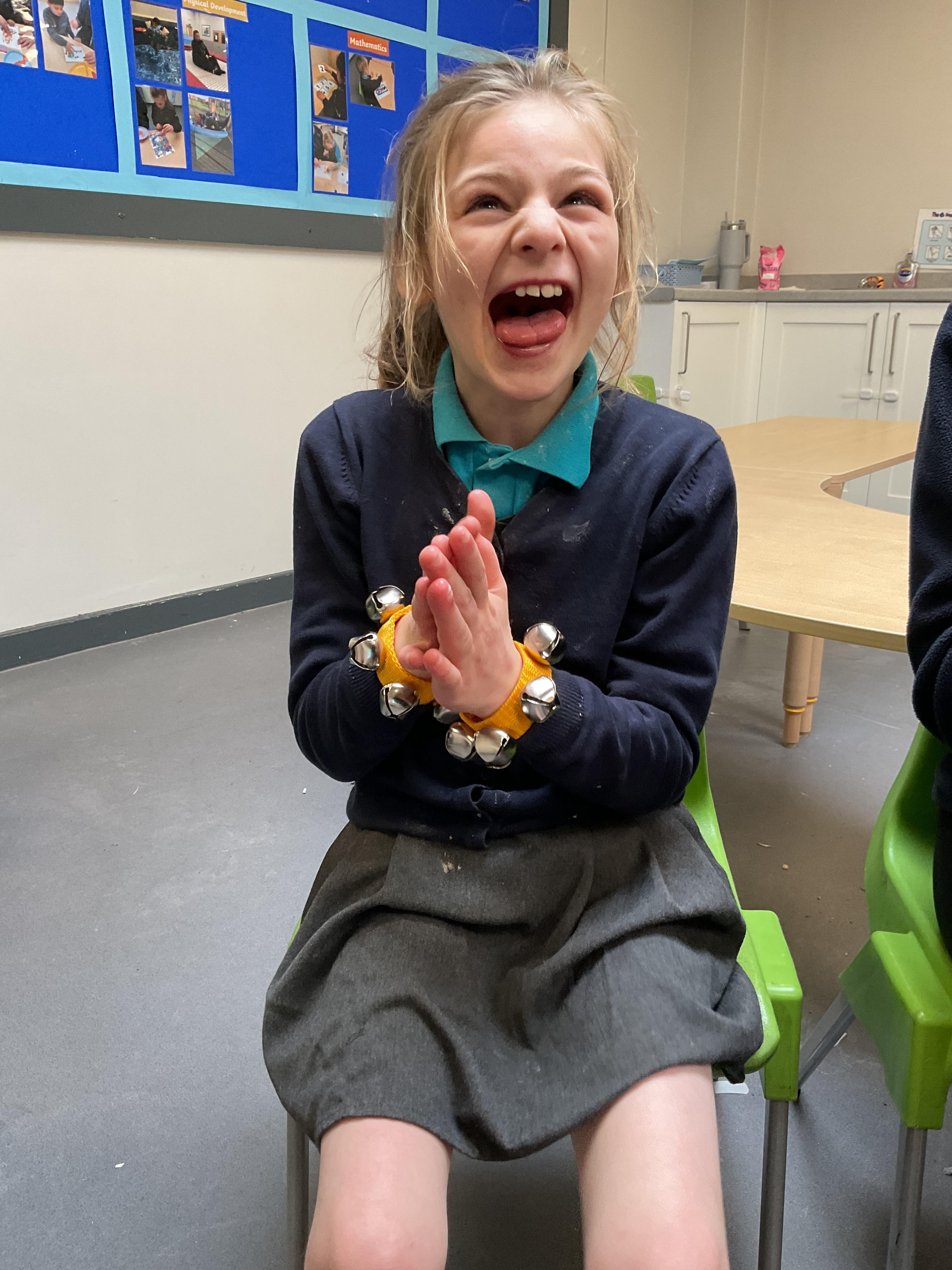 Today, we had a music session in school. We do this regularly in Zebra class. We used the musical instruments to make some sounds and we played some music alongside to accompany us. We enjoyed making lots of noise and we had lots of fun sharing the instruments. We used our voices to sing along too.