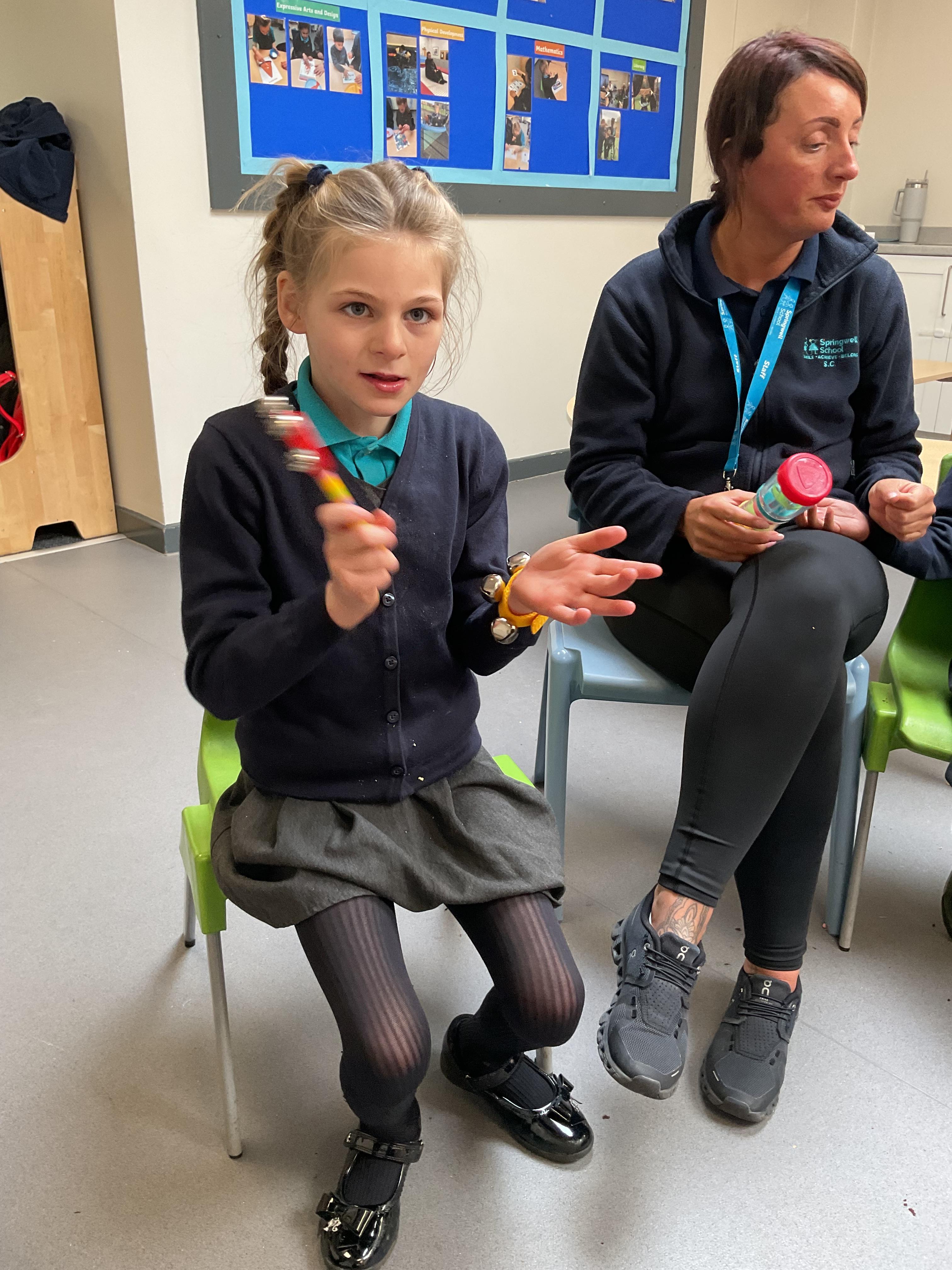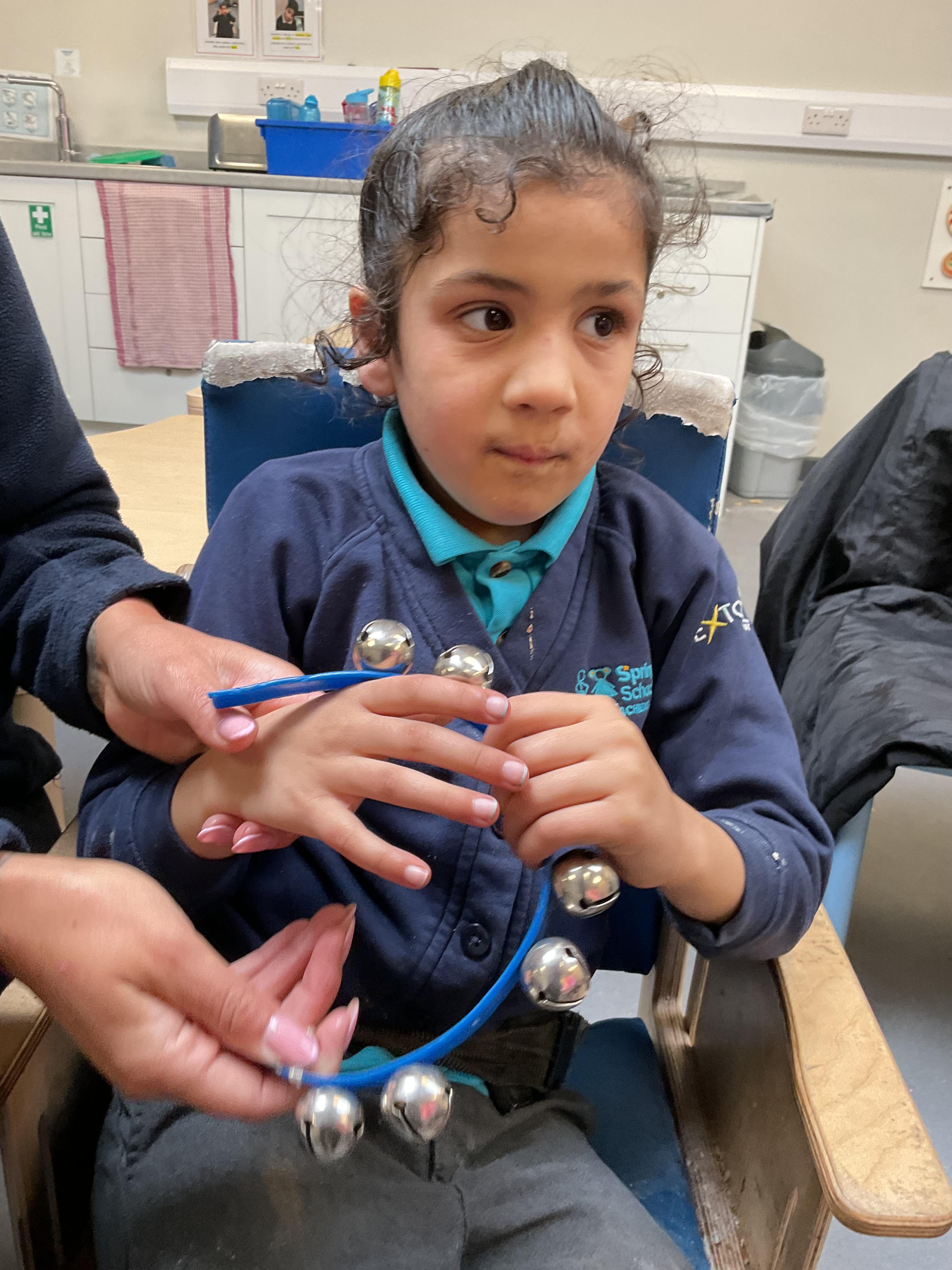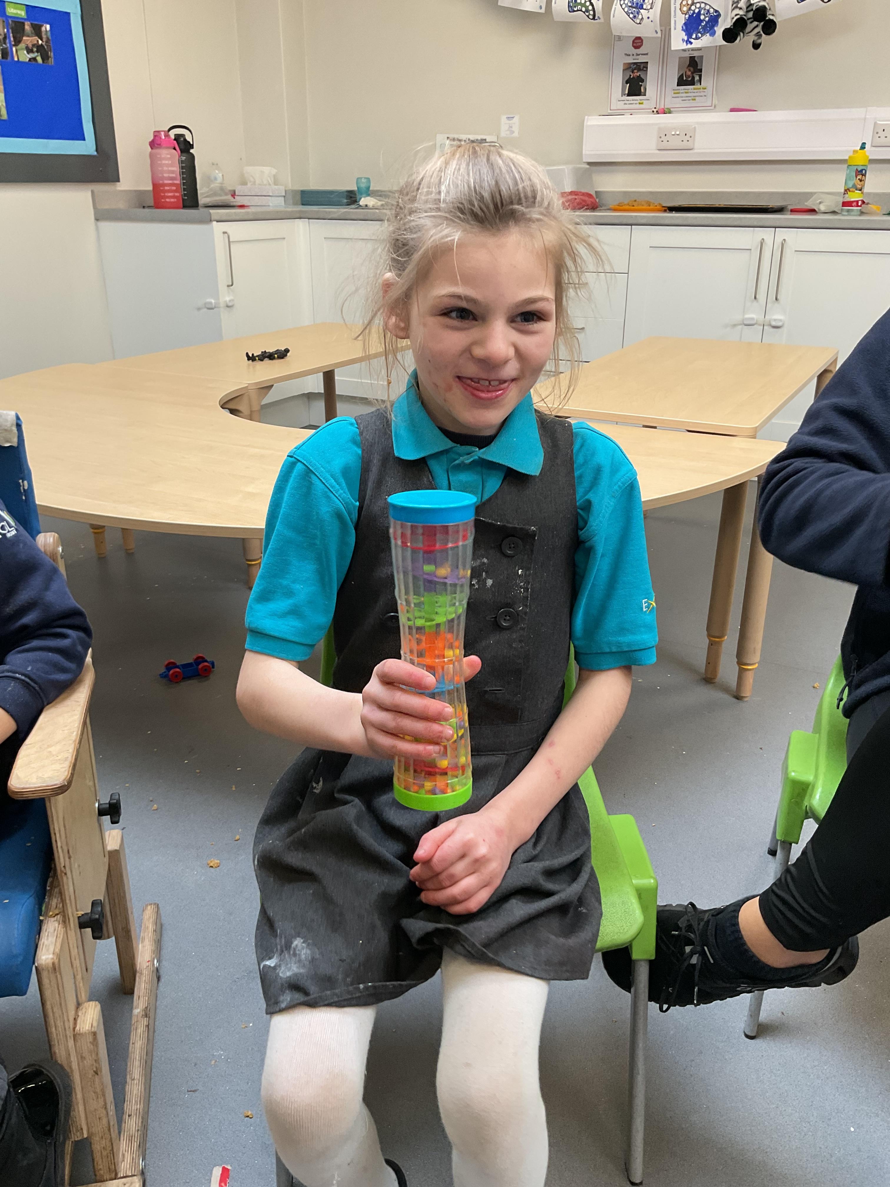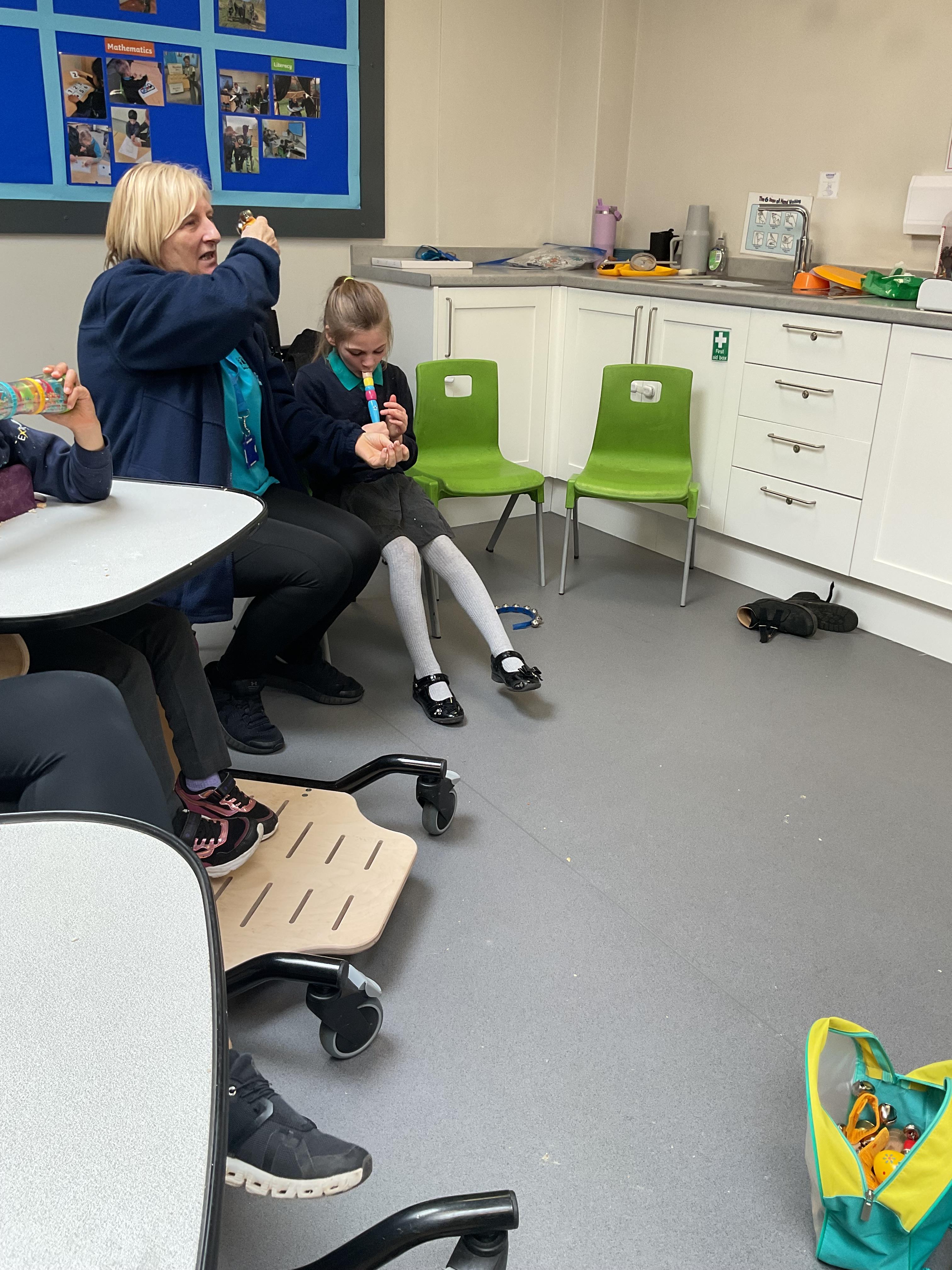 Today, we had a music session in school. We do this regularly in Zebra class. We used the musical instruments to make some sounds and we played some music alongside to accompany us. We enjoyed making lots of noise and we had lots of fun sharing the instruments. We used our voices to sing along too.