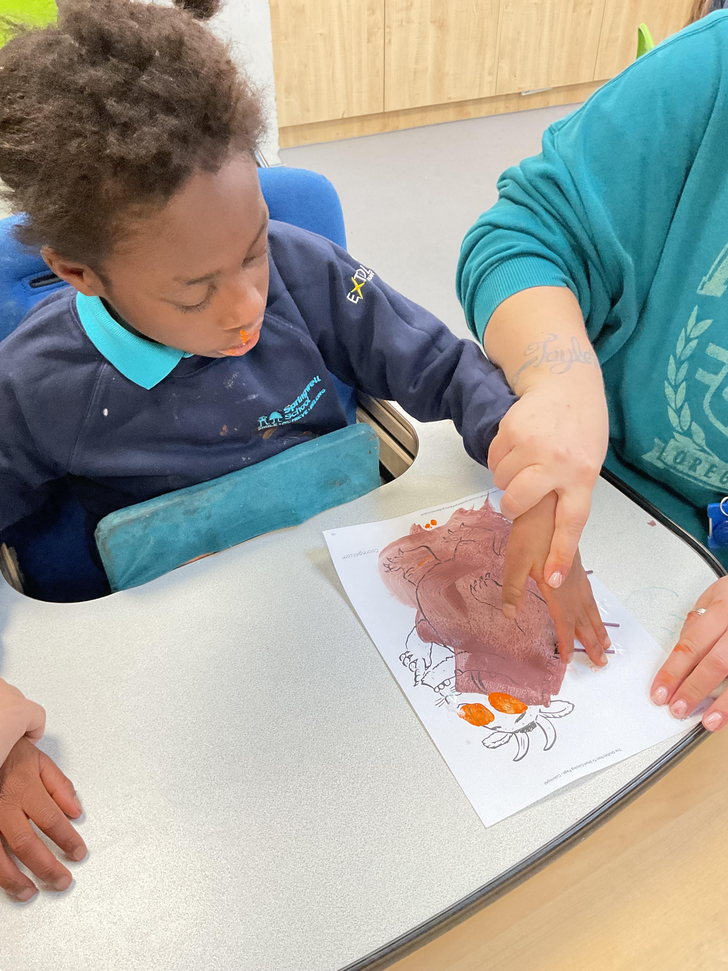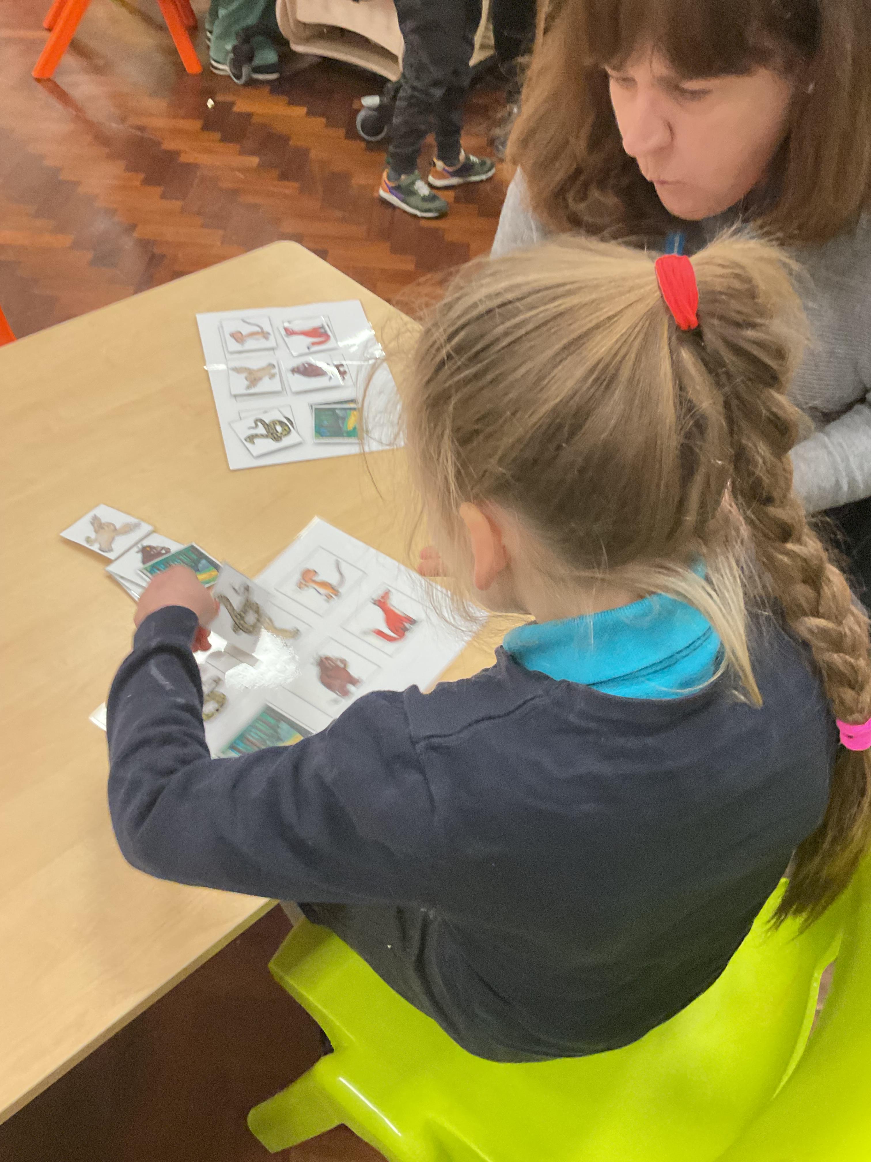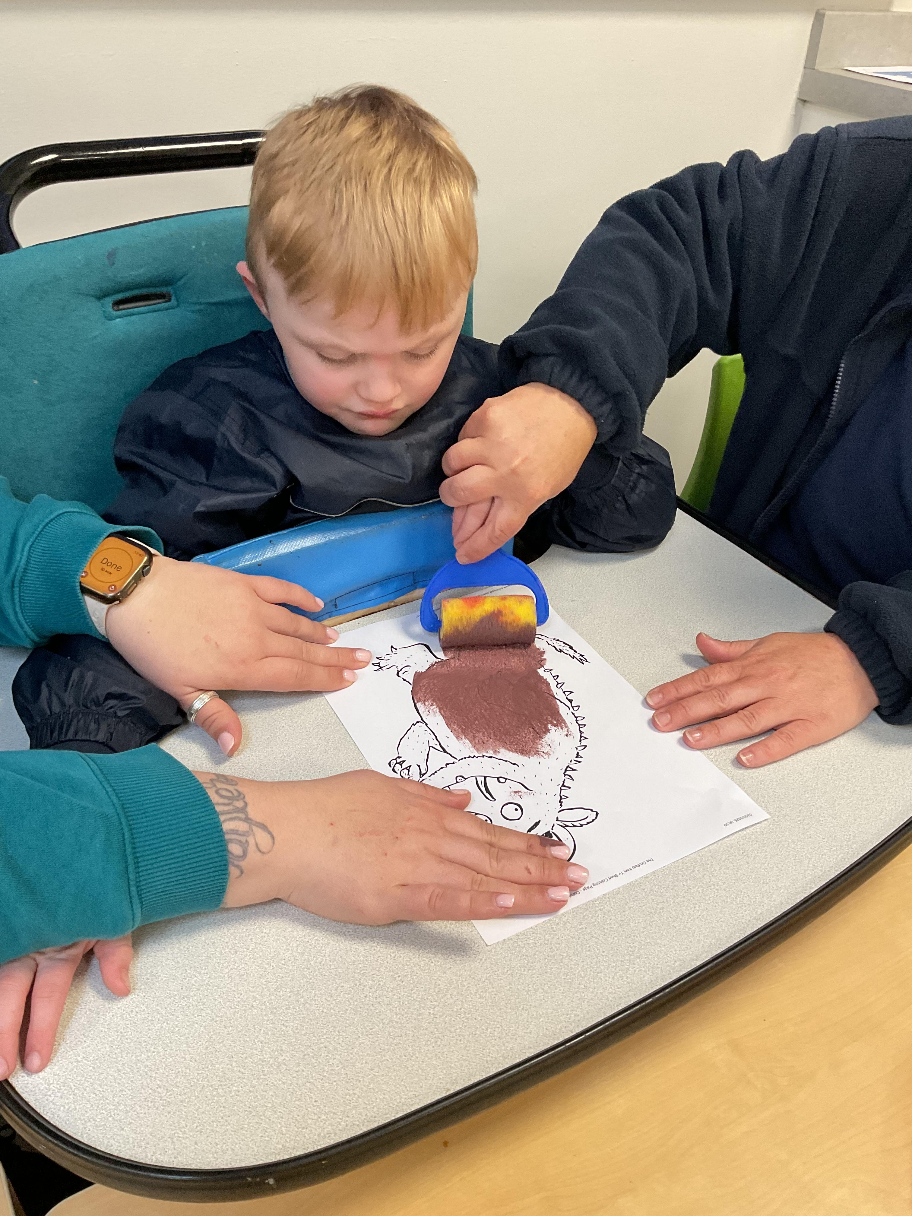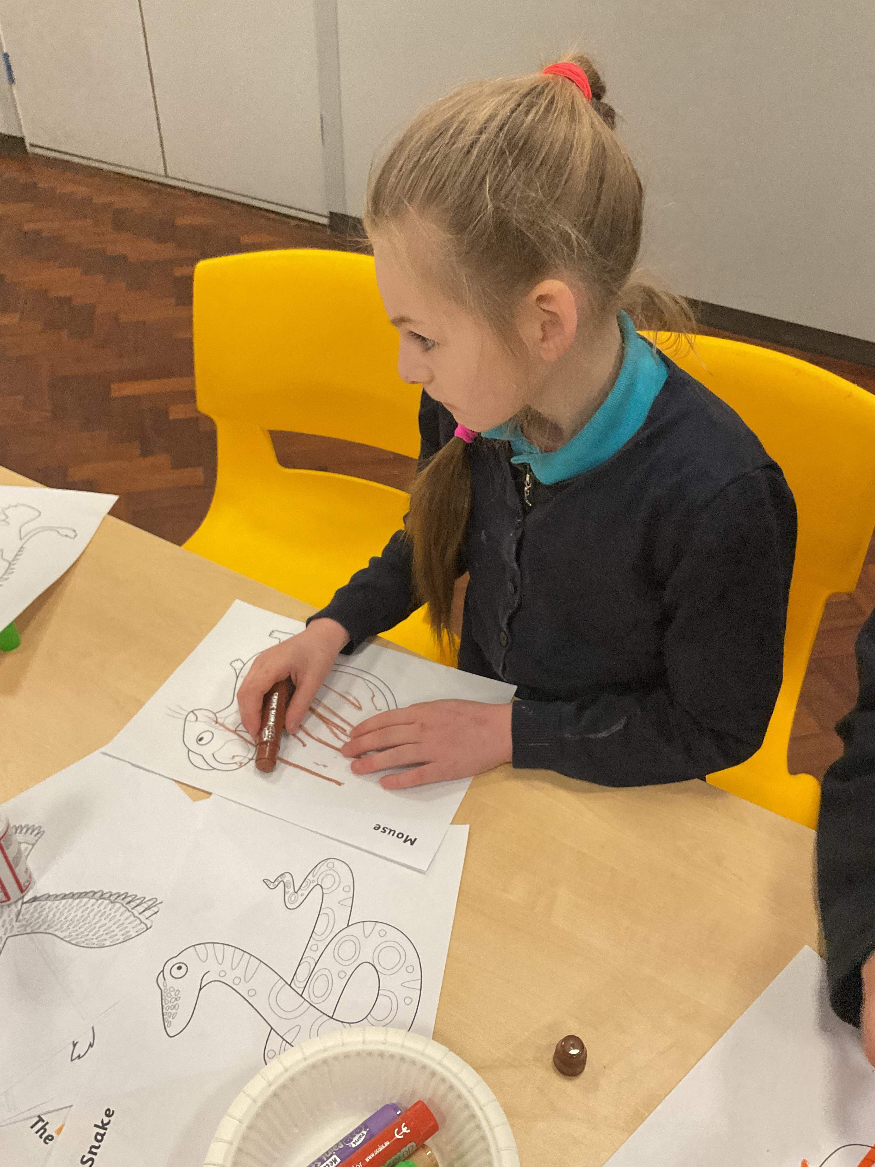 This week, the zebras have been learning about “The Gruffalo”. We listened to the story and made our own Gruffalo masks! Each child made a Gruffalo picture with his poisonous green nose, his orange eyes and his purple pricks all over his back! We used different tools to create our own Gruffalo, including a rolling brush, paintbrush and even our fingers for finger painting. In cookery, we made some delicious Gruffalo cakes. The children loved mixing the cake batter and getting a bit messy. In the middle of the week, we enjoyed listening to the Gruffalo song and dancing with our musical instruments. On Wednesday we celebrated Science Day, we had great fun exploring a range of science-themed sensory activities in the hall. We used all our senses to explore colours, water and ice. We also tried some fruit and vegetables and the children’s favourite part watched the volcano explode! In PSHRE, we continued to develop our cutting skills. We coloured in the snake from the Gruffalo and carefully worked with our adults to cut the snake out, amazing work zebras.