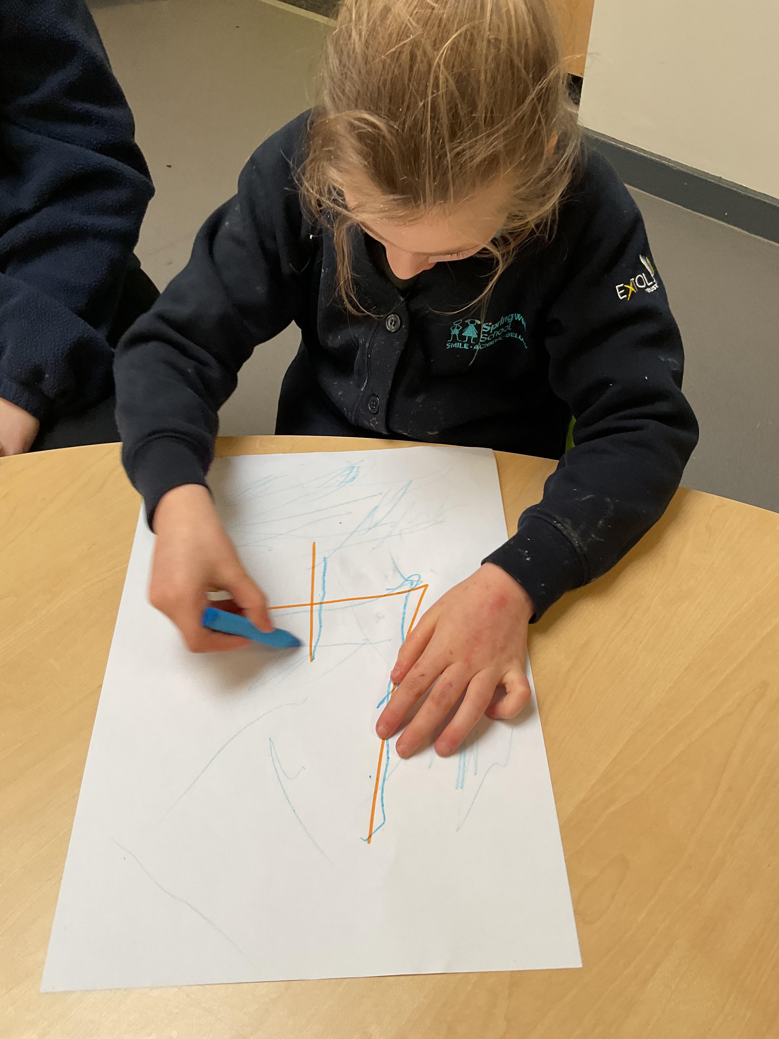 Look at us practising our mark making skills! Some of us used different grasps like palmer and pincer grip to hold the chalk. We made different movements to make the marks like linear, shapes, swirls and squiggles. This also helps to develop our hand eye coordination.