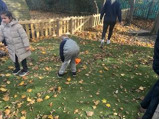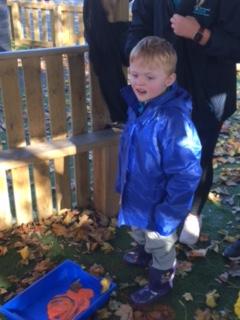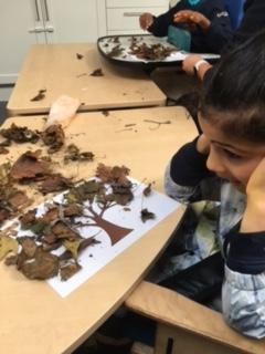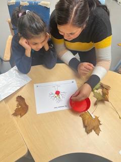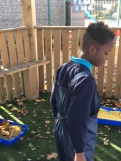 This afternoon, we went outside and explored our Autumn Sensory Walk. We all got very messy and enjoyed ourselves very much. We enjoyed the colours and the textures of the different sensory experiences. Luckily, we all had our waterproofs on. When we came back inside (and got cleaned up!) we made some pictures with the leaves we had played in.